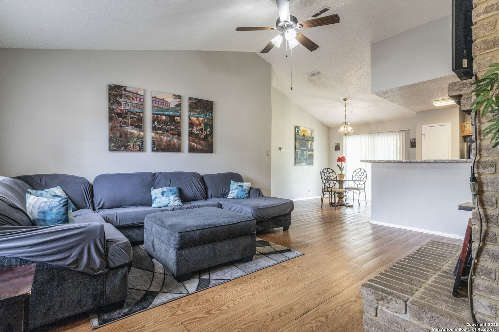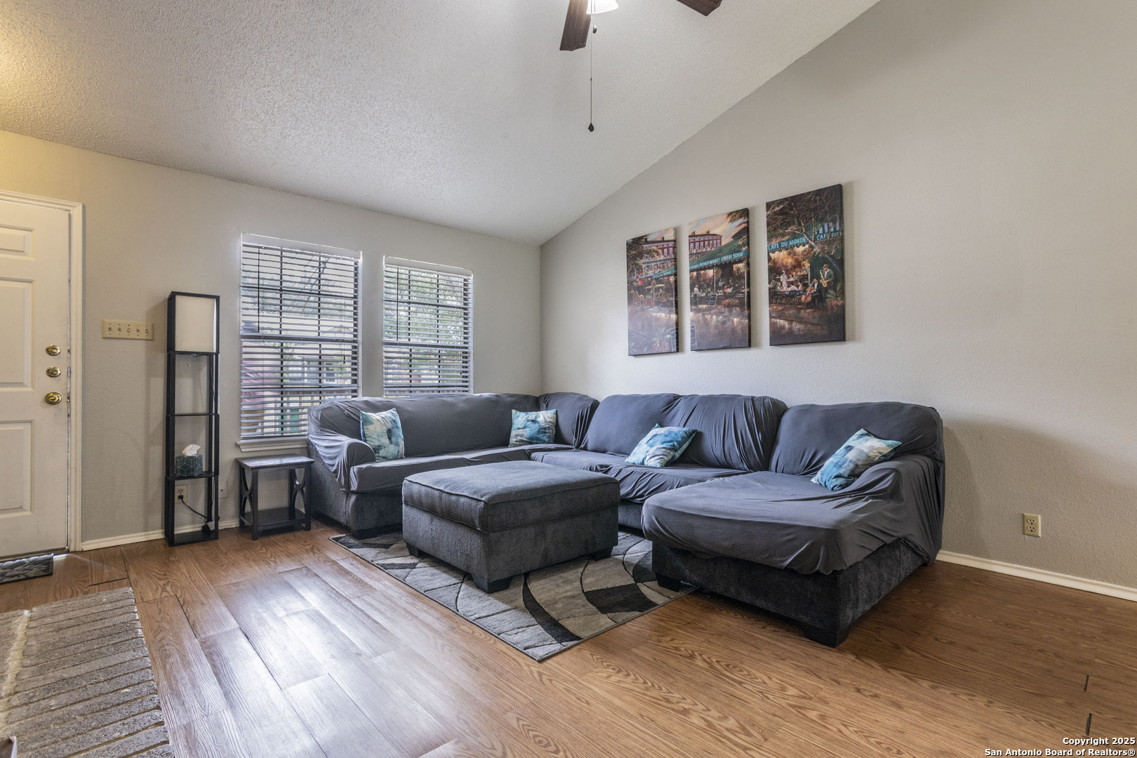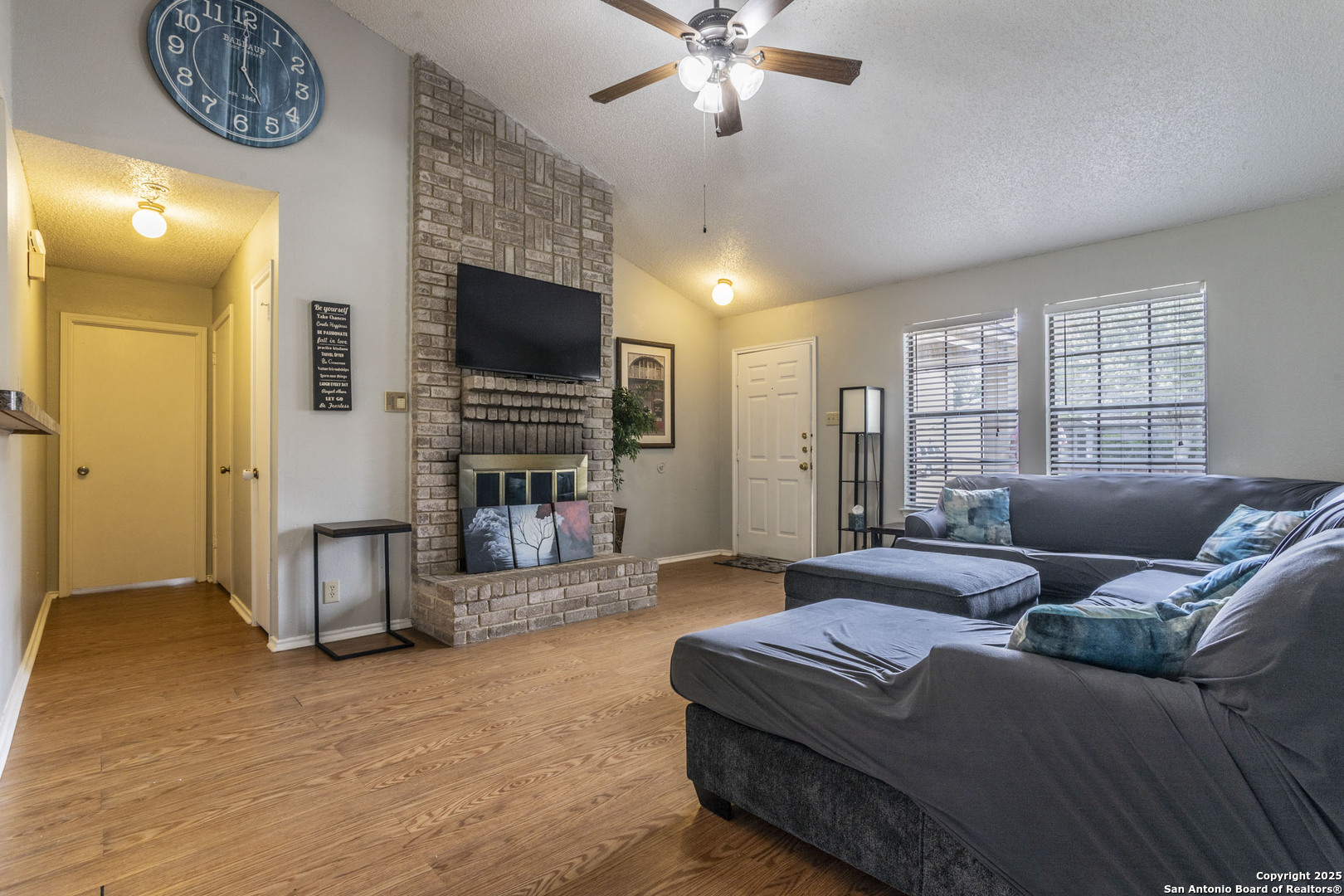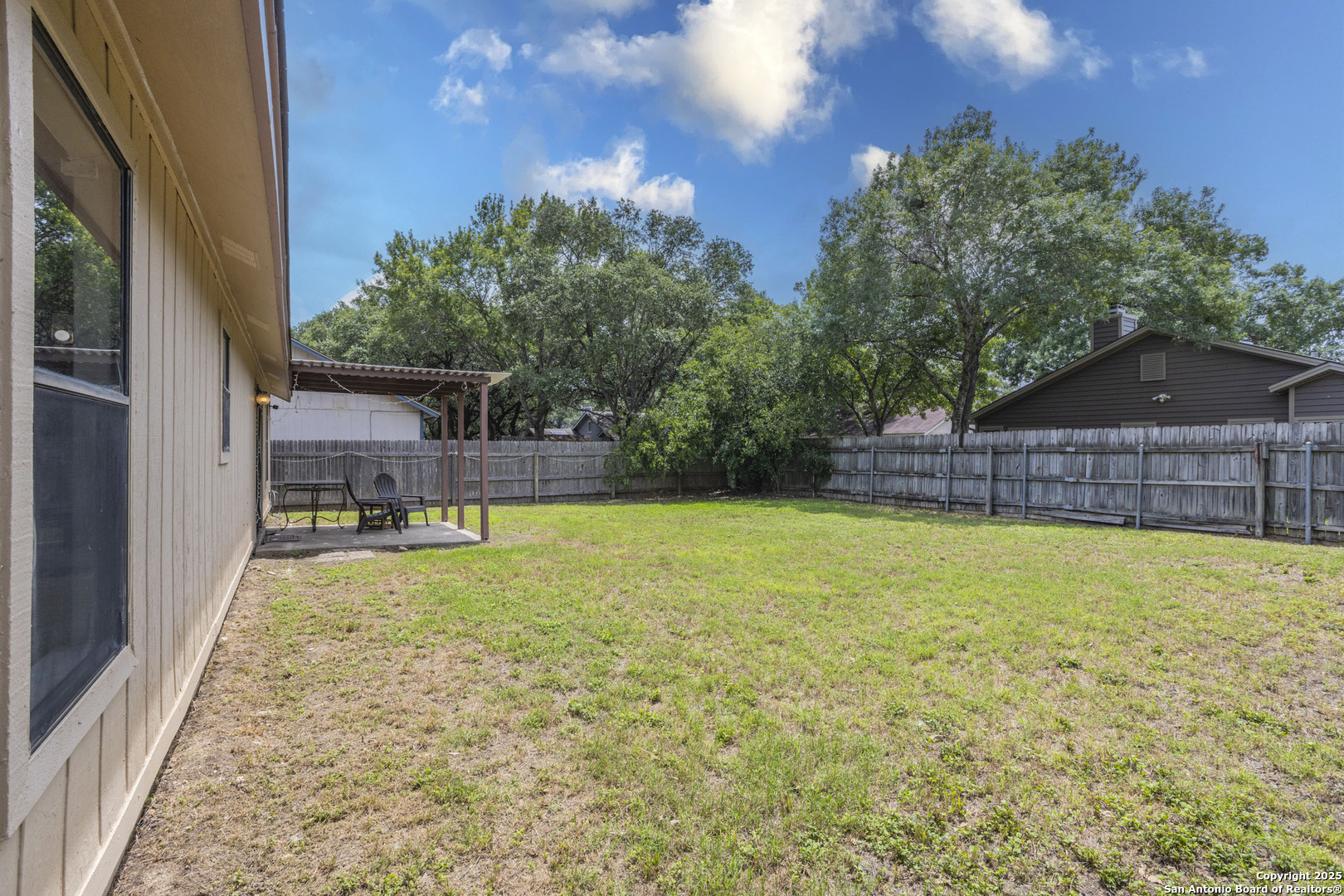 Beautiful 3-Bedroom, 2-Bathroom Single Story Home in Popular Northwest Crossing. Great Location with Easy Access to Hwy-1604, Hwy-16, Shopping, Restaurants, & More. Nice Curb Appeal with Covered Entry & Front Patio, Enter to Spacious Living Area with High Ceilings, Wood Laminate Flooring, & Handsome Brick Fireplace. Gourmet Kitchen with Breakfast Bar, Mosaic Tile Backsplash, & Appliances Included, Open to Cozy Breakfast Area with Sliding Doors to Back Patio. Large Primary Bedroom with Vaulted Ceiling & Full Bathroom with Tub/Shower. Nicely-Sized Secondary Bedrooms & Full Bathroom with Tub/Shower. Laundry Room Adjacent to Primary Bedroom with Washer/Dryer Included. Large Backyard with Privacy Fence & Covered Patio, Great for Relaxation & Entertainment. 2-Car Attached Garage with Opener. Pets Case-by-Case, Northside ISD
