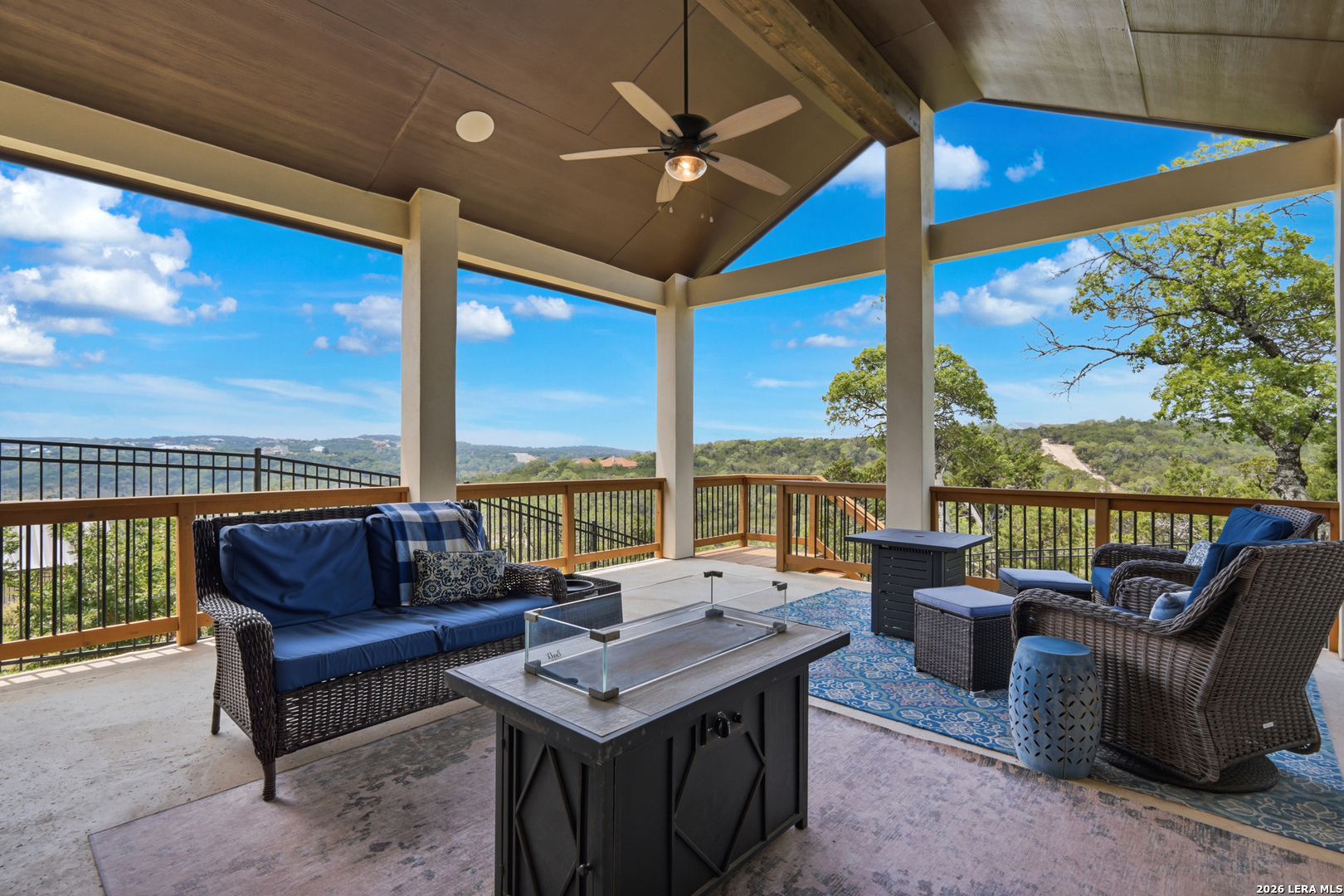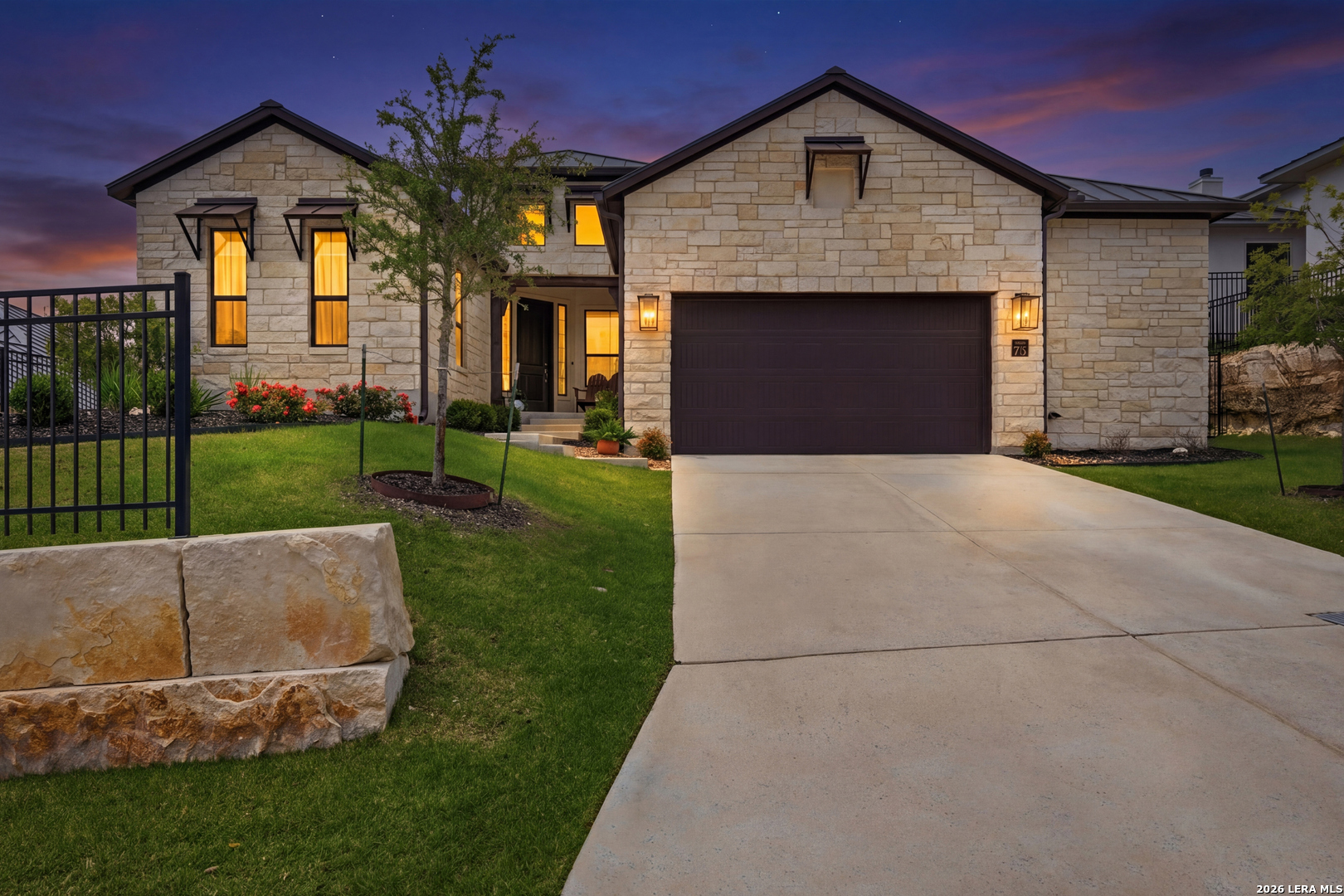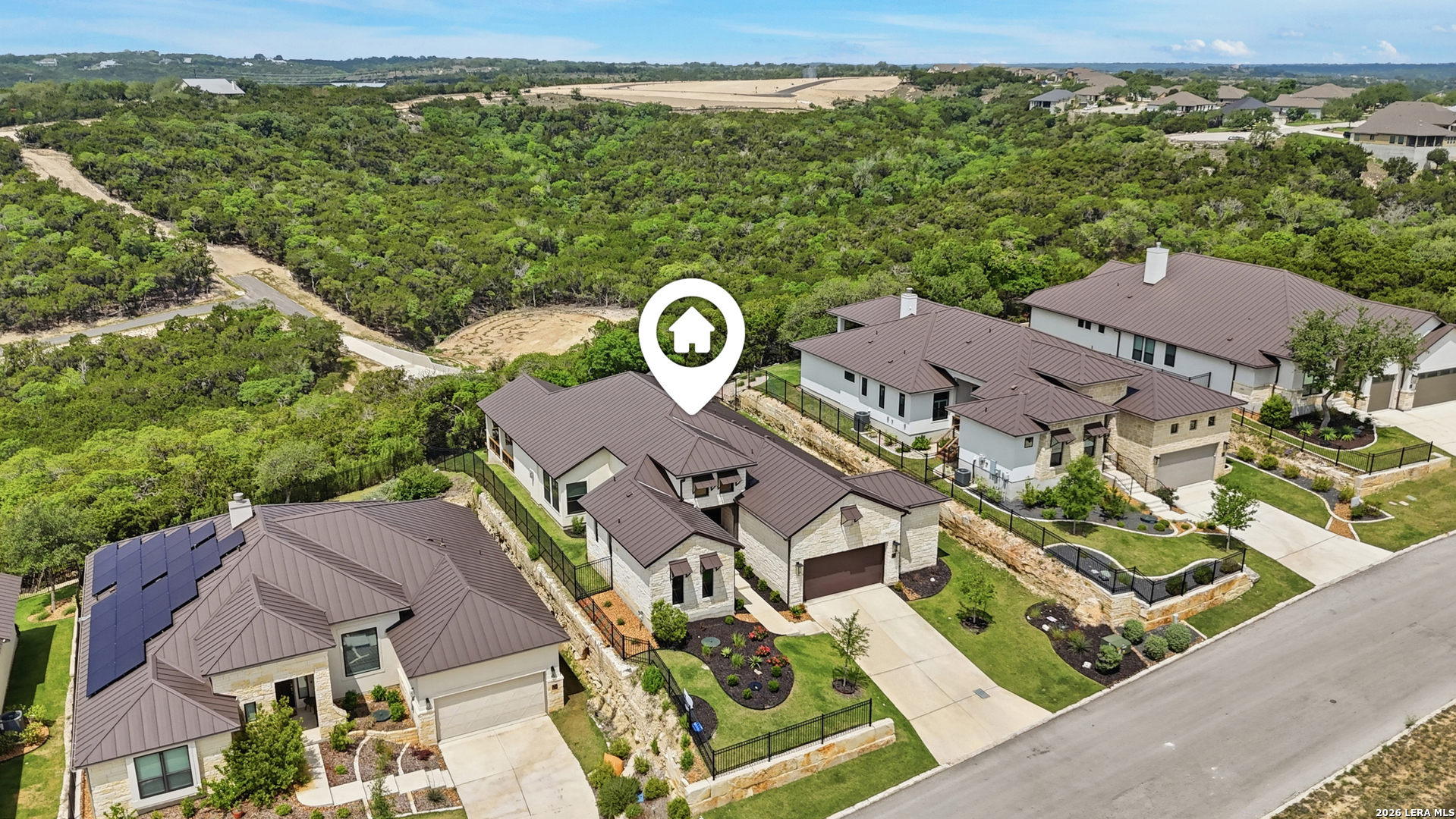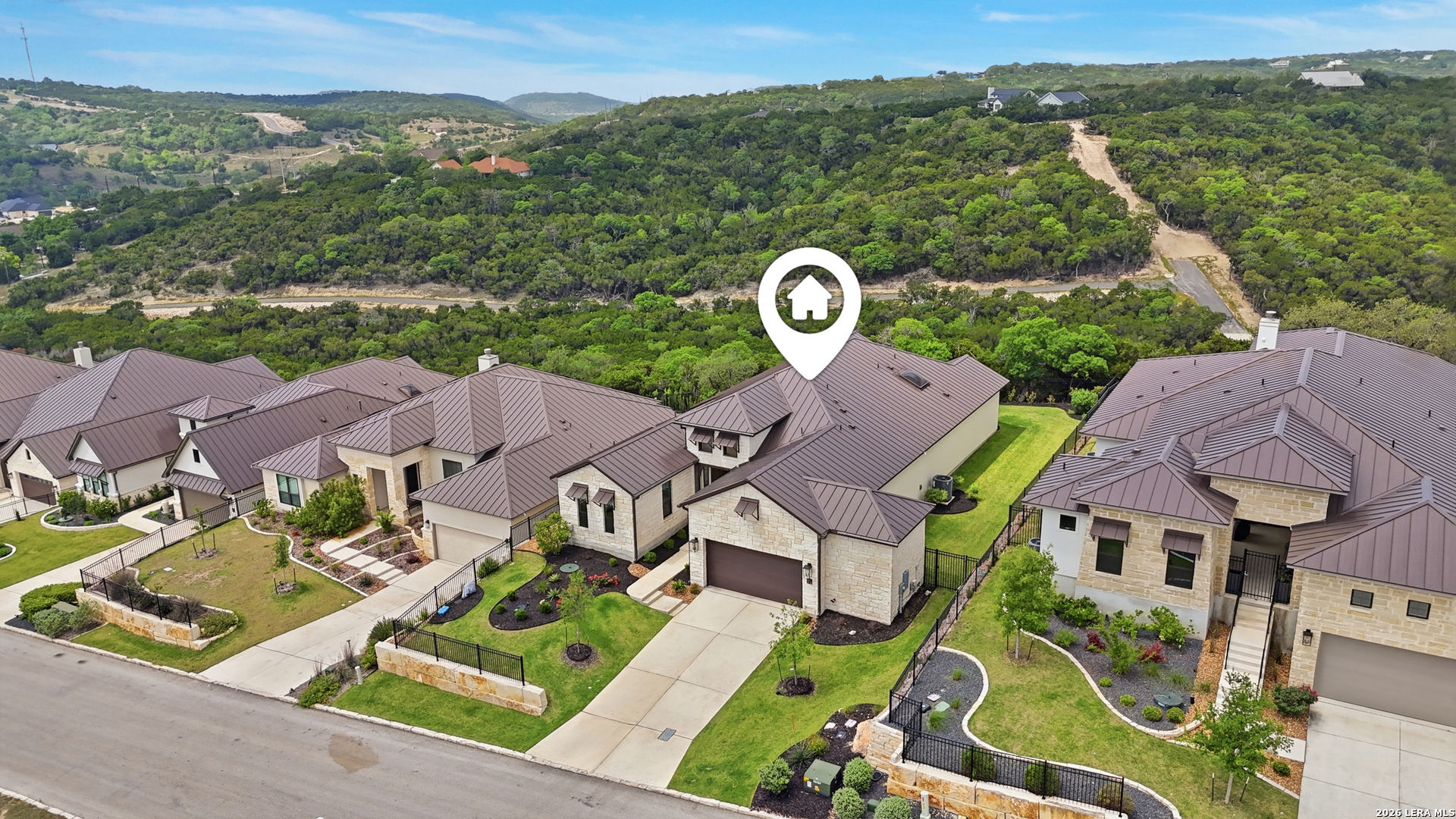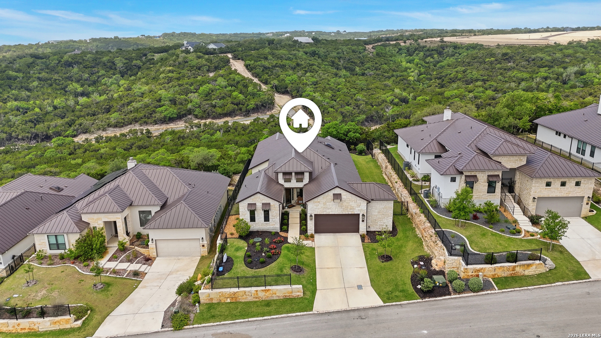 Experience refined single-story living in this thoughtfully designed home, where elegant interiors and seamless indoor-outdoor living come together. The open-concept floor plan is filled with natural light and designed for both everyday comfort and entertaining, featuring a spacious living room anchored by a beautiful gas fireplace, built-in speakers and sliding glass door to the oversized covered patio. The home flows well into the chef's kitchen complete with an oversized island, gas cooking, double ovens, pendant lighting, undermount sink, an abundance of cabinet storage space, premium finishes, and generous prep space. Sophisticated design details and curated decor including warm wood tile flooring create an elevated atmosphere throughout the home. The spacious primary suite is separated from the other bedrooms and has Hill Country views while the bathroom has double vanities and an oversized walk in shower. A private office offers a quiet, separate workspace ideal for remote work and study. Each bedroom is thoughtfully designed with its own ensuite bathroom, providing privacy and convenience for everyone. Step outside to an oversized covered patio where you can unwind, entertain, and take in breathtaking sunset views across the Texas Hill Country. Additional features include a metal roof, gas stub out on the back patio and an oversized garage with extra space ideal for a workshop, hobby area, or seasonal storage. The gated neighborhood includes an amenity center with pool, gathering room, workout facility, playground and court yard. This home offers one of the best views in the neighborhood creating a blend of luxury, functionality, and scenic Hill Country living, designed to make everyday life feel exceptional! Schedule your private showing today.