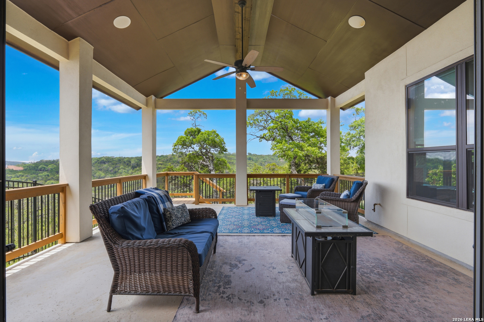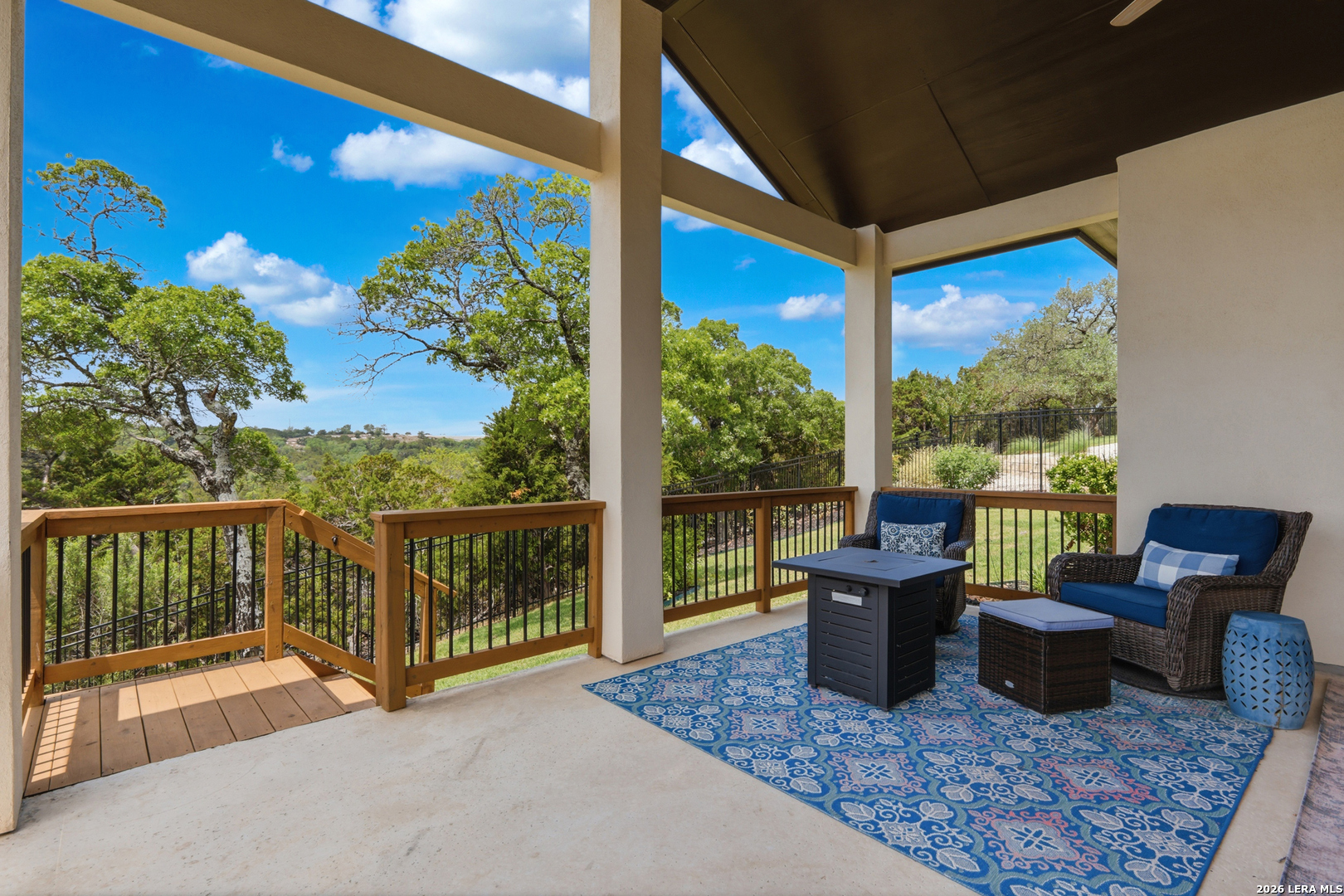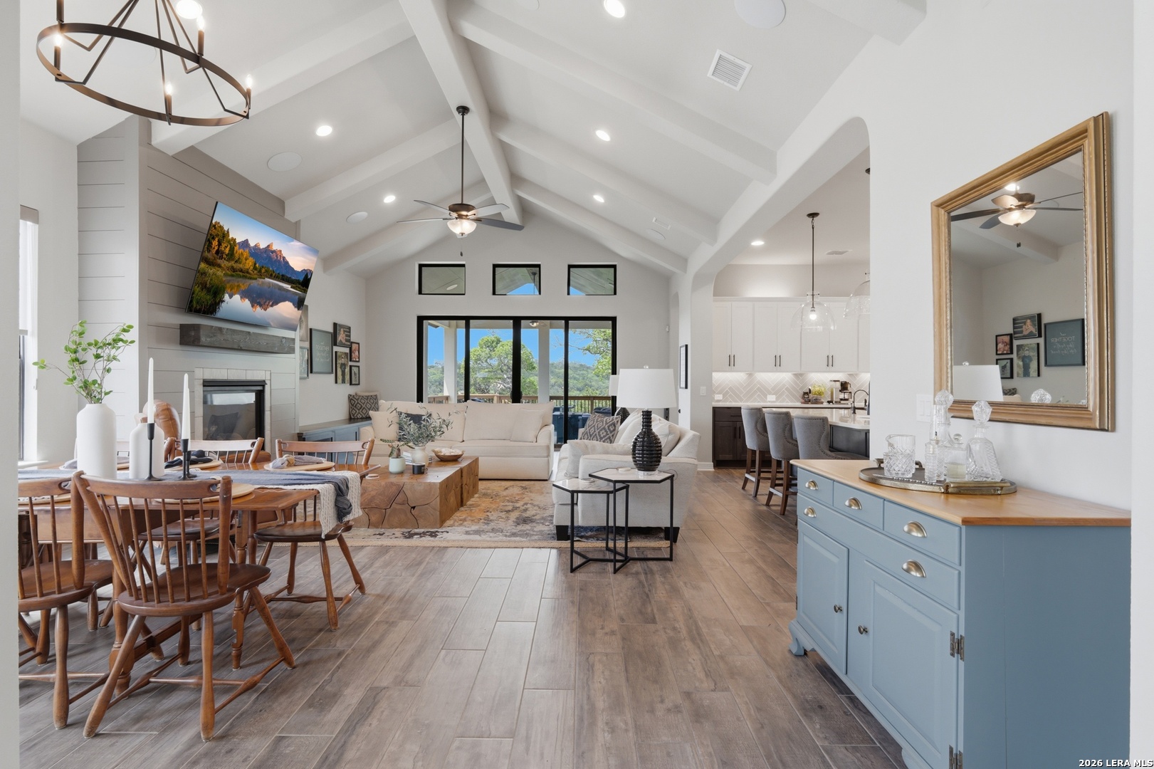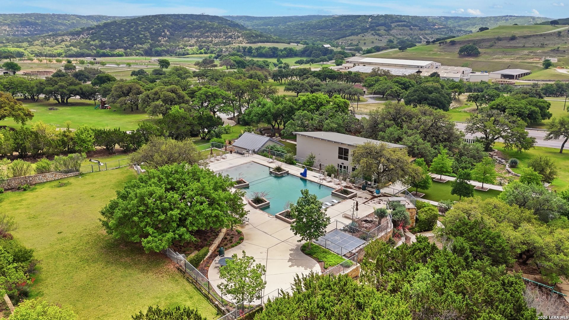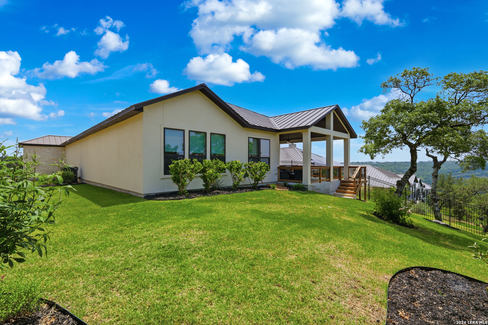 Experience refined single-story living in this thoughtfully designed home, where elegant interiors and seamless indoor-outdoor living come together. The open-concept floor plan is filled with natural light and designed for both everyday comfort and entertaining, featuring a spacious living room anchored by a beautiful gas fireplace, built-in speakers and sliding glass door to the oversized covered patio. The home flows well into the chef's kitchen complete with an oversized island, gas cooking, double ovens, pendant lighting, undermount sink, an abundance of cabinet storage space, premium finishes, and generous prep space. Sophisticated design details and curated decor including warm wood tile flooring create an elevated atmosphere throughout the home. The spacious primary suite is separated from the other bedrooms and has Hill Country views while the bathroom has double vanities and an oversized walk in shower. A private office offers a quiet, separate workspace ideal for remote work and study. Each bedroom is thoughtfully designed with its own ensuite bathroom, providing privacy and convenience for everyone. Step outside to an oversized covered patio where you can unwind, entertain, and take in breathtaking sunset views across the Texas Hill Country. Additional features include a metal roof, gas stub out on the back patio and an oversized garage with extra space ideal for a workshop, hobby area, or seasonal storage. The gated neighborhood includes an amenity center with pool, gathering room, workout facility, playground and court yard. This home offers one of the best views in the neighborhood creating a blend of luxury, functionality, and scenic Hill Country living, designed to make everyday life feel exceptional! Schedule your private showing today.