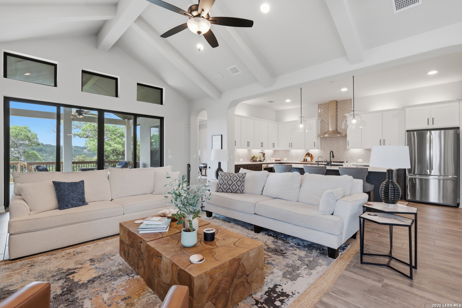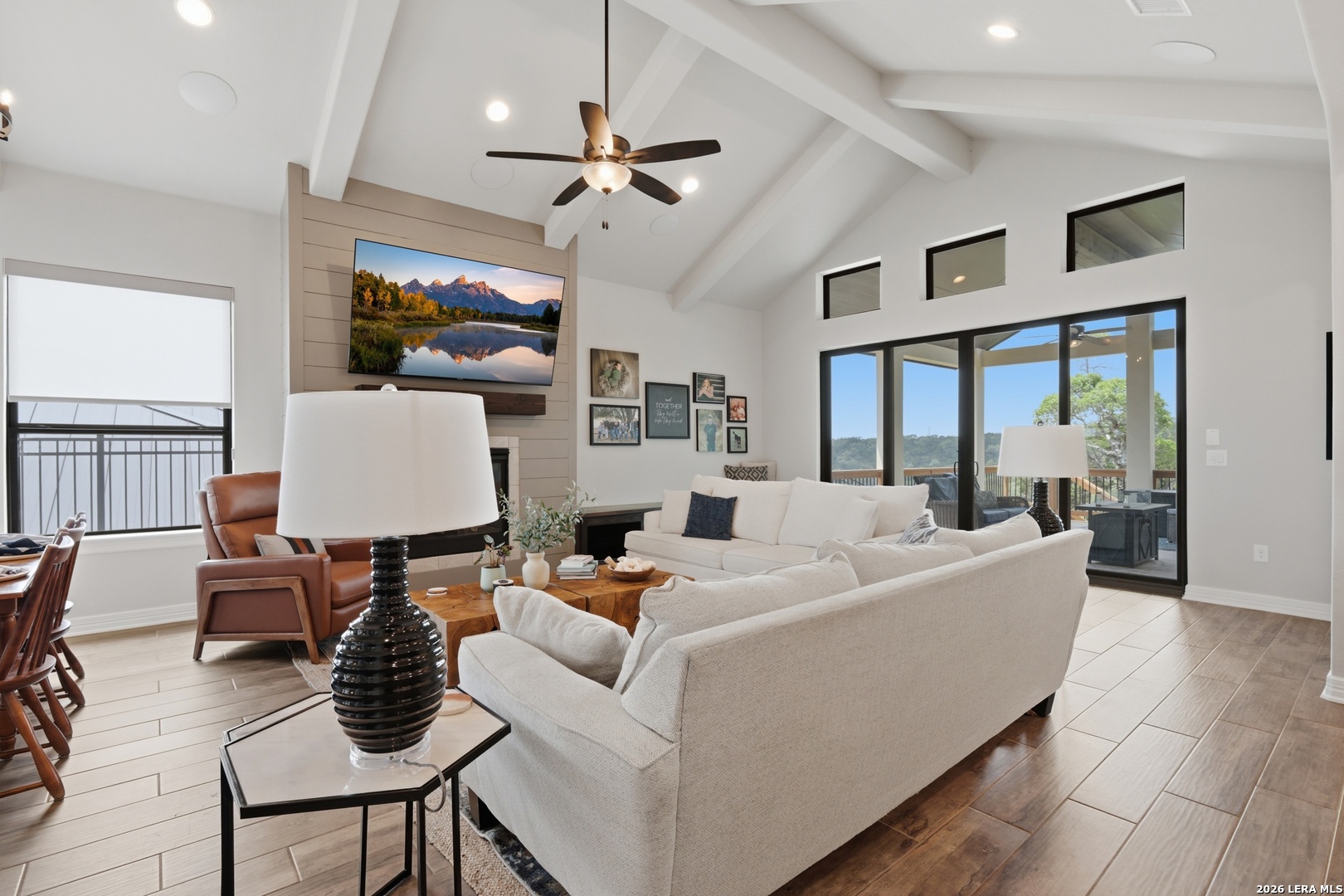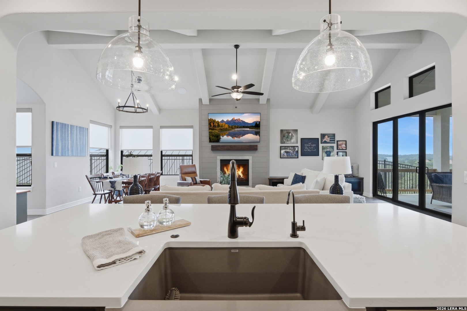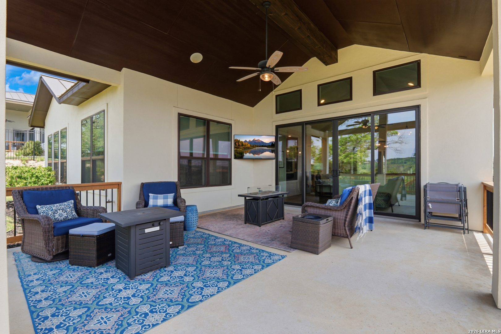 Experience refined single-story living in this thoughtfully designed home, where elegant interiors and seamless indoor-outdoor living come together. The open-concept floor plan is filled with natural light and designed for both everyday comfort and entertaining, featuring a spacious living room anchored by a beautiful gas fireplace, built-in speakers and sliding glass door to the oversized covered patio. The home flows well into the chef's kitchen complete with an oversized island, gas cooking, double ovens, pendant lighting, undermount sink, an abundance of cabinet storage space, premium finishes, and generous prep space. Sophisticated design details and curated decor including warm wood tile flooring create an elevated atmosphere throughout the home. The spacious primary suite is separated from the other bedrooms and has Hill Country views while the bathroom has double vanities and an oversized walk in shower. A private office offers a quiet, separate workspace ideal for remote work and study. Each bedroom is thoughtfully designed with its own ensuite bathroom, providing privacy and convenience for everyone. Step outside to an oversized covered patio where you can unwind, entertain, and take in breathtaking sunset views across the Texas Hill Country. Additional features include a metal roof, gas stub out on the back patio and an oversized garage with extra space ideal for a workshop, hobby area, or seasonal storage. The gated neighborhood includes an amenity center with pool, gathering room, workout facility, playground and court yard. This home offers one of the best views in the neighborhood creating a blend of luxury, functionality, and scenic Hill Country living, designed to make everyday life feel exceptional! Schedule your private showing today.