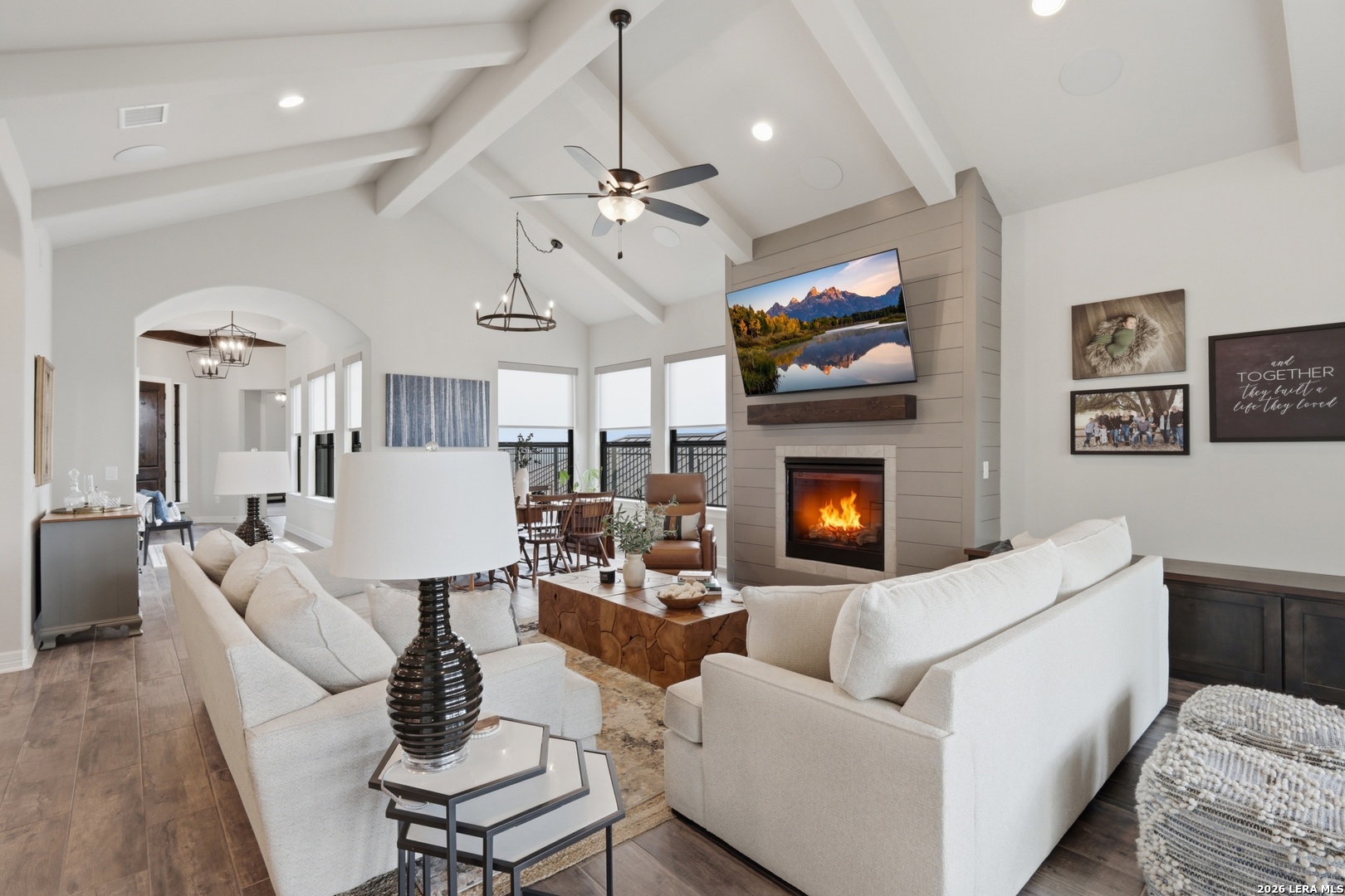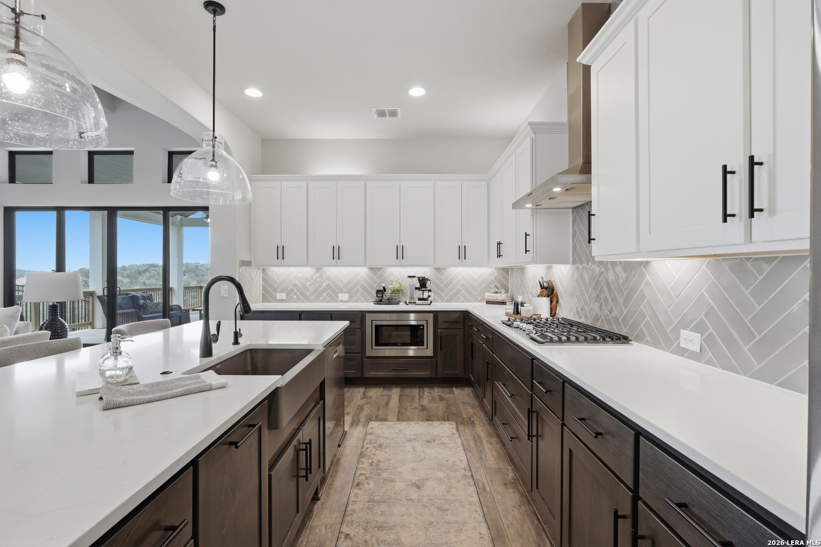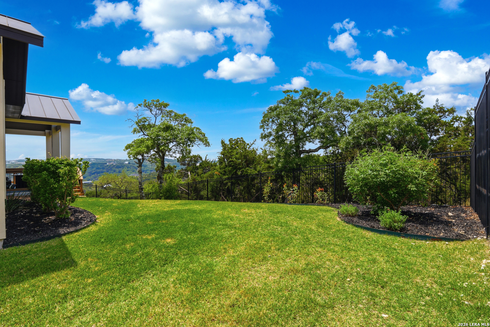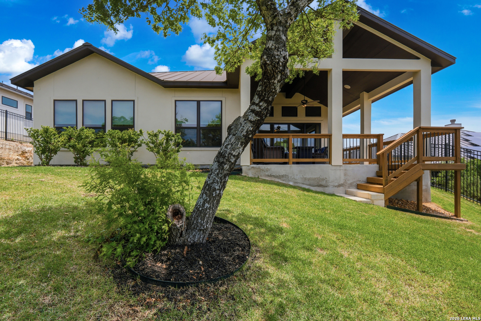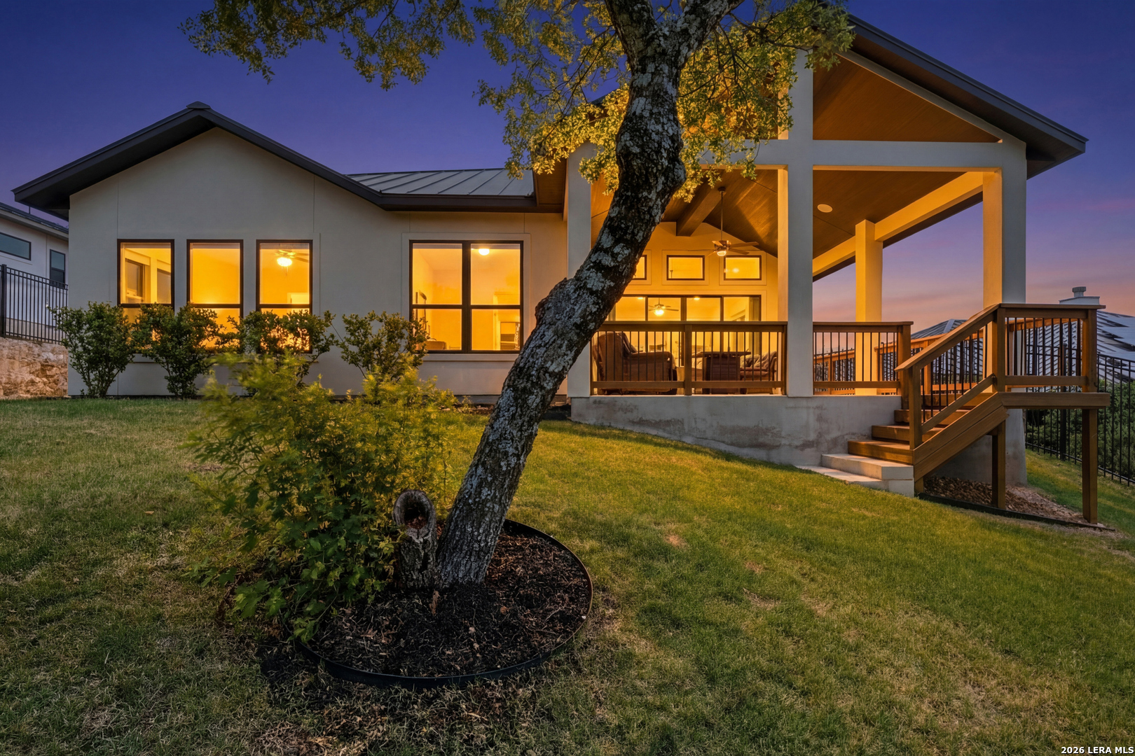 Experience refined single-story living in this thoughtfully designed home, where elegant interiors and seamless indoor-outdoor living come together. The open-concept floor plan is filled with natural light and designed for both everyday comfort and entertaining, featuring a spacious living room anchored by a beautiful gas fireplace, built-in speakers and sliding glass door to the oversized covered patio. The home flows well into the chef's kitchen complete with an oversized island, gas cooking, double ovens, pendant lighting, undermount sink, an abundance of cabinet storage space, premium finishes, and generous prep space. Sophisticated design details and curated decor including warm wood tile flooring create an elevated atmosphere throughout the home. The spacious primary suite is separated from the other bedrooms and has Hill Country views while the bathroom has double vanities and an oversized walk in shower. A private office offers a quiet, separate workspace ideal for remote work and study. Each bedroom is thoughtfully designed with its own ensuite bathroom, providing privacy and convenience for everyone. Step outside to an oversized covered patio where you can unwind, entertain, and take in breathtaking sunset views across the Texas Hill Country. Additional features include a metal roof, gas stub out on the back patio and an oversized garage with extra space ideal for a workshop, hobby area, or seasonal storage. The gated neighborhood includes an amenity center with pool, gathering room, workout facility, playground and court yard. This home offers one of the best views in the neighborhood creating a blend of luxury, functionality, and scenic Hill Country living, designed to make everyday life feel exceptional! Schedule your private showing today.