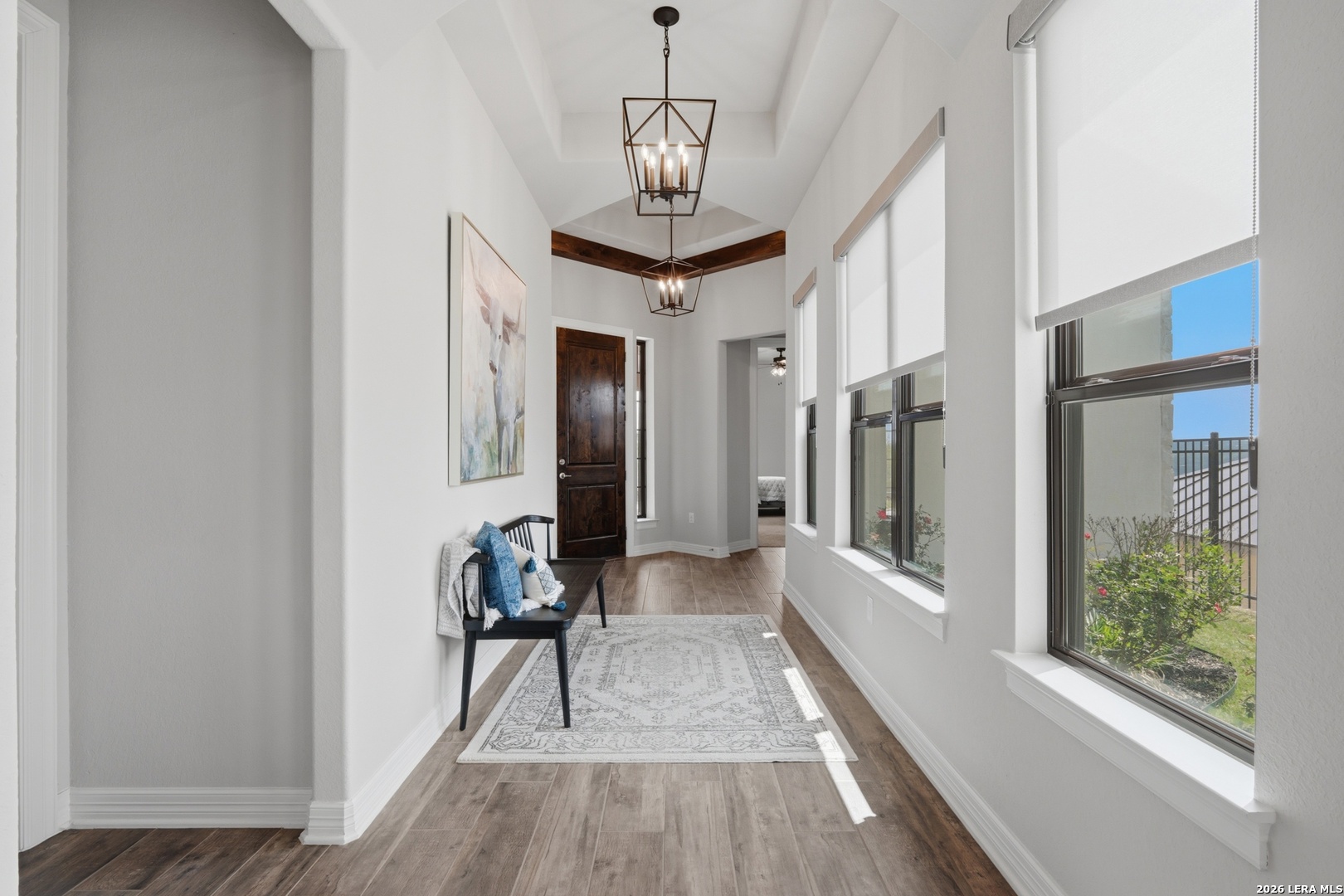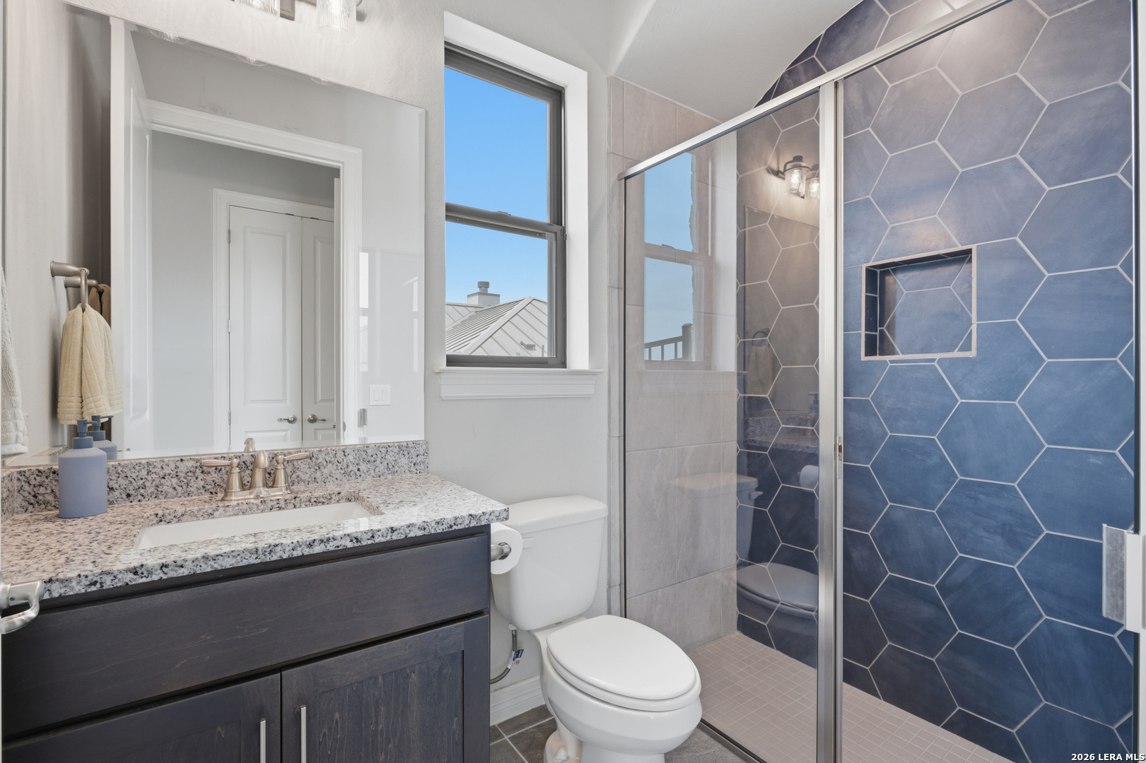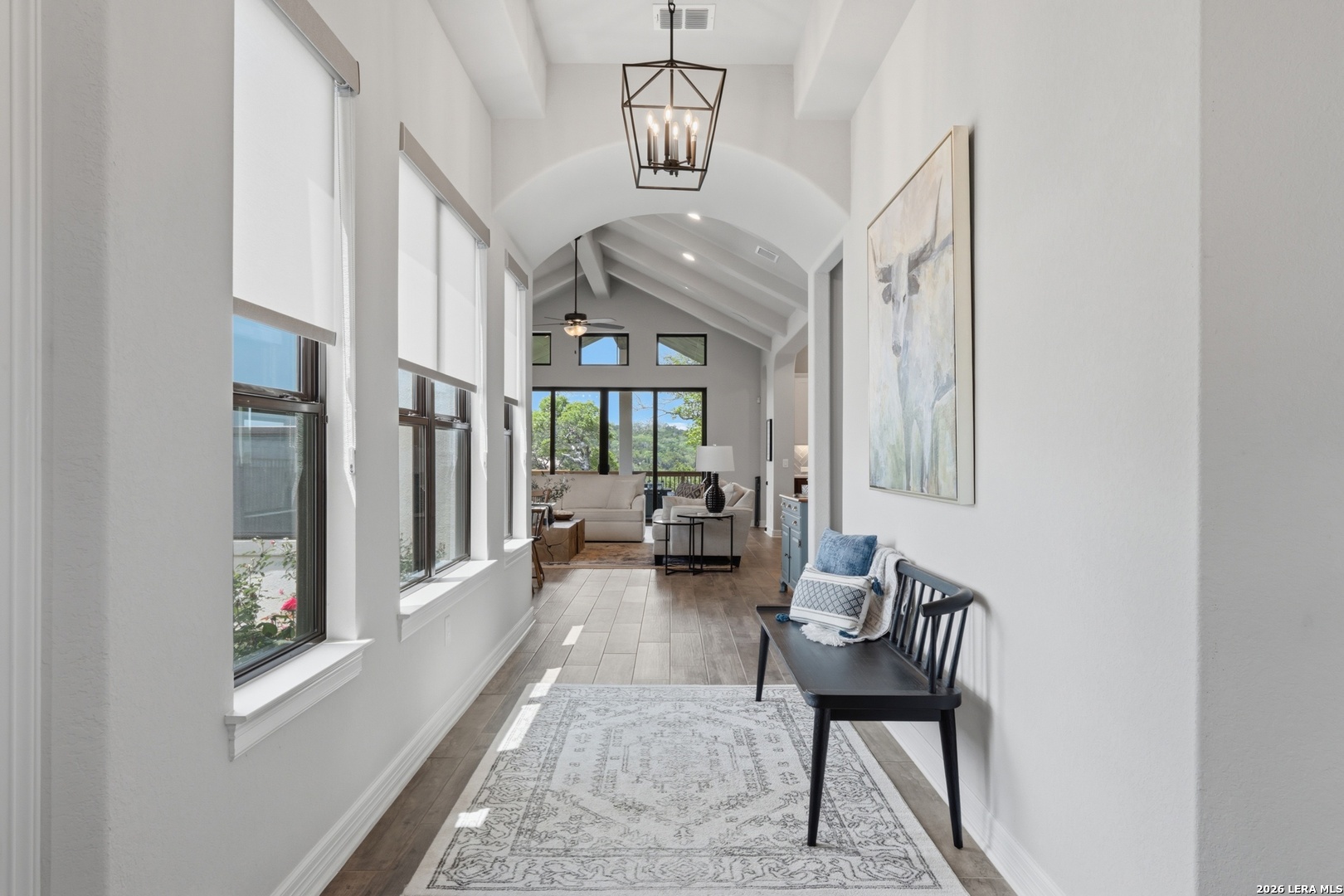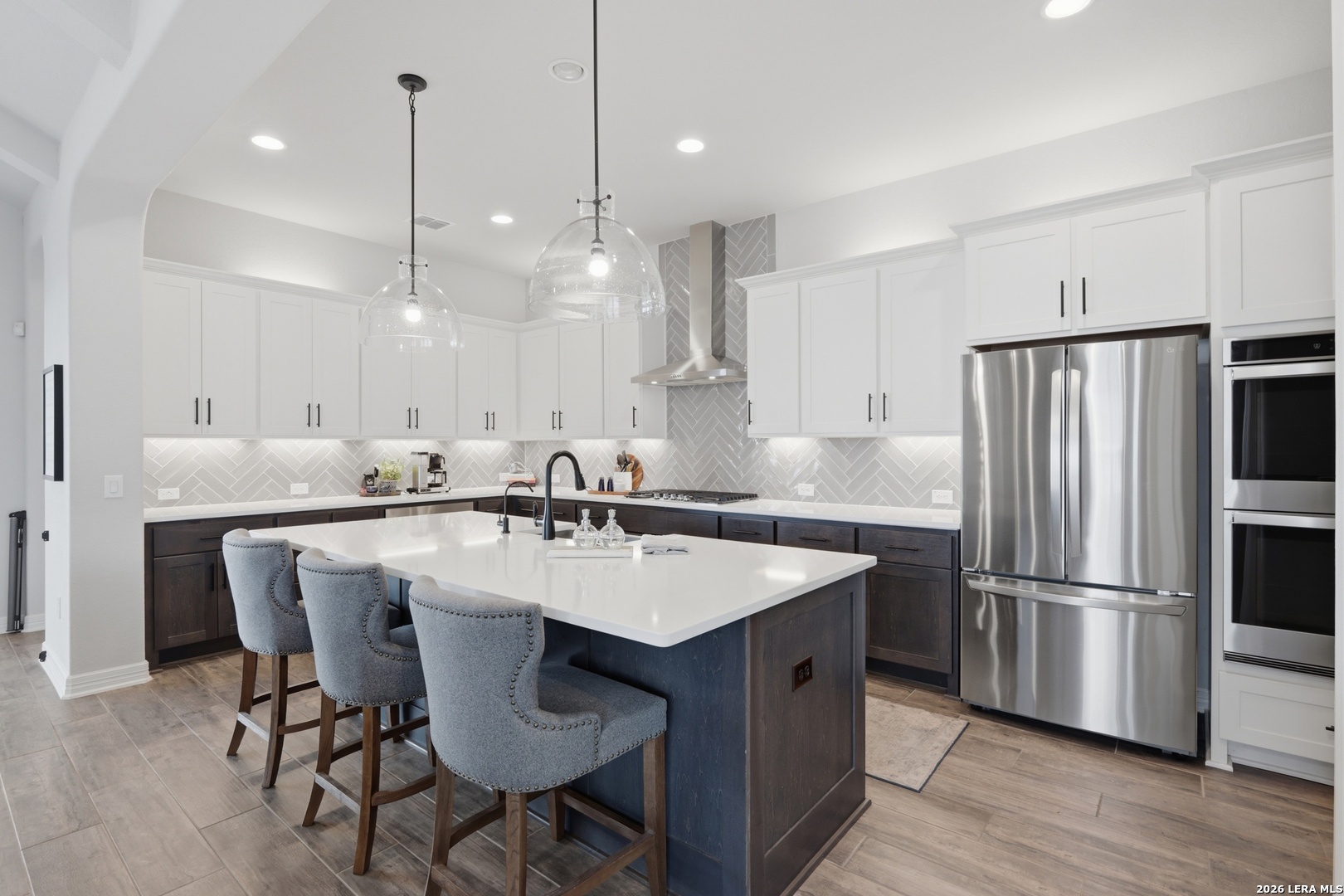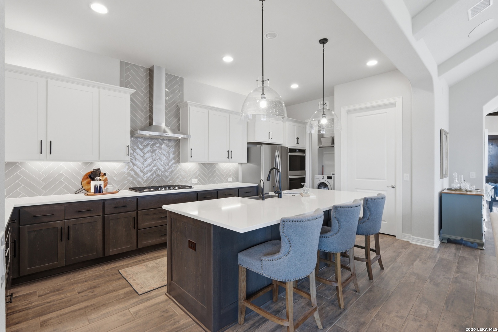 Experience refined single-story living in this thoughtfully designed home, where elegant interiors and seamless indoor-outdoor living come together. The open-concept floor plan is filled with natural light and designed for both everyday comfort and entertaining, featuring a spacious living room anchored by a beautiful gas fireplace, built-in speakers and sliding glass door to the oversized covered patio. The home flows well into the chef's kitchen complete with an oversized island, gas cooking, double ovens, pendant lighting, undermount sink, an abundance of cabinet storage space, premium finishes, and generous prep space. Sophisticated design details and curated decor including warm wood tile flooring create an elevated atmosphere throughout the home. The spacious primary suite is separated from the other bedrooms and has Hill Country views while the bathroom has double vanities and an oversized walk in shower. A private office offers a quiet, separate workspace ideal for remote work and study. Each bedroom is thoughtfully designed with its own ensuite bathroom, providing privacy and convenience for everyone. Step outside to an oversized covered patio where you can unwind, entertain, and take in breathtaking sunset views across the Texas Hill Country. Additional features include a metal roof, gas stub out on the back patio and an oversized garage with extra space ideal for a workshop, hobby area, or seasonal storage. The gated neighborhood includes an amenity center with pool, gathering room, workout facility, playground and court yard. This home offers one of the best views in the neighborhood creating a blend of luxury, functionality, and scenic Hill Country living, designed to make everyday life feel exceptional! Schedule your private showing today.