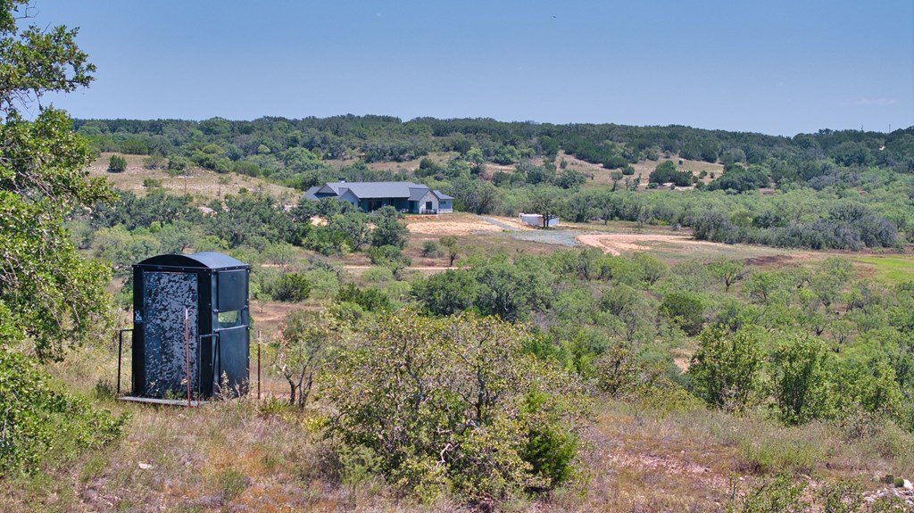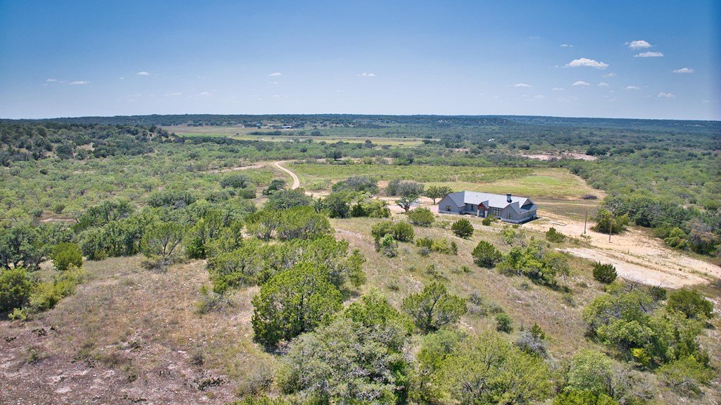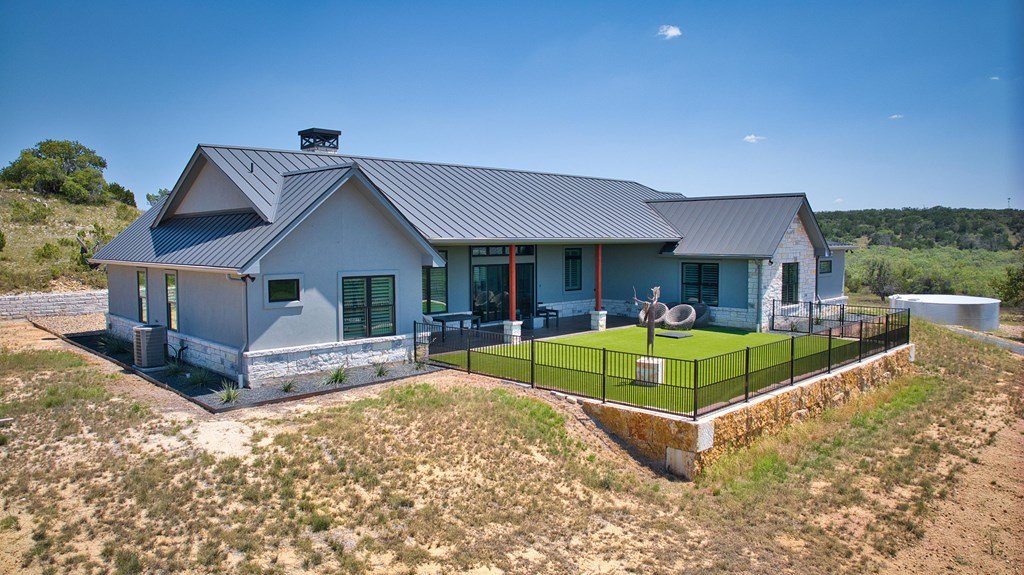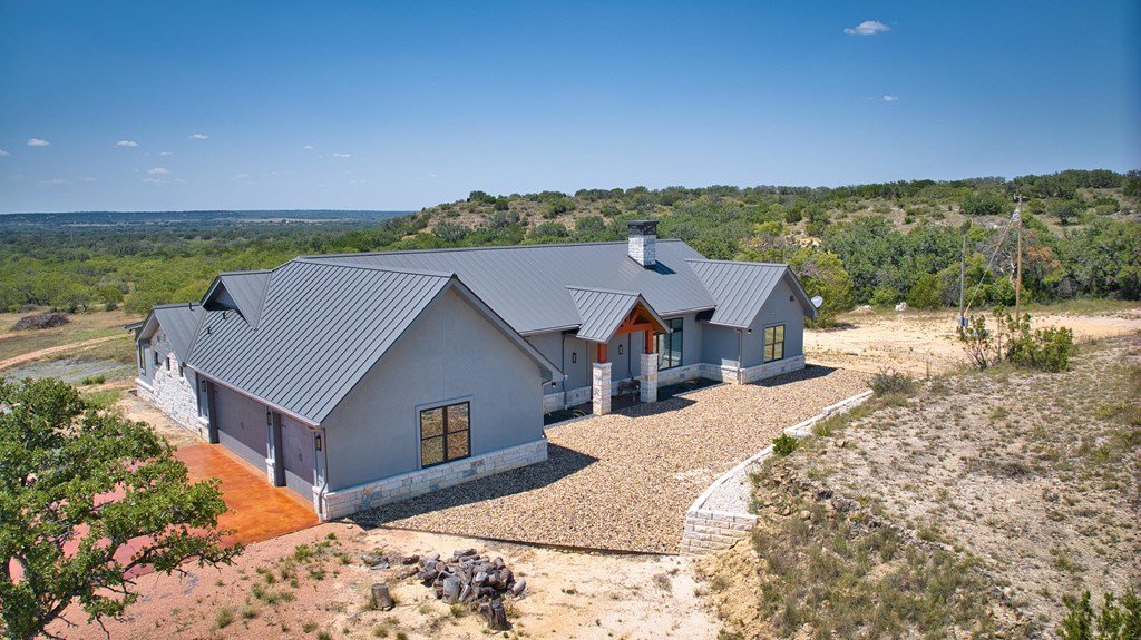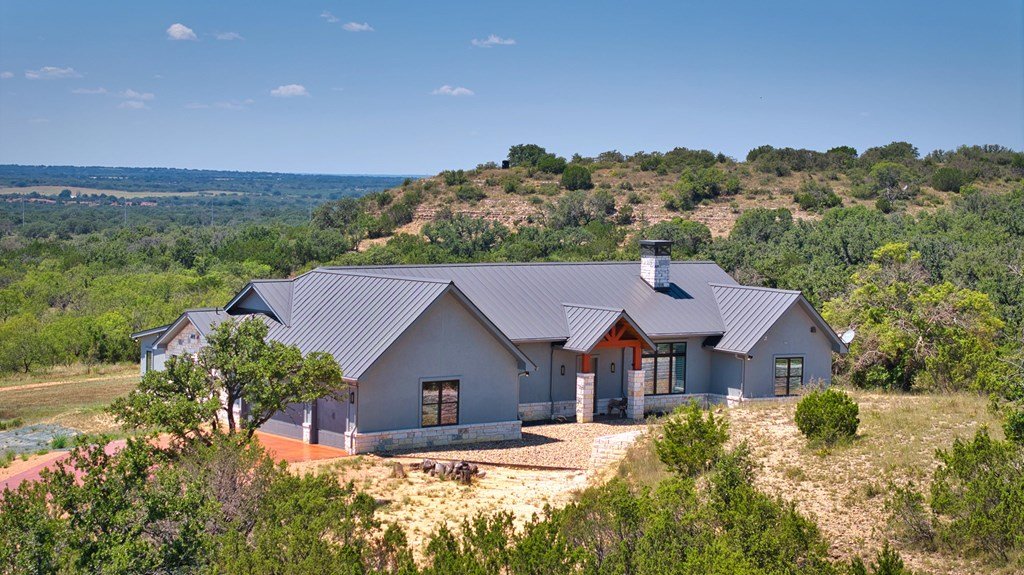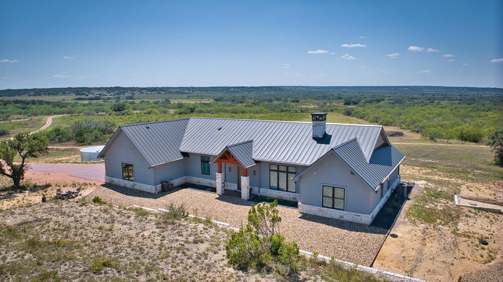 Welcome to Mason Mountain Ranch, an exquisite retreat at 7487 US Highway 87 N, Mason, TX. Nestled in the rolling hills of Mason Mountain, this newly built, move-in ready home offers breathtaking panoramic views of distant hills and lowlands. Protected by a unique Worrell Shaman sculpture, the 4-bedroom, 3-bath "sealed envelope" home is a masterpiece of design, featuring a Horseshoe Bay-inspired open-concept layout. The heart of the home boasts a cozy wood-burning fireplace and west-facing floor-to-ceiling windows that flood the space with natural light, seamlessly blending indoor and outdoor living. The kitchen is a chef's dream featuring state of the art appliances and a butler's pantry. Step outside to the fenced area, where you'll find artificial turf and a custom inset fire pit, the perfect spot for stargazing and enjoying the serenity of the hill country. The front yard features low maintenance xeriscaping that blends with the natural habitat. Set on approximately 124 acres, the ranch is adorned with oak, mesquite, and some cedar trees, creating a perfect environment for whitetail deer, turkey, and other native wildlife.