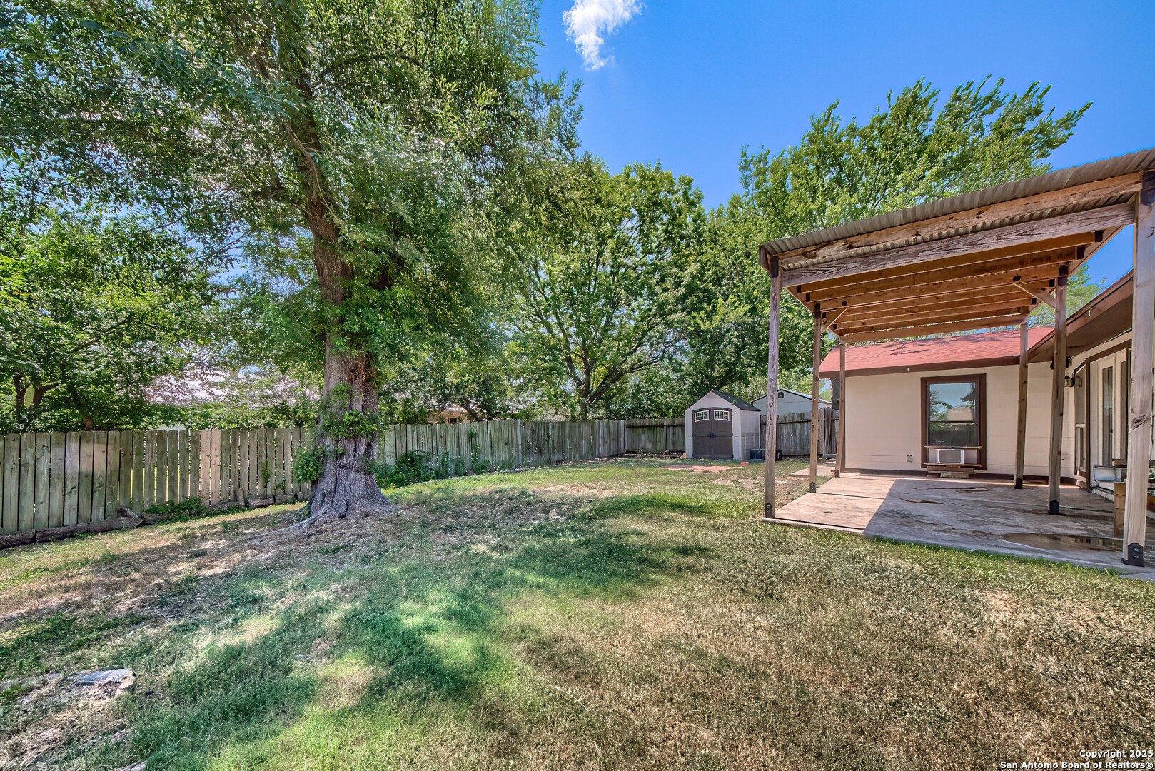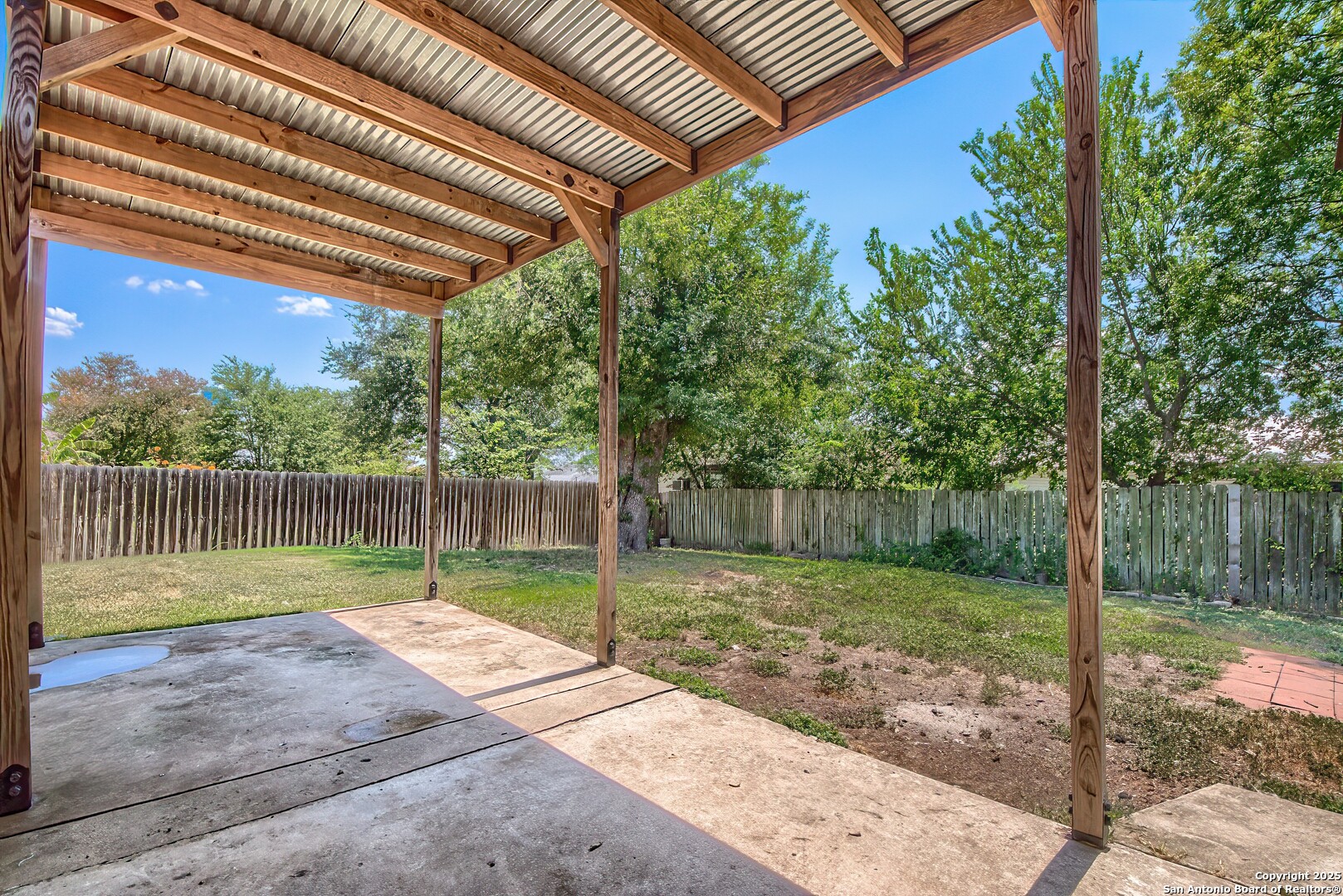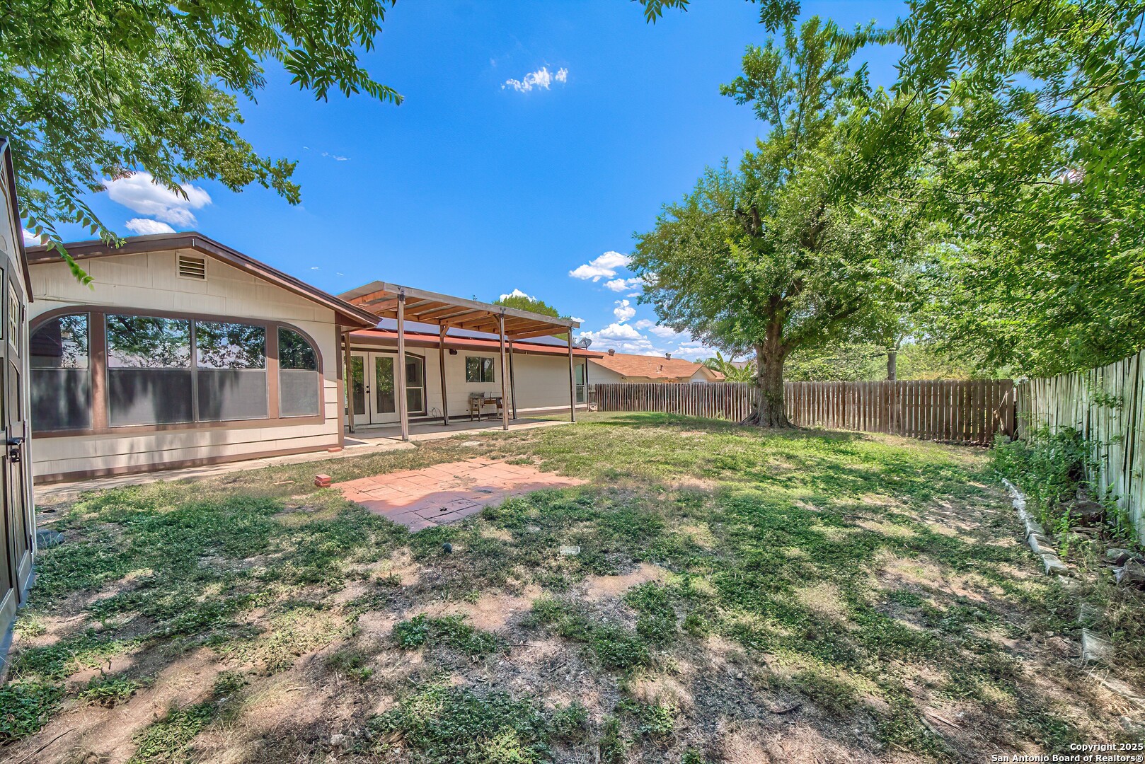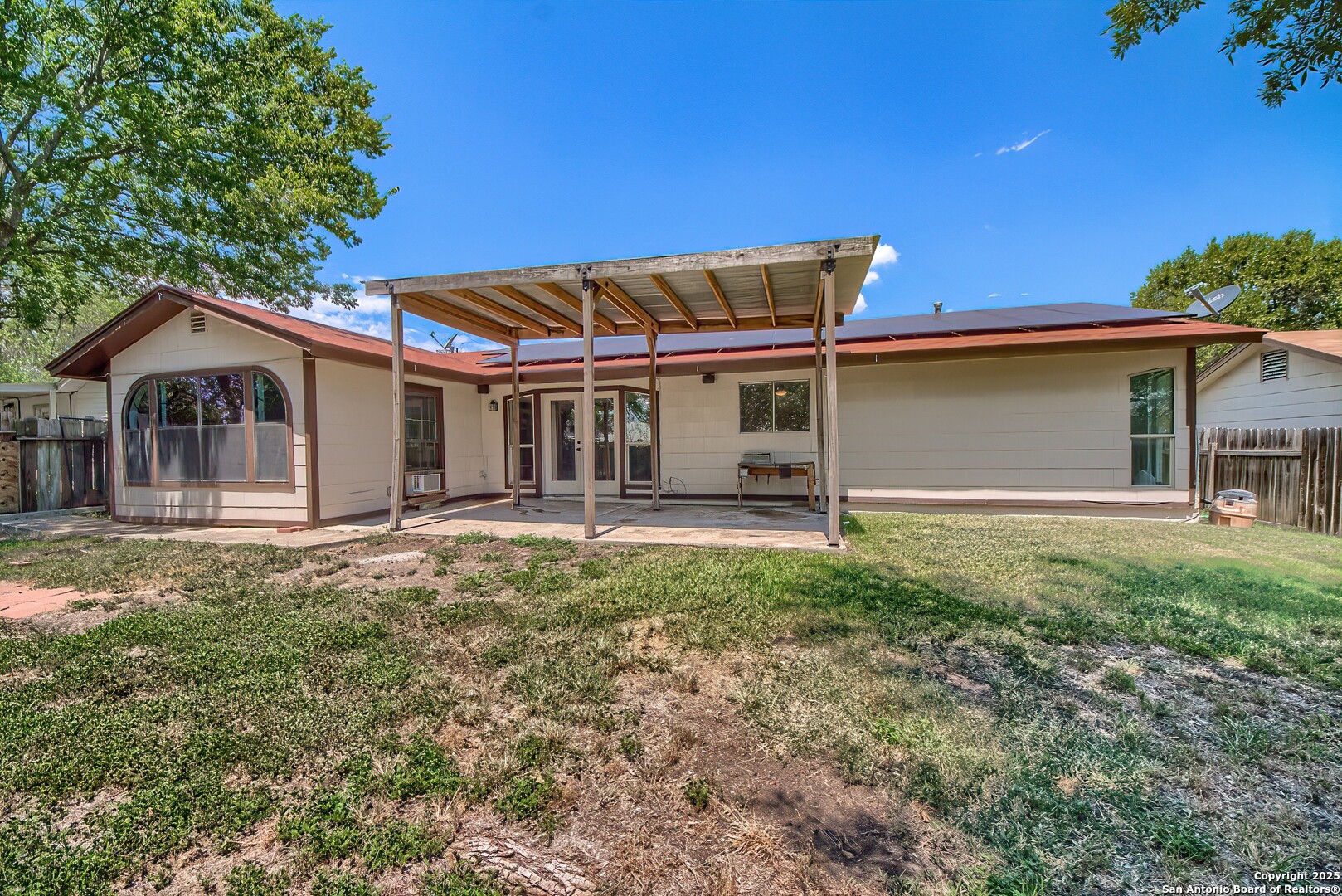 DARLING, RENOVATED SINGLE STORY WITH SOLAR & WITHOUT THE CONTROLS OF HOA BUT WITH THE AMENITIES OF ONE! The City of Live Oak in the middle of Northeast San Antonio offers its residents quiet tree-lined streets, easy access to I-35, restaurants and shopping, a huge city park with lake, Olympic-sized swimming pool, multiple other parks, walking and biking trails so this home's neighborhood is unbeatable. The adorable stucco mission style home welcomes you from the street with its side-entry, two-car garage, charming arches and metal accents and wide, level drive. Once past the Tuscan style wood front door you are treated to a warm, open concept home with elevated beamed ceiling, awash with natural light and all tumbled travertine and luxury vinyl flooring. Huge picture windows frame the living space which opens seamlessly into a dining room tucked between the foyer and kitchen. Feel part of the action as you cook from your renovated kitchen, with granite countertops, updated shaker hardwood cabinets, stainless appliances and even a window over the sink! A bright breakfast nook leads into a generous bonus room, ideal for an office, gym, second living or playroom. The bedroom wing features a gorgeously renovated guest bath with sleek granite topped wood vanity, exotic medicine cabinet, glass vessel sink and tumbled travertine tile on the floor and in the surround of the shower/tub combo. It looks like luxury but feels like it too with a jacuzzi tub! Two nice sized secondary bedrooms precede the primary suite at the end of the hall. Here find an ensuite bathroom renovated with a bronze glass vessel sink on the granite topped vanity, frameless glass walk-in shower with more gorgeous tumbled travertine here. The attached side entry garage offers so much space -- utility area, room for both vehicles and an extra dedicated open room for storage, or make a workshop. Out back, an adorable yard greets you with patio covered with an elevated roof to allow more breeze on our hot summer days! A storage shed is great for lawn tools or for overflow from your storage area in the garage. Of course, add to this perfect home recipe the inexpensive utility bills considering the solar panels cover the electricity -- water and trash pickup for these owners averaged about $90 a month! Popular Judson ISD schools include the newer Veterans Memorial High! Cute and convenient, don't wait to see this doll and make it home!