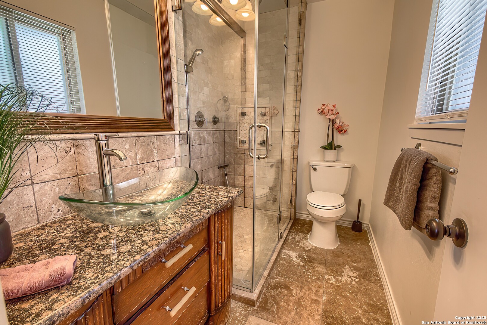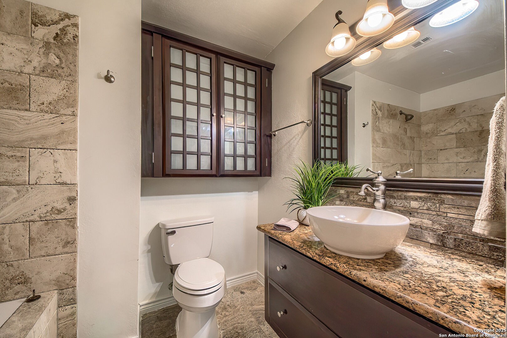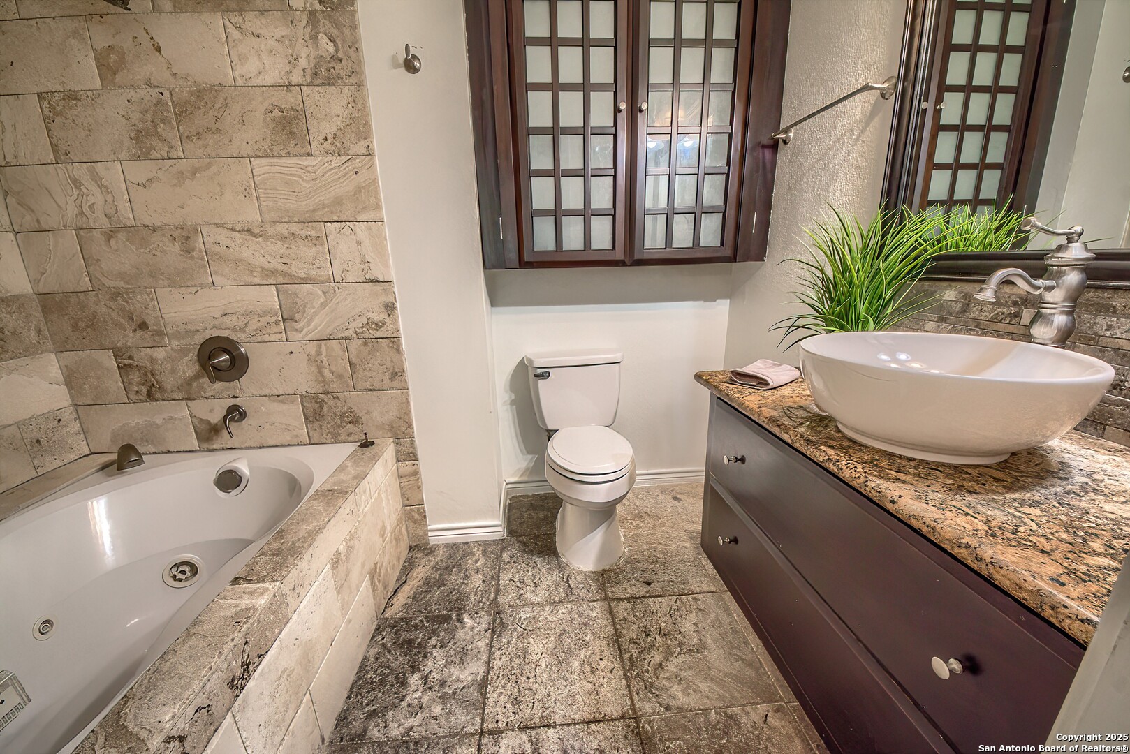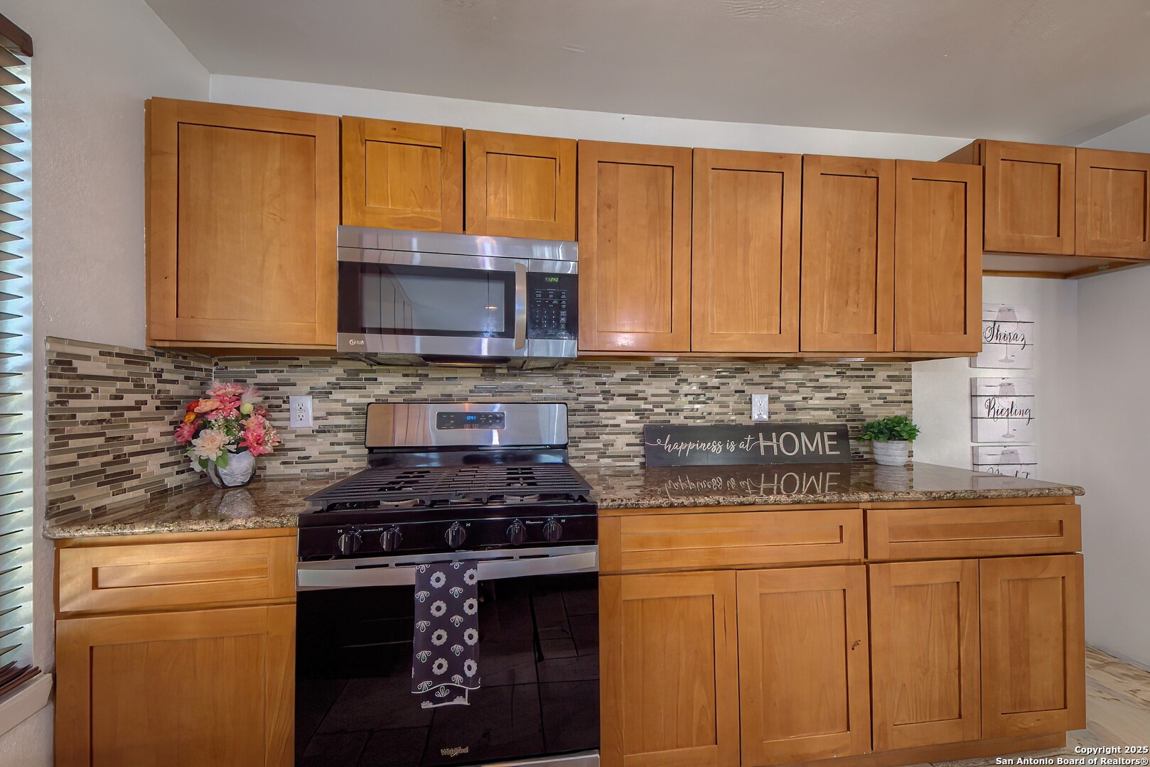 DARLING, RENOVATED SINGLE STORY WITH SOLAR & WITHOUT THE CONTROLS OF HOA BUT WITH THE AMENITIES OF ONE! The City of Live Oak in the middle of Northeast San Antonio offers its residents quiet tree-lined streets, easy access to I-35, restaurants and shopping, a huge city park with lake, Olympic-sized swimming pool, multiple other parks, walking and biking trails so this home's neighborhood is unbeatable. The adorable stucco mission style home welcomes you from the street with its side-entry, two-car garage, charming arches and metal accents and wide, level drive. Once past the Tuscan style wood front door you are treated to a warm, open concept home with elevated beamed ceiling, awash with natural light and all tumbled travertine and luxury vinyl flooring. Huge picture windows frame the living space which opens seamlessly into a dining room tucked between the foyer and kitchen. Feel part of the action as you cook from your renovated kitchen, with granite countertops, updated shaker hardwood cabinets, stainless appliances and even a window over the sink! A bright breakfast nook leads into a generous bonus room, ideal for an office, gym, second living or playroom. The bedroom wing features a gorgeously renovated guest bath with sleek granite topped wood vanity, exotic medicine cabinet, glass vessel sink and tumbled travertine tile on the floor and in the surround of the shower/tub combo. It looks like luxury but feels like it too with a jacuzzi tub! Two nice sized secondary bedrooms precede the primary suite at the end of the hall. Here find an ensuite bathroom renovated with a bronze glass vessel sink on the granite topped vanity, frameless glass walk-in shower with more gorgeous tumbled travertine here. The attached side entry garage offers so much space -- utility area, room for both vehicles and an extra dedicated open room for storage, or make a workshop. Out back, an adorable yard greets you with patio covered with an elevated roof to allow more breeze on our hot summer days! A storage shed is great for lawn tools or for overflow from your storage area in the garage. Of course, add to this perfect home recipe the inexpensive utility bills considering the solar panels cover the electricity -- water and trash pickup for these owners averaged about $90 a month! Popular Judson ISD schools include the newer Veterans Memorial High! Cute and convenient, don't wait to see this doll and make it home!
