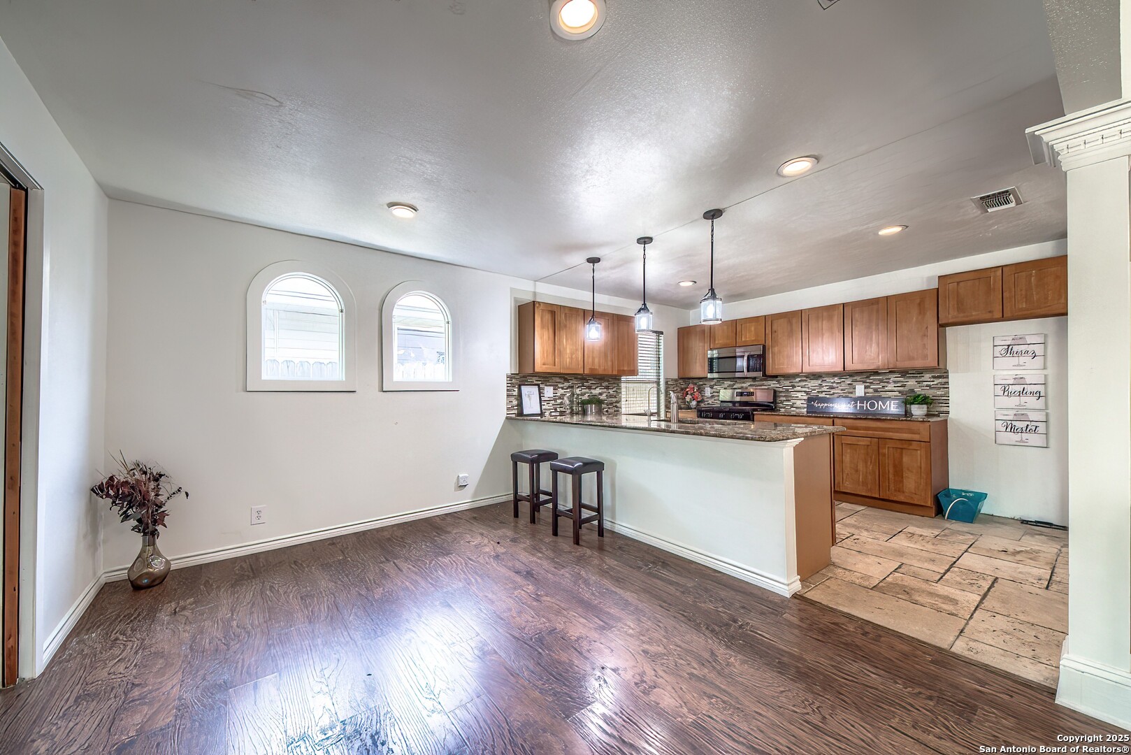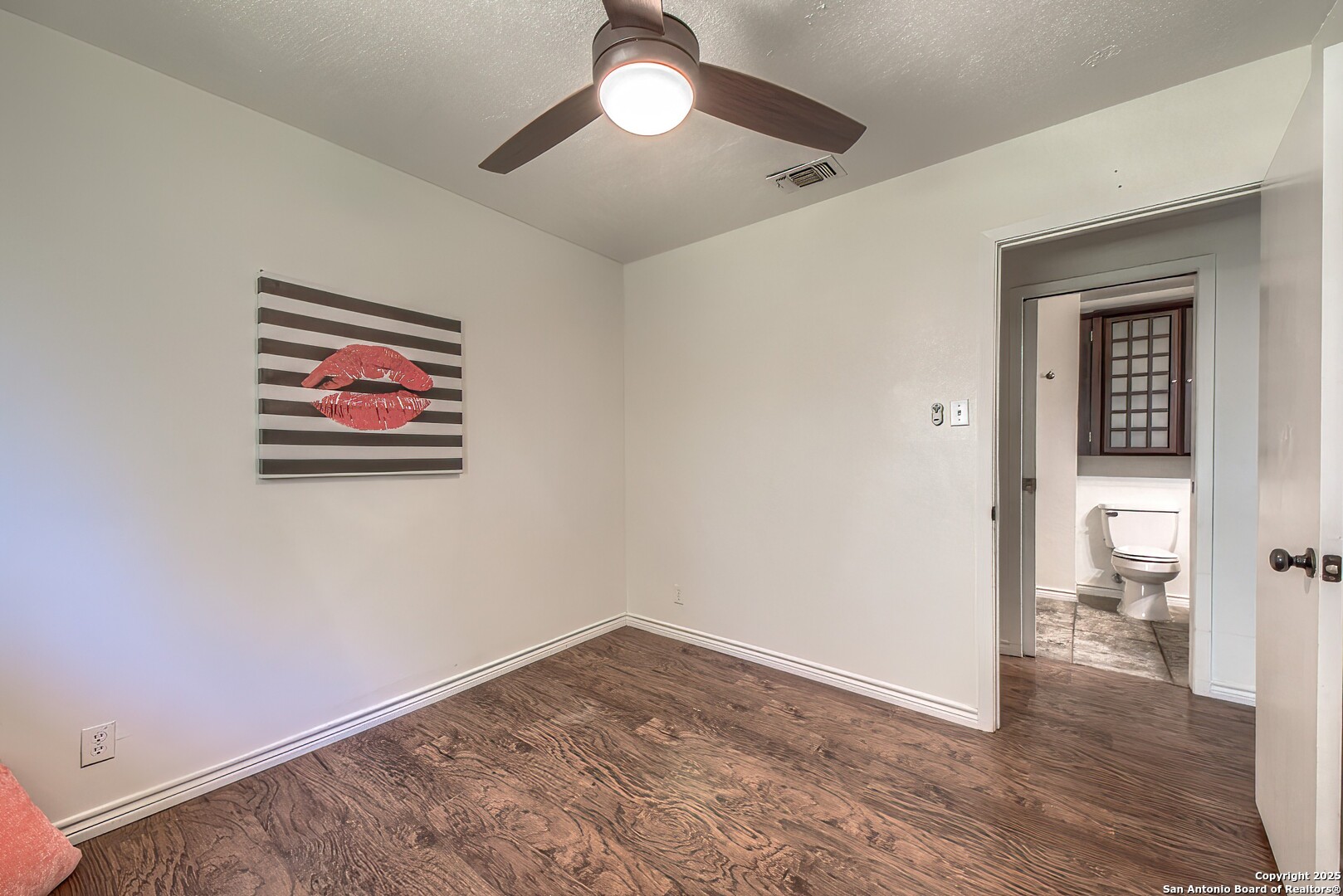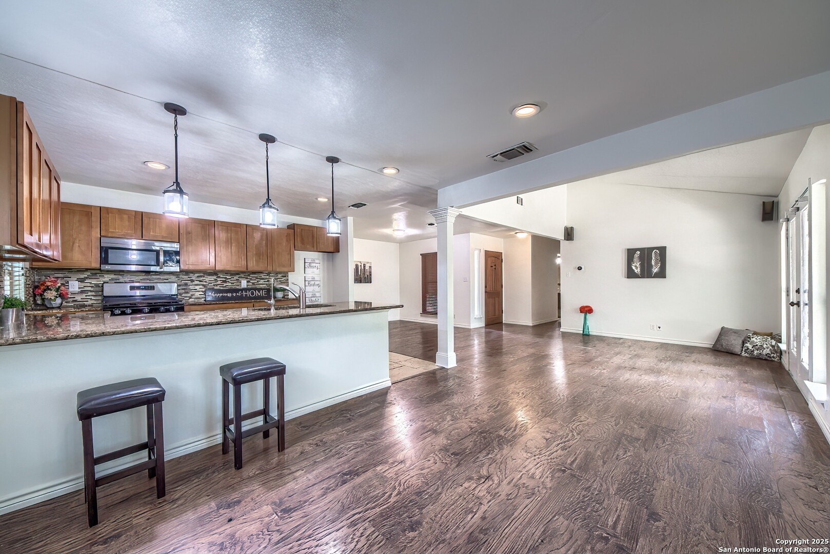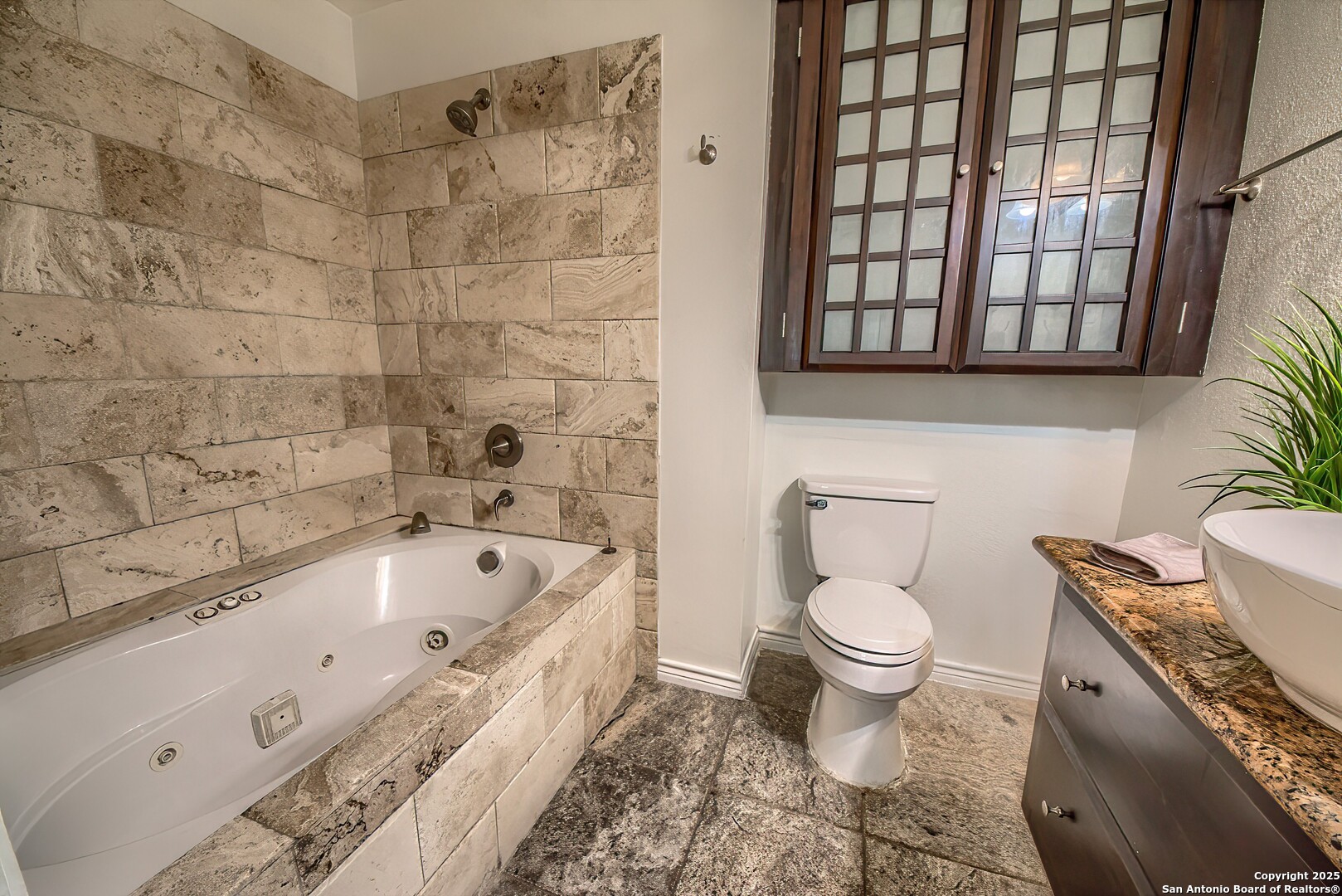 DARLING, RENOVATED SINGLE STORY WITH SOLAR & WITHOUT THE CONTROLS OF HOA BUT WITH THE AMENITIES OF ONE! The City of Live Oak in the middle of Northeast San Antonio offers its residents quiet tree-lined streets, easy access to I-35, restaurants and shopping, a huge city park with lake, Olympic-sized swimming pool, multiple other parks, walking and biking trails so this home's neighborhood is unbeatable. The adorable stucco mission style home welcomes you from the street with its side-entry, two-car garage, charming arches and metal accents and wide, level drive. Once past the Tuscan style wood front door you are treated to a warm, open concept home with elevated beamed ceiling, awash with natural light and all tumbled travertine and luxury vinyl flooring. Huge picture windows frame the living space which opens seamlessly into a dining room tucked between the foyer and kitchen. Feel part of the action as you cook from your renovated kitchen, with granite countertops, updated shaker hardwood cabinets, stainless appliances and even a window over the sink! A bright breakfast nook leads into a generous bonus room, ideal for an office, gym, second living or playroom. The bedroom wing features a gorgeously renovated guest bath with sleek granite topped wood vanity, exotic medicine cabinet, glass vessel sink and tumbled travertine tile on the floor and in the surround of the shower/tub combo. It looks like luxury but feels like it too with a jacuzzi tub! Two nice sized secondary bedrooms precede the primary suite at the end of the hall. Here find an ensuite bathroom renovated with a bronze glass vessel sink on the granite topped vanity, frameless glass walk-in shower with more gorgeous tumbled travertine here. The attached side entry garage offers so much space -- utility area, room for both vehicles and an extra dedicated open room for storage, or make a workshop. Out back, an adorable yard greets you with patio covered with an elevated roof to allow more breeze on our hot summer days! A storage shed is great for lawn tools or for overflow from your storage area in the garage. Of course, add to this perfect home recipe the inexpensive utility bills considering the solar panels cover the electricity -- water and trash pickup for these owners averaged about $90 a month! Popular Judson ISD schools include the newer Veterans Memorial High! Cute and convenient, don't wait to see this doll and make it home!