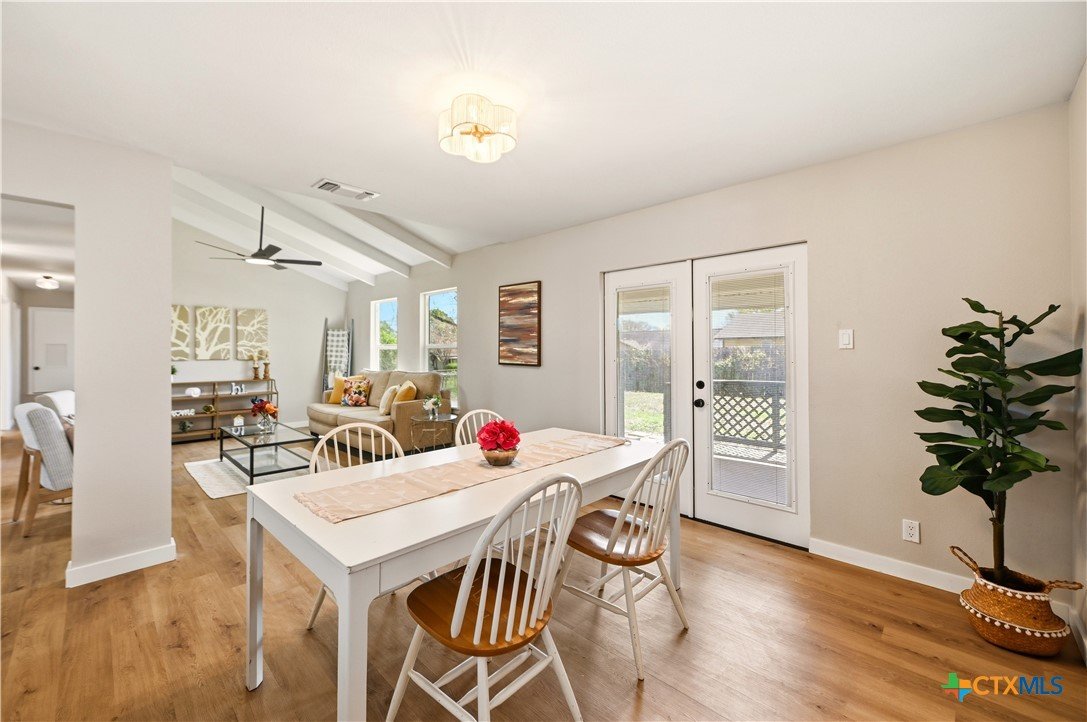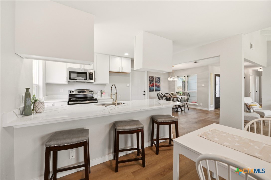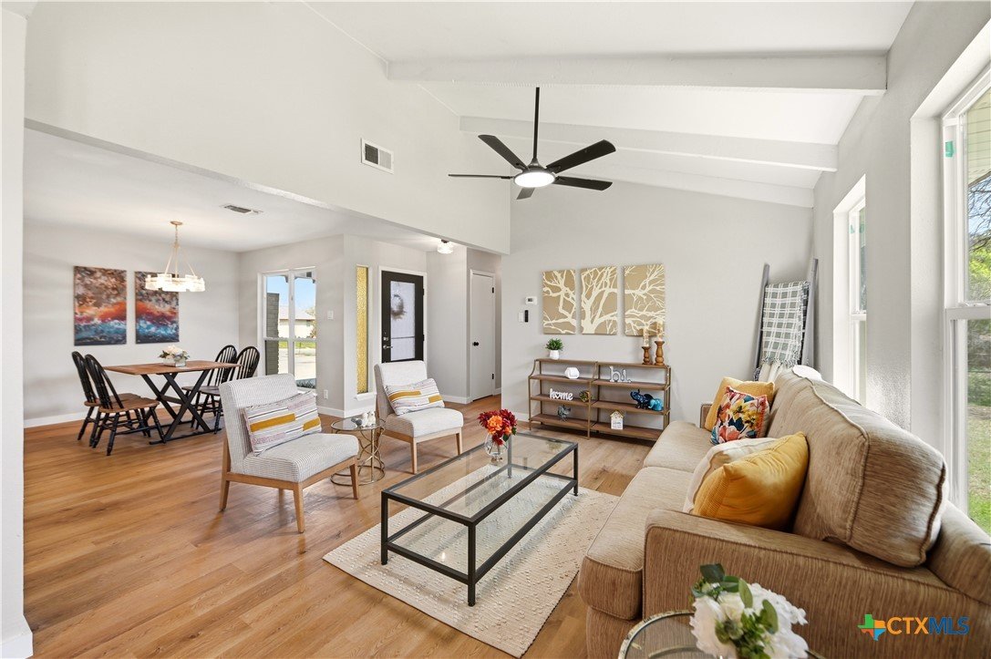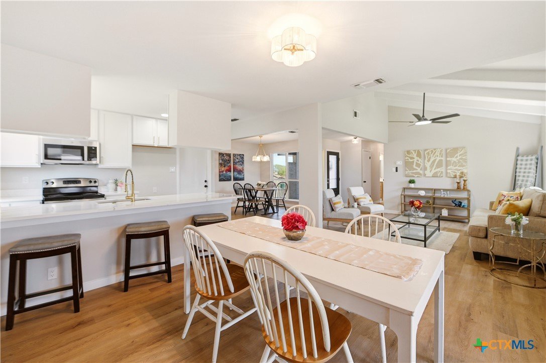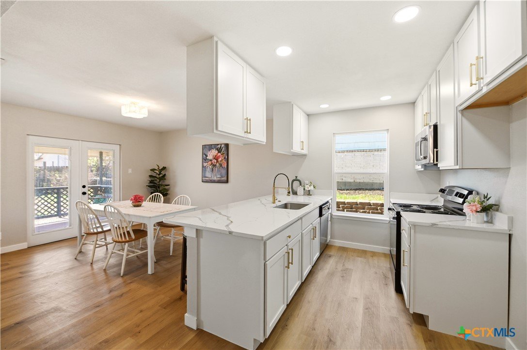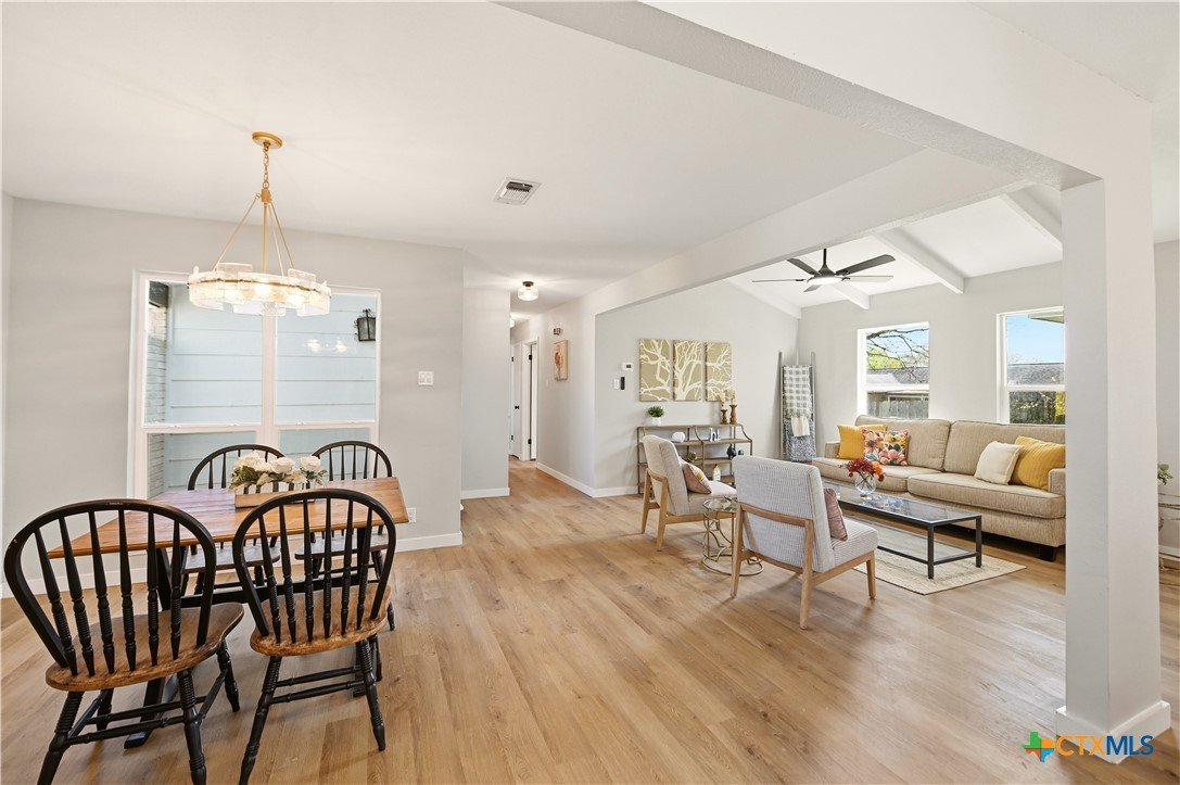 Better than new and beautifully reimagined from top to bottom, this light-filled home offers beautiful updates, soaring ceilings, a seamless open-concept layout designed for both everyday living and effortless entertaining. Fresh interior paint and brand-new flooring flow throughout the home, creating a clean, modern feel from top to bottom. The fully updated kitchen features brand-new cabinetry, sleek quartz countertops, stainless steel appliances, a new sink and faucet, and a spacious peninsula with counter-height seating. With two spacious dining areas, enjoy flexible use for dining, entertaining, or a flex room/office setup. Major system upgrades provide peace of mind, including a brand-new roof, new HVAC system, and all new windows. Making this home as efficient as it is beautiful. Step outside to enjoy a generously sized yard shaded by mature trees...perfect for relaxing, entertaining, or creating your own outdoor oasis. The home also features fresh exterior paint, enhancing its curb appeal and giving it a crisp, updated look. Tucked away on a quiet street, yet just minutes from I-35, Loop 1604, and Wurzbach Parkway, this home offers the ideal blend of peaceful living with unbeatable convenience to shopping, dining, and schools. Grass virtually enhanced.