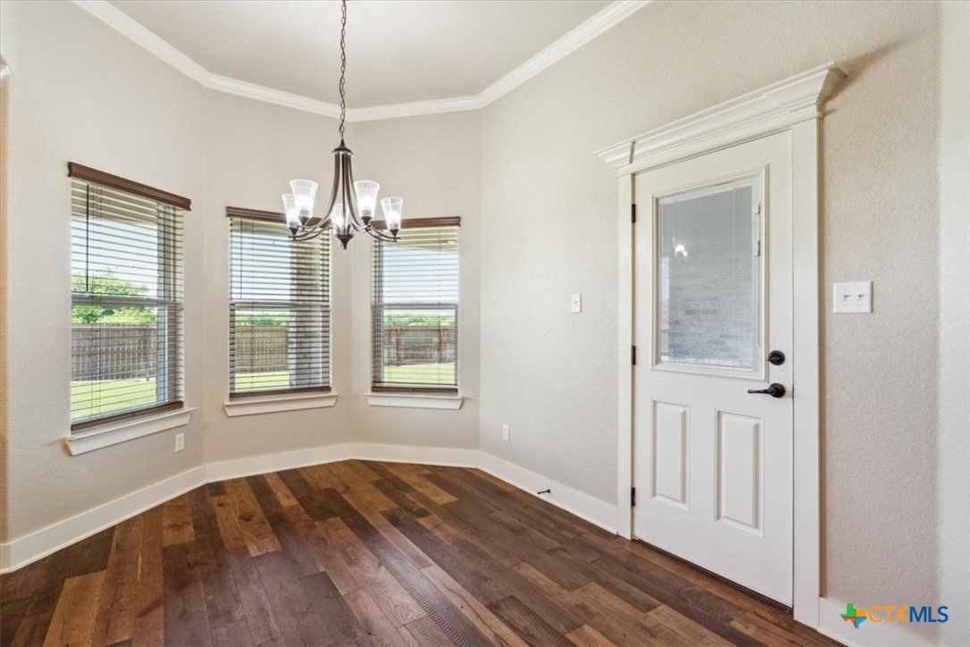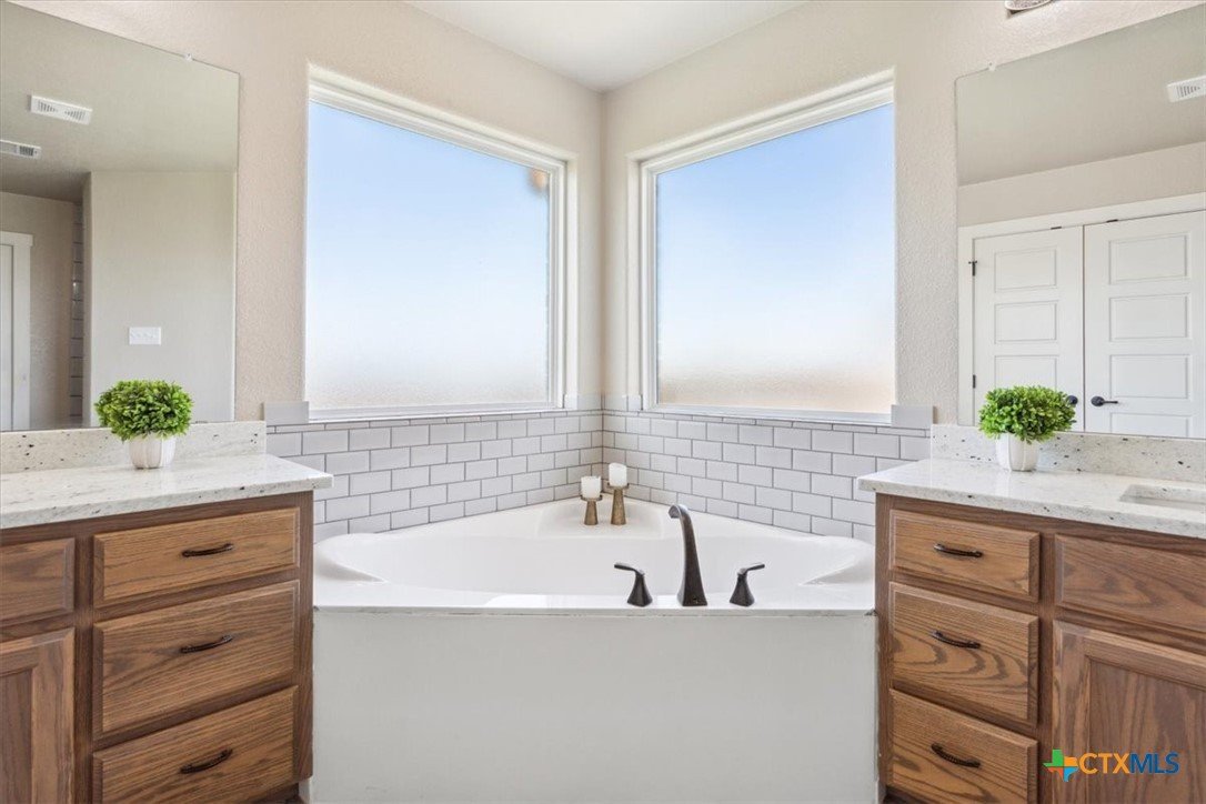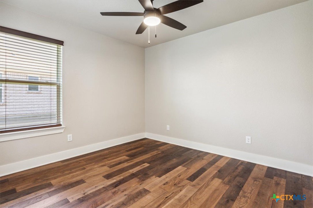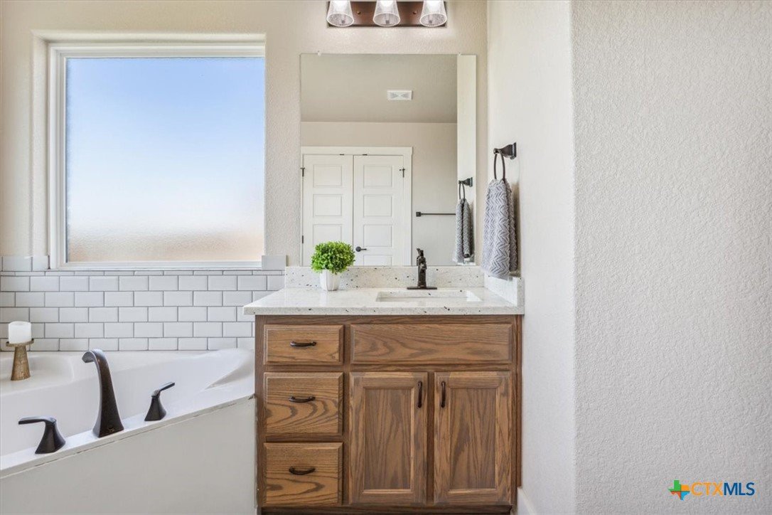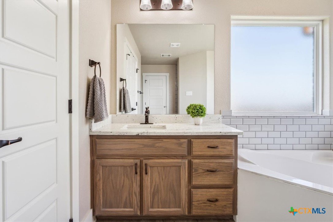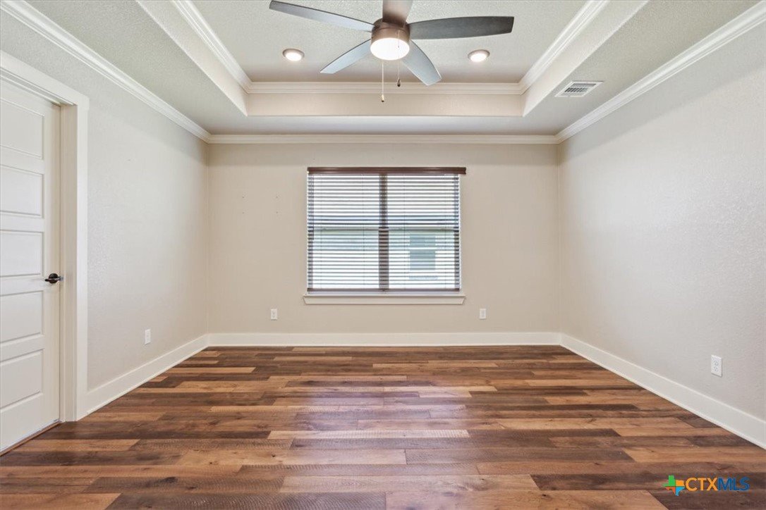 This beautifully maintained 4-bedroom, 2-bath home by Tippit Homes is tucked away in The Reserve at Pea Ridge in West Temple. From the moment you step inside, rich wood flooring flows throughout the home, creating a clean feel with no carpet throughout. The family room is highlighted by a tray ceiling with crown detailing and recessed lighting, while the open kitchen, dining, and living areas connect seamlessly, making both everyday living and entertaining feel effortless. The split floor plan offers privacy for the primary suite. The bathroom feels like a personal retreat with dual vanities, a corner soaking tub, a walk-in shower, and an oversized walk-in closet. Three additional bedrooms provide flexibility for guests, a home office, or a playroom. Step outside to the covered back patio and enjoy a spacious backyard with NO rear neighbors, ideal for quiet evenings or weekend gatherings. Additional features include 2” wood blinds throughout, a sprinkler system, and rain gutters. Conveniently located near shopping, dining, and easy I-35 access, and zoned for Belton ISD, this home offers comfort, functionality, and location in one well-designed package. Come see it today!