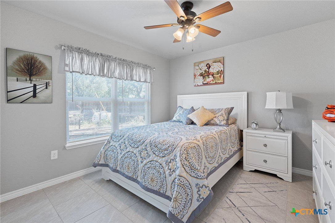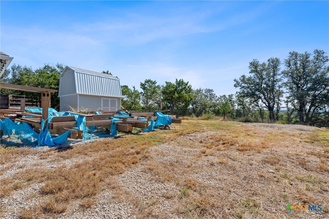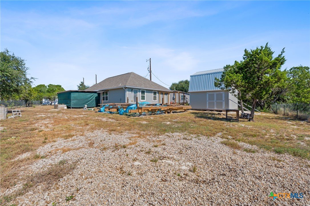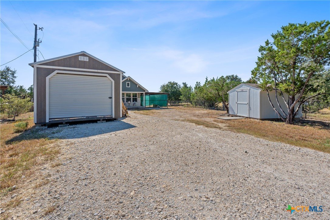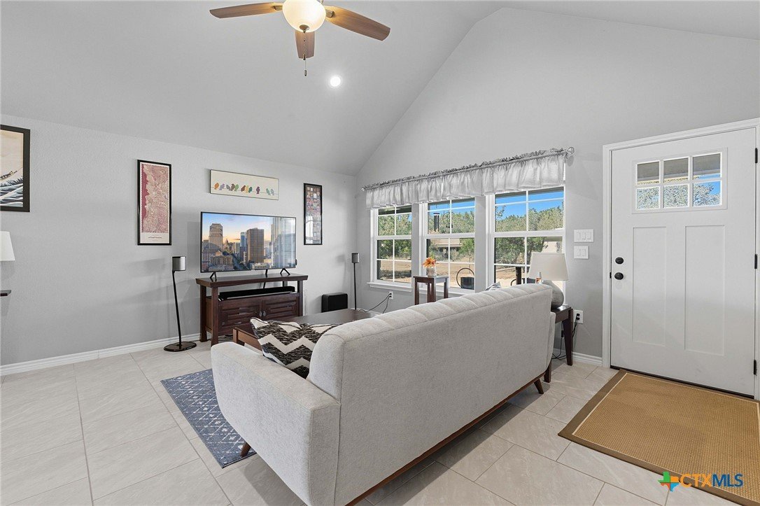 Easy Hill Country living! Bright single-story with vaulted ceilings, open living/dining, and tile flooring. The kitchen features granite-like patterned counters, stainless appliances, rich wood cabinetry, and an island breakfast bar. Split primary suite with tray ceiling, single sink, and a walk-in closet; generous secondary bedrooms plus a dedicated laundry room. Outside: gated entry, wide gravel drive, covered RV/boat parking, two storage sheds, and a back patio that the seller will complete prior to closing. Convenient Spring Branch location near US-281, Canyon Lake, and the Guadalupe River. Move in ready!