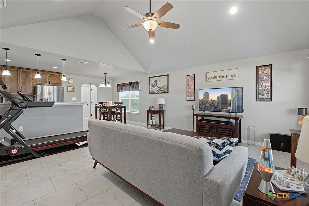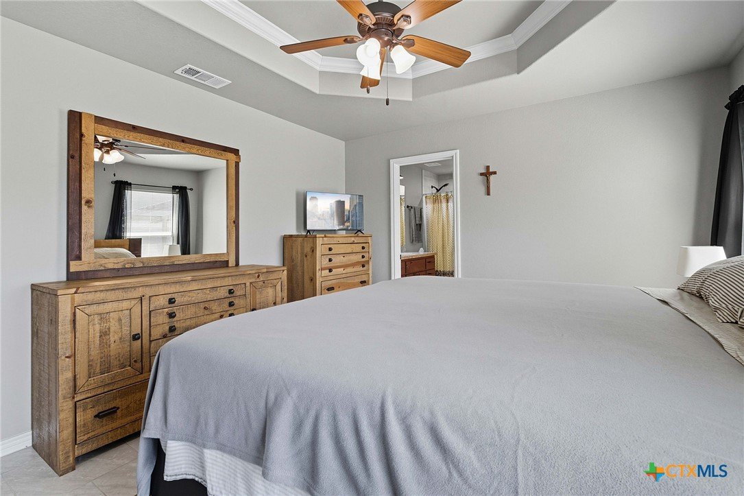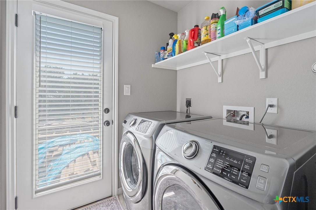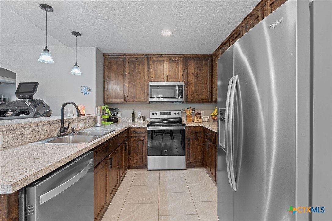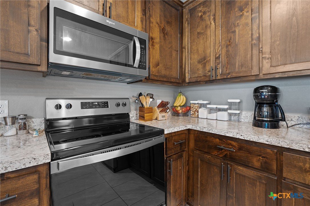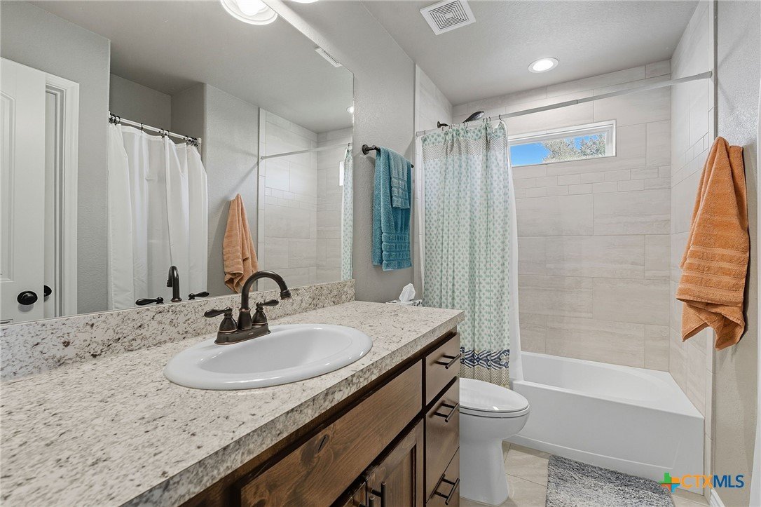 Easy Hill Country living! Bright single-story with vaulted ceilings, open living/dining, and tile flooring. The kitchen features granite-like patterned counters, stainless appliances, rich wood cabinetry, and an island breakfast bar. Split primary suite with tray ceiling, single sink, and a walk-in closet; generous secondary bedrooms plus a dedicated laundry room. Outside: gated entry, wide gravel drive, covered RV/boat parking, two storage sheds, and a back patio that the seller will complete prior to closing. Convenient Spring Branch location near US-281, Canyon Lake, and the Guadalupe River. Move in ready!
