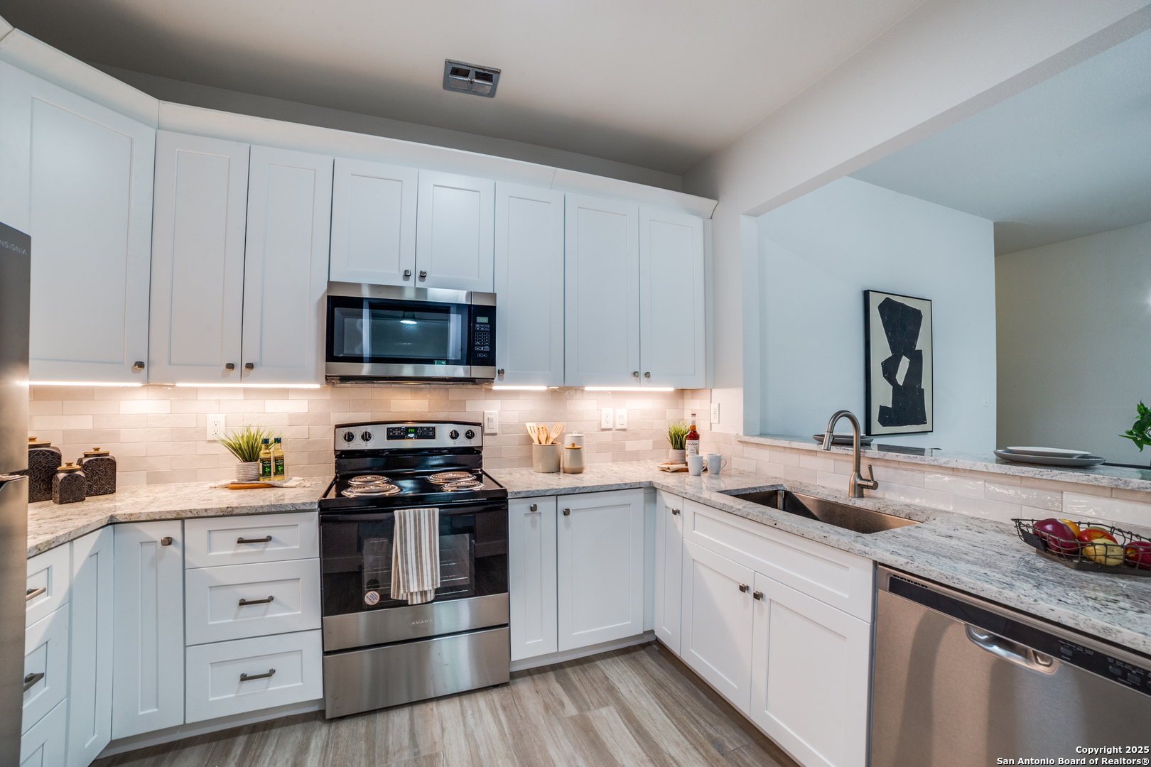 Sleek. Sophisticated. Alamo Heights Living. Welcome to this gorgeously reimagined 2-bedroom, 2-bath condo tucked inside a coveted gated community in the heart of Alamo Heights-where style meets convenience and everyday living feels like a luxury retreat. Step inside and fall in love with the clean lines and chic tile flooring that flows throughout the open-concept layout. The fully renovated kitchen is a true centerpiece: outfitted with striking granite countertops, a statement backsplash, and brand-new