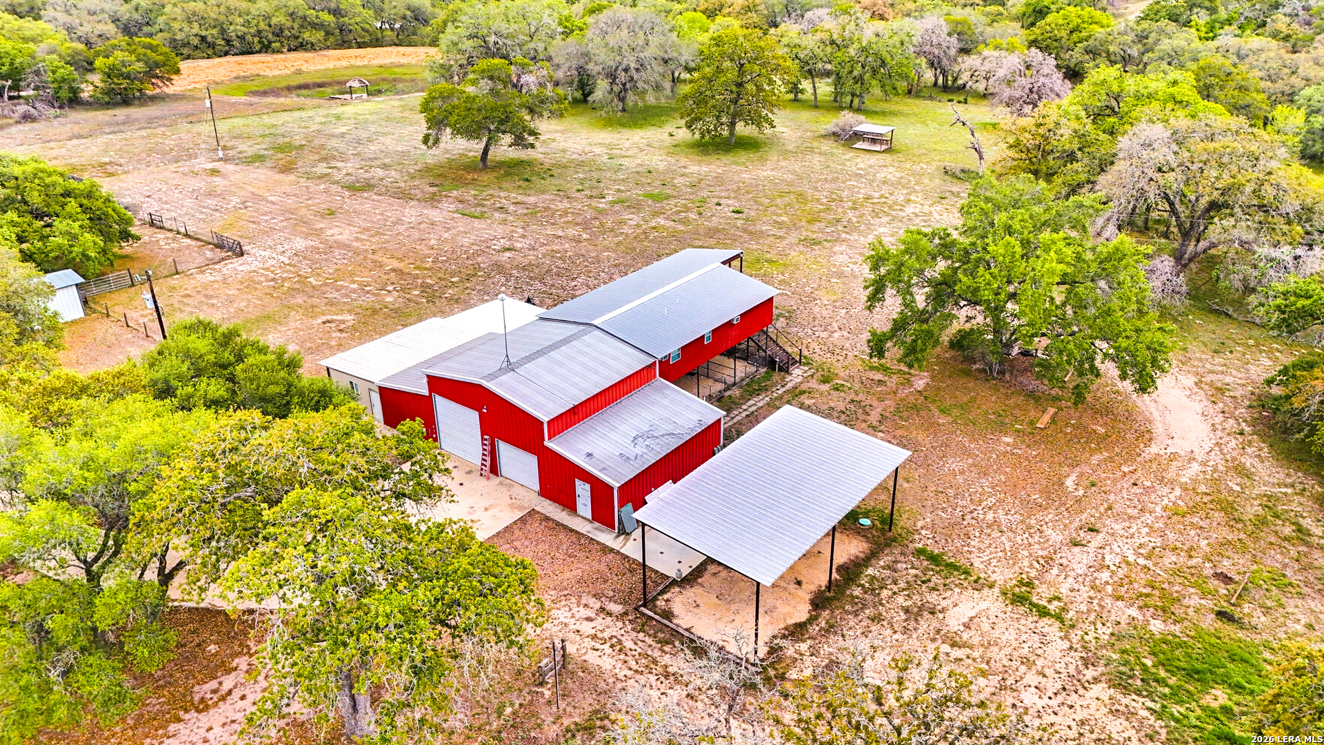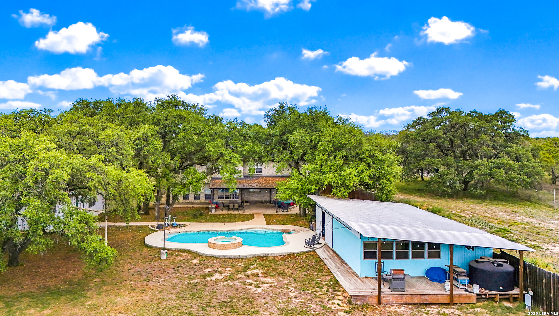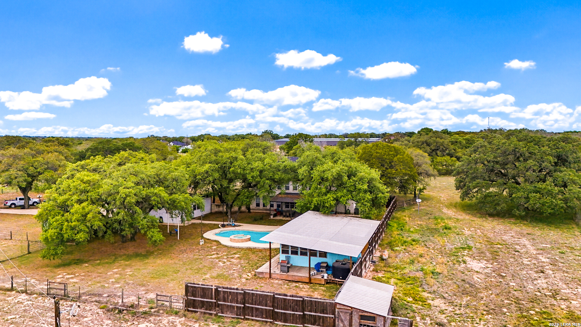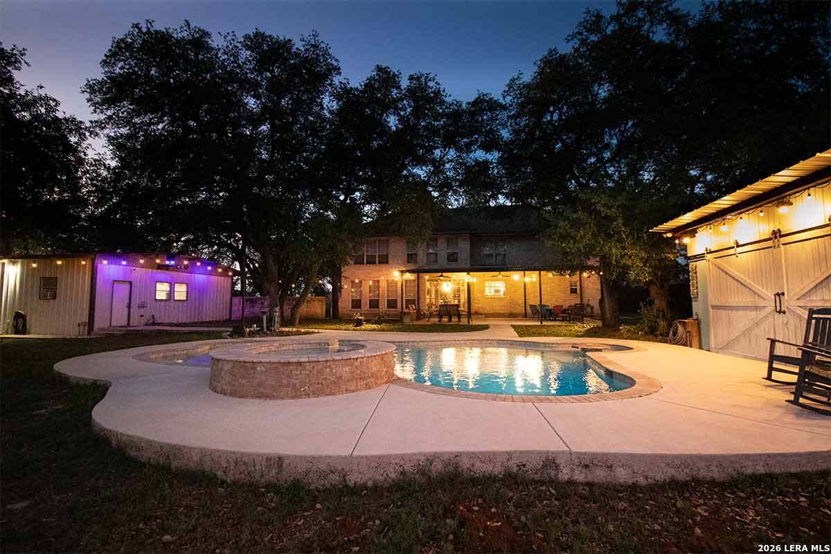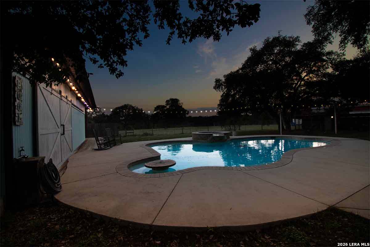 Experience the Lifestyle of your Dreams on this 20 Acres of Pristine Wooded Countryside in La Vernia! Located at the corner of FM 775 and Marx Lane, with So Many Amenities + Numerous Improvements: Spacious Main Home, Pool & Pool House, Oversized Garage, Workshop, Apartment, Office/Cottage ... An ideal arrangement for multi-generational living, family compound, potential rental income, or multi/mixed-use! LAND: Fully fenced & cross-fenced, Unrestricted & Ag-Exempt 20+ Acres with Abundant Heritage Oaks and seasonal Kicaster Creek at the back of the property. Gated Entry + Concrete Drive leading to the Home & Workshop. MAIN HOME: Stately Brick Residence offering Over 3,800 SF of Elegant Living. The Grand Entry greets you, with towering ceiling & curved stairway. Dedicated study/office with built-ins, and Fiber Optic Internet service makes remote work a breeze. Generous Living Room w/Fireplace and built-in cabinetry & shelving, creating the perfect Entertainment Center. Recently Remodeled Gourmet Island Kitchen w/Dual Sinks, gleaming high-level Granite Counters, Black-Stainless Appliances including Double Ovens. Don't miss the Fabulous Laundry Room w/ample cabinetry & counter space + sink! Chic Wood-Tile flooring graces the entire downstairs. Upstairs you'll find 4 spacious bedrooms, each directly adjoining a bathroom, with the Master Retreat featuring a separate sitting area with fireplace, and lavish bath. New roof in Fall 2023, upstairs HVAC replaced in 2020, downstairs HVAC replaced in 2025. Journey out to the backyard and discover the Perfect Venue for Entertaining & Everyday Enjoyment! Expansive Back Patio overlooking the Sparkling POOL & SPA with the POOL HOUSE ready to host your next recreational event, to accommodate year-round enjoyment w/propane heat for pool & spa. The Pool House features a large living/dining area, kitchenette with sink, and bathroom with outdoor-style shower! WORKSHOP: This space is perfect for the serious mechanic, tradesman, handyman, hobby-lover - with abundant storage! Multiple rooms plus loft, 2 overhead doors, and a half-bath make this a practical & tremendously useful asset. Side rooms are climate-controlled and foam-insulated. Additional covered area is ideal for implement storage, and an RV carport w/water hook-up offers further flexibility. APARTMENT: Located adjacent to the Workshop, this upstairs apartment is charming, with wood-style flooring & shiplap ceiling in the living spaces, 2 bedrooms, 1.5 baths, island kitchen, and large laundry room / pantry. OFFICE/COTTAGE: Along FM 775, this unfinished 800 SF building on slab is ready to be transformed according to your needs. MUCH MORE could be said about this exceptional & unique property! With Kicaster Creek frontage, a portion of the land is in 100-year floodplain, however all structures are outside of floodplain per FEMA mapping. Schedule your showing today!