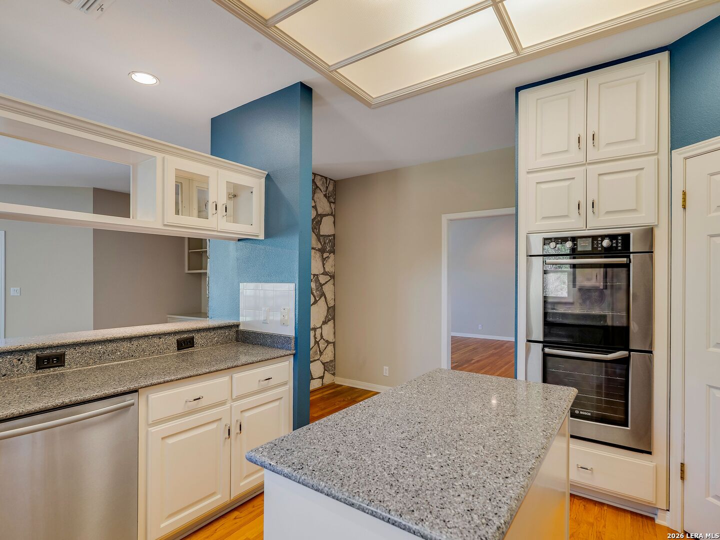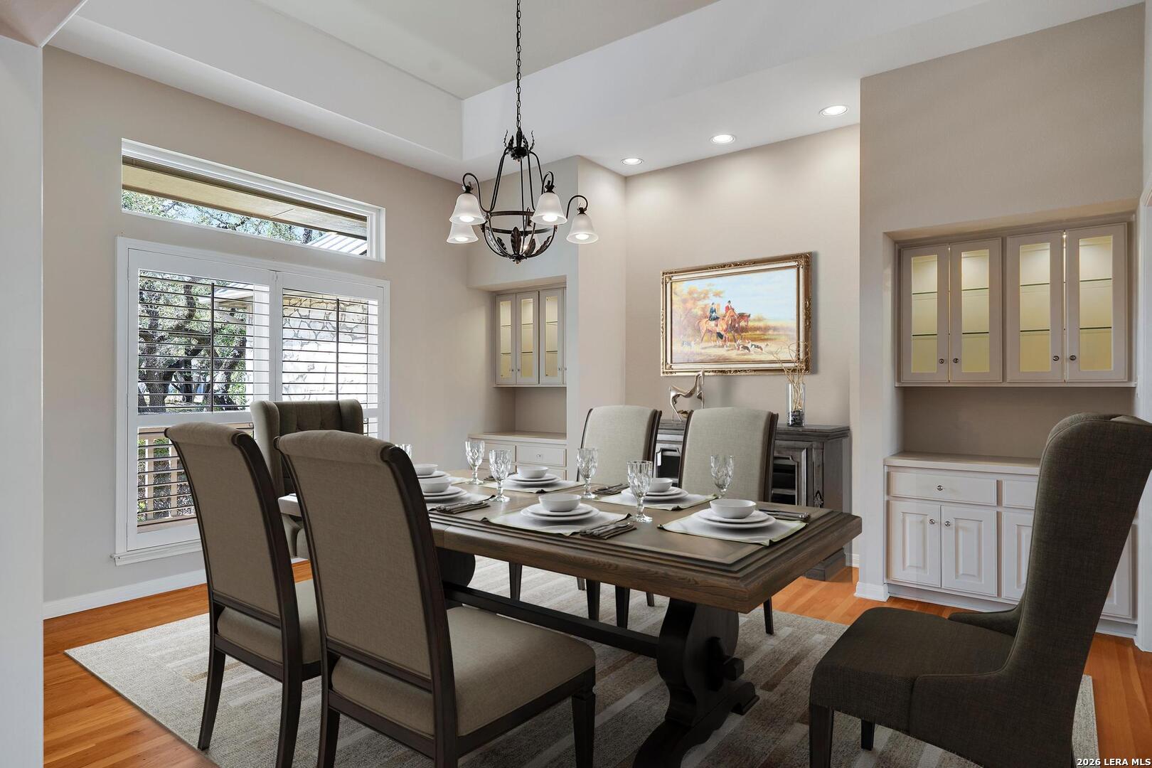 Nestled on 2.5 beautifully treed acres in Fair Oaks Ranch, this charming one-story stone home with a metal roof offers privacy, comfort, and wonderful Hill Country living. A welcoming covered front porch sets the tone, while the spacious covered back porch overlooks the sparkling pool and spa and the peaceful, tree-filled backyard. Inside, the home features 4 bedrooms and 2.5 baths with two inviting living areas. A striking dual-sided fireplace creates a warm focal point between the family room and living room, and the kitchen is open to the family room, making it ideal for everyday living and entertaining. The kitchen is well appointed with Bosch appliances and enjoys beautiful views of the backyard. Large windows bring in natural light and showcase the scenic outdoor setting from the living areas and the spacious primary suite. The primary bedroom features bamboo floors and an updated spa-like bath with separate tub and shower, separate vanities, and a walk-in closet. Additional highlights include custom built-ins in the living, family, and dining rooms, plantation shutters, and updated Pella windows throughout. Located within walking distance to the neighborhood park and served by highly regarded Boerne ISD, this special property combines serene acreage living with comfort, style, and convenience.