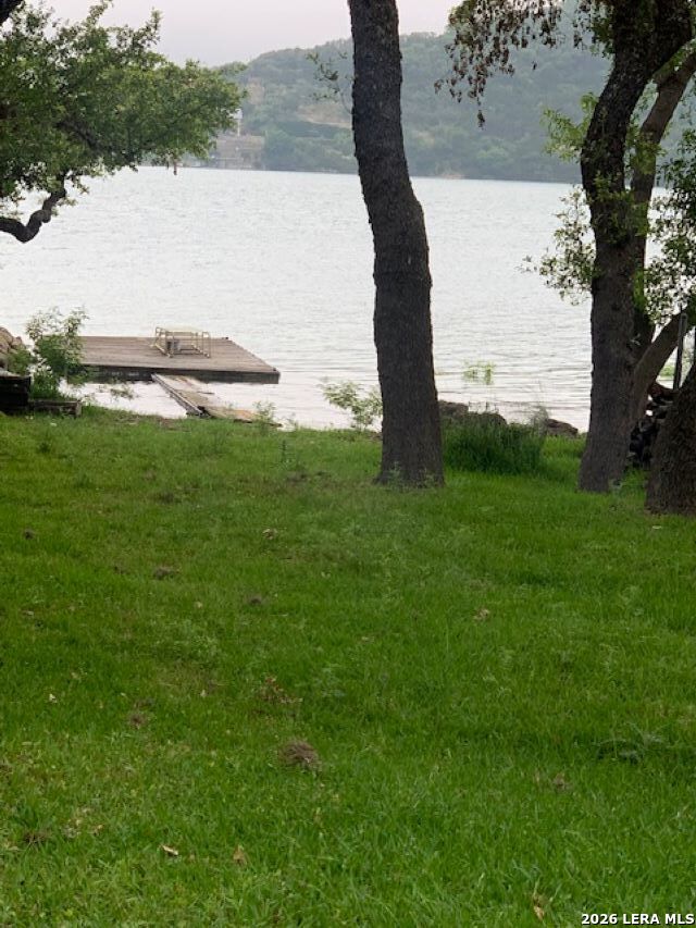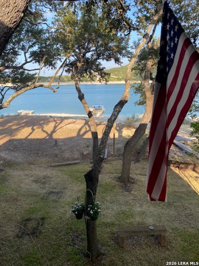 This 112ft wide waterfront lot is loaded with beautiful mature oak trees which provide a pleasant canopy of cover. 2 story home offers private guest space downstairs with the main living area upstairs providing beautiful lake and countryside views. The kitchen has granite countertops and custom cabinets with drawers designed with the gourmet chef in-mind. Moveable island with storage gives flexibilty for additional countertop space. There are two bedrooms upstairs and 2 bedrooms downstairs. A full bathroom on each level. Large covered patio enhances the outdoor living spaces among the graceful oak trees at the waters edge (when lake levels are high- currently low). Home is on a deep water cove (93 ft deep at the center) and the lot offers backyard boat launching for added convenience and use of the lake. New low E high efficiency windows installed in 2022 throughout the home. Both HVAC units new in 2024! This community has a private water system so no well required. There are 4 private use parks for homeowners and guests with covered awnings and picnic tables and BBQ pits. Easy commute to San Antonio, Boerne, Bandera and Kerrville.