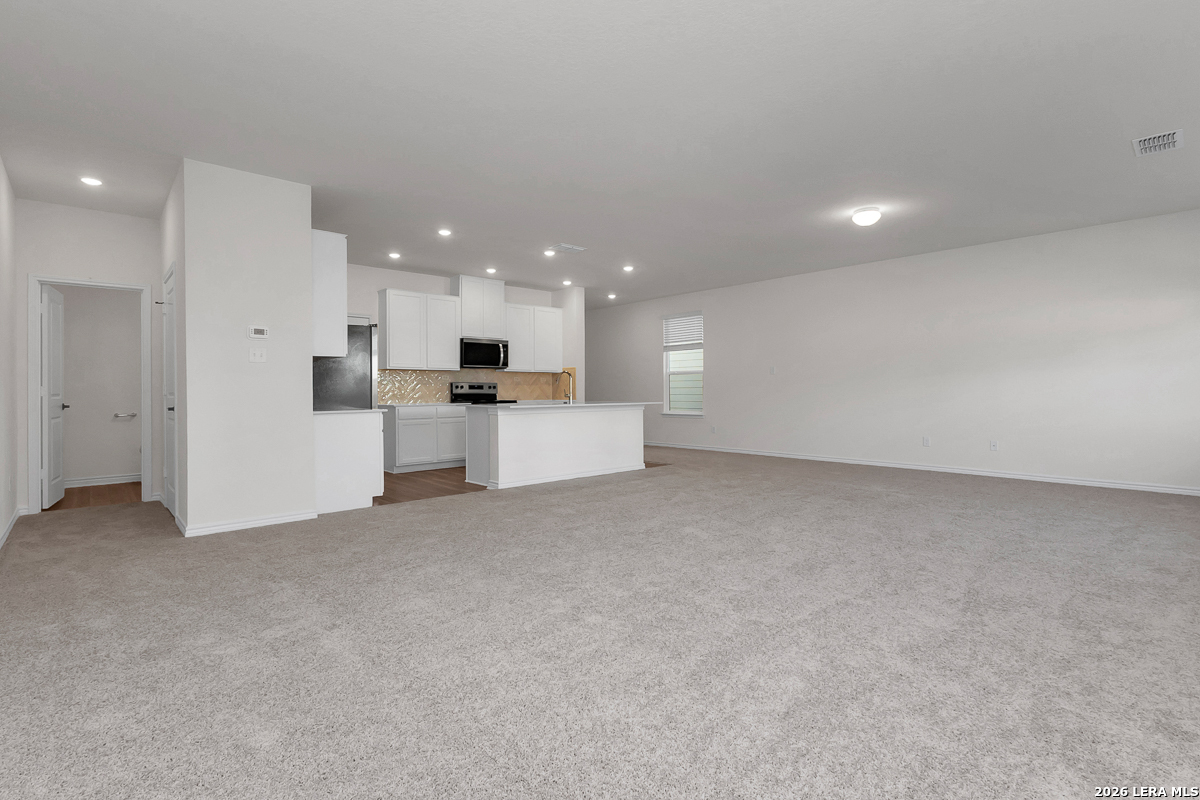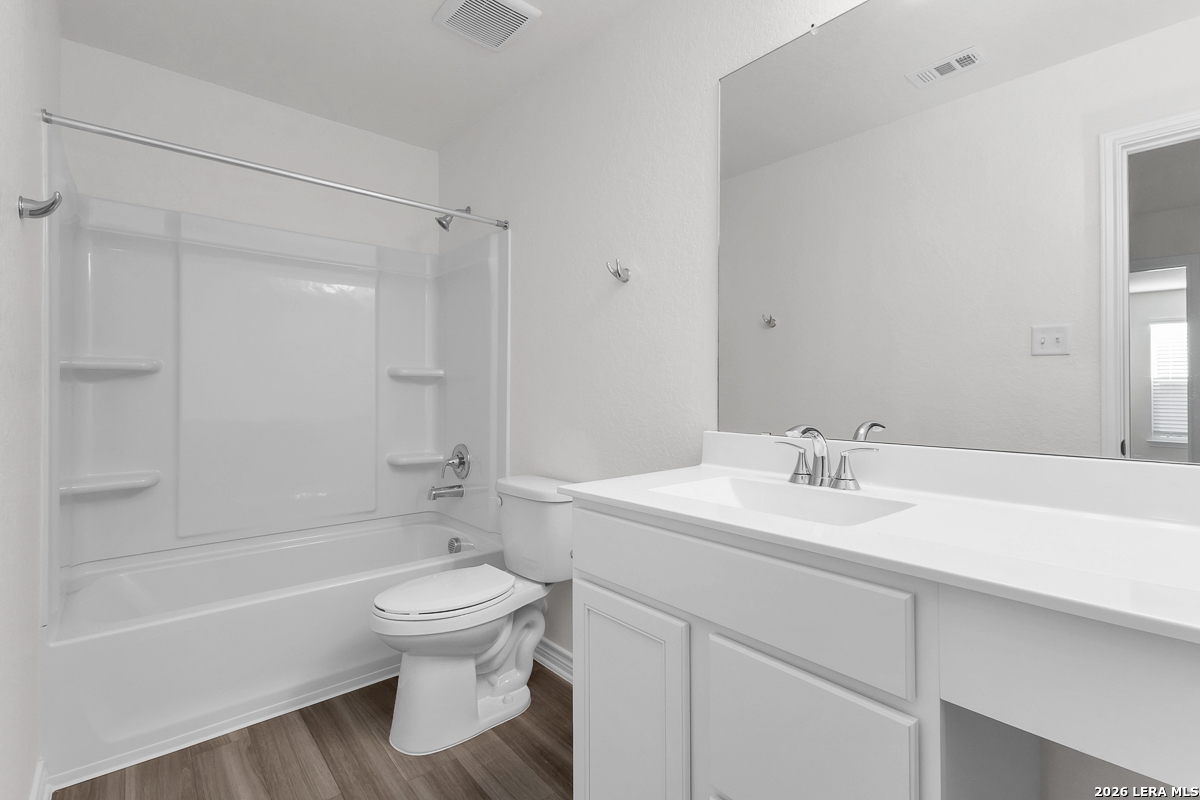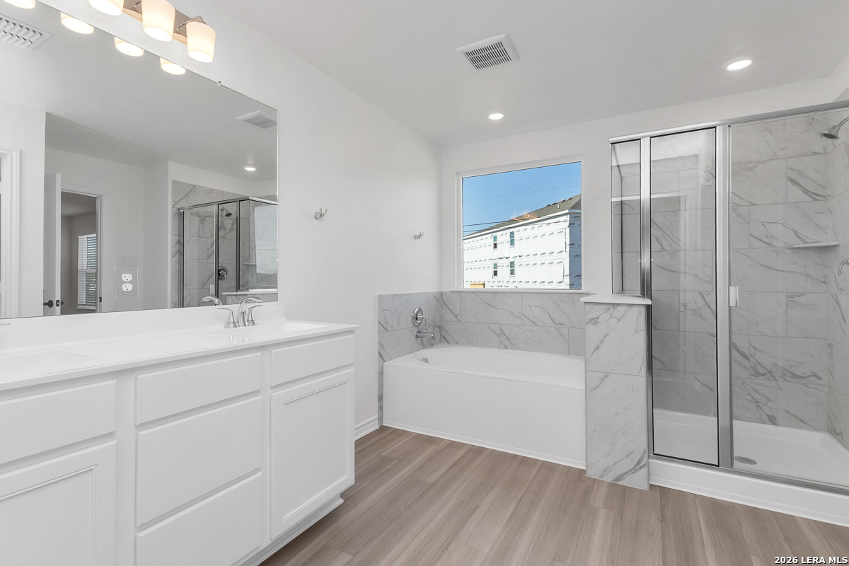 Welcome home to a thoughtfully designed residence with 9-foot first-floor ceilings that enhance light and openness. The kitchen features upgraded Whirlpool appliances, a Whirlpool side-by-side refrigerator, Woodmont Belmont 42-inch upper cabinets, a Daltile tile backsplash, and an extended breakfast bar ideal for casual dining. The primary bath offers a raised vanity, a 42-inch garden tub, and a separate shower with Daltile tile surround. Decorative touches include a Carrara-style entry door, Kwikset Ladera interior hardware, 2-inch faux wood blinds, and durable vinyl plank flooring in the kitchen, baths, and laundry room. Additional highlights include a soft water loop and a layout ready for easy outdoor living.
