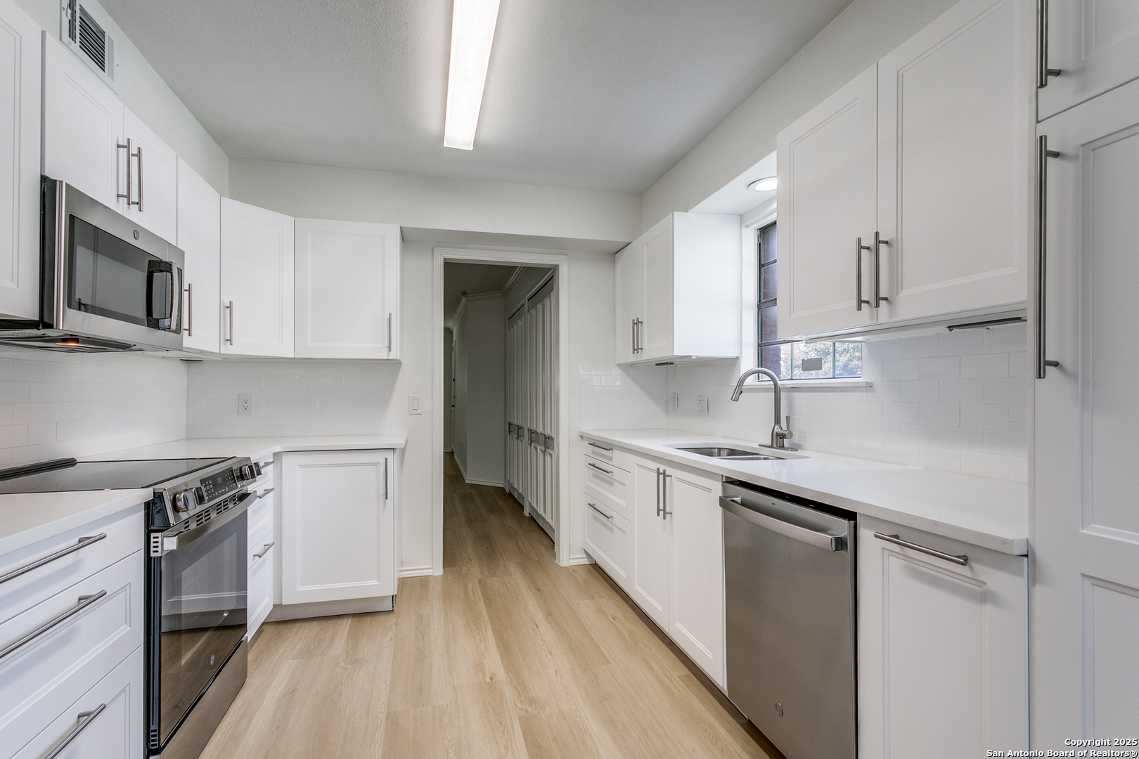 Welcome to this dreamy condo that has been transformed to appeal to today's buyer. Wood-look floors flow through the main rooms and provide a modern base for the new owner. The combined living and dining room is spacious with good storage. The kitchen will wow you, with white cabinets and countertops plus recent appliances, providing ideal workspace for the cook and includes eat-in space and laundry closet. 2 Bedrooms are well-sized, and the bathrooms boast updated cabinets and tile. Private patio with bonus storage. One car covered parking.