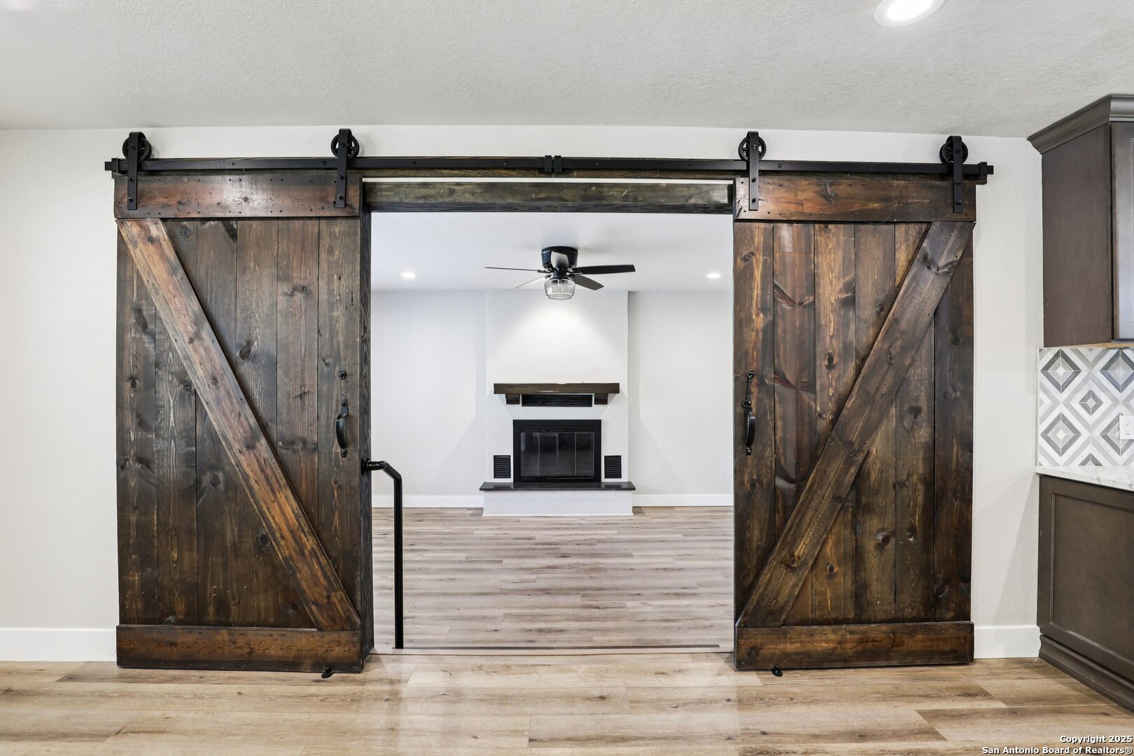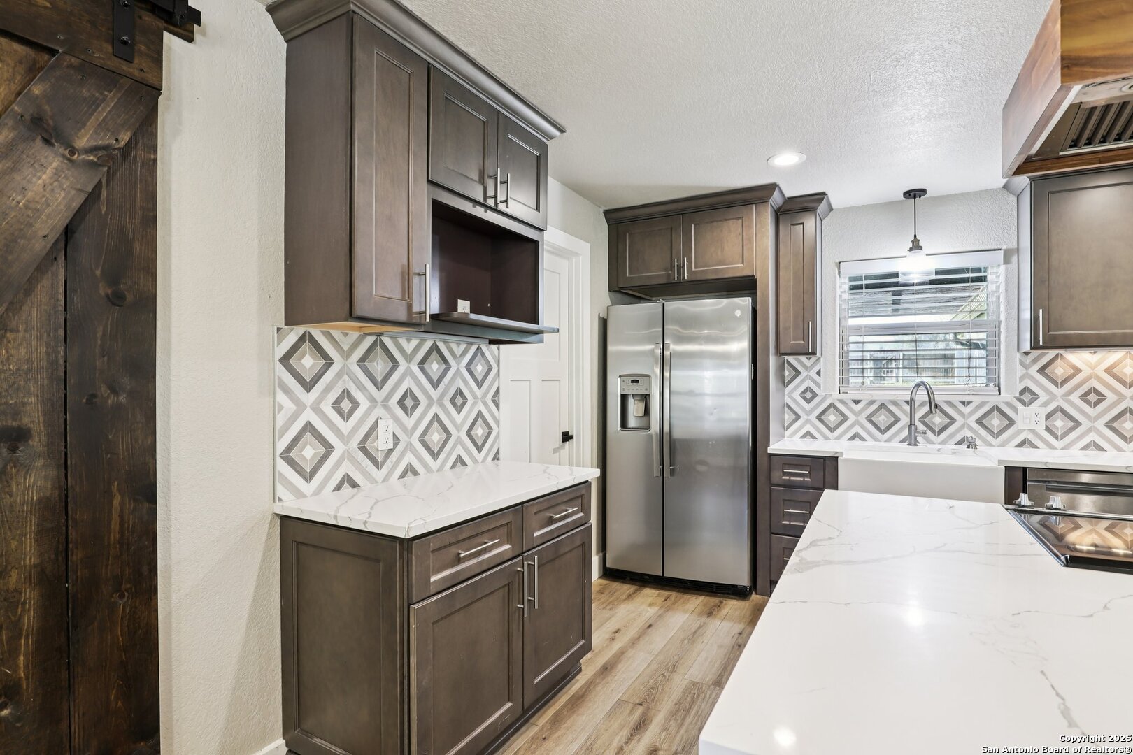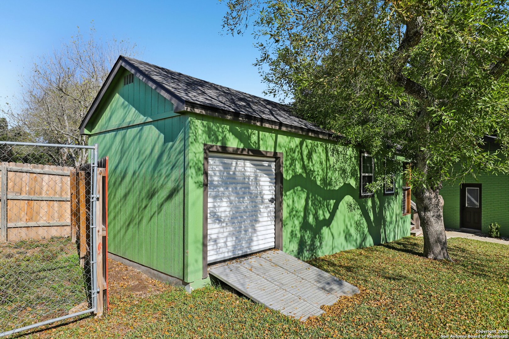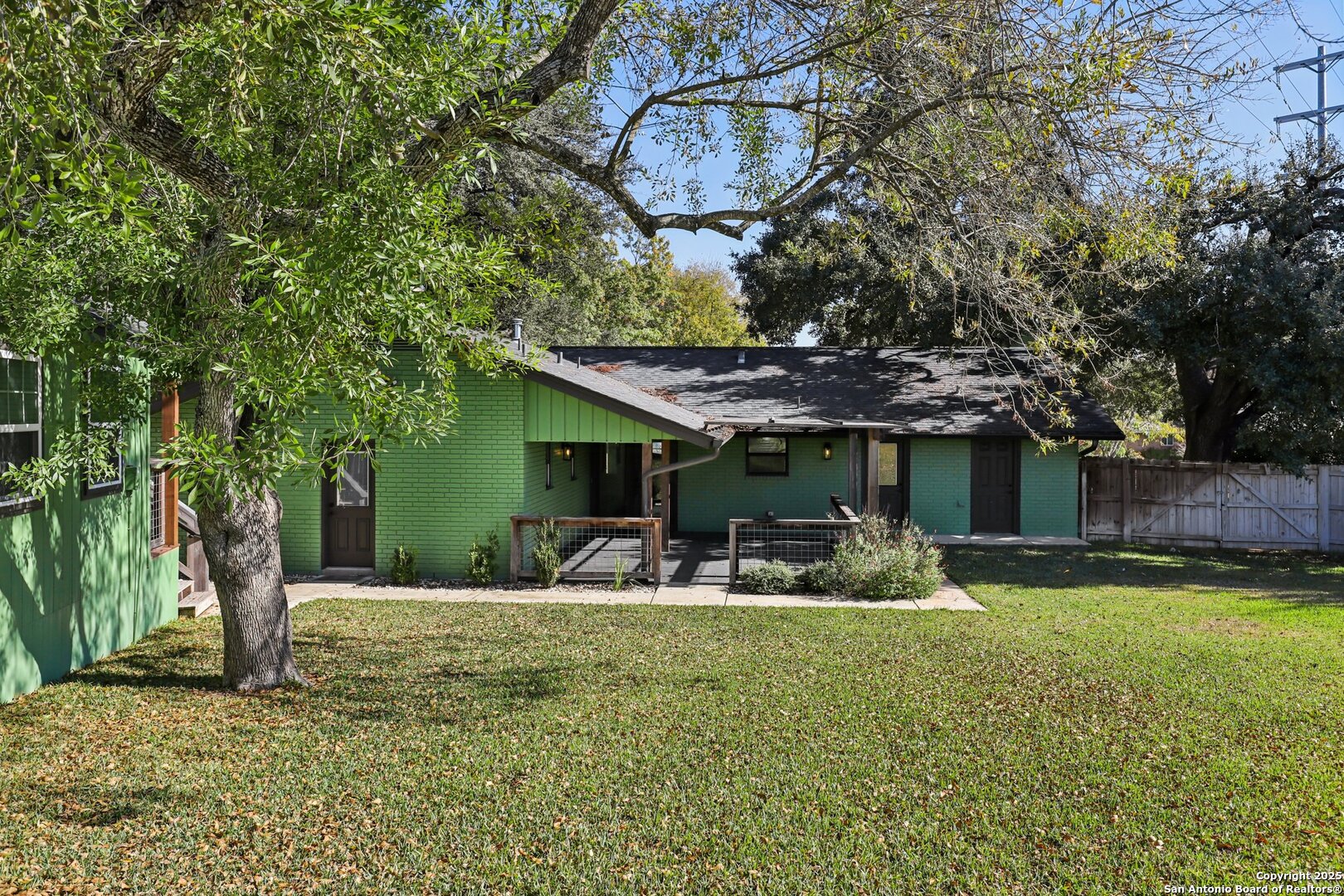 Drive up the circular driveway to this beautifully updated farmhouse-style home, perfectly situated on a large, private lot shaded by mature oak trees in a quiet, established neighborhood with no HOA. Thoughtful updates throughout include a newer roof and HVAC system, no carpet, modern farmhouse lighting, barn doors, and a stunning 9-foot island that anchors the heart of the home. Gorgeous quartz and leathered granite countertops provide both style and durability, creating a space that is as functional as it is inviting. The private primary bedroom is tucked away at the back of the home, offering a peaceful retreat, while two additional spacious bedrooms provide comfortable accommodations for family or guests. Step outside to a covered patio overlooking a generous backyard, perfect for entertaining or relaxing. The property also features a large workshop/shed with a window unit and shower, attached lawn mower garage, and an additional dog kennel, ideal for hobbyists, storage, or extra workspace. Enjoy added privacy as the property backs to a larger tract of land, creating a serene setting rarely found. Located just minutes from Starcke Park, residents can enjoy golf, picnic and BBQ areas, playgrounds, and access to the scenic Guadalupe River. With convenient access to San Antonio, Austin, and San Marcos, this home offers the perfect blend of Hill Country tranquility and city convenience. This exceptional property truly checks all the boxes. Schedule your showing today and make this one home.