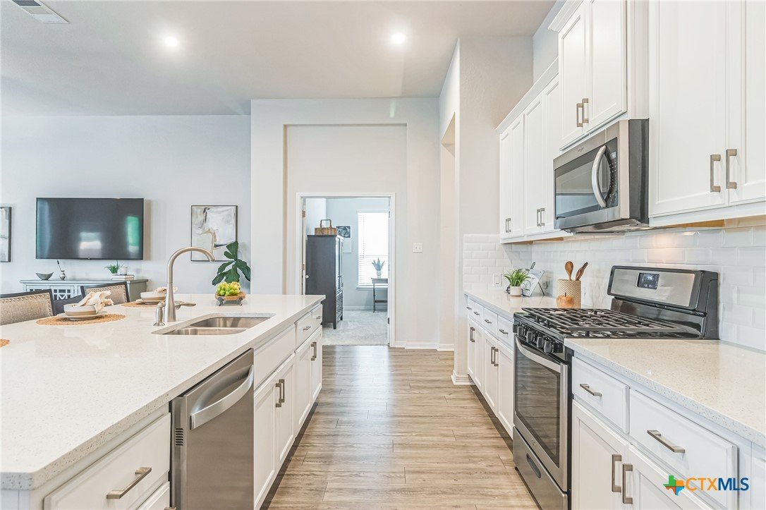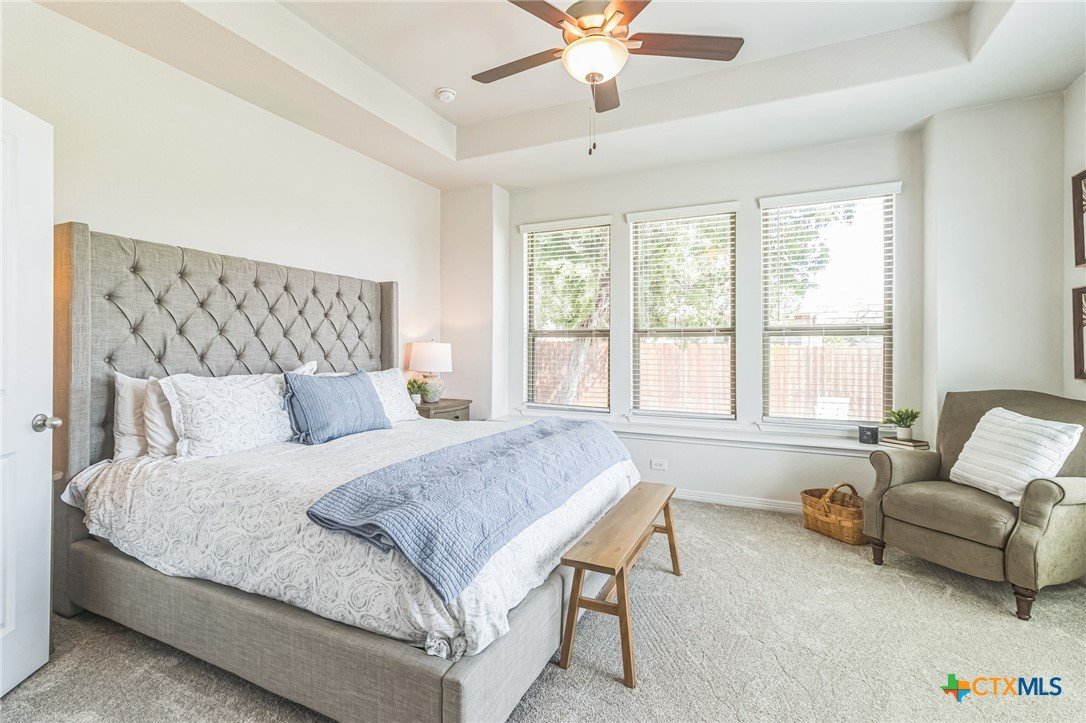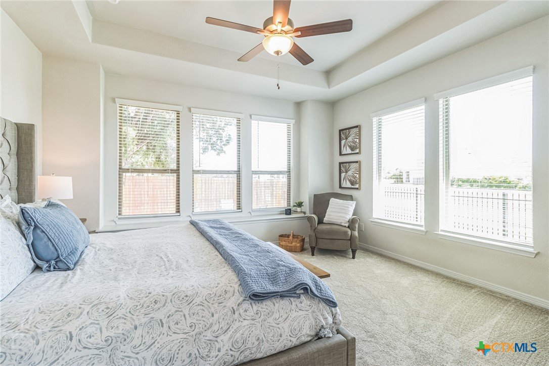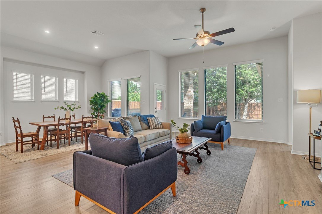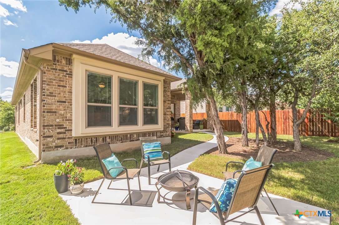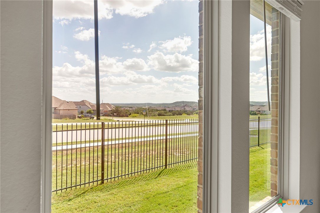 Stunning Hill Country view from this beautifully maintained 1-story Coventry-built home on a spacious corner lot! Featuring 3 bedrooms plus a study, this light-filled open floor plan offers high ceilings, coffered details, engineered wood flooring, and new carpet in June 2025. The kitchen boasts abundant cabinetry and opens seamlessly to the living and dining areas—perfect for entertaining. Enjoy peaceful views from the study, primary suite, and backyard, along with two patios surrounded by mature trees—ideal for outdoor living. The level backyard, no neighbor on one side, and cul-de-sac location add to the home’s privacy and appeal. Additional highlights include blinds throughout, full sprinkler system, gutters, smart home features, Ring doorbell, and backyard security lighting. Located near the Balcones Canyonlands National Wildlife Refuge and about a mile to Lake Travis, this community offers sidewalks, walking trails, a private boat ramp, and a resort-style pool. Experience lakeside living with easy access to scenic drives, wineries, and nearby Hill Country destinations—all without the congestion and price point of Lakeway. Welcome Home!