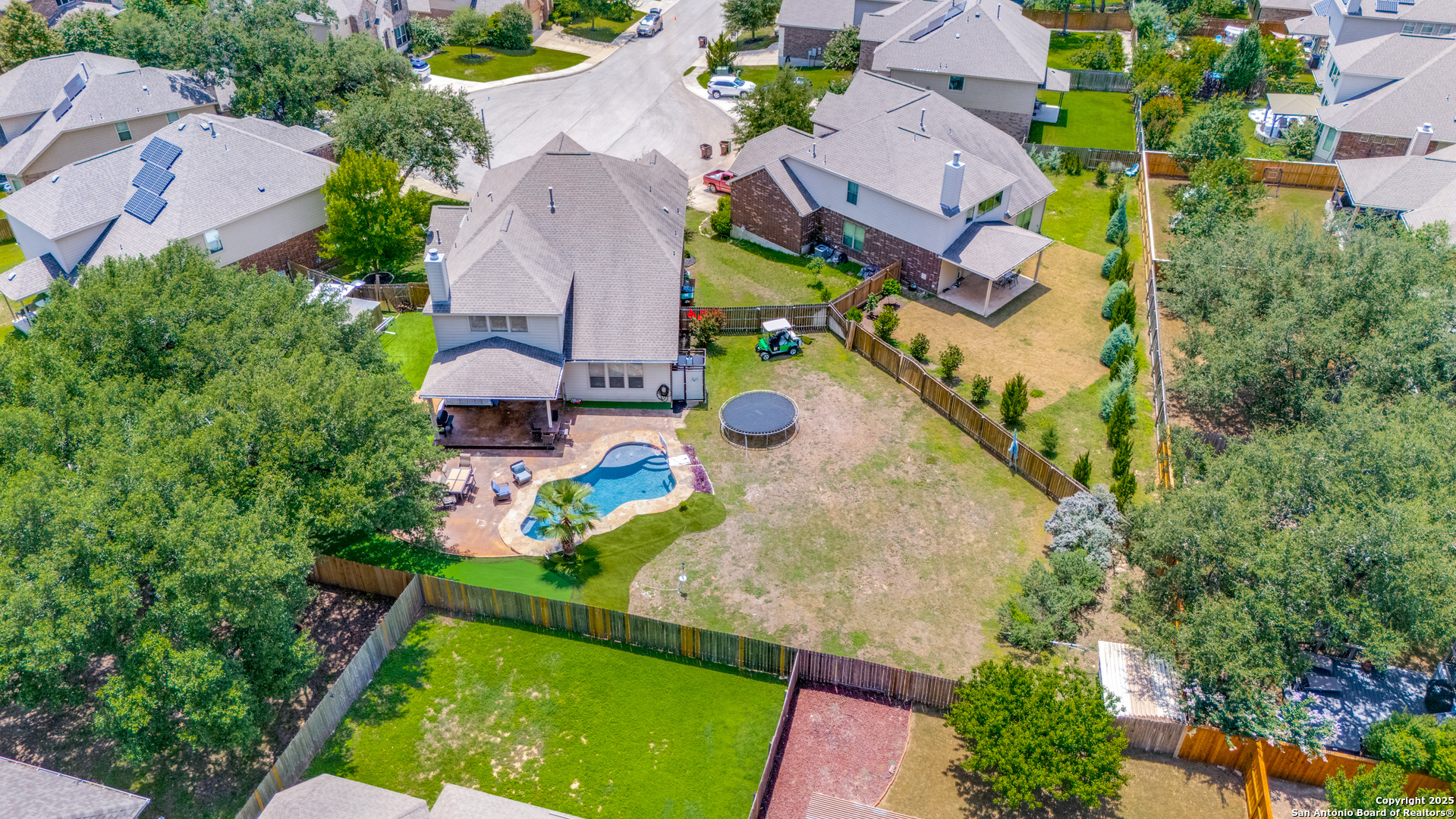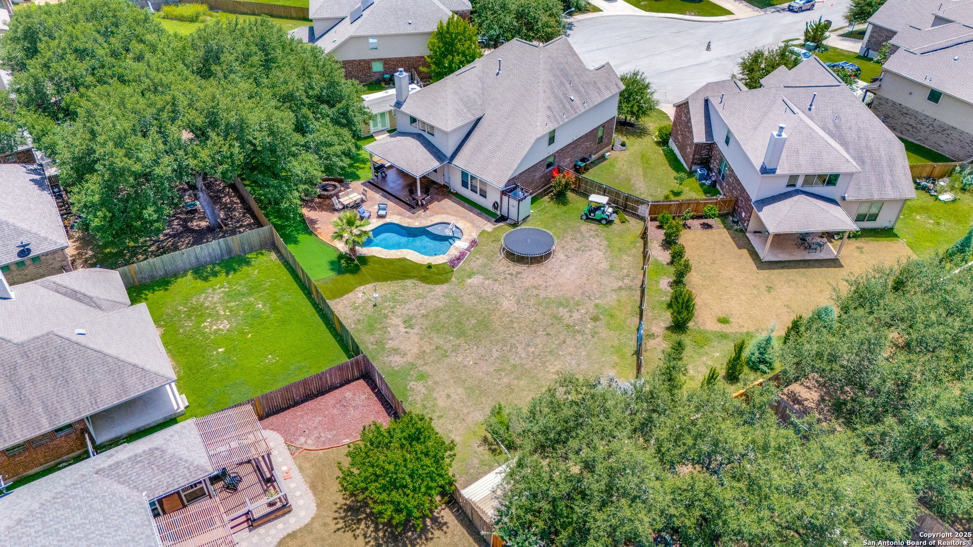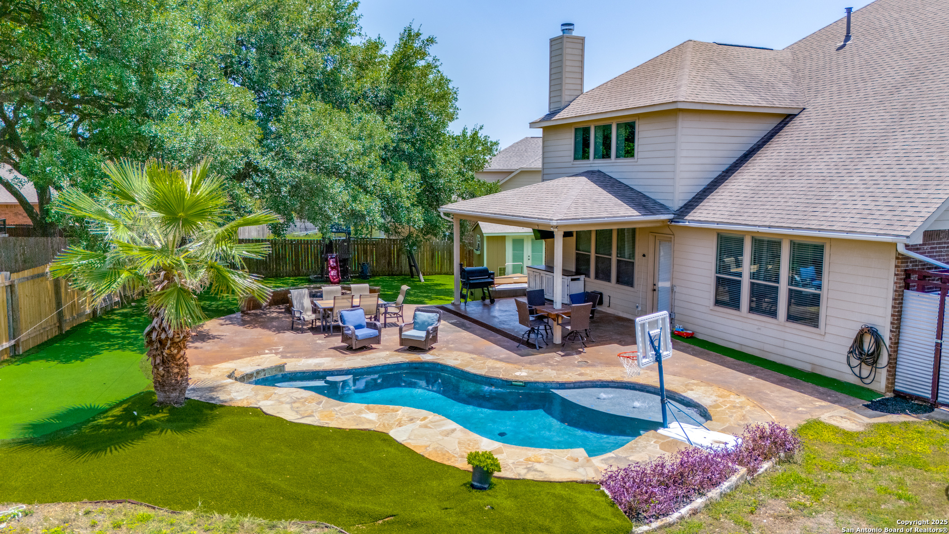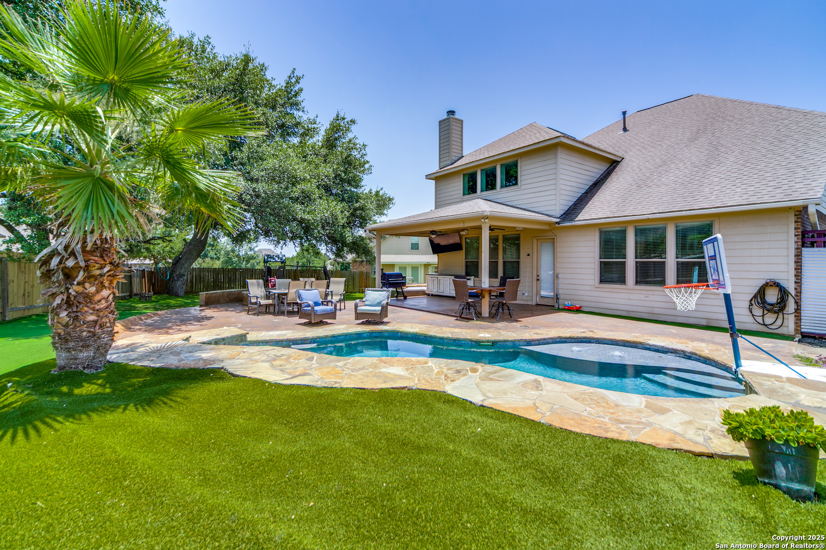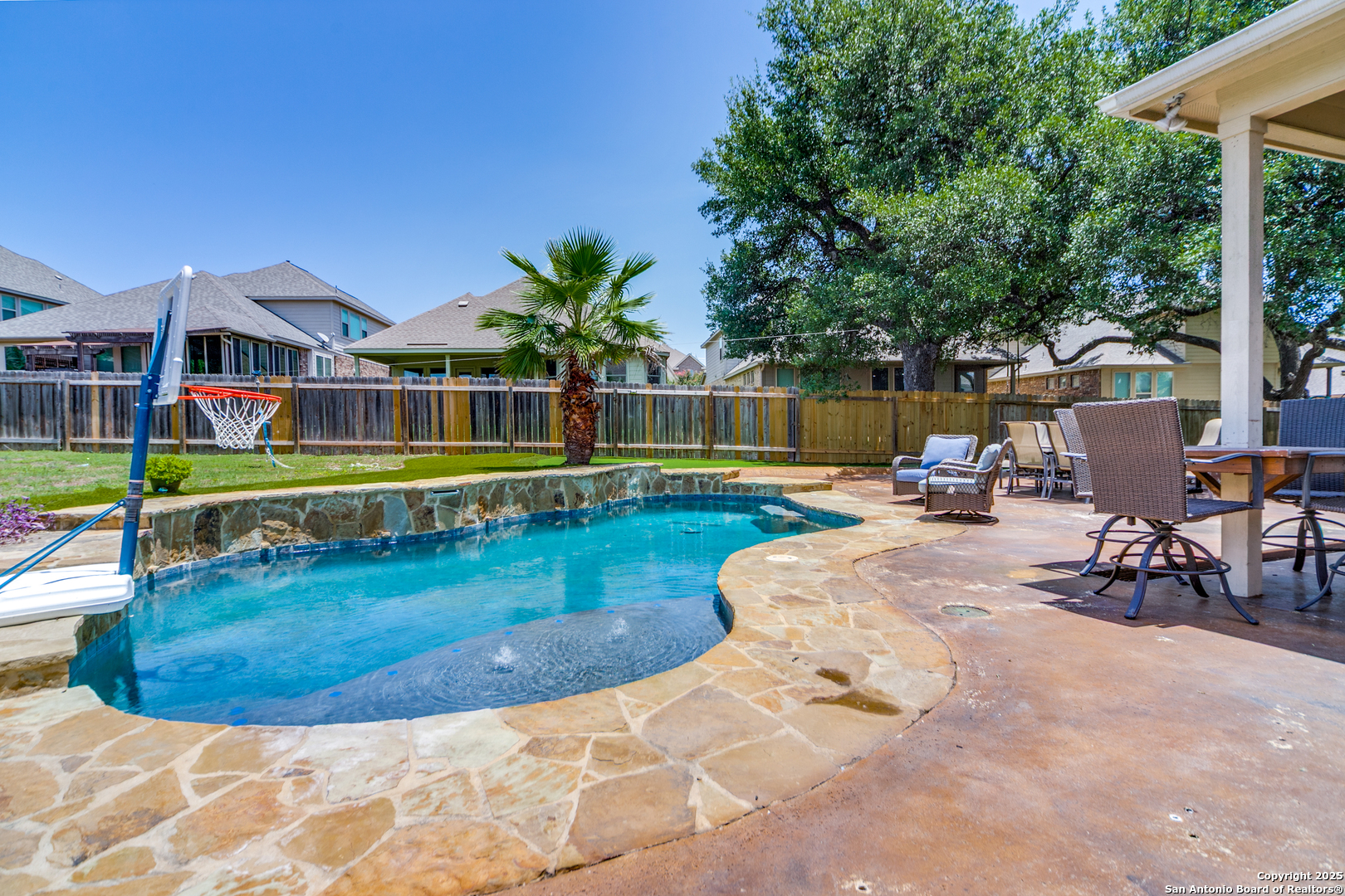 Nestled in a peaceful cul-de-sac with a sparkling pool, this beautifully maintained 5-bedroom, 3.5-bathroom residence offers the perfect blend of comfort, style, and privacy. From the moment you arrive, you'll appreciate the inviting curb appeal and thoughtfully designed layout, ideal for both gatherings and quiet evenings at home. Step inside to find an open-concept living area filled with natural light that blends seamlessly into a modern kitchen with stainless steel appliances. The kitchen also boasts granite countertops, upgraded glass front cabinets, gas range, a stylish neutral backsplash, breakfast nook, and flexible bar seating area. The cozy family room, complete with a stone fireplace, is perfectly situated. The formal dining room and elevated flooring throughout the main floor complete the downstairs gathering spaces. The expansive, main floor primary suite, features a luxurious en-suite bathroom, equipped with a separate bathtub and shower, solid surface countertops, dual vanity, and a large customized closet. At the top of the stairs, you will find a generous sized game room offering flexibility and ample space for everyone. Four additional bedrooms are also located upstairs and offer flexibility for guests or home offices. Two bedrooms are joined by a Jack and Jill bathroom, while another bedroom has an en-suite bathroom that also has access to the game room. Both secondary bathrooms have upgraded solid surface countertops and faucets. Outside, enjoy your own private oasis with a huge backyard, a sparkling pool with water feature, a custom built fire pit with seating, and plenty of space for outdoor dining and play. NEW ROOF installed in July 2025! Whether you're hosting summer parties or relaxing under the stars, this backyard is made for memories. Located in a cul-de-sac with minimal traffic, this home provides a quiet retreat with easy access to top-rated Boerne ISD schools, shopping, and dining. The gated Sablechase Subdivision also includes a neighborhood pool, clubhouse, basketball and tennis courts, and a playground. Don't miss this rare opportunity to own a spacious, move-in ready home with all the amenities you've been searching for!