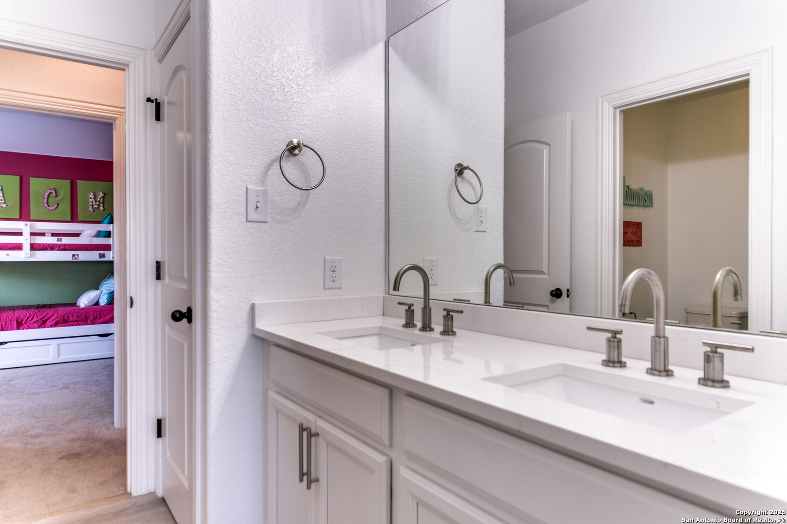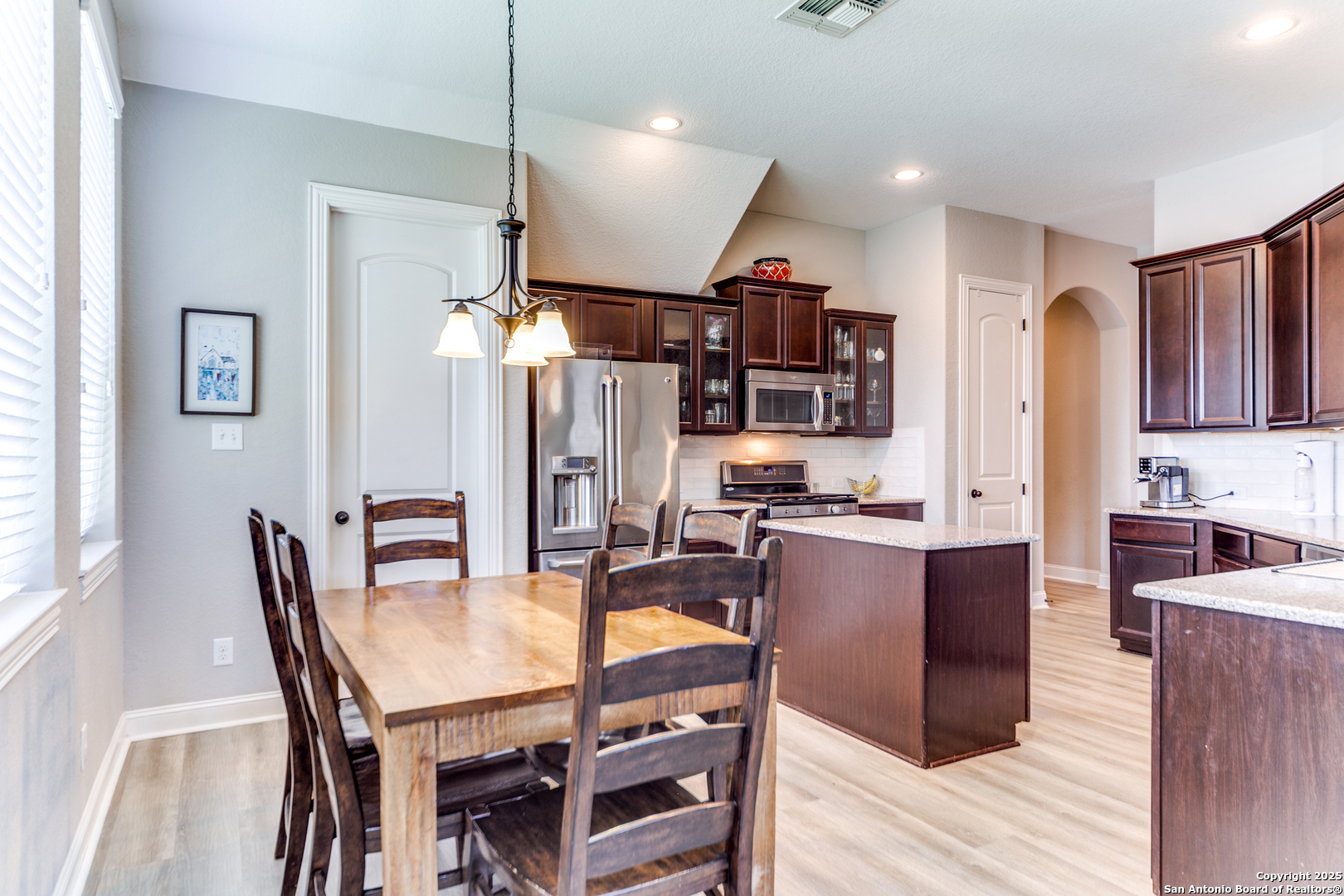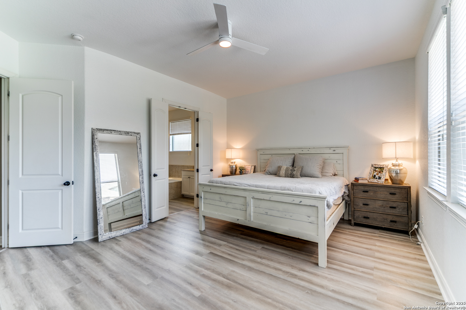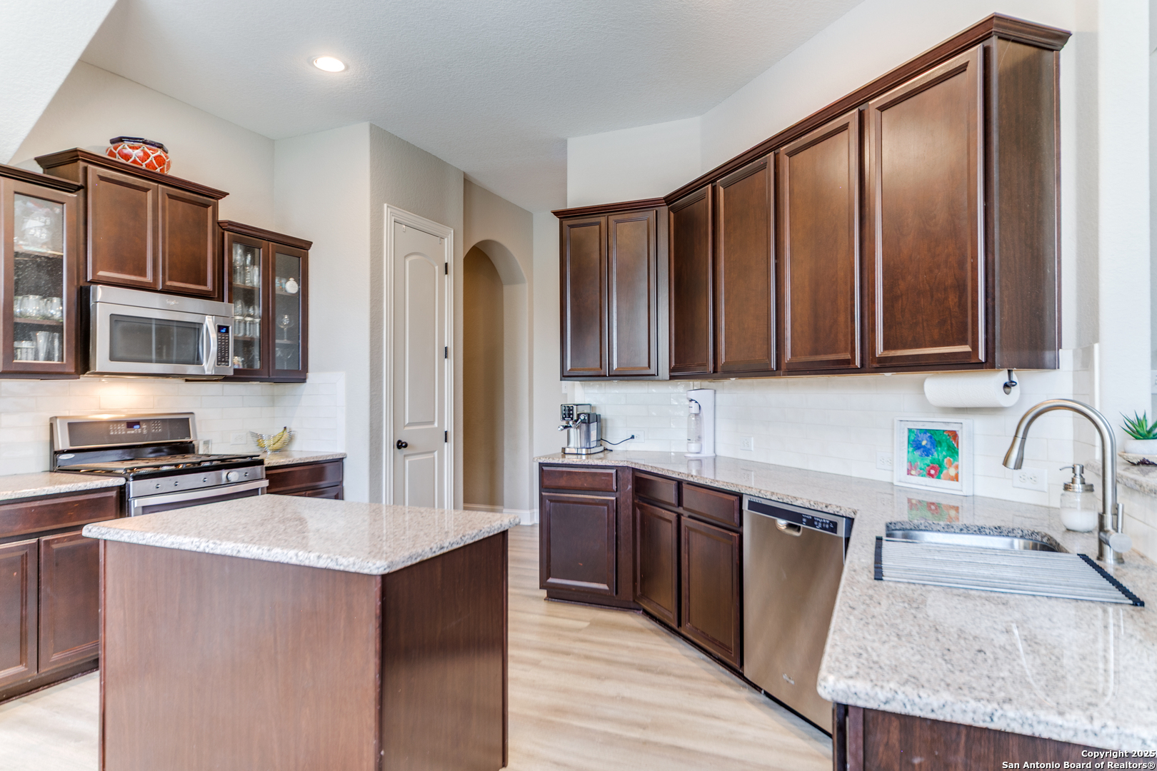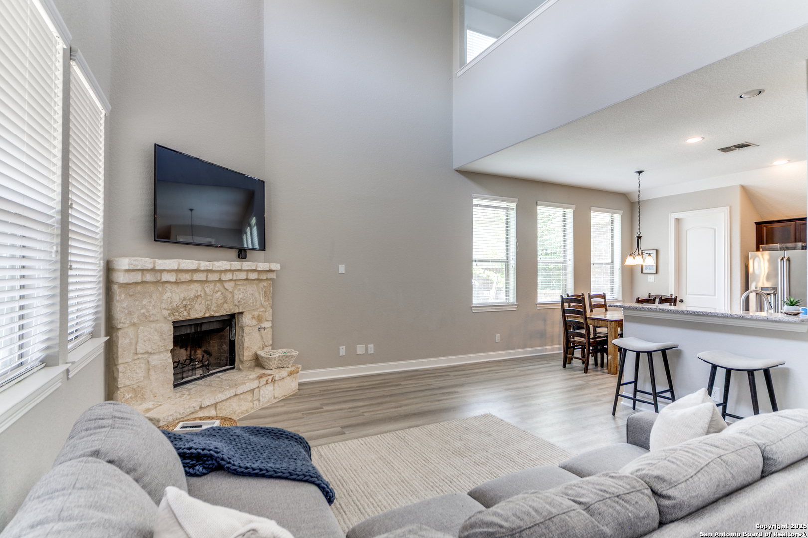 Nestled in a peaceful cul-de-sac with a sparkling pool, this beautifully maintained 5-bedroom, 3.5-bathroom residence offers the perfect blend of comfort, style, and privacy. From the moment you arrive, you'll appreciate the inviting curb appeal and thoughtfully designed layout, ideal for both gatherings and quiet evenings at home. Step inside to find an open-concept living area filled with natural light that blends seamlessly into a modern kitchen with stainless steel appliances. The kitchen also boasts granite countertops, upgraded glass front cabinets, gas range, a stylish neutral backsplash, breakfast nook, and flexible bar seating area. The cozy family room, complete with a stone fireplace, is perfectly situated. The formal dining room and elevated flooring throughout the main floor complete the downstairs gathering spaces. The expansive, main floor primary suite, features a luxurious en-suite bathroom, equipped with a separate bathtub and shower, solid surface countertops, dual vanity, and a large customized closet. At the top of the stairs, you will find a generous sized game room offering flexibility and ample space for everyone. Four additional bedrooms are also located upstairs and offer flexibility for guests or home offices. Two bedrooms are joined by a Jack and Jill bathroom, while another bedroom has an en-suite bathroom that also has access to the game room. Both secondary bathrooms have upgraded solid surface countertops and faucets. Outside, enjoy your own private oasis with a huge backyard, a sparkling pool with water feature, a custom built fire pit with seating, and plenty of space for outdoor dining and play. NEW ROOF installed in July 2025! Whether you're hosting summer parties or relaxing under the stars, this backyard is made for memories. Located in a cul-de-sac with minimal traffic, this home provides a quiet retreat with easy access to top-rated Boerne ISD schools, shopping, and dining. The gated Sablechase Subdivision also includes a neighborhood pool, clubhouse, basketball and tennis courts, and a playground. Don't miss this rare opportunity to own a spacious, move-in ready home with all the amenities you've been searching for!