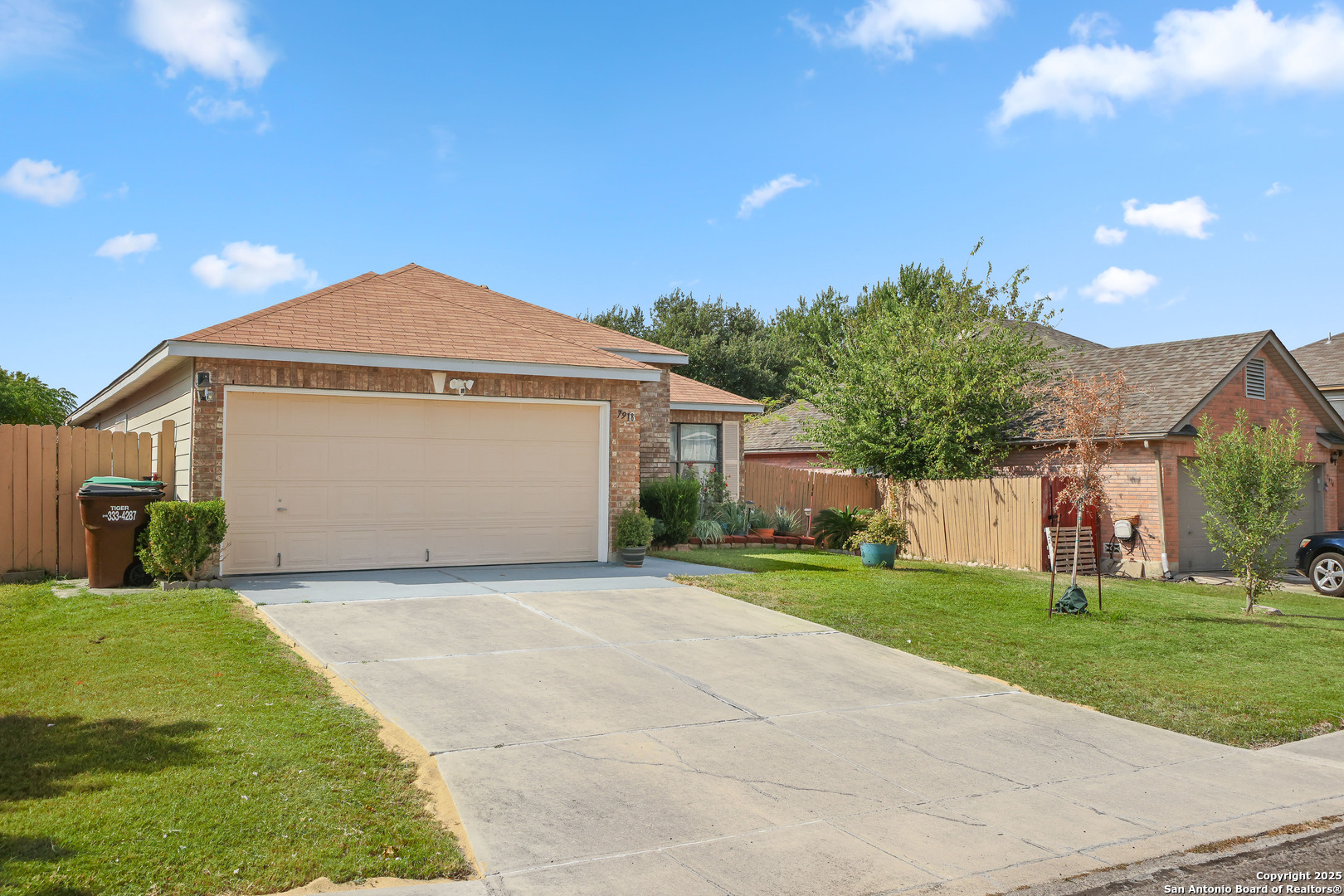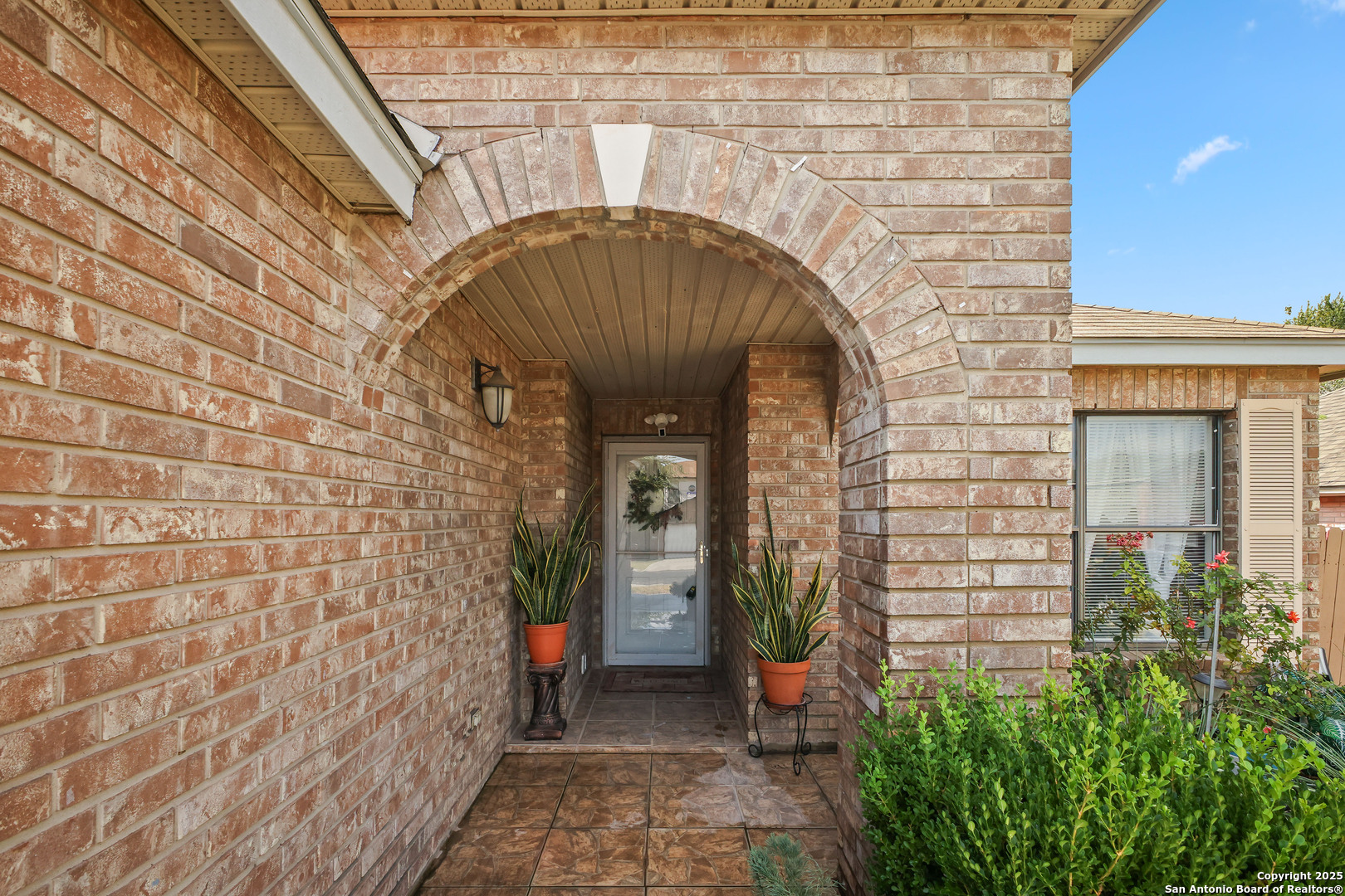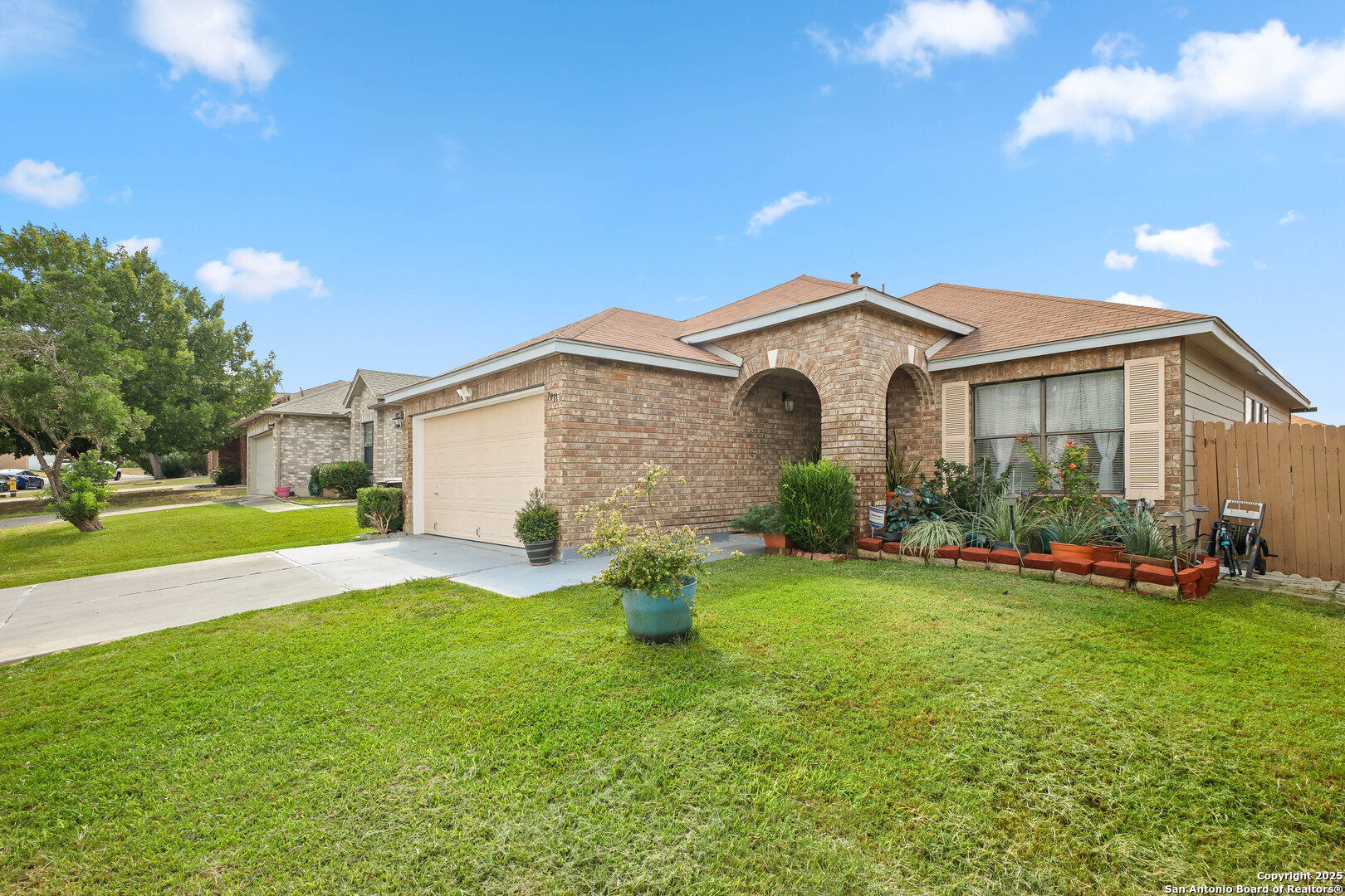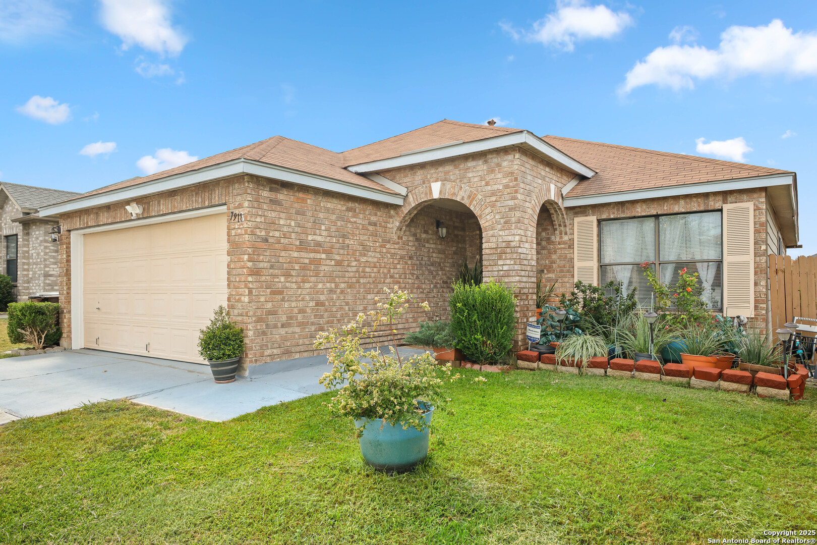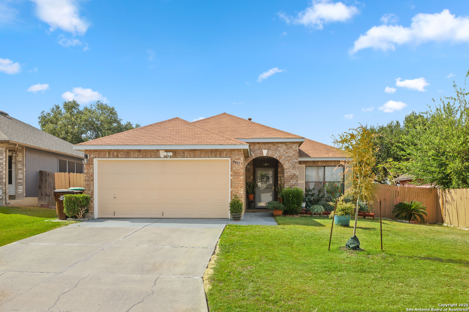 Welcome to this beautifully maintained 3-bedroom, 2-bath home offering 1,345 sq. ft. of comfortable living space. From the moment you arrive, you'll appreciate the beautiful curb appeal, with a brick-accented front exterior and a charming covered entryway that creates a warm welcome. Inside, you'll find modern laminate wood and ceramic tile flooring throughout, creating a clean and contemporary feel. The open-concept floor plan features a spacious living room that flows seamlessly into the dining area and kitchen, making it ideal for both everyday living and entertaining. The home is equipped with ceiling fans in every room to enhance comfort and energy efficiency. The primary suite includes a large walk-in closet and a private full bath, offering a relaxing retreat. Step outside to a beautifully landscaped backyard complete with mature trees, healthy grass, a covered patio deck, and a storage shed - perfect for outdoor enjoyment and gatherings. Conveniently located near Loop 1604, IH-35, and Hwy 90, and just minutes from Randolph Air Force Base, this home offers easy access to shopping, dining, and major employers. This charming home has been lovingly cared for and is move-in ready for its next owner!