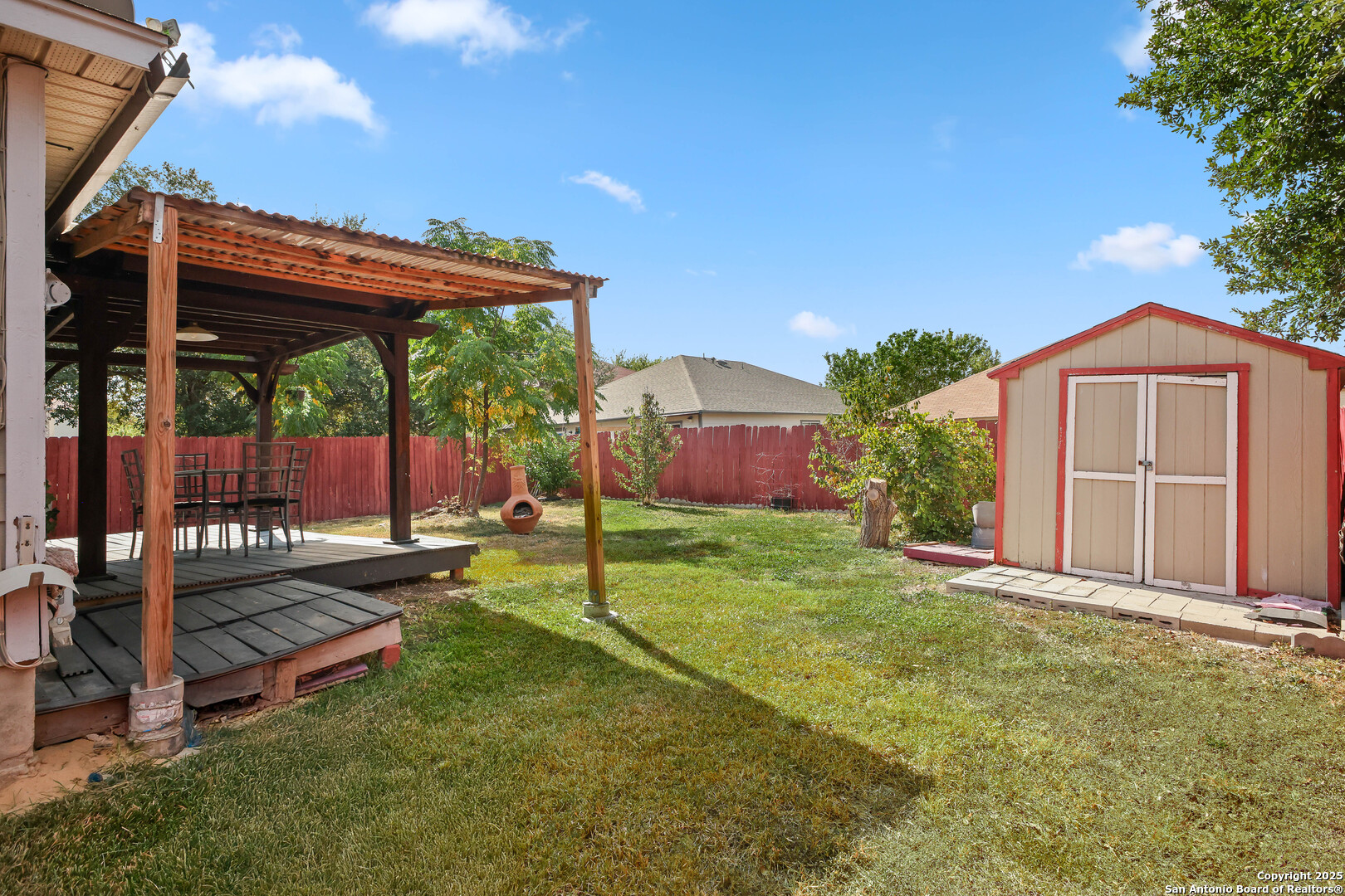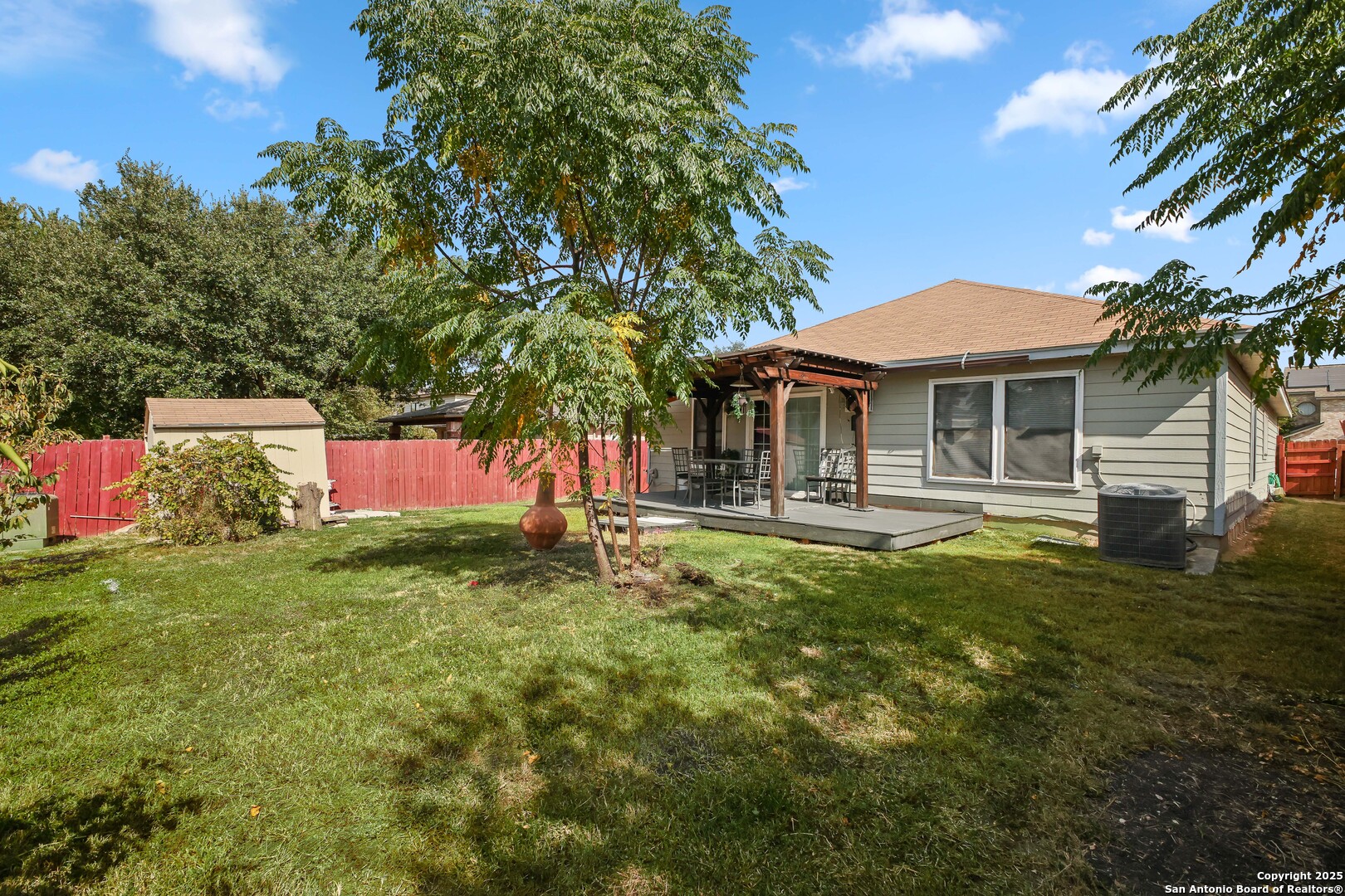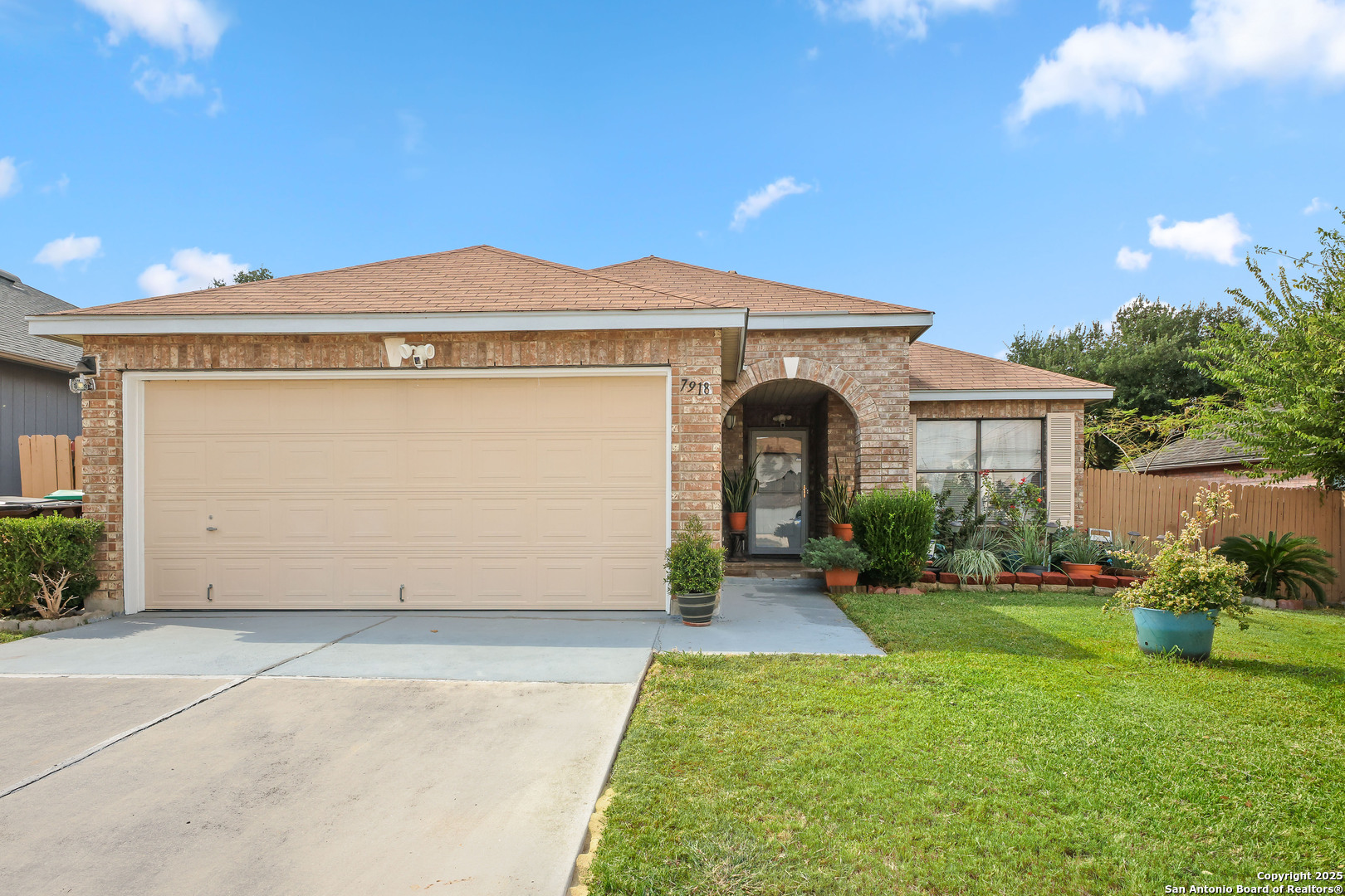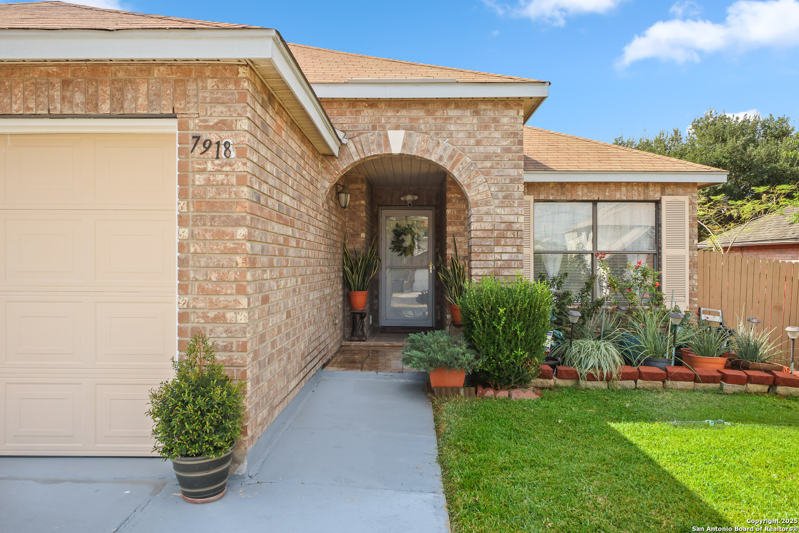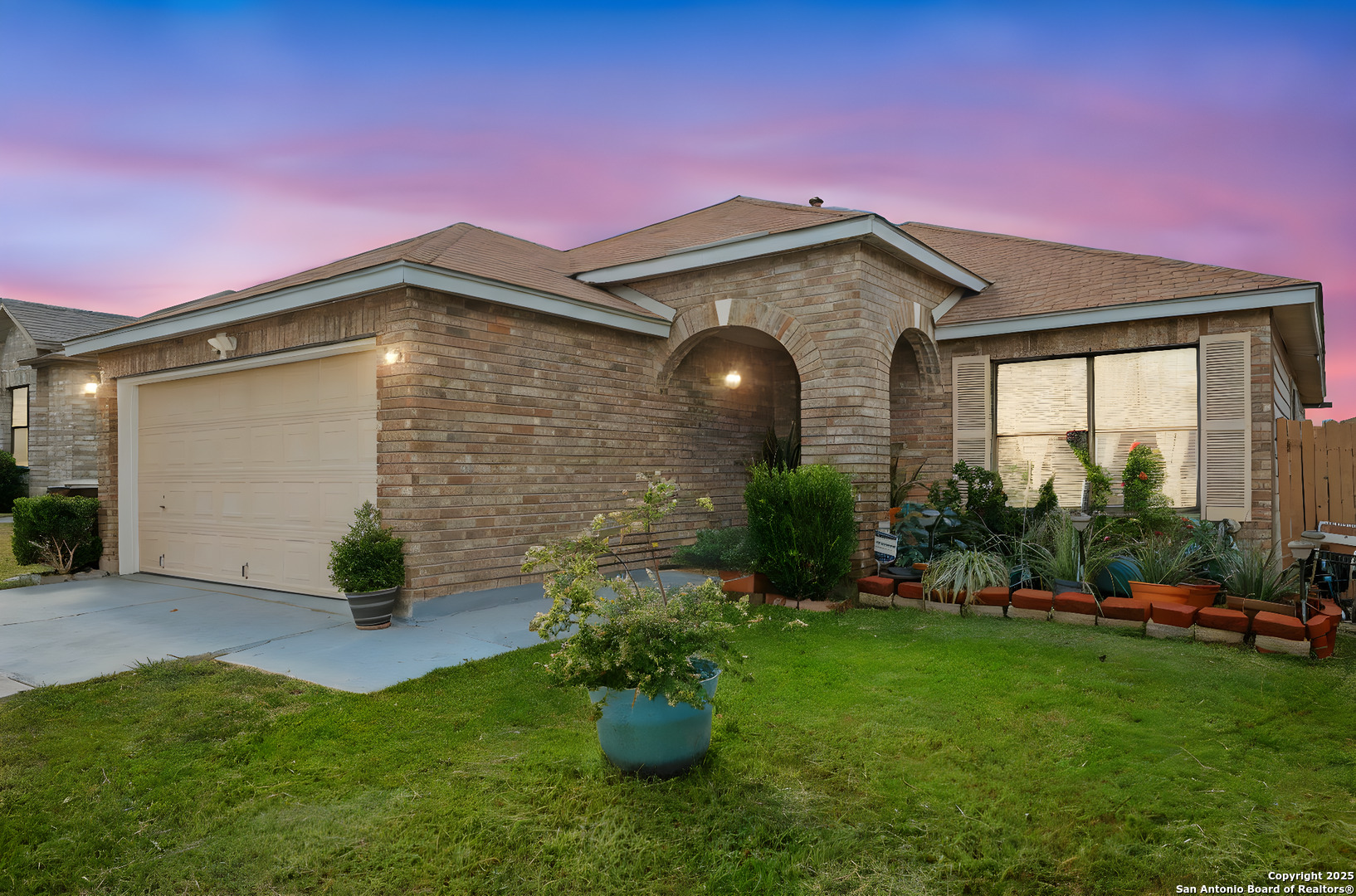 Welcome to this beautifully maintained 3-bedroom, 2-bath home offering 1,345 sq. ft. of comfortable living space. From the moment you arrive, you'll appreciate the beautiful curb appeal, with a brick-accented front exterior and a charming covered entryway that creates a warm welcome. Inside, you'll find modern laminate wood and ceramic tile flooring throughout, creating a clean and contemporary feel. The open-concept floor plan features a spacious living room that flows seamlessly into the dining area and kitchen, making it ideal for both everyday living and entertaining. The home is equipped with ceiling fans in every room to enhance comfort and energy efficiency. The primary suite includes a large walk-in closet and a private full bath, offering a relaxing retreat. Step outside to a beautifully landscaped backyard complete with mature trees, healthy grass, a covered patio deck, and a storage shed - perfect for outdoor enjoyment and gatherings. Conveniently located near Loop 1604, IH-35, and Hwy 90, and just minutes from Randolph Air Force Base, this home offers easy access to shopping, dining, and major employers. This charming home has been lovingly cared for and is move-in ready for its next owner!