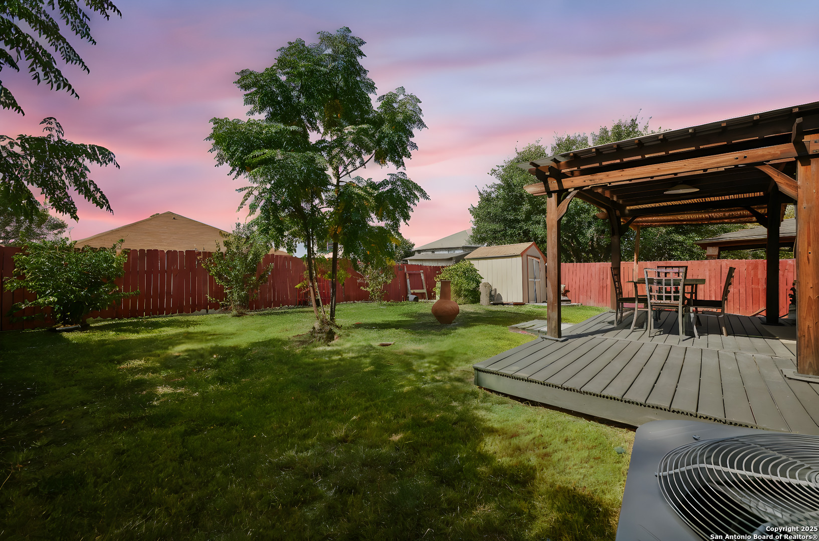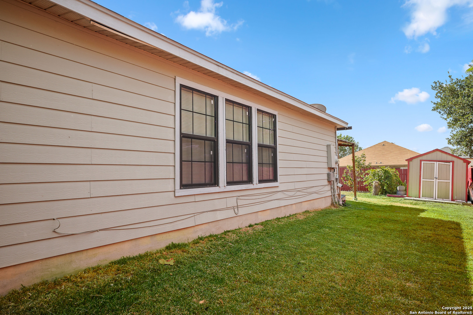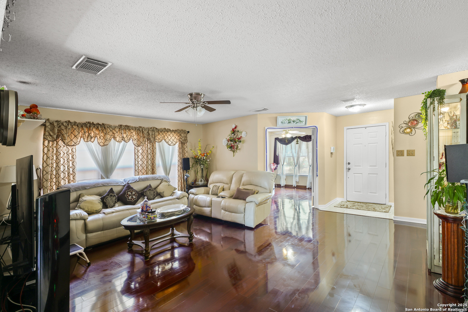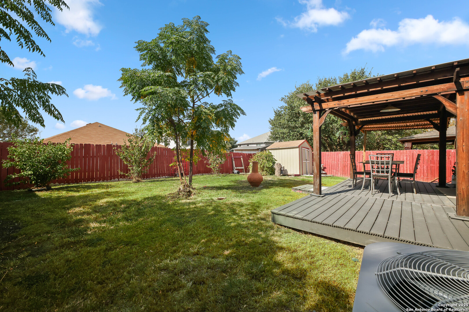 Welcome to this beautifully maintained 3-bedroom, 2-bath home offering 1,345 sq. ft. of comfortable living space. From the moment you arrive, you'll appreciate the beautiful curb appeal, with a brick-accented front exterior and a charming covered entryway that creates a warm welcome. Inside, you'll find modern laminate wood and ceramic tile flooring throughout, creating a clean and contemporary feel. The open-concept floor plan features a spacious living room that flows seamlessly into the dining area and kitchen, making it ideal for both everyday living and entertaining. The home is equipped with ceiling fans in every room to enhance comfort and energy efficiency. The primary suite includes a large walk-in closet and a private full bath, offering a relaxing retreat. Step outside to a beautifully landscaped backyard complete with mature trees, healthy grass, a covered patio deck, and a storage shed - perfect for outdoor enjoyment and gatherings. Conveniently located near Loop 1604, IH-35, and Hwy 90, and just minutes from Randolph Air Force Base, this home offers easy access to shopping, dining, and major employers. This charming home has been lovingly cared for and is move-in ready for its next owner!