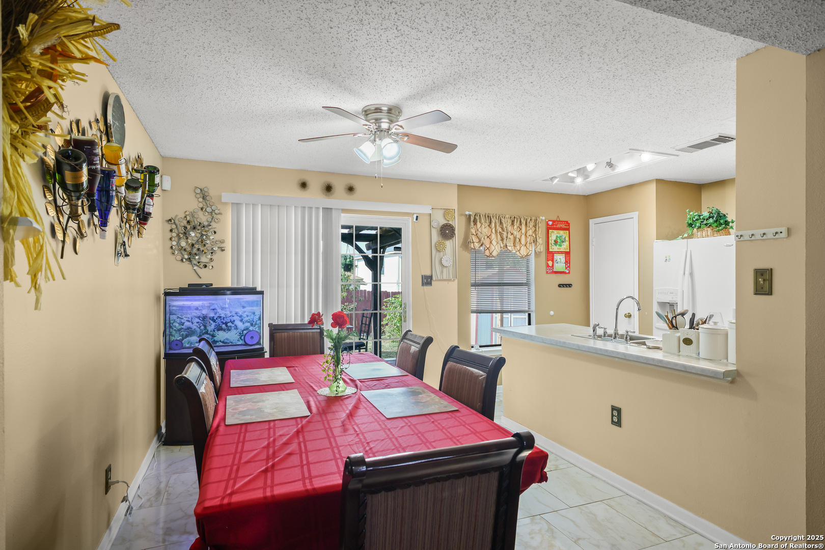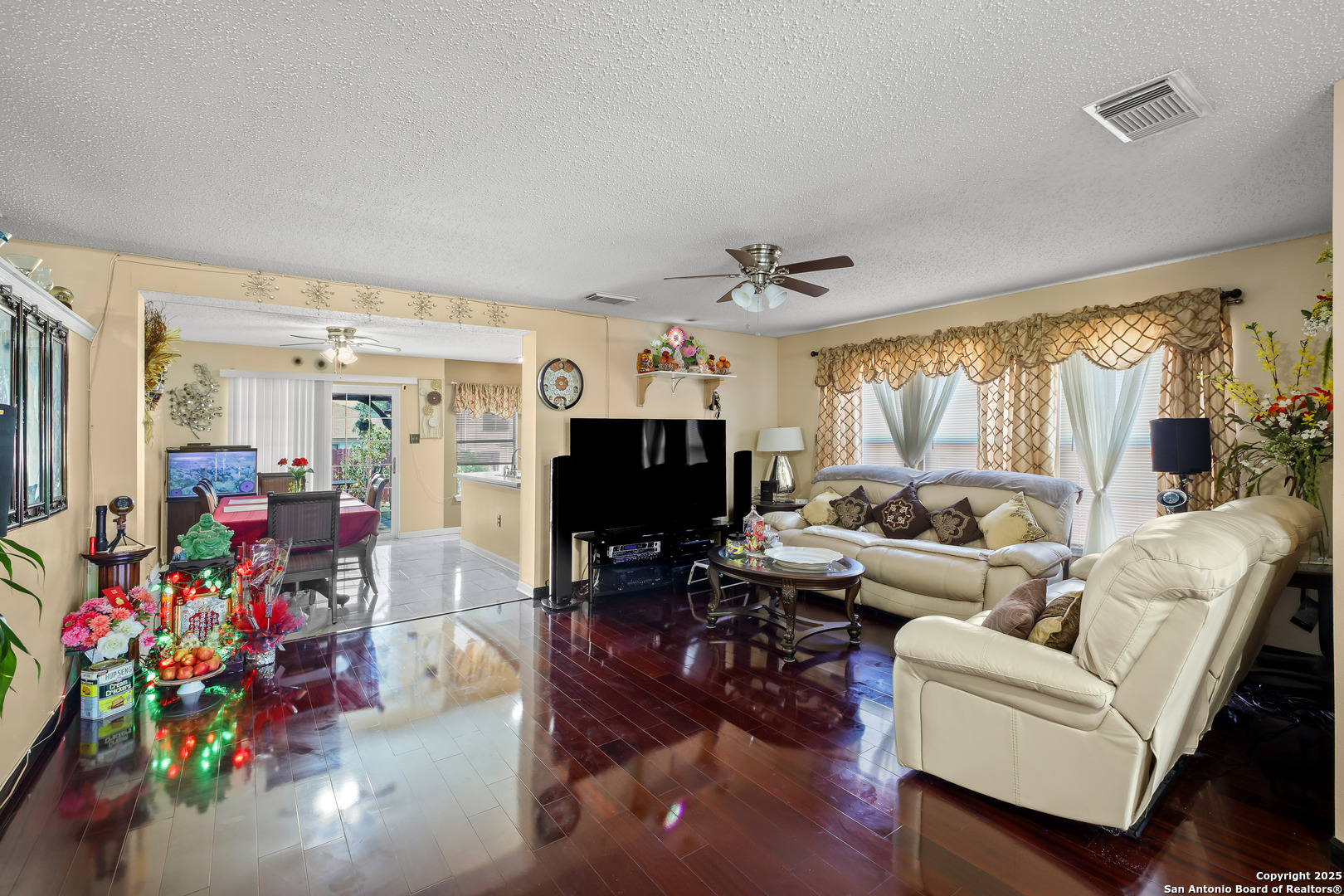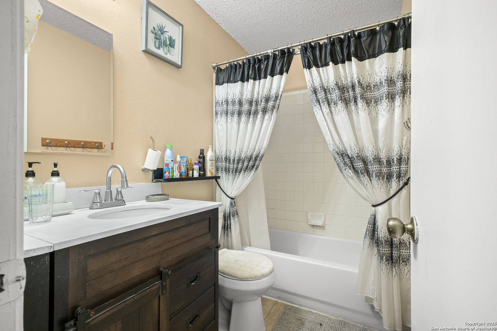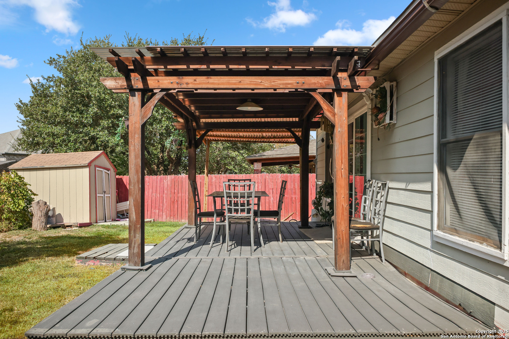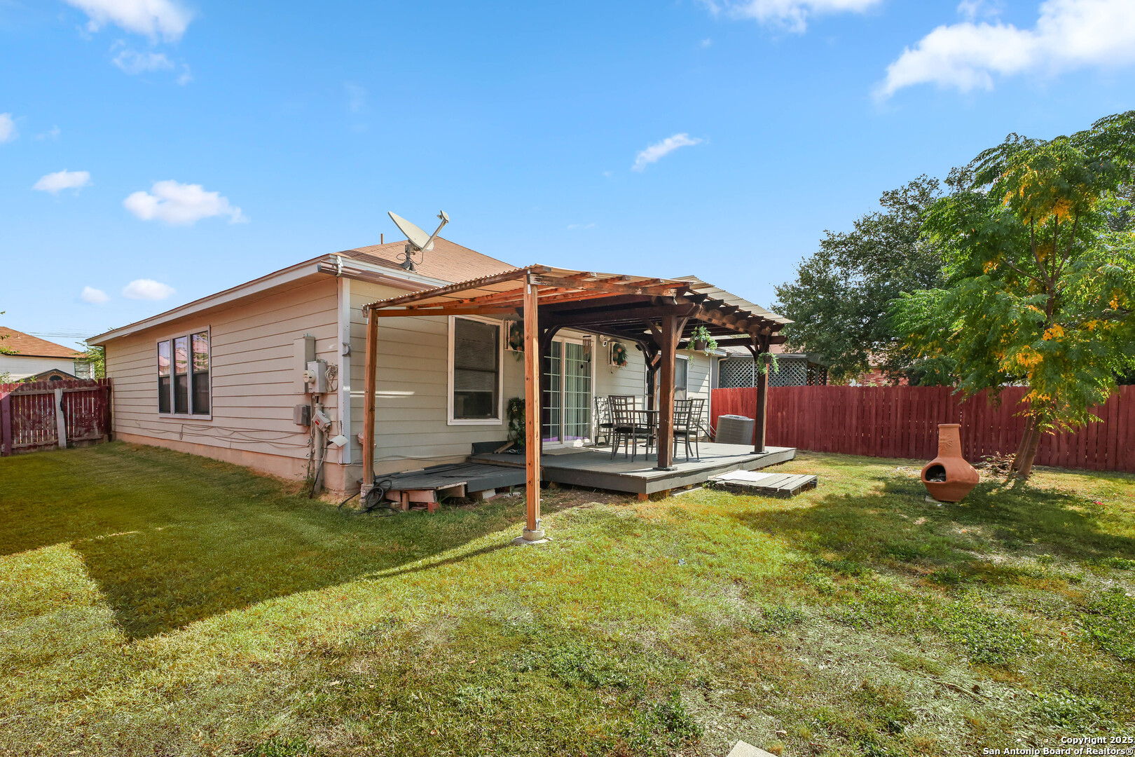 Welcome to this beautifully maintained 3-bedroom, 2-bath home offering 1,345 sq. ft. of comfortable living space. From the moment you arrive, you'll appreciate the beautiful curb appeal, with a brick-accented front exterior and a charming covered entryway that creates a warm welcome. Inside, you'll find modern laminate wood and ceramic tile flooring throughout, creating a clean and contemporary feel. The open-concept floor plan features a spacious living room that flows seamlessly into the dining area and kitchen, making it ideal for both everyday living and entertaining. The home is equipped with ceiling fans in every room to enhance comfort and energy efficiency. The primary suite includes a large walk-in closet and a private full bath, offering a relaxing retreat. Step outside to a beautifully landscaped backyard complete with mature trees, healthy grass, a covered patio deck, and a storage shed - perfect for outdoor enjoyment and gatherings. Conveniently located near Loop 1604, IH-35, and Hwy 90, and just minutes from Randolph Air Force Base, this home offers easy access to shopping, dining, and major employers. This charming home has been lovingly cared for and is move-in ready for its next owner!