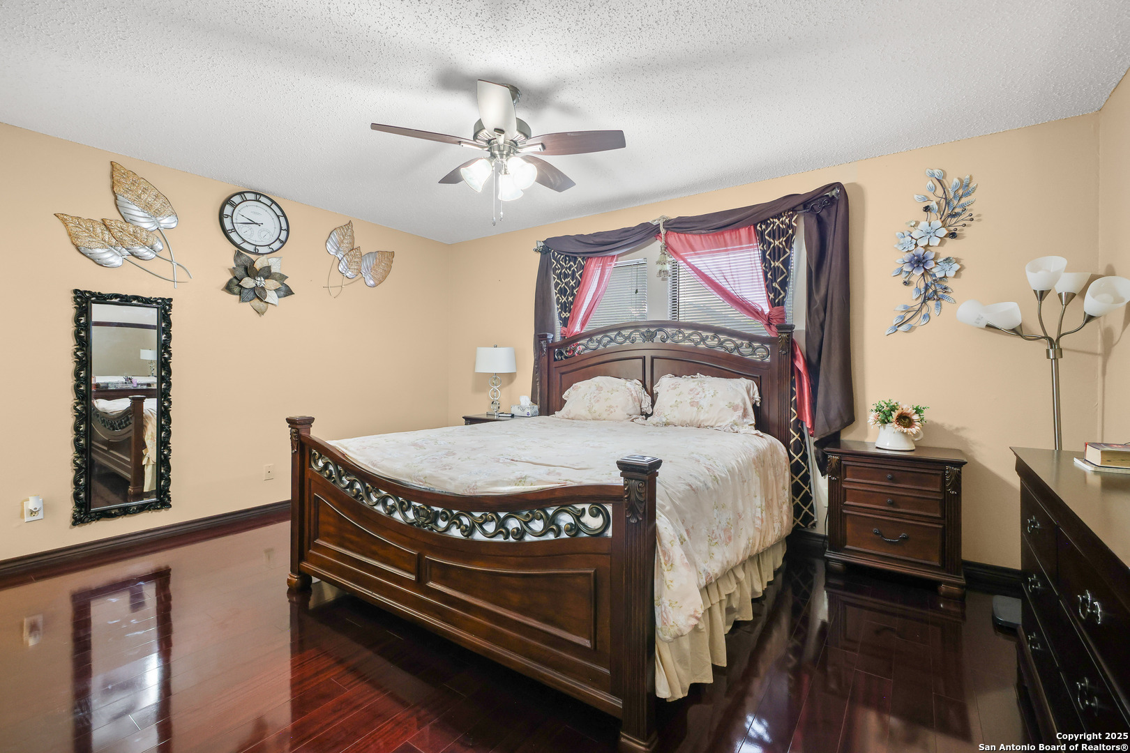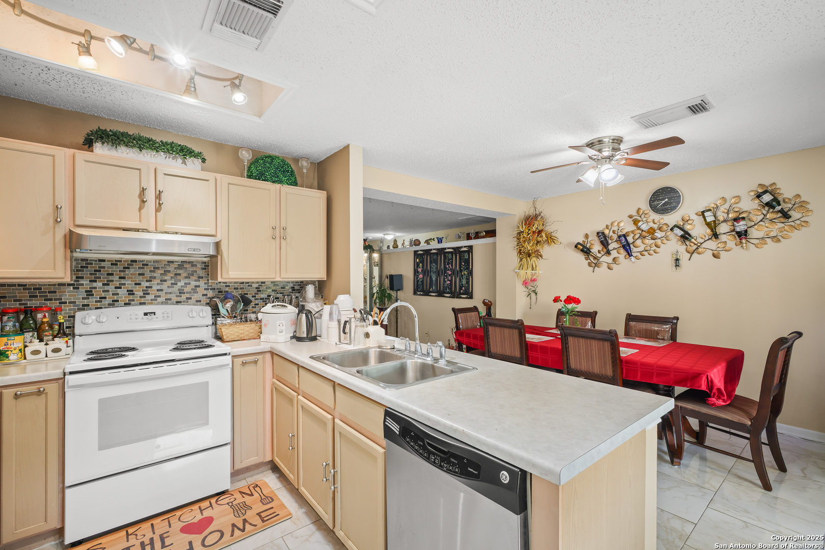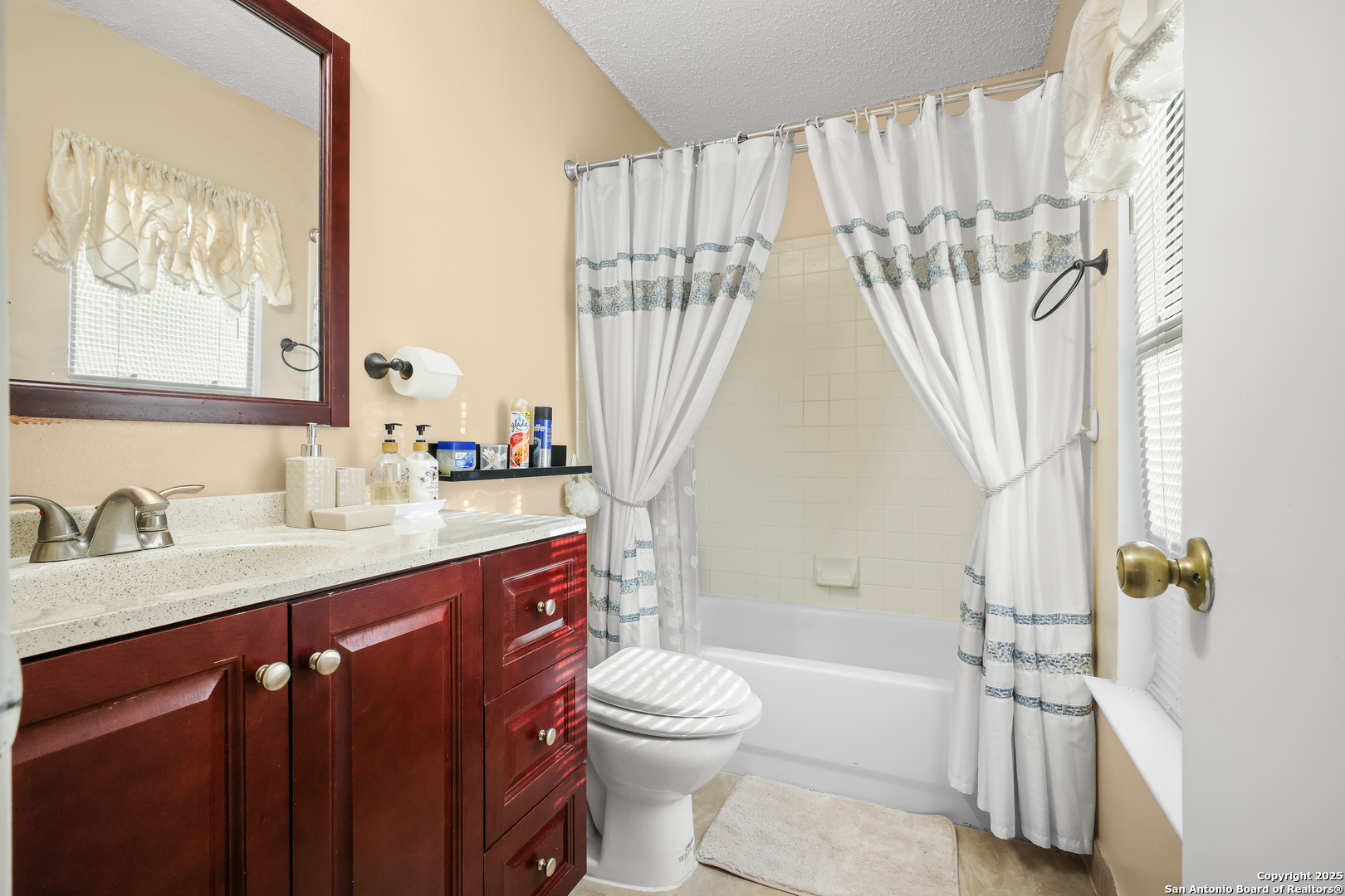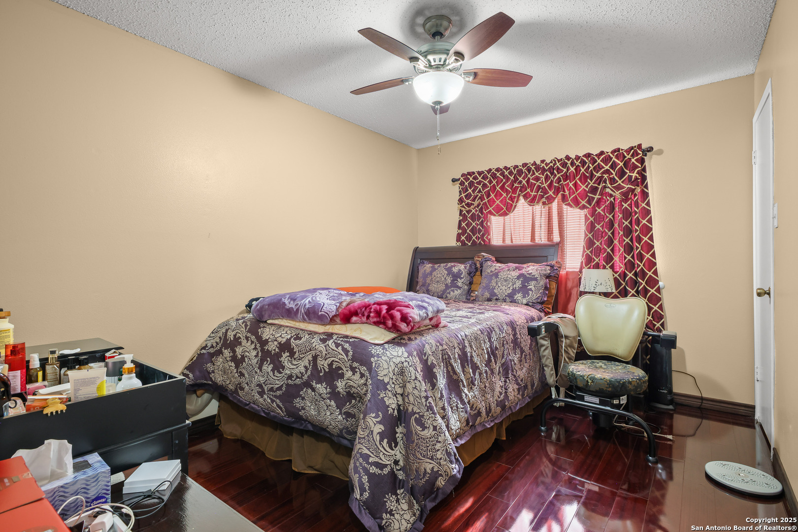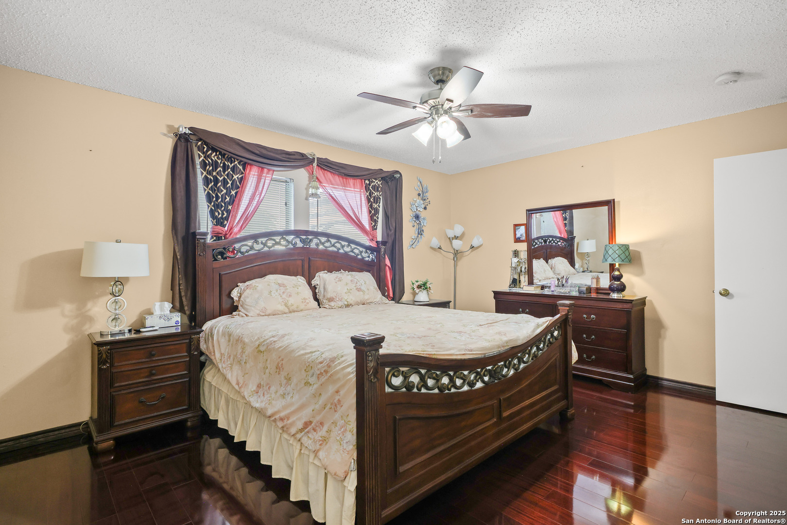 Welcome to this beautifully maintained 3-bedroom, 2-bath home offering 1,345 sq. ft. of comfortable living space. From the moment you arrive, you'll appreciate the beautiful curb appeal, with a brick-accented front exterior and a charming covered entryway that creates a warm welcome. Inside, you'll find modern laminate wood and ceramic tile flooring throughout, creating a clean and contemporary feel. The open-concept floor plan features a spacious living room that flows seamlessly into the dining area and kitchen, making it ideal for both everyday living and entertaining. The home is equipped with ceiling fans in every room to enhance comfort and energy efficiency. The primary suite includes a large walk-in closet and a private full bath, offering a relaxing retreat. Step outside to a beautifully landscaped backyard complete with mature trees, healthy grass, a covered patio deck, and a storage shed - perfect for outdoor enjoyment and gatherings. Conveniently located near Loop 1604, IH-35, and Hwy 90, and just minutes from Randolph Air Force Base, this home offers easy access to shopping, dining, and major employers. This charming home has been lovingly cared for and is move-in ready for its next owner!