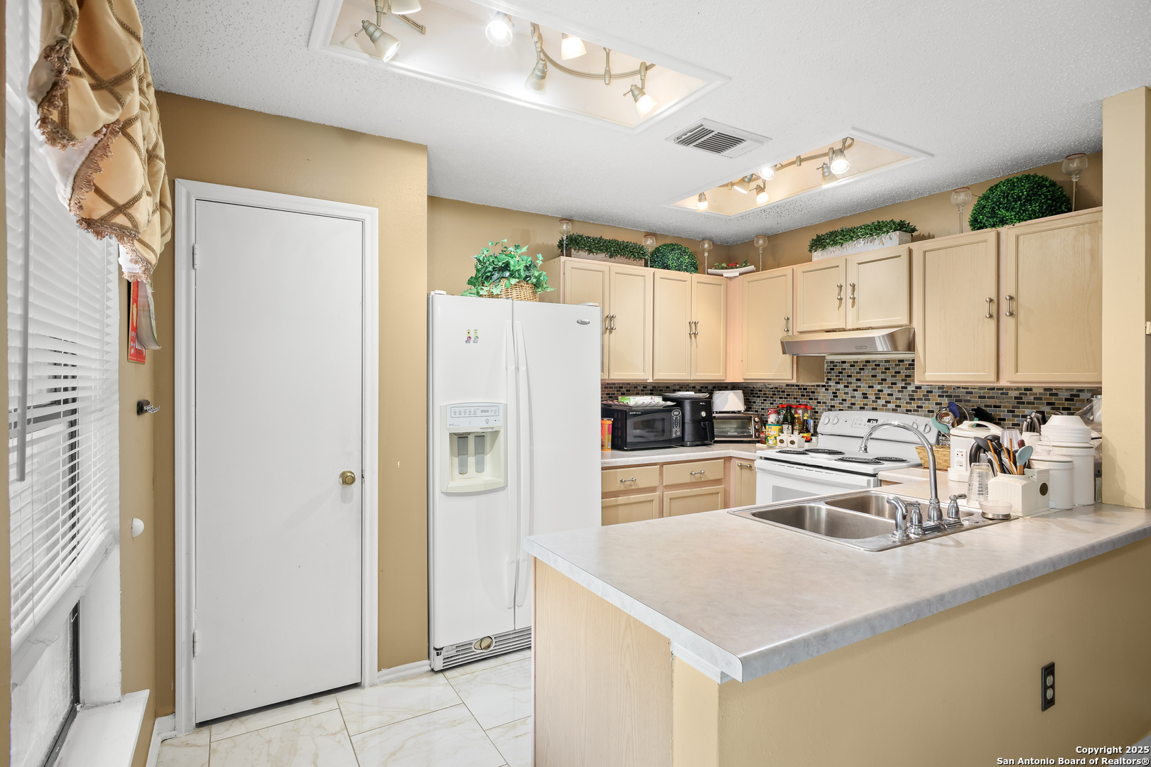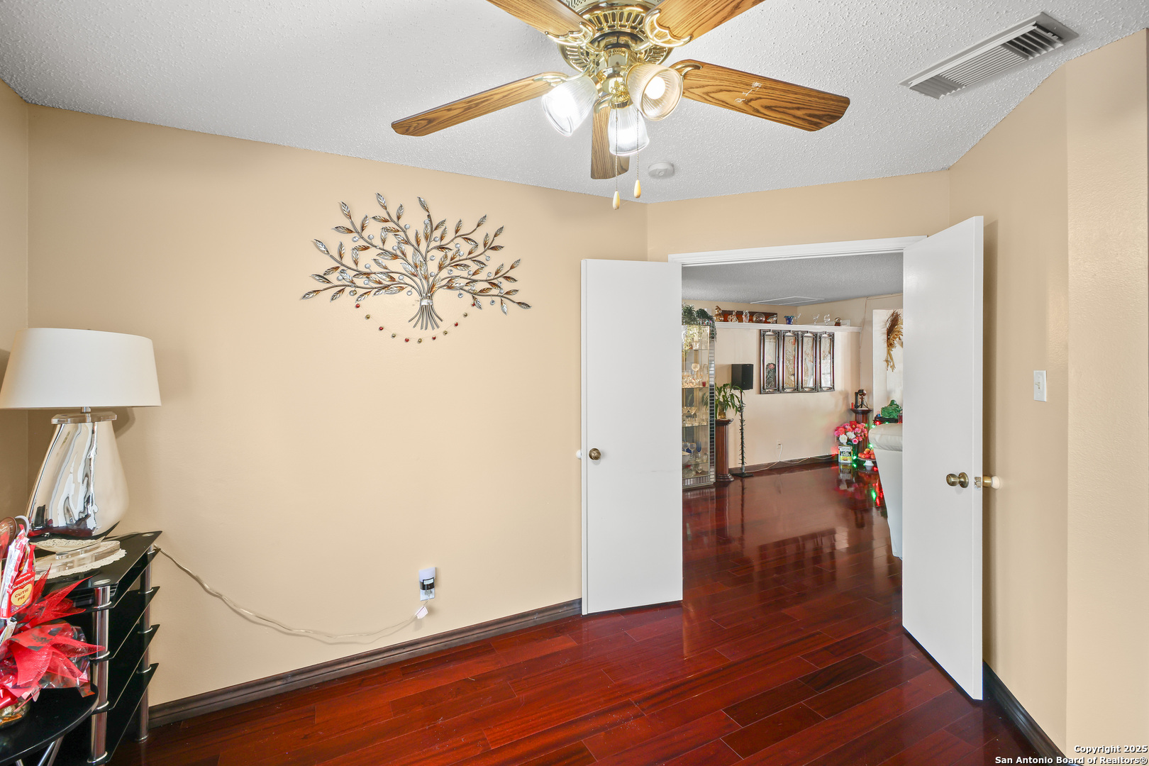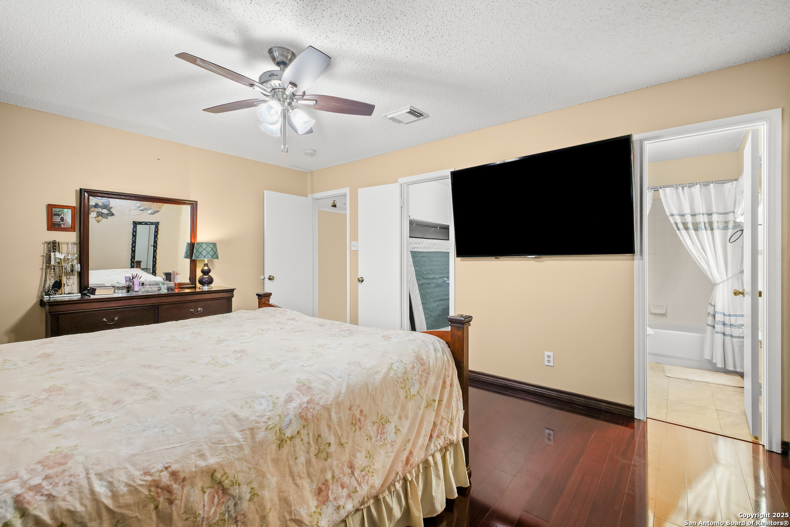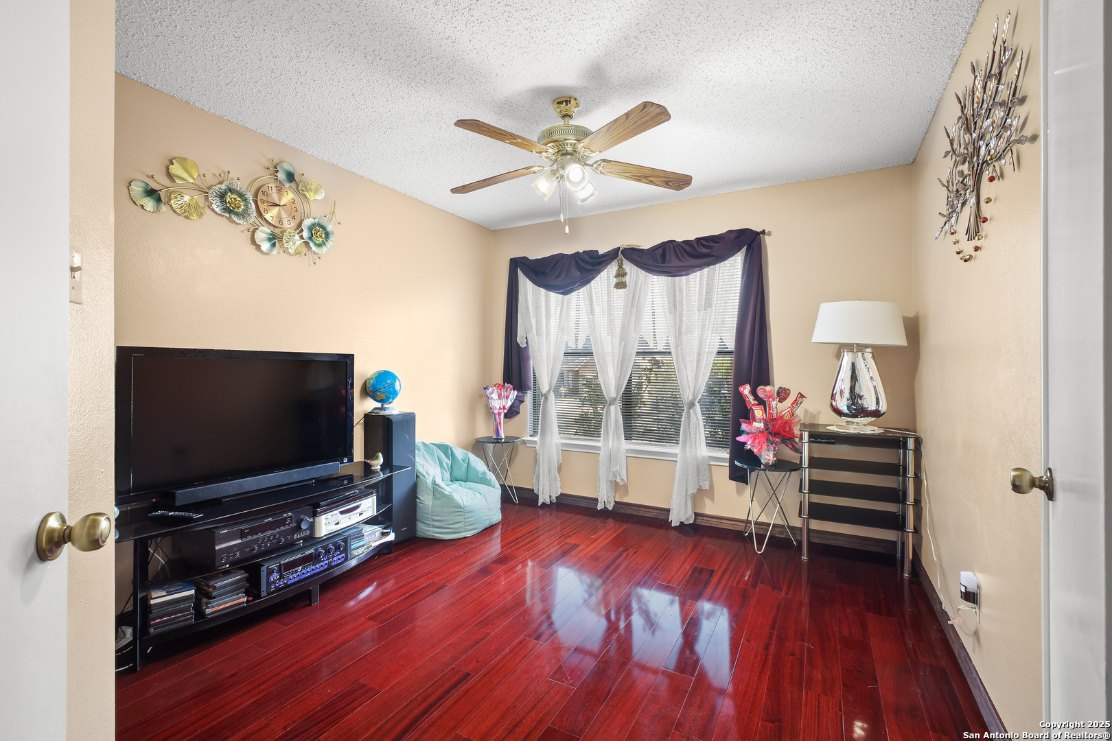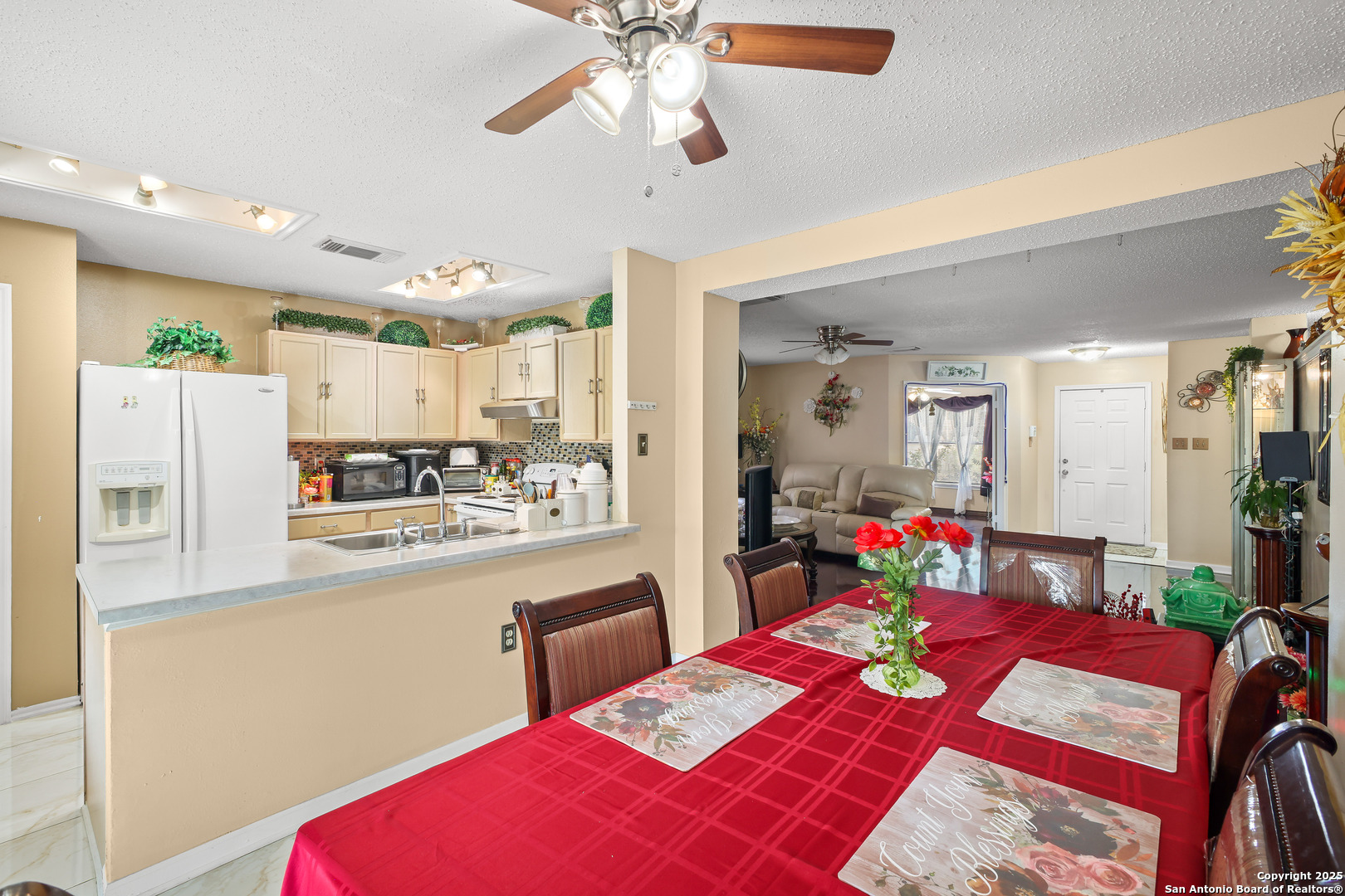 Welcome to this beautifully maintained 3-bedroom, 2-bath home offering 1,345 sq. ft. of comfortable living space. From the moment you arrive, you'll appreciate the beautiful curb appeal, with a brick-accented front exterior and a charming covered entryway that creates a warm welcome. Inside, you'll find modern laminate wood and ceramic tile flooring throughout, creating a clean and contemporary feel. The open-concept floor plan features a spacious living room that flows seamlessly into the dining area and kitchen, making it ideal for both everyday living and entertaining. The home is equipped with ceiling fans in every room to enhance comfort and energy efficiency. The primary suite includes a large walk-in closet and a private full bath, offering a relaxing retreat. Step outside to a beautifully landscaped backyard complete with mature trees, healthy grass, a covered patio deck, and a storage shed - perfect for outdoor enjoyment and gatherings. Conveniently located near Loop 1604, IH-35, and Hwy 90, and just minutes from Randolph Air Force Base, this home offers easy access to shopping, dining, and major employers. This charming home has been lovingly cared for and is move-in ready for its next owner!