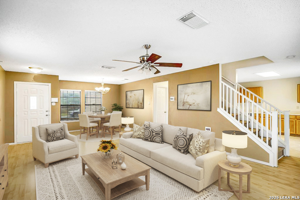 You owe it to yourself to visit this home, attractively situated on a large corner lot and offering a practical layout designed for everyday living. Incentives from a preferred lender may make buying even easier! The exterior features classic brick construction, several recently replaced windows, and a neutral paint palette ready for your personal touches. The downstairs living areas feature easy-care flooring with no carpet. The spacious kitchen offers ample cabinetry for storage and includes a newer dishwasher and microwave. A sliding door fills the space with natural light and opens to an oversized covered patio, creating a seamless connection to the backyard. The downstairs laundry room includes additional storage for added convenience. All bedrooms are located upstairs, providing added privacy and peace of mind for a restful night's sleep. Each bedroom is equipped with a ceiling fan, and the bathrooms include medicine cabinets. With the exception of wet areas, the upstairs features durable looped Berber carpet designed for long-term use. The primary bathroom includes dual vanities, making busy mornings more efficient. Outside, the large yard features new fencing and a mature shade tree. With its functional floor plan, low-maintenance features, and generous outdoor space, this home is a solid option for buyers seeking comfort, convenience, and long-term value. (Grass color has been enhanced.)