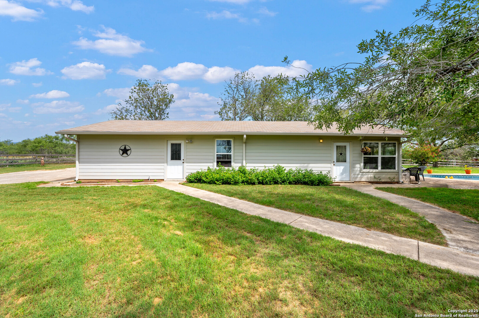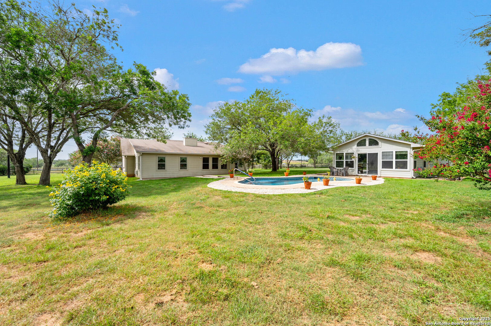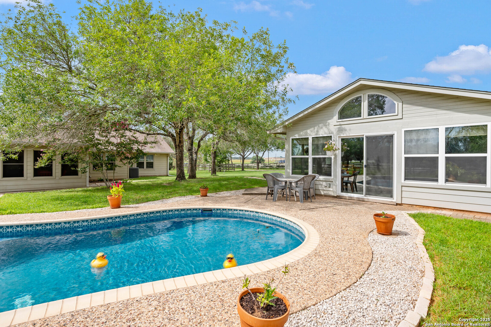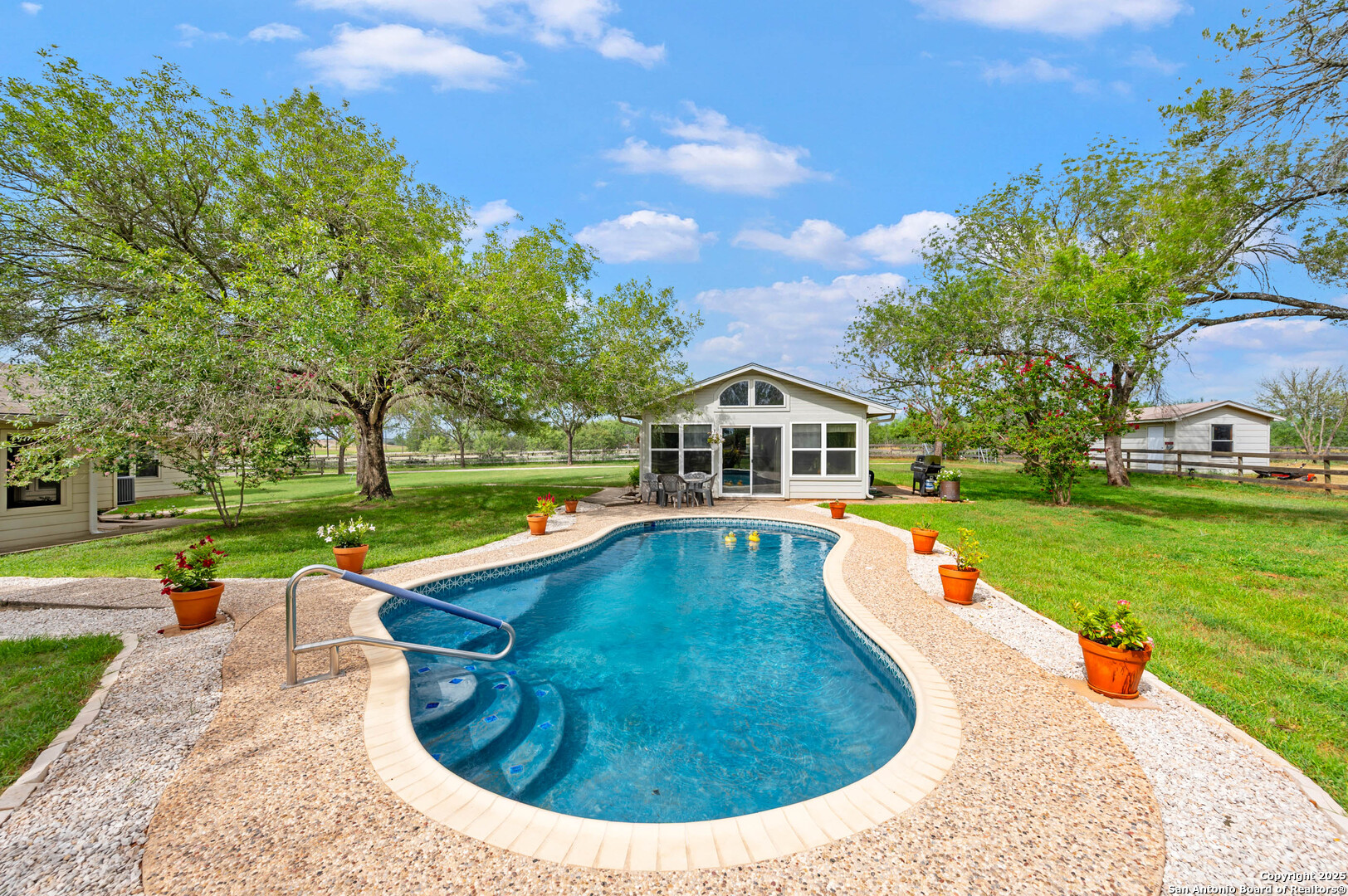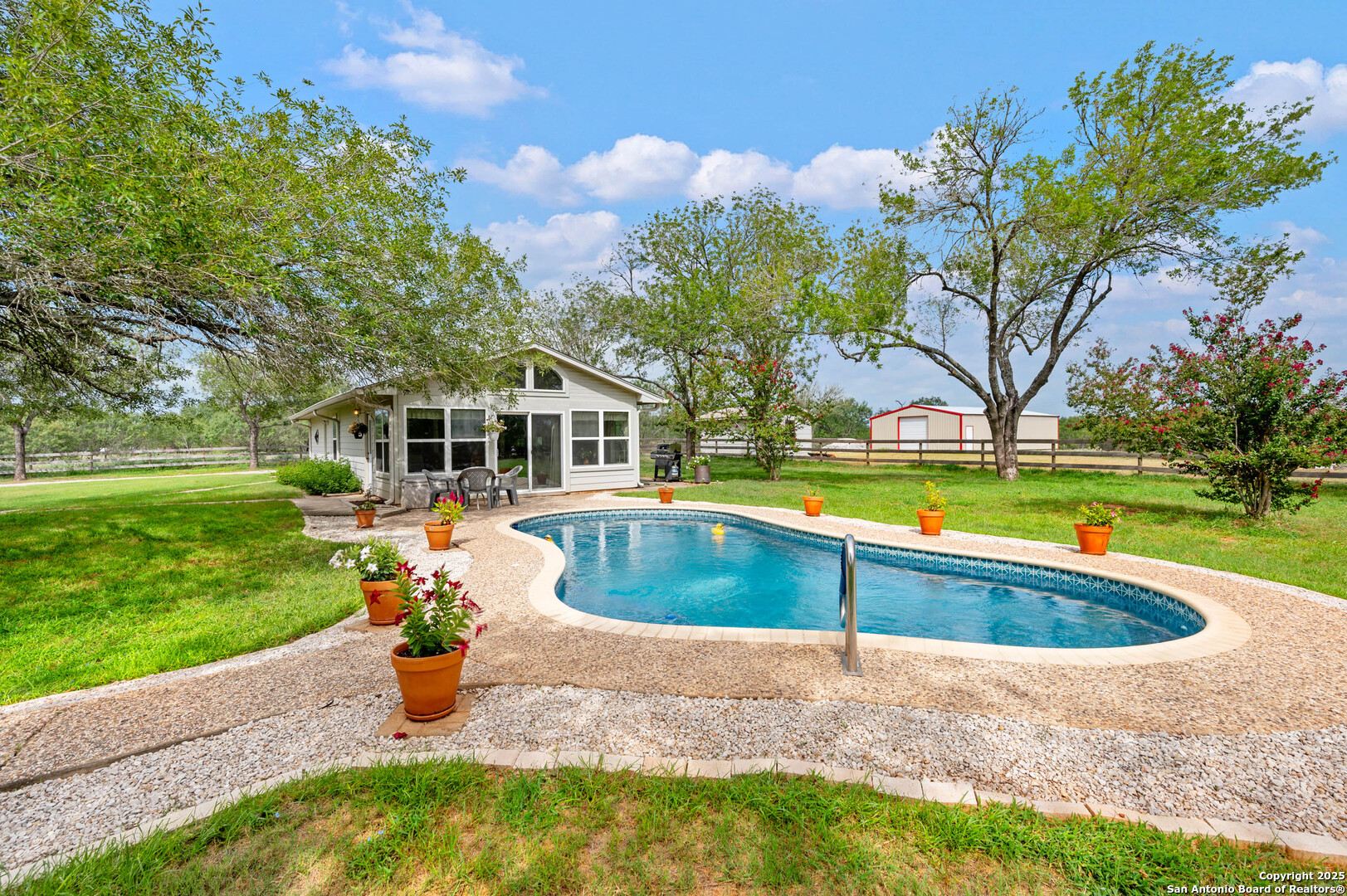 Charming Country Oasis with Pool & Guest Quarters on 3 Acres. Drive up a picturesque, tree-lined driveway to this well-maintained retreat. The main home offers a thoughtful split floor plan with two spacious primary suites on opposite ends, plus two additional bedrooms that share a full bath. Enjoy open-concept living with a roomy eat-in kitchen and a bonus room that overlooks the sparkling pool and backyard. A semi-furnished pool house adds even more versatility, complete with a kitchen and bath-perfect for guests, entertaining, or multi-generational living. The inviting pool is surrounded by generous patio space, ideal for relaxing or hosting gatherings day or night. Additional highlights include updated major systems, triple-pane windows throughout, a detached two-car garage, and a 30x50 workshop with concrete floors. Set on 3 fully fenced and cross-fenced acres with corral fencing, a wrought iron security gate, and mature trees, this private haven offers easy access to La Vernia, Floresville, and Stockdale while delivering serene, country living. This one-of-a-kind property is a must-see!