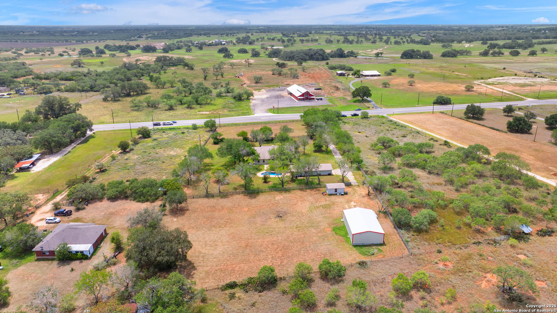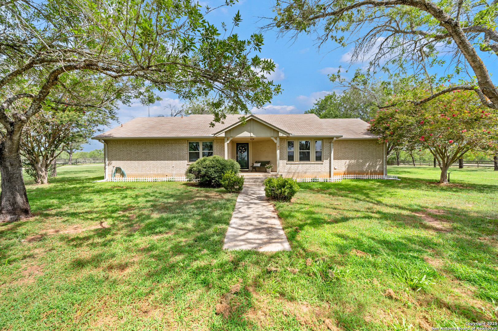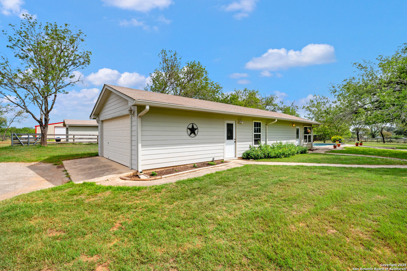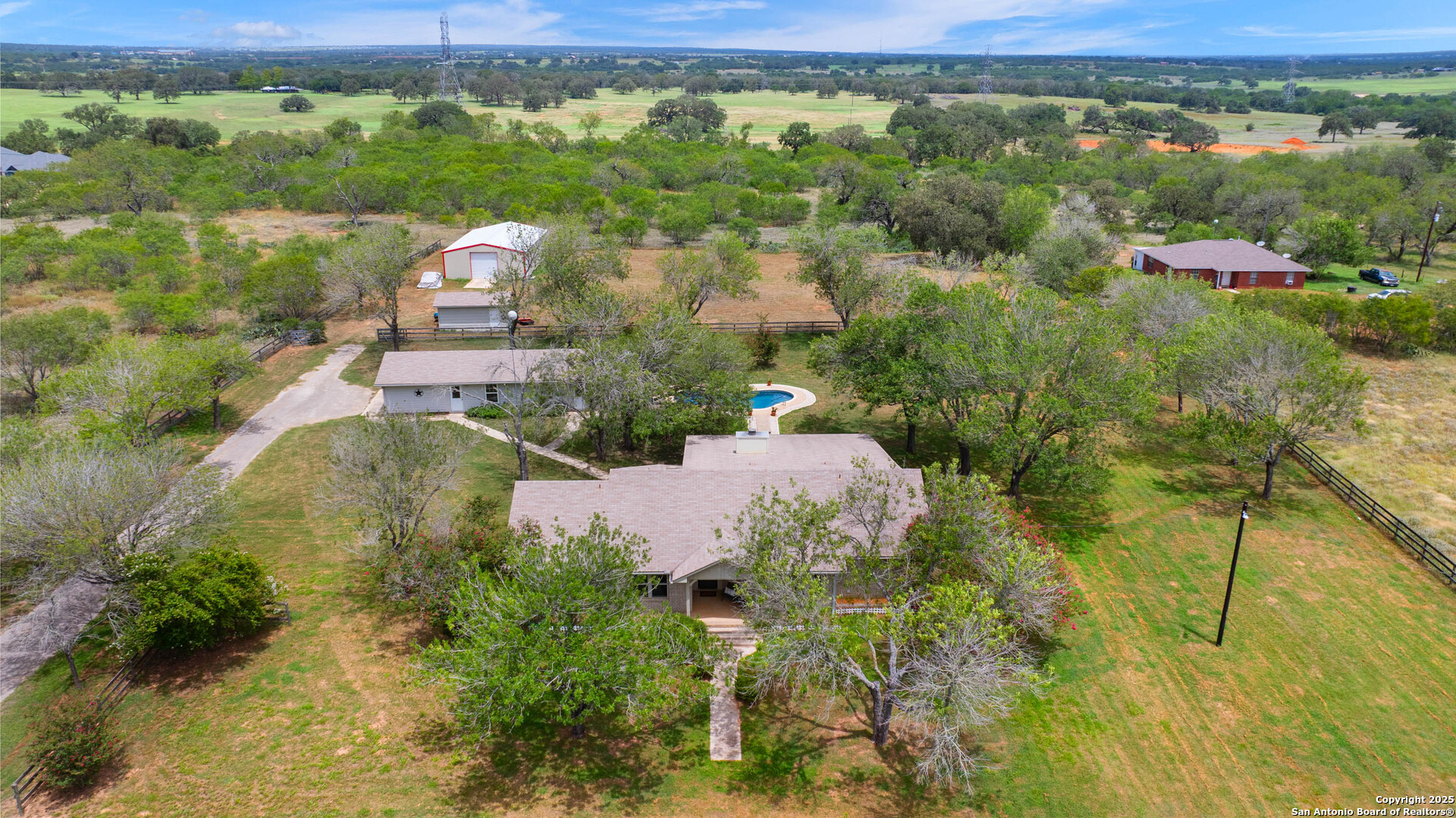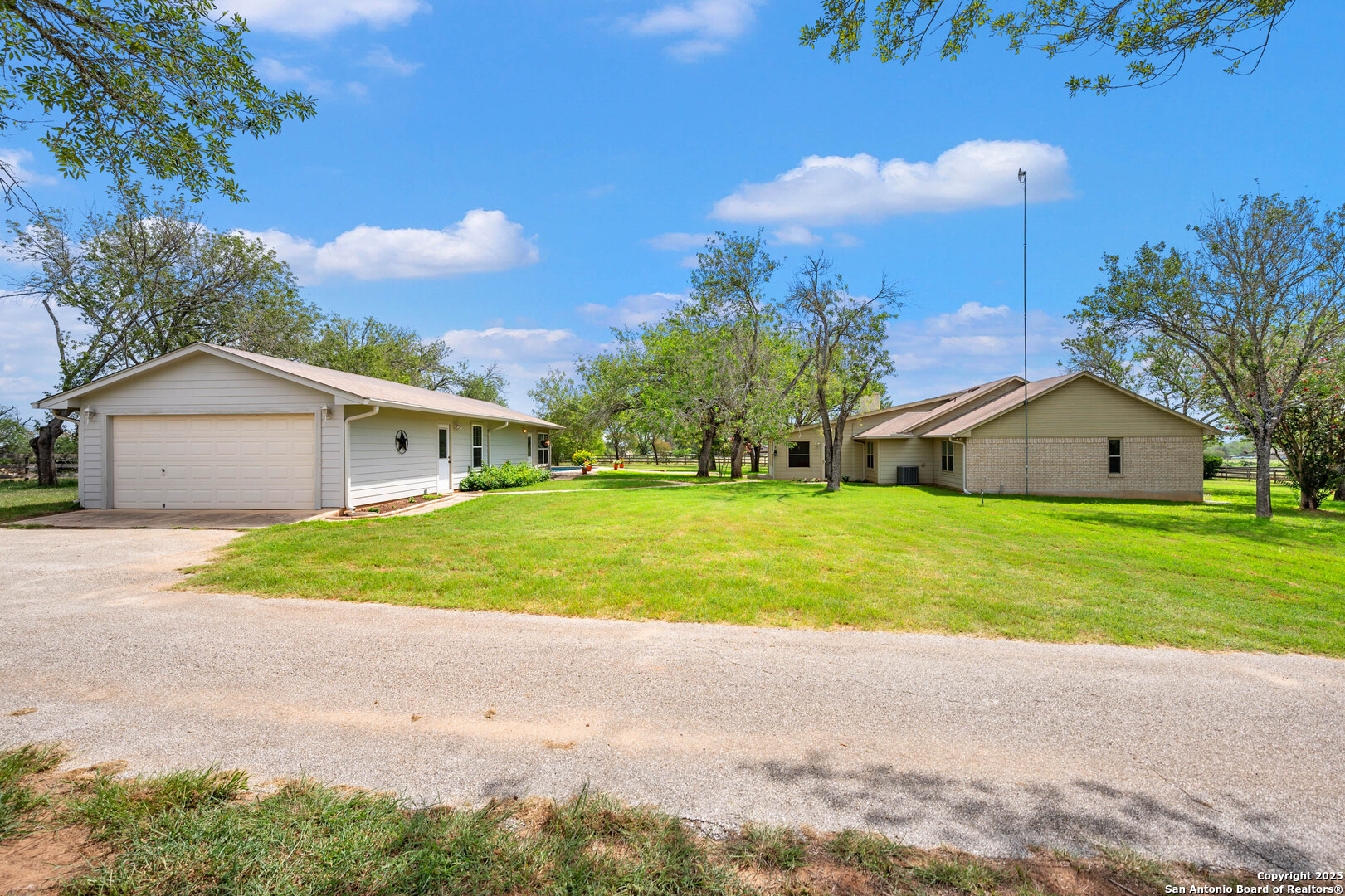 Charming Country Oasis with Pool & Guest Quarters on 3 Acres. Drive up a picturesque, tree-lined driveway to this well-maintained retreat. The main home offers a thoughtful split floor plan with two spacious primary suites on opposite ends, plus two additional bedrooms that share a full bath. Enjoy open-concept living with a roomy eat-in kitchen and a bonus room that overlooks the sparkling pool and backyard. A semi-furnished pool house adds even more versatility, complete with a kitchen and bath-perfect for guests, entertaining, or multi-generational living. The inviting pool is surrounded by generous patio space, ideal for relaxing or hosting gatherings day or night. Additional highlights include updated major systems, triple-pane windows throughout, a detached two-car garage, and a 30x50 workshop with concrete floors. Set on 3 fully fenced and cross-fenced acres with corral fencing, a wrought iron security gate, and mature trees, this private haven offers easy access to La Vernia, Floresville, and Stockdale while delivering serene, country living. This one-of-a-kind property is a must-see!