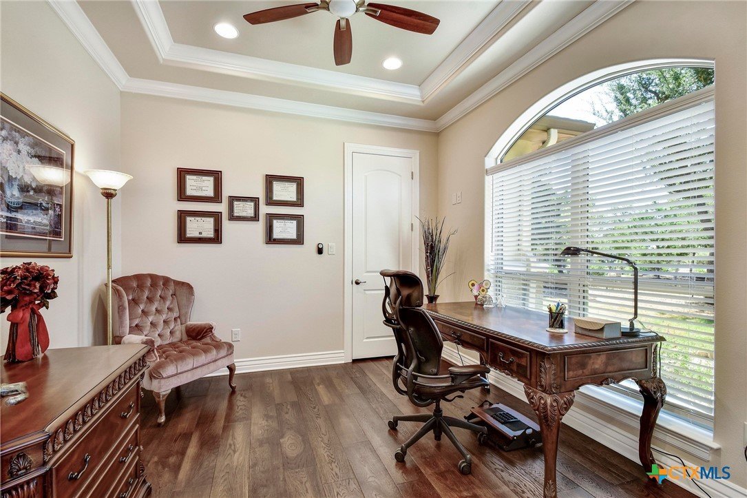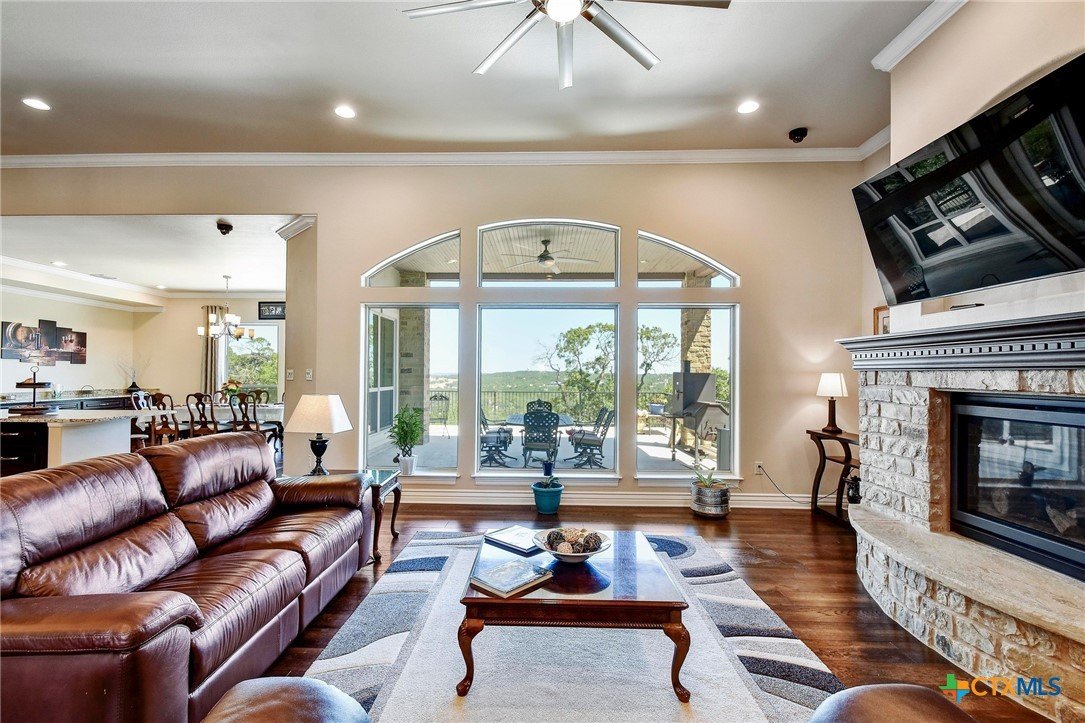 Stunning hilltop home with panoramic views. Perched high atop a scenic hill,this is the one you've been waiting for. This exceptional 5 Bedroom 4.5 bath home offers an unparalleled vantage point, capturing sweeping vistas that stretch as far as the eye can see. Step into the perfect picture featuring soaring ceilings, large rock fireplace, & a wall of windows designed to maximize natural light & outdoor visibility. Beautiful wood & porcelain floors run throughout the open floorplan. Chef's will be delighted in the spacious gourmet kitchen with a generous center island perfect for entertaining, second breakfast bar, dual ovens, six burner gas cooktop, built-in microwave, warming drawer, deep porcelain sink with disposal, dishwasher, beverage refrigerator, & large walk-in pantry. This gorgeous kitchen opens to the Living and Dining Rooms, all with the stunning hill country vistas. Retreat to the luxurious primary suite, where you'll wake up to panoramic views, and it features its own gas fireplace. Unwind in a spa-inspired bathroom featuring a jetted soaking tub, separate walk-in shower, & dual vanities. The large 19 x 11 walk-in closet has lighted cabinets and a built-in shoe rack. The secondary downstairs bedroom comes complete with its own private full bath and is perfect for guests, an au pair, or nanny. The large laundry room features built-in cabinets, granite counter with sink, and ample room to add that second fridge with ice maker connection or freezer. The three upstairs bedrooms with two full baths provide ample space for family or guests, with each bedroom offering its own unique outlook over the rolling landscape below. Oversized three car garage with connected air-conditioned workshop, water softener, two gas tankless water heaters, & a secluded private flagstone patio to enjoy the sunsets. Wow! Experience life at the top. Schedule your private tour today and discover hilltop living at its finest with views, views & more views!