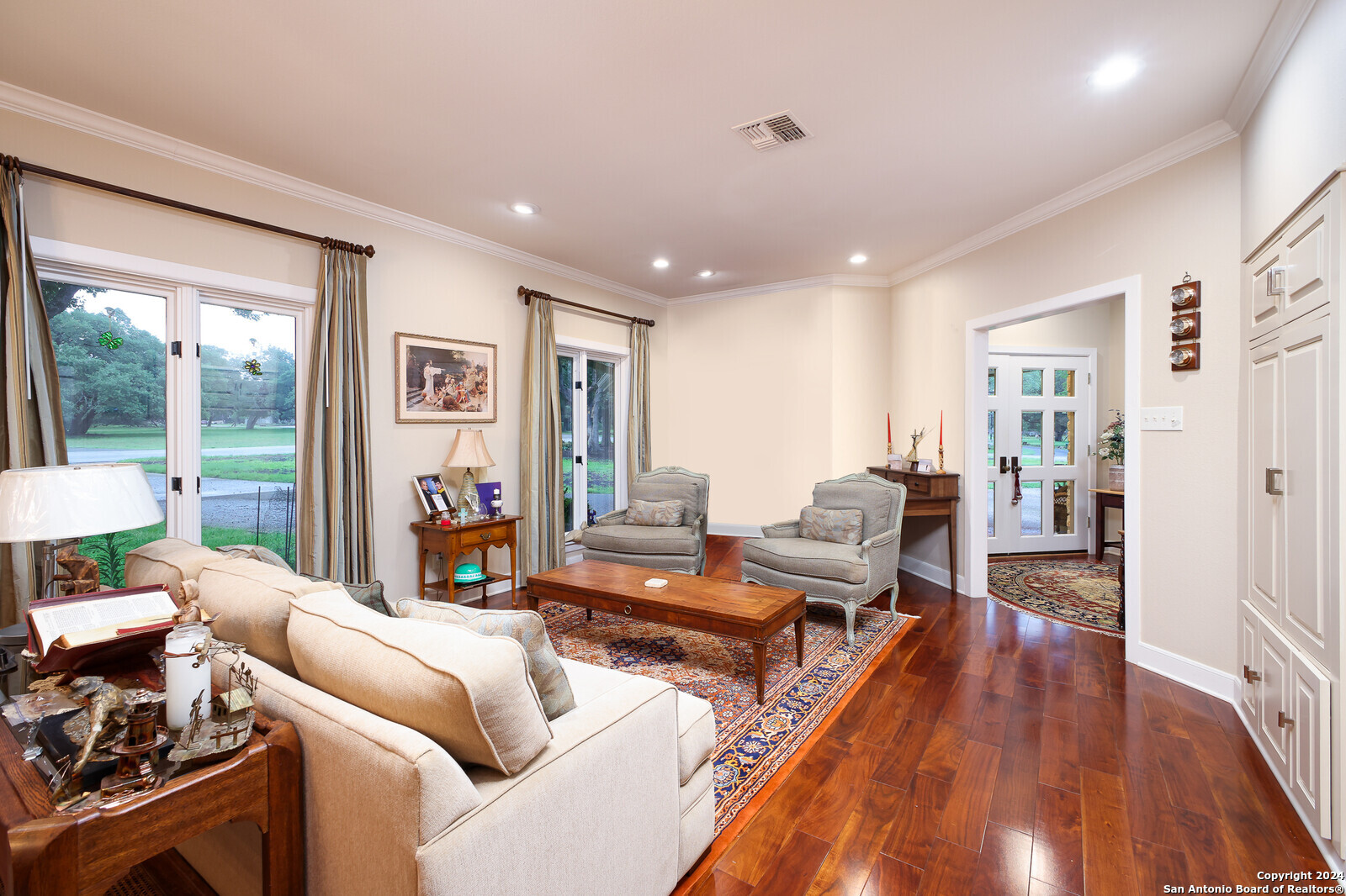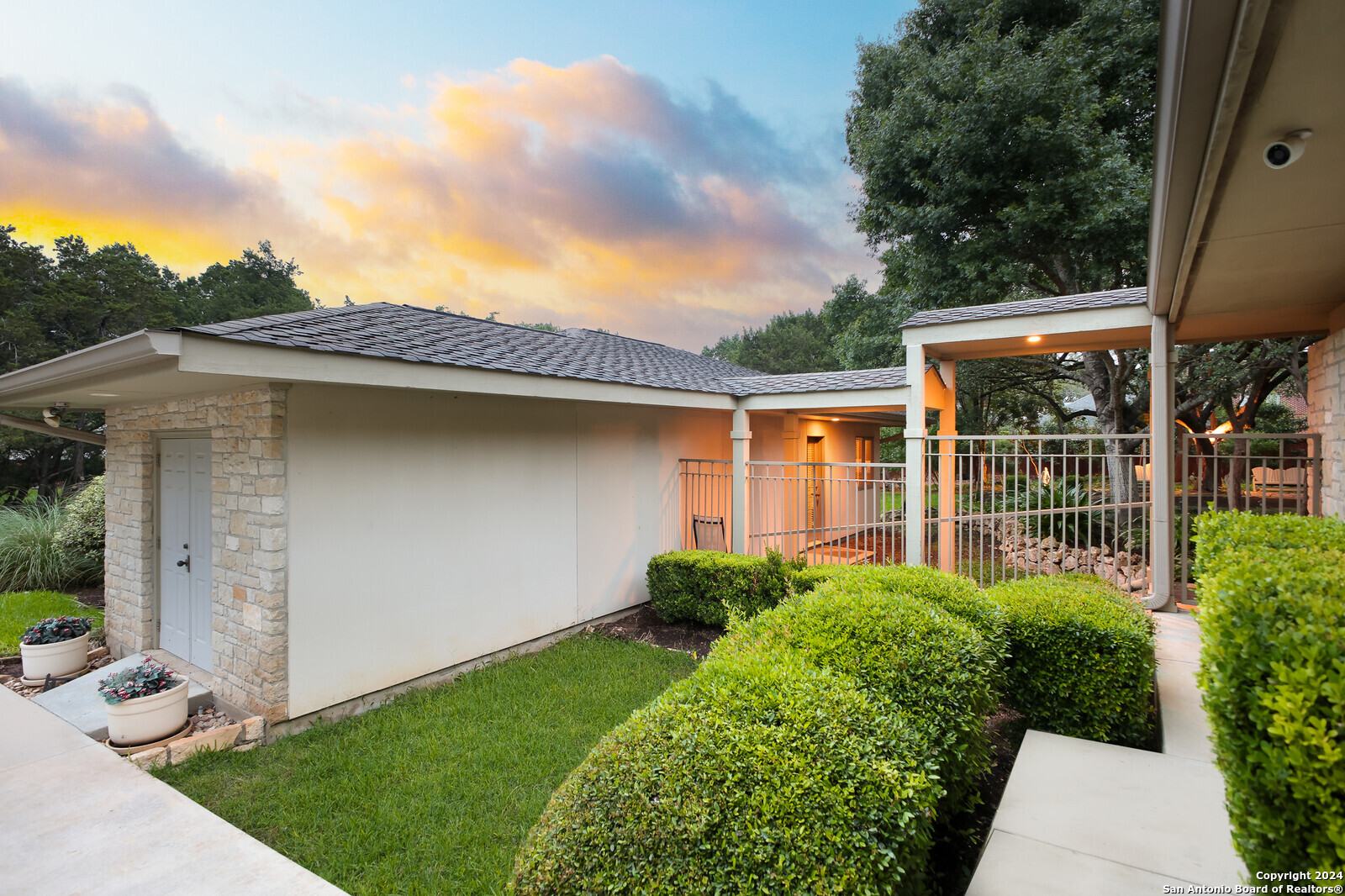 Experience the perfect blend of luxury and convenience in this rare gem located in the highly sought-after T Bar M subdivision of New Braunfels, TX. This distinctive home not only promises a resort-like lifestyle with access to premier amenities including six tennis courts and a community pool but also ensures privacy and serenity in an established hill country neighborhood. Step inside to discover an open floor plan, with 3 bedroom, 2 baths in the main house, highlighted by vinyl flooring that flows from the spacious living areas to the elegant master bedroom suite. Recessed lighting throughout enhances the modern and welcoming ambiance. The heart of the home, the kitchen, is a culinary delight featuring a vast center island, and custom cabinetry, perfect for entertaining and everyday living. The property also boasts a 474 sq ft detached guest house, complete with its own kitchen, one bedroom and one full bathroom, and garage, offering an ideal setup for a mother-in-law suite or private retreat for guests. Additional conveniences include two separate driveways providing ample parking options. With over an acre of lush greenery, the outdoor space is a private oasis ideal for relaxation and gatherings. Don't miss the opportunity to own this beautifully unique home where every detail is designed for comfort and style.