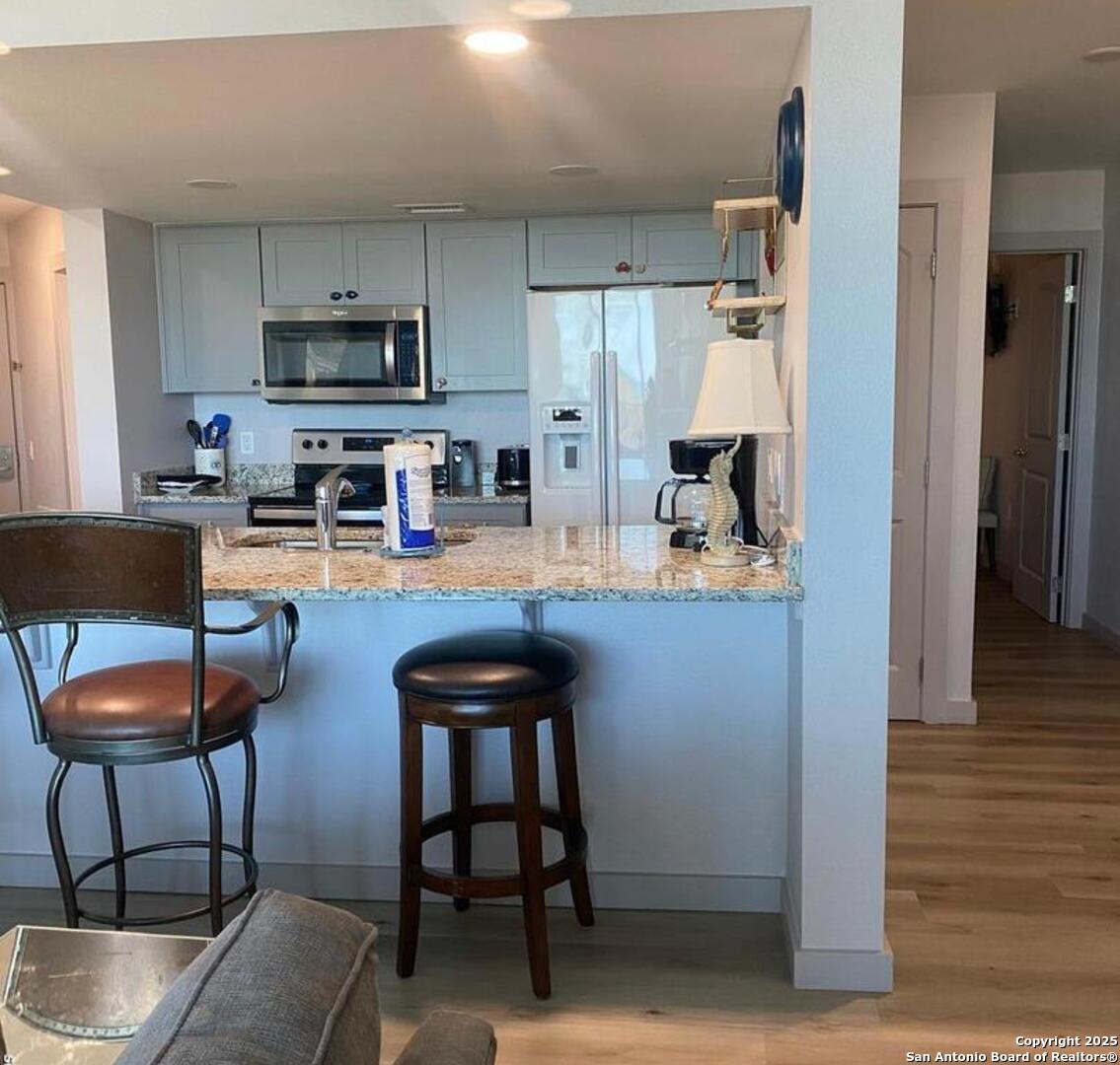 REDUCED REDUCED for the right BUYER! Ocean View! Decorated in a beach theme, this condo has a roomy living area with a large kitchen and dining area. There is a kitchen bar with extra seating in which you can enjoy breakfast. The bedroom has that cozy feeling separated from living area. The newly remodeled bathroom has a walk in shower, beautiful granite counter tops and a large multi-drawer vanity with ample counter space. This recently renovated condo is conveniently located near the elevator and parking area. It's just steps from the beach and the beautiful pool/hot tub. In the evenings you can sit out on private terrace and watch the ships and the jetties. The sunrises and sunsets are stunning. Purchase as vacation home or an Investors delight. On site rental management and newly updated conference facilities for gatherings. SHOWINGS REQUIRE 24 HOURS NOTICE WITH OFFICE. Unit has full schedule most of summer for residual income.