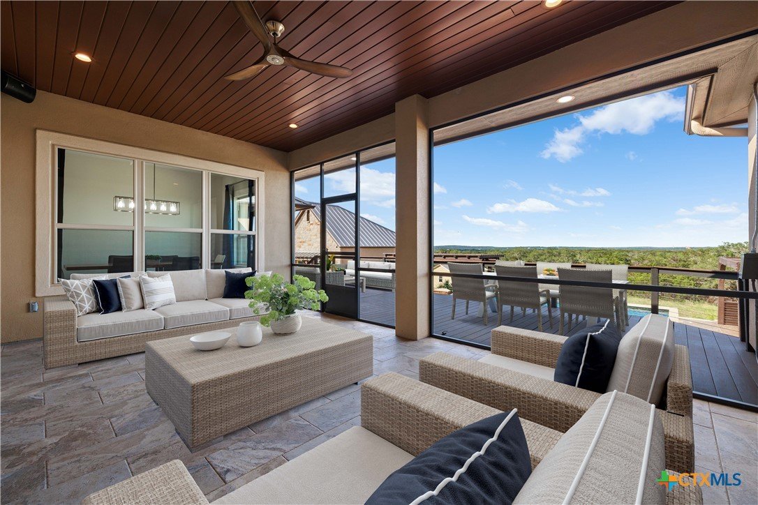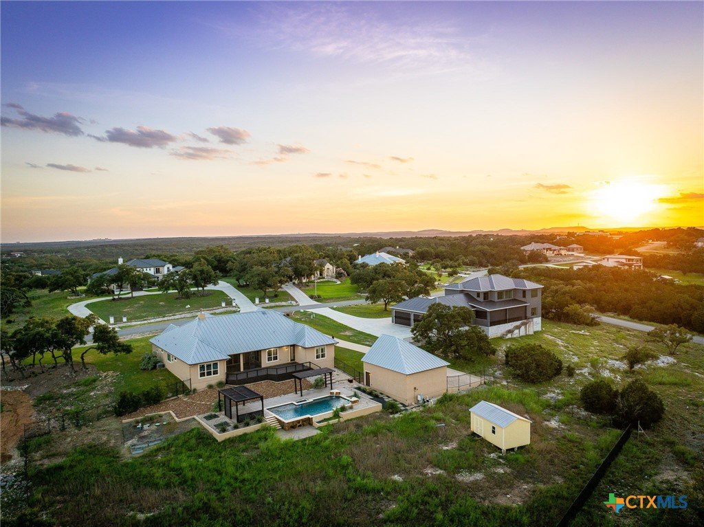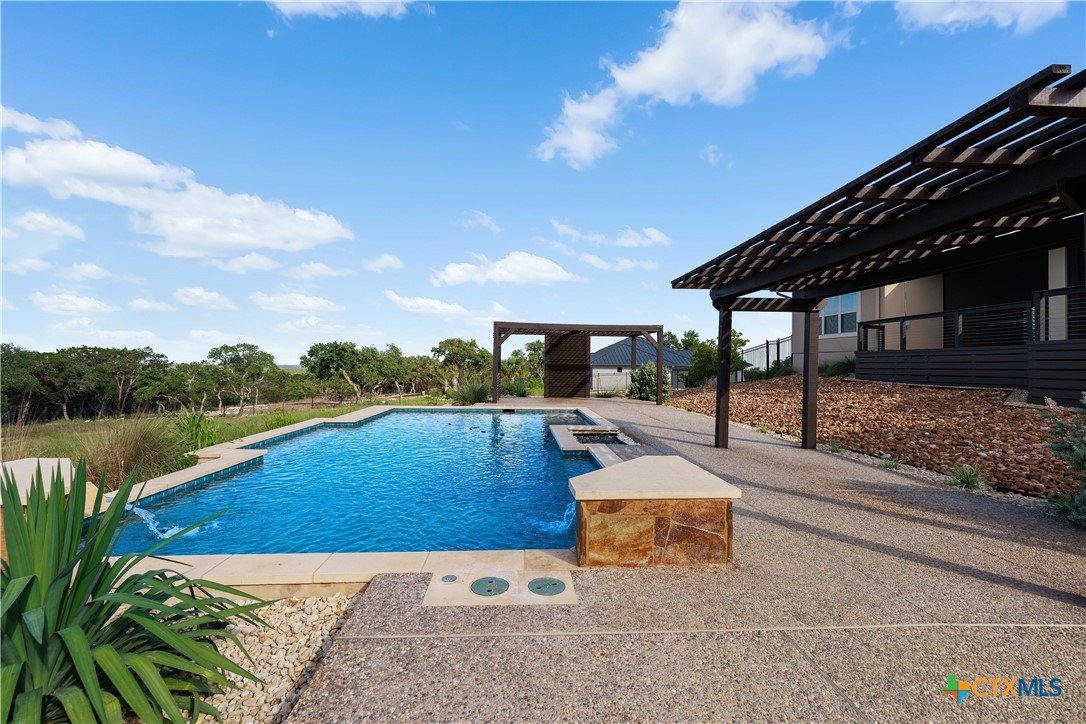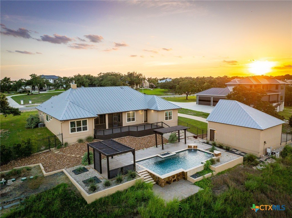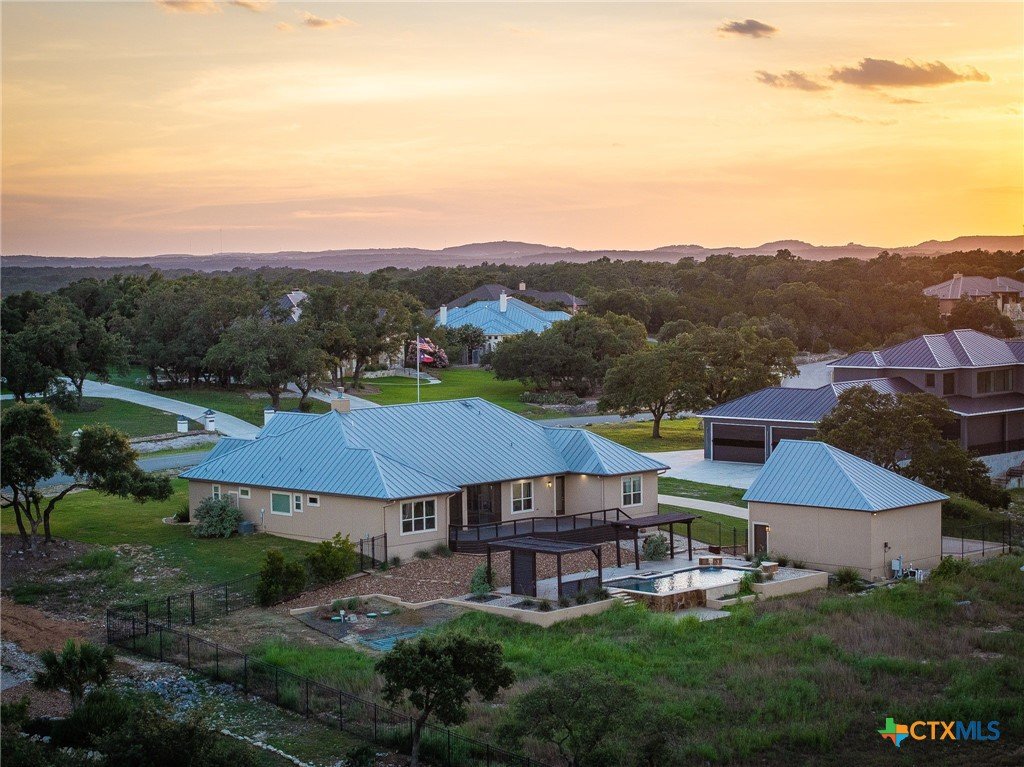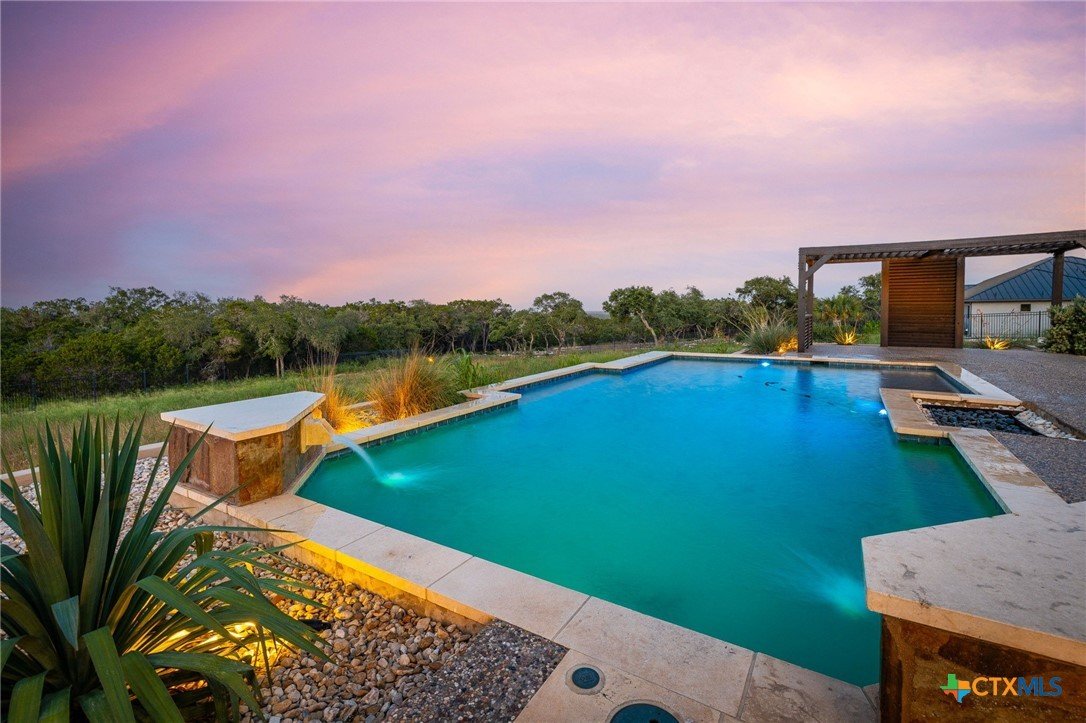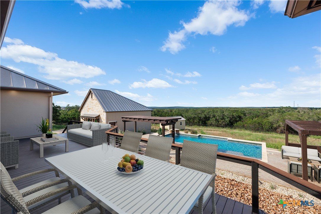 Discover unparalleled luxury in the exclusive Ramble Ridge community on 1.3 acres. This exquisite 4-bedroom, 4-bathroom home epitomizes sophistication, offering a meticulously designed layout perfect for modern living. The gourmet kitchen features an island with granite countertops, double ovens, a butler's pantry, a walk-in pantry, and Bosch stainless steel appliances. Adjacent is a charming breakfast nook, ideal for casual dining, and a formal dining room for more elaborate gatherings. The open-concept living areas boast high ceilings and a seamless flow; the living room, complete with built-in shelves and a floor-to-ceiling brick fireplace, overlooks the backyard oasis. The master bedroom features expansive windows with breathtaking Hill Country views, and the en-suite bath boasts his and hers closets, double vanities, a garden tub, and a double-headed walk-in shower. Each additional bedroom offers ultimate privacy and comfort, with its own en-suite bath. Outside, enjoy a private paradise with a stunning Keith Zars pool, an expansive deck, and a covered pergola. A screened-in patio allows year-round enjoyment of the outdoors. The home also features a dedicated media room, a well-appointed office, a large laundry room, and a mud area. With garages accommodating up to 5 vehicles, this property is designed for convenience and relaxation. Ideally situated between San Antonio and New Braunfels, with Austin just an hour away, this location offers a serene retreat with city access. Embrace luxurious living in this stunning residence!