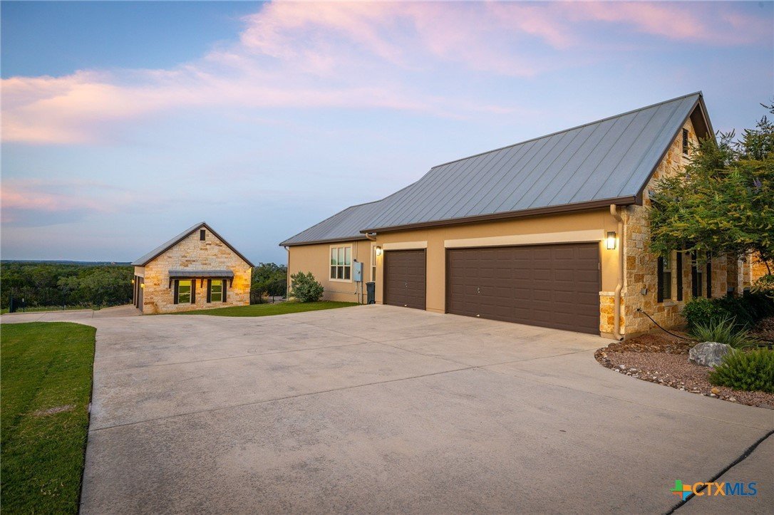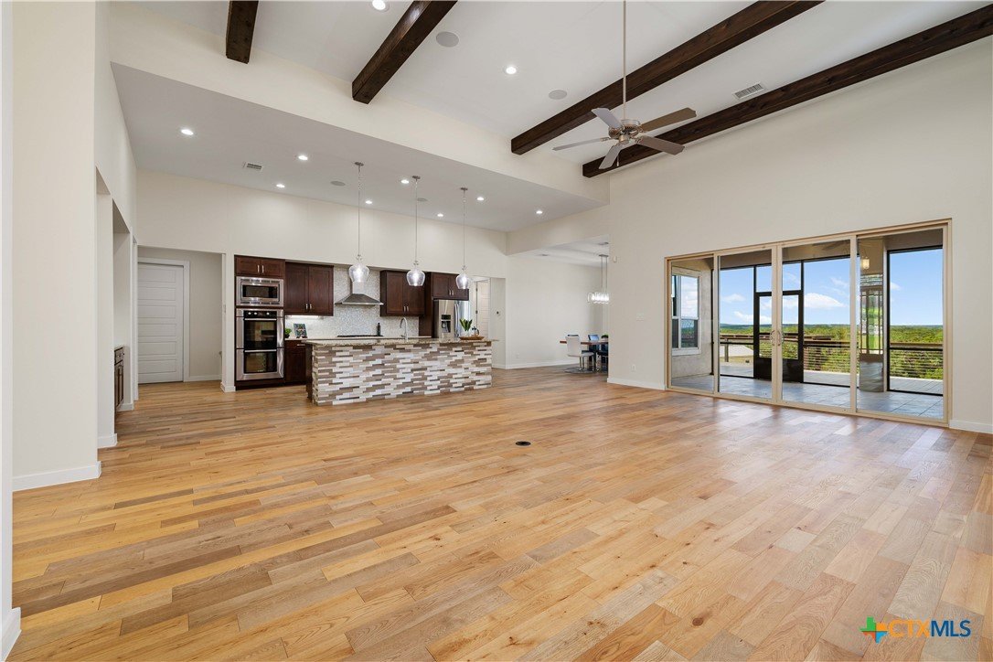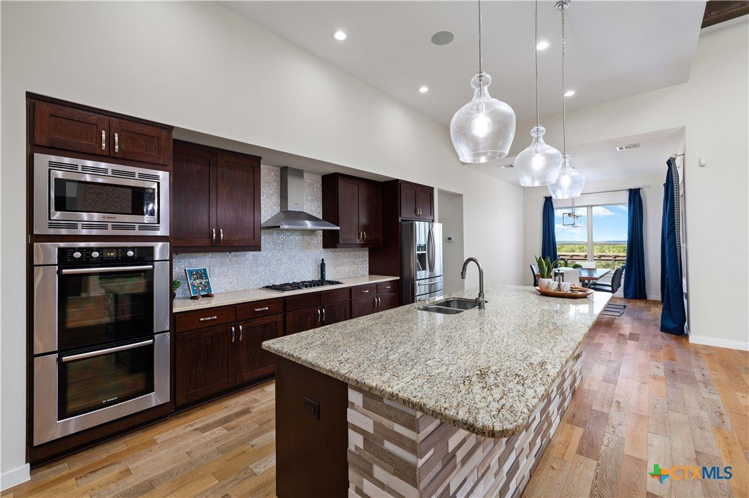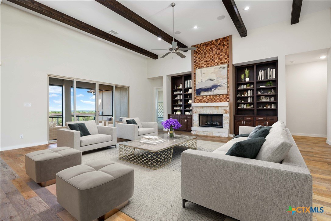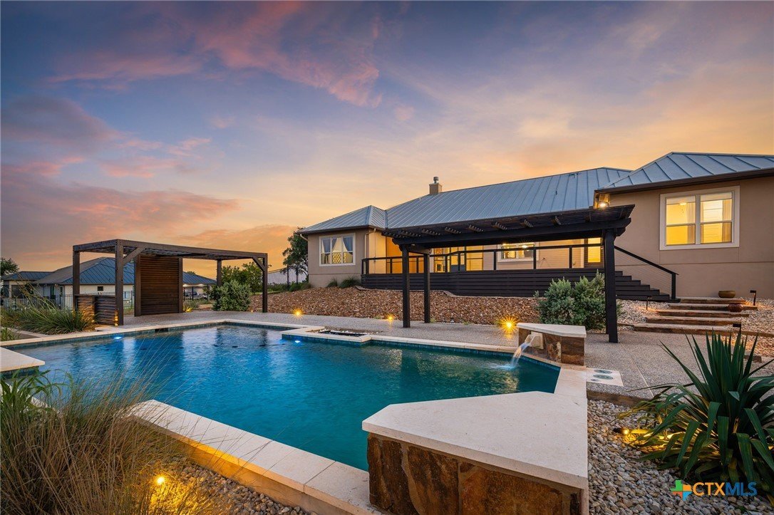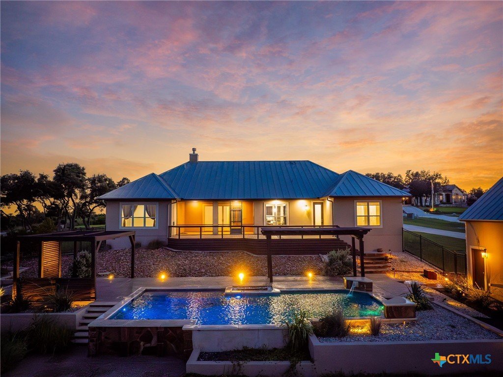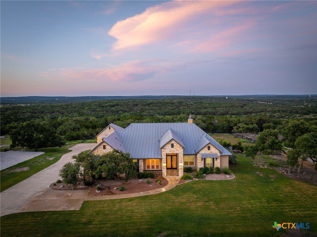 Discover unparalleled luxury in the exclusive Ramble Ridge community on 1.3 acres. This exquisite 4-bedroom, 4-bathroom home epitomizes sophistication, offering a meticulously designed layout perfect for modern living. The gourmet kitchen features an island with granite countertops, double ovens, a butler's pantry, a walk-in pantry, and Bosch stainless steel appliances. Adjacent is a charming breakfast nook, ideal for casual dining, and a formal dining room for more elaborate gatherings. The open-concept living areas boast high ceilings and a seamless flow; the living room, complete with built-in shelves and a floor-to-ceiling brick fireplace, overlooks the backyard oasis. The master bedroom features expansive windows with breathtaking Hill Country views, and the en-suite bath boasts his and hers closets, double vanities, a garden tub, and a double-headed walk-in shower. Each additional bedroom offers ultimate privacy and comfort, with its own en-suite bath. Outside, enjoy a private paradise with a stunning Keith Zars pool, an expansive deck, and a covered pergola. A screened-in patio allows year-round enjoyment of the outdoors. The home also features a dedicated media room, a well-appointed office, a large laundry room, and a mud area. With garages accommodating up to 5 vehicles, this property is designed for convenience and relaxation. Ideally situated between San Antonio and New Braunfels, with Austin just an hour away, this location offers a serene retreat with city access. Embrace luxurious living in this stunning residence!