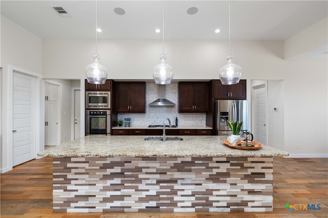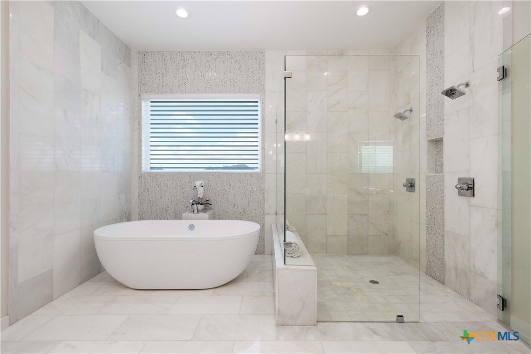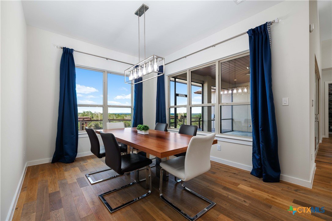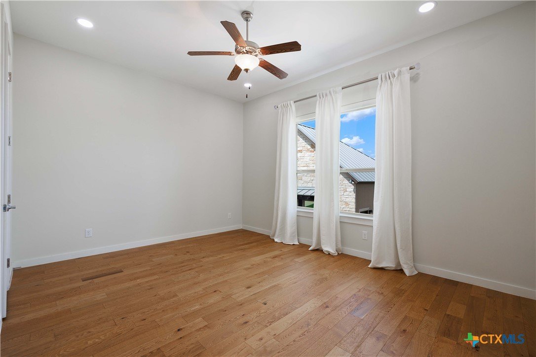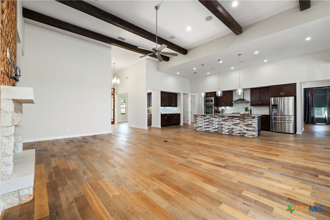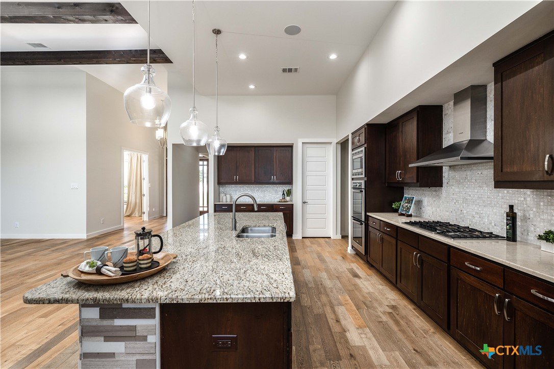 Discover unparalleled luxury in the exclusive Ramble Ridge community on 1.3 acres. This exquisite 4-bedroom, 4-bathroom home epitomizes sophistication, offering a meticulously designed layout perfect for modern living. The gourmet kitchen features an island with granite countertops, double ovens, a butler's pantry, a walk-in pantry, and Bosch stainless steel appliances. Adjacent is a charming breakfast nook, ideal for casual dining, and a formal dining room for more elaborate gatherings. The open-concept living areas boast high ceilings and a seamless flow; the living room, complete with built-in shelves and a floor-to-ceiling brick fireplace, overlooks the backyard oasis. The master bedroom features expansive windows with breathtaking Hill Country views, and the en-suite bath boasts his and hers closets, double vanities, a garden tub, and a double-headed walk-in shower. Each additional bedroom offers ultimate privacy and comfort, with its own en-suite bath. Outside, enjoy a private paradise with a stunning Keith Zars pool, an expansive deck, and a covered pergola. A screened-in patio allows year-round enjoyment of the outdoors. The home also features a dedicated media room, a well-appointed office, a large laundry room, and a mud area. With garages accommodating up to 5 vehicles, this property is designed for convenience and relaxation. Ideally situated between San Antonio and New Braunfels, with Austin just an hour away, this location offers a serene retreat with city access. Embrace luxurious living in this stunning residence!