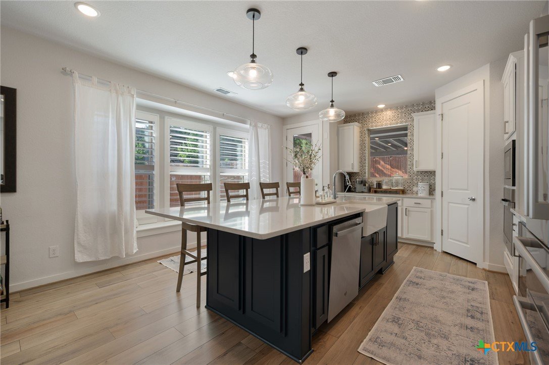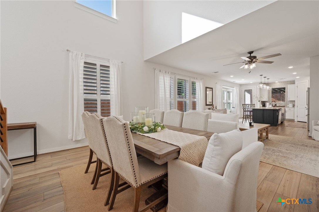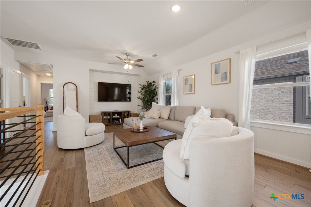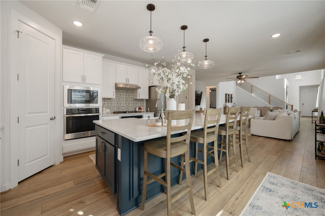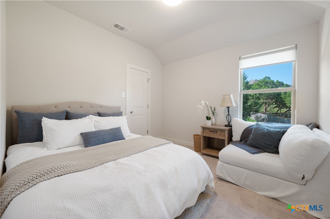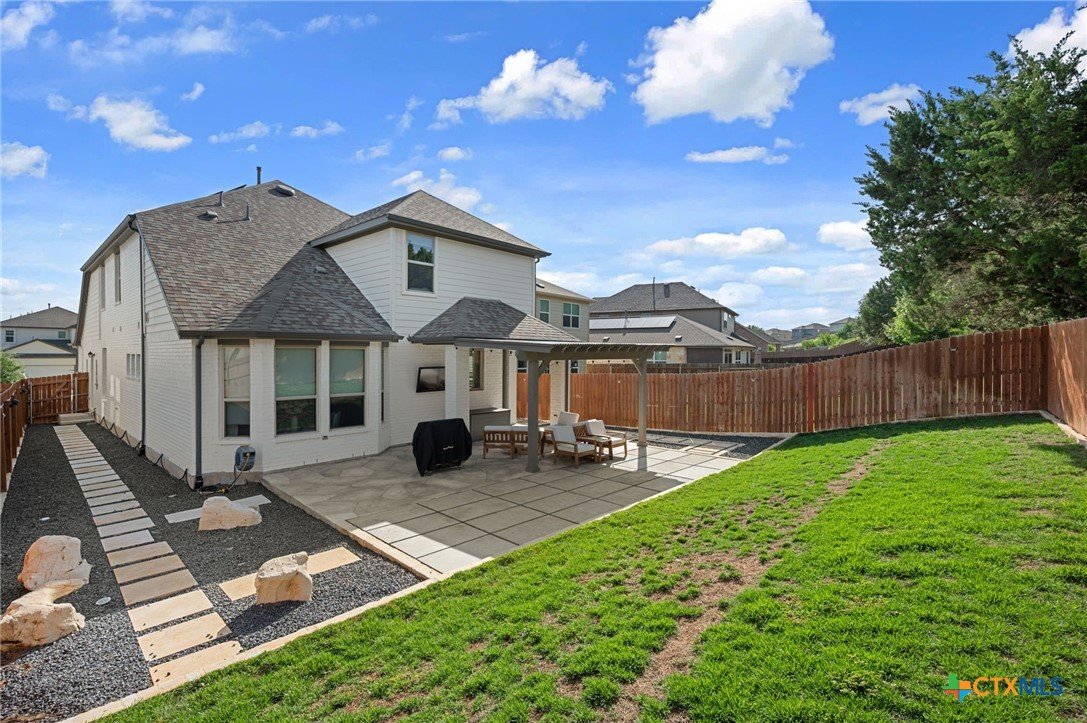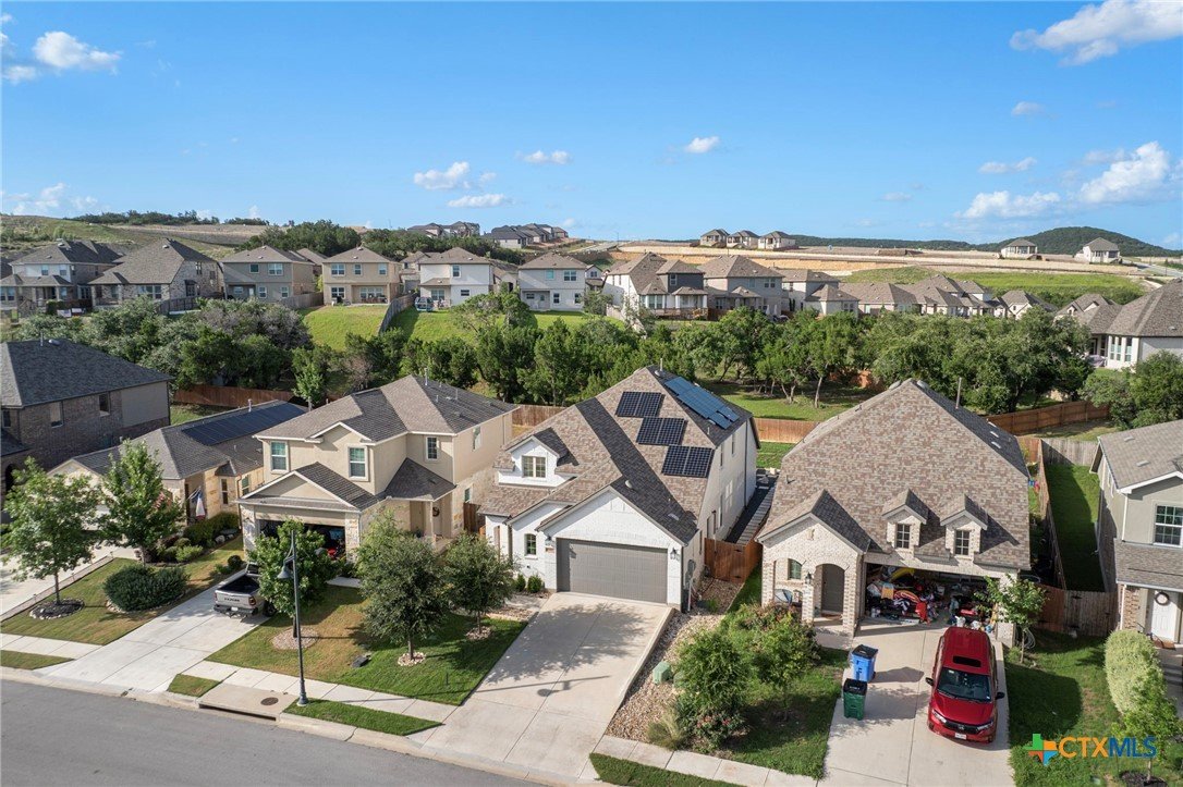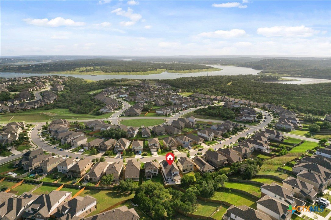 Welcome to this beautifully upgraded 5-bedroom, 3-bathroom home located in the scenic community of Lakeside at Tessera in Lago Vista, TX. Situated on a quiet street with friendly neighbors, this spacious two-story home offers the perfect blend of comfort, functionality, and style. From the moment you enter, you’ll be welcomed by soaring ceilings, abundant natural light, and an open-concept layout designed for modern living. The heart of the home is a gourmet kitchen featuring granite countertops, propane gas cooking, a large center island with breakfast bar—perfect for hosting—plus a walk-in pantry, stylish backsplash, and custom shutter blinds that complement the living and dining areas. The kitchen flows effortlessly into the main living room and dining space, creating an ideal environment for entertaining or enjoying quality time with family. The main floor includes a spacious primary suite with a custom accent wall and upgraded closet storage for enhanced organization, along with a versatile secondary bedroom and full bath—great for guests, a home office, or those who prefer single-level living. Upstairs, you’ll find three additional bedrooms, a third full bath, and a large second living area or loft, also accented with custom wall detail. This flexible layout is perfect for multigenerational living or offering privacy to visiting guests. Make your way outside to enjoy a large covered patio with an extended pergola. The roomy backyard offers plenty of space for gardening, or a playset. Additional upgrades include solar panels for energy efficiency, custom garage flooring, and custom shutter blinds. A side door provides easy access from the garage to the back yard. Enjoy nearby community amenities including trails, a pool, and private lake access, all while being minutes from grocery stores, restaurants, schools, a gym, and more.
