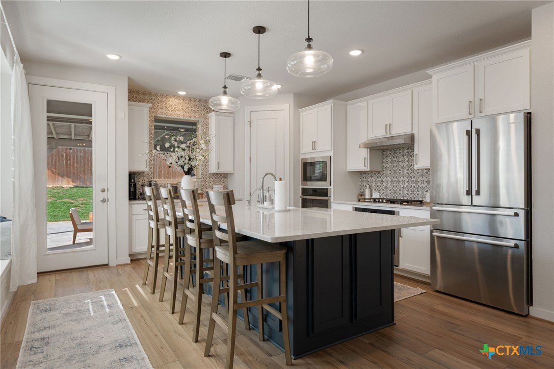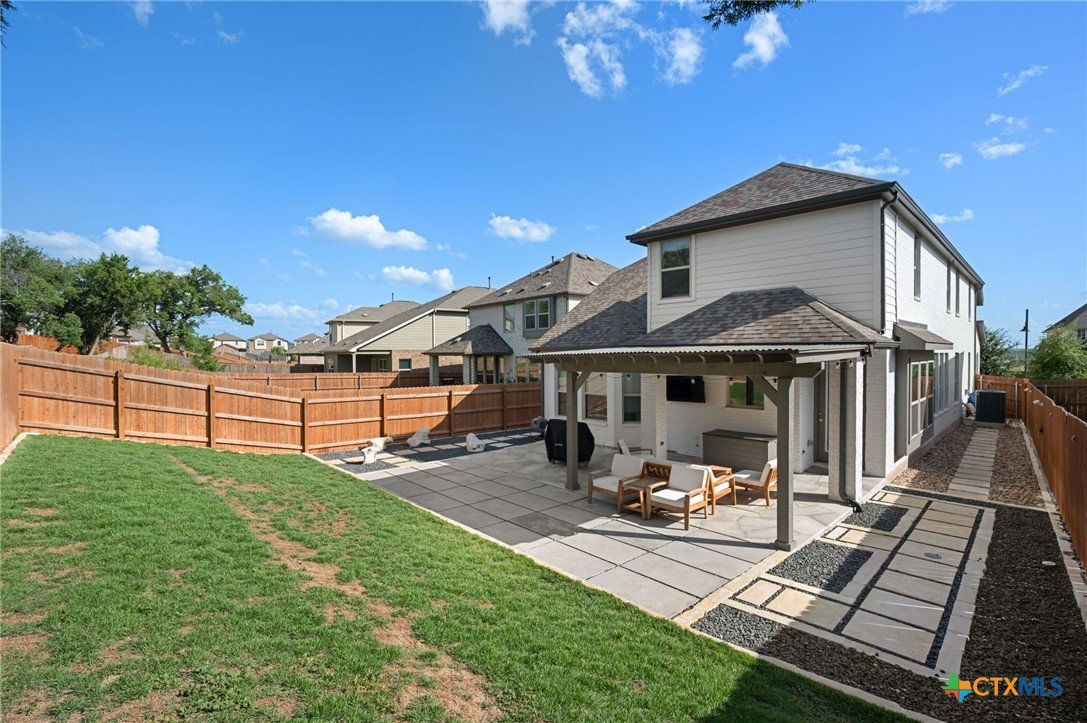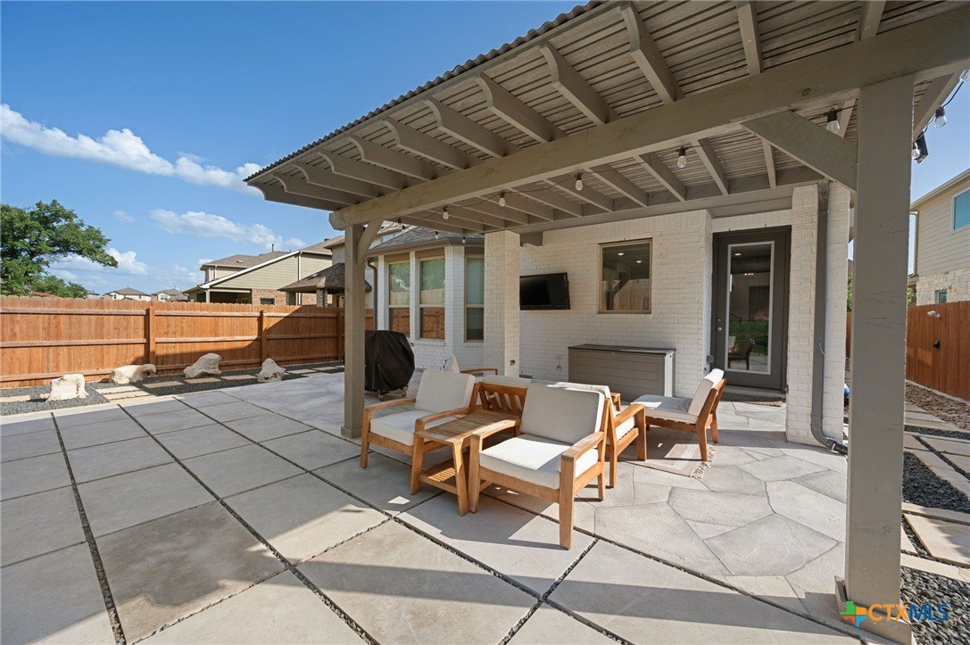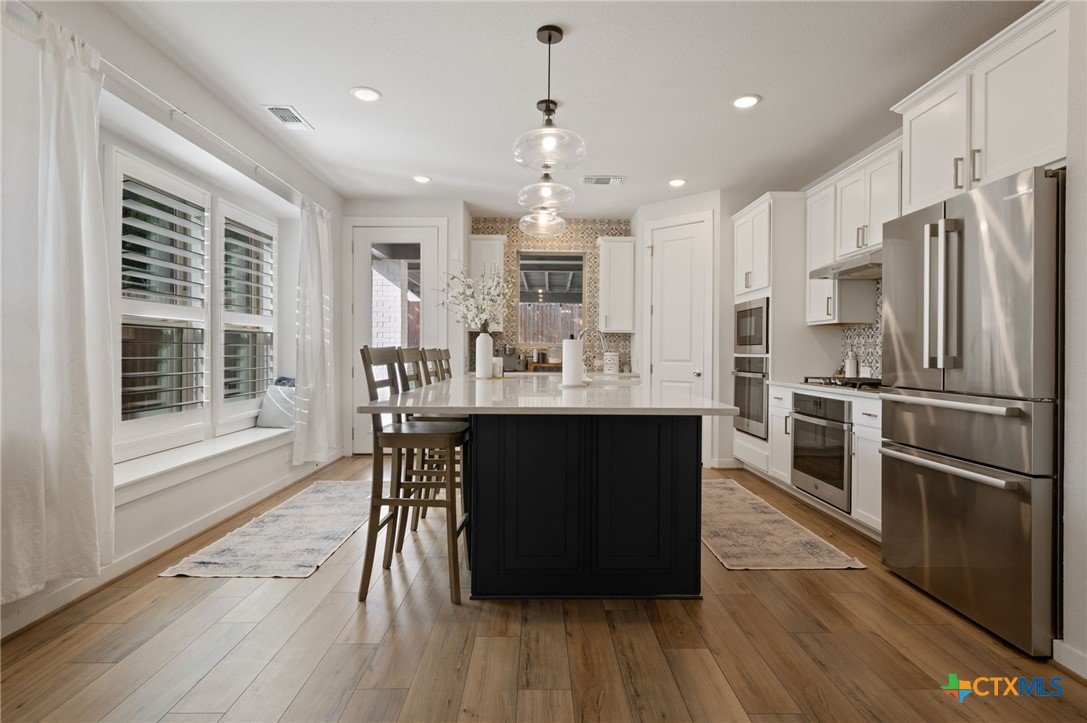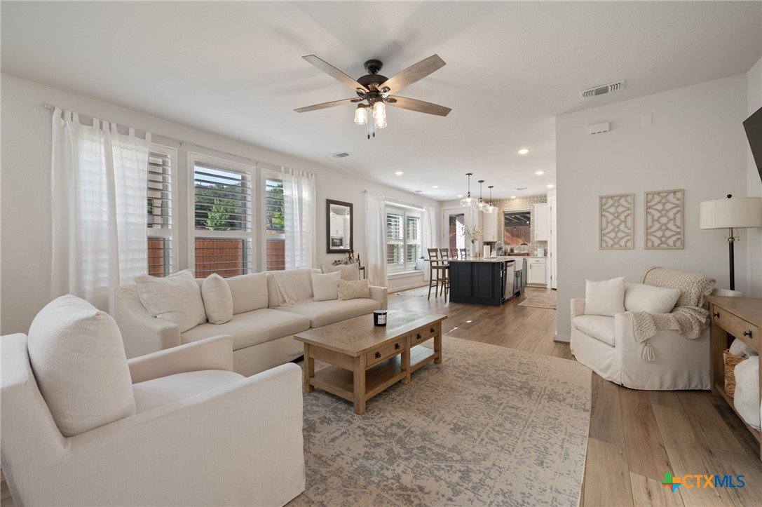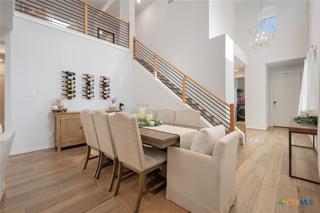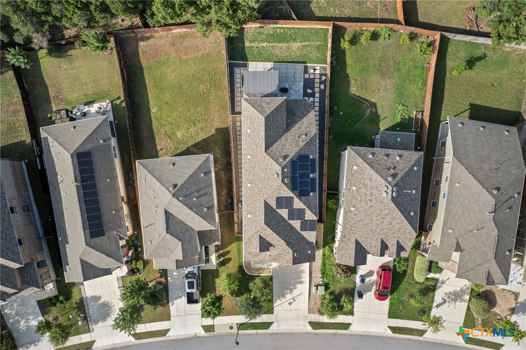 Welcome to this beautifully upgraded 5-bedroom, 3-bathroom home located in the scenic community of Lakeside at Tessera in Lago Vista, TX. Situated on a quiet street with friendly neighbors, this spacious two-story home offers the perfect blend of comfort, functionality, and style. From the moment you enter, you’ll be welcomed by soaring ceilings, abundant natural light, and an open-concept layout designed for modern living. The heart of the home is a gourmet kitchen featuring granite countertops, propane gas cooking, a large center island with breakfast bar—perfect for hosting—plus a walk-in pantry, stylish backsplash, and custom shutter blinds that complement the living and dining areas. The kitchen flows effortlessly into the main living room and dining space, creating an ideal environment for entertaining or enjoying quality time with family. The main floor includes a spacious primary suite with a custom accent wall and upgraded closet storage for enhanced organization, along with a versatile secondary bedroom and full bath—great for guests, a home office, or those who prefer single-level living. Upstairs, you’ll find three additional bedrooms, a third full bath, and a large second living area or loft, also accented with custom wall detail. This flexible layout is perfect for multigenerational living or offering privacy to visiting guests. Make your way outside to enjoy a large covered patio with an extended pergola. The roomy backyard offers plenty of space for gardening, or a playset. Additional upgrades include solar panels for energy efficiency, custom garage flooring, and custom shutter blinds. A side door provides easy access from the garage to the back yard. Enjoy nearby community amenities including trails, a pool, and private lake access, all while being minutes from grocery stores, restaurants, schools, a gym, and more.