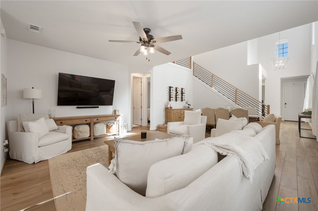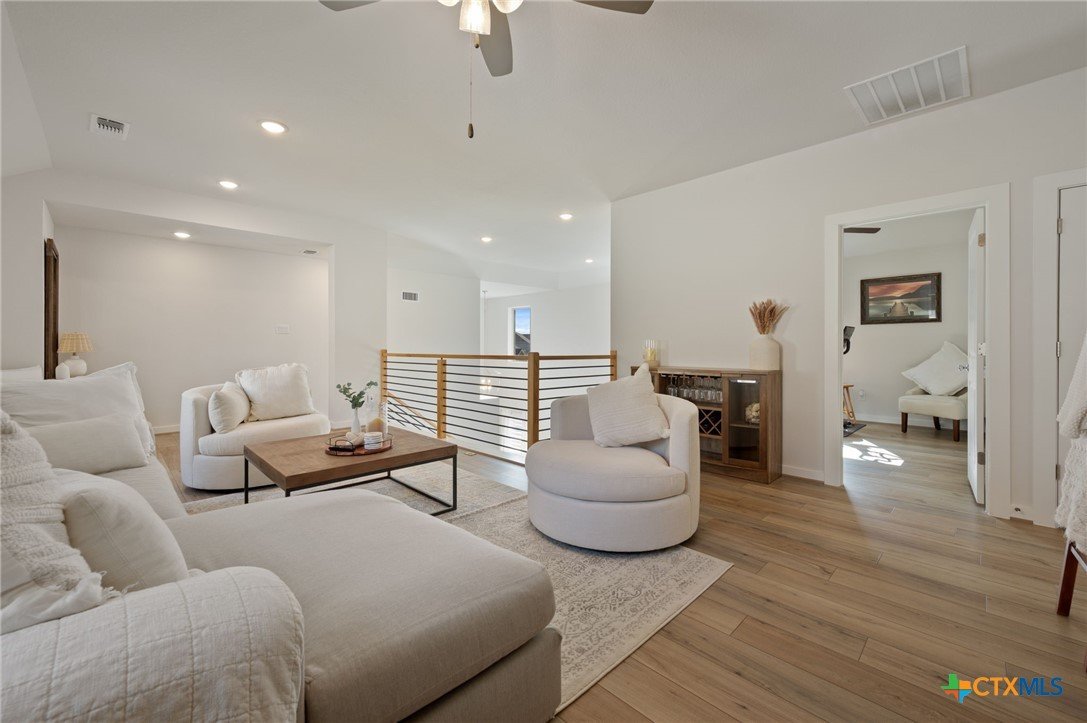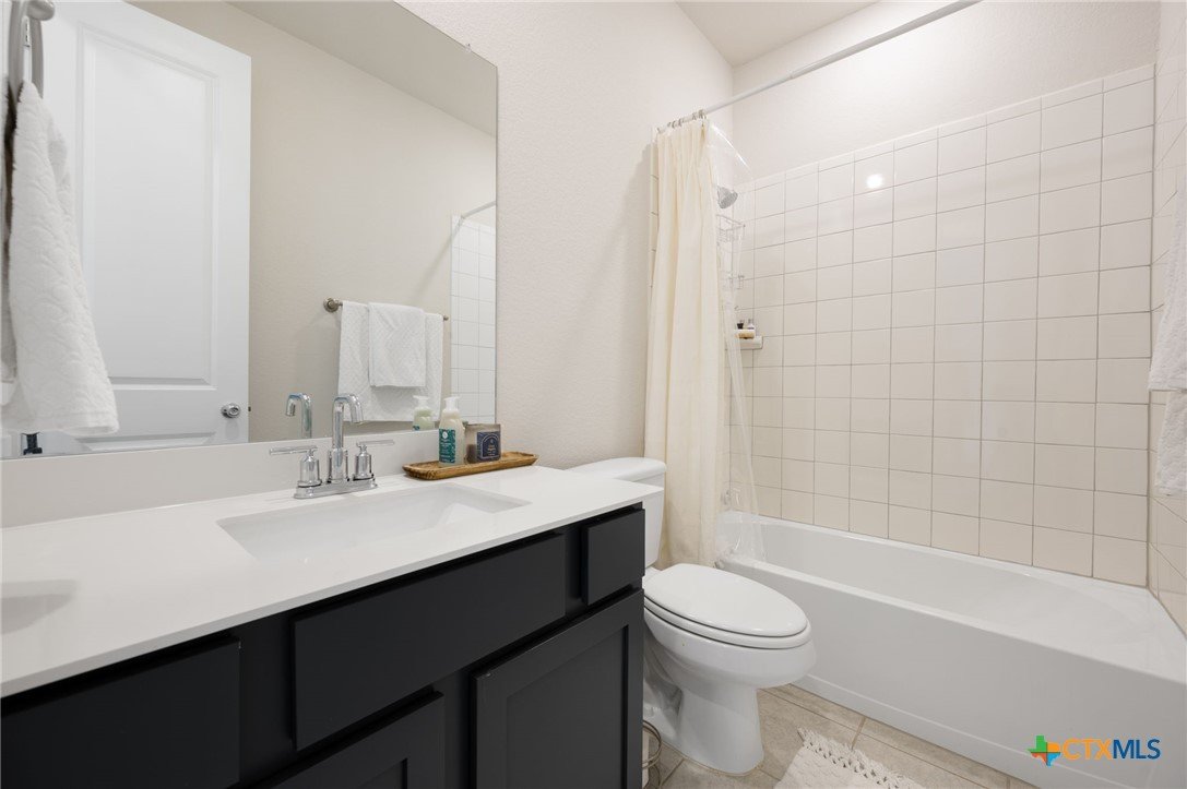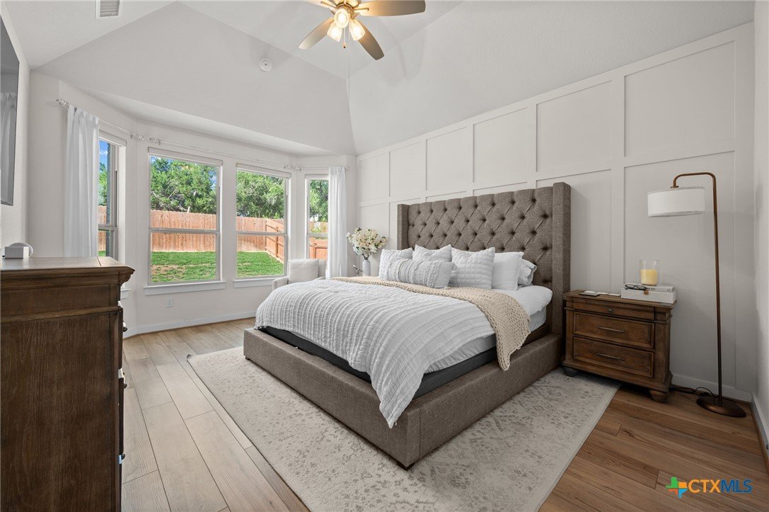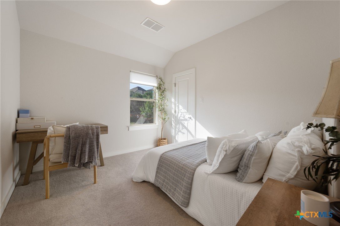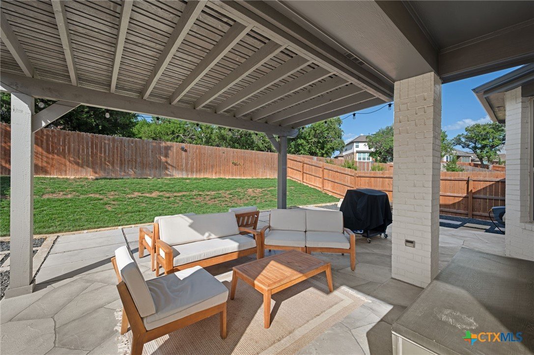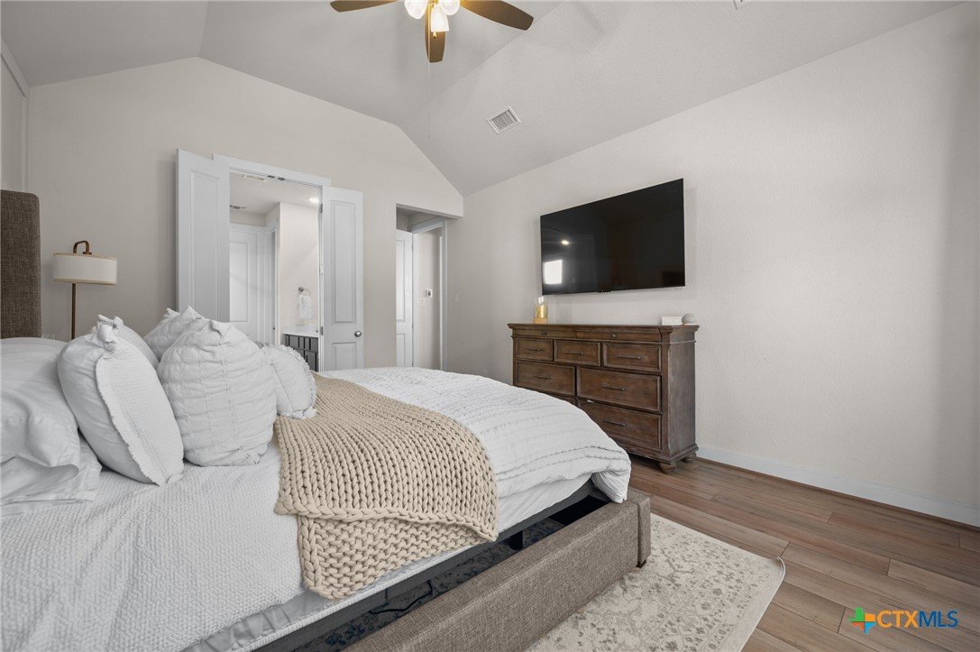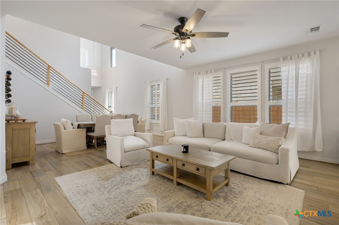 Welcome to this beautifully upgraded 5-bedroom, 3-bathroom home located in the scenic community of Lakeside at Tessera in Lago Vista, TX. Situated on a quiet street with friendly neighbors, this spacious two-story home offers the perfect blend of comfort, functionality, and style. From the moment you enter, you’ll be welcomed by soaring ceilings, abundant natural light, and an open-concept layout designed for modern living. The heart of the home is a gourmet kitchen featuring granite countertops, propane gas cooking, a large center island with breakfast bar—perfect for hosting—plus a walk-in pantry, stylish backsplash, and custom shutter blinds that complement the living and dining areas. The kitchen flows effortlessly into the main living room and dining space, creating an ideal environment for entertaining or enjoying quality time with family. The main floor includes a spacious primary suite with a custom accent wall and upgraded closet storage for enhanced organization, along with a versatile secondary bedroom and full bath—great for guests, a home office, or those who prefer single-level living. Upstairs, you’ll find three additional bedrooms, a third full bath, and a large second living area or loft, also accented with custom wall detail. This flexible layout is perfect for multigenerational living or offering privacy to visiting guests. Make your way outside to enjoy a large covered patio with an extended pergola. The roomy backyard offers plenty of space for gardening, or a playset. Additional upgrades include solar panels for energy efficiency, custom garage flooring, and custom shutter blinds. A side door provides easy access from the garage to the back yard. Enjoy nearby community amenities including trails, a pool, and private lake access, all while being minutes from grocery stores, restaurants, schools, a gym, and more.
