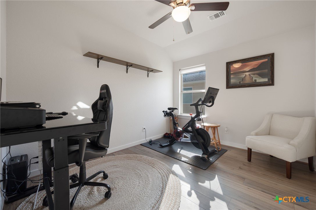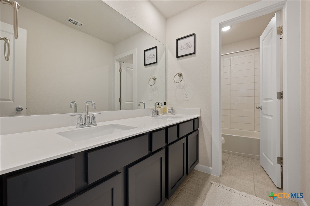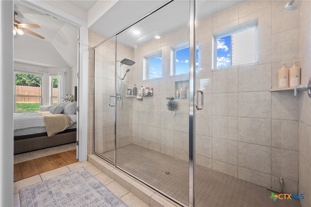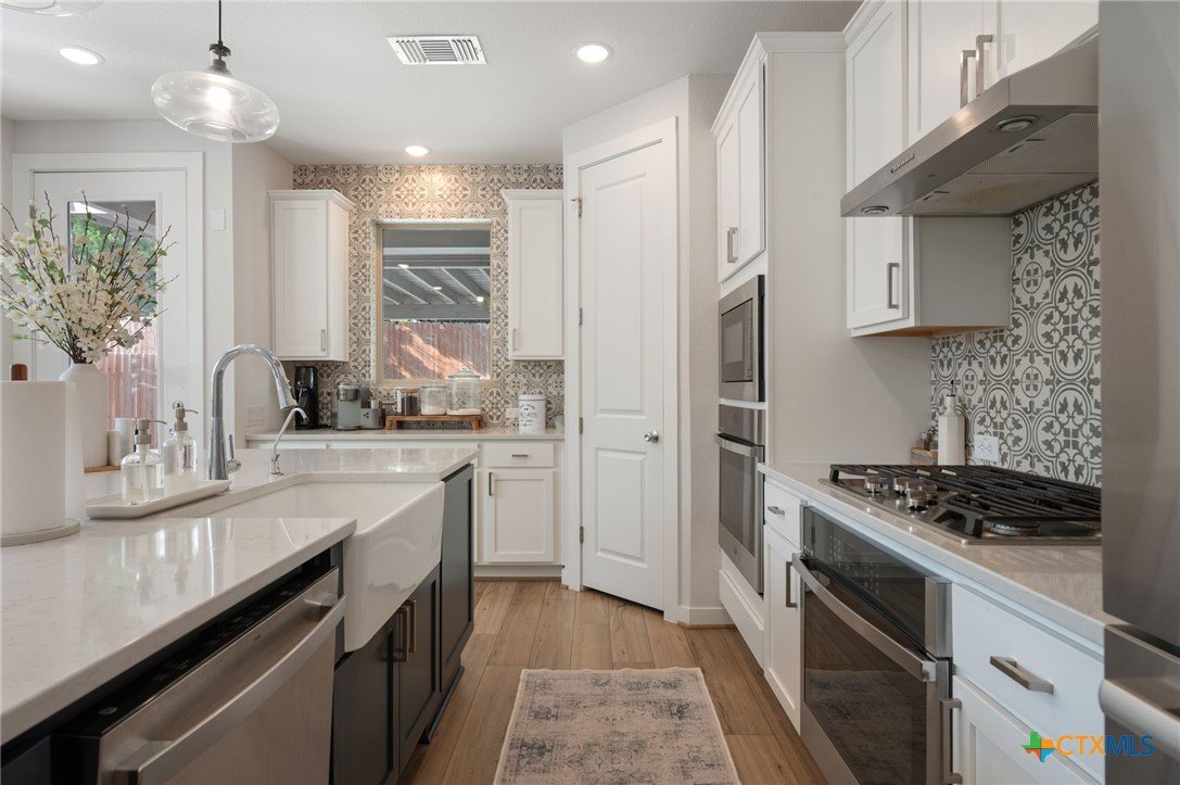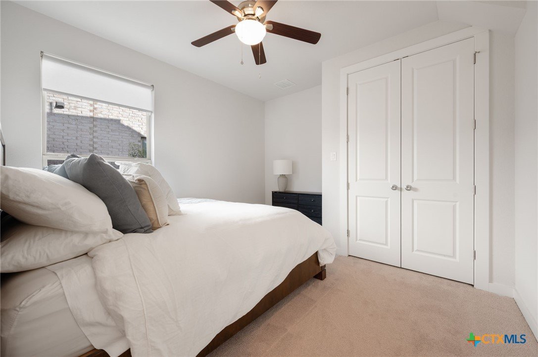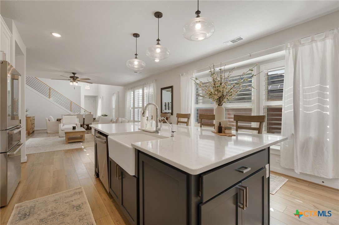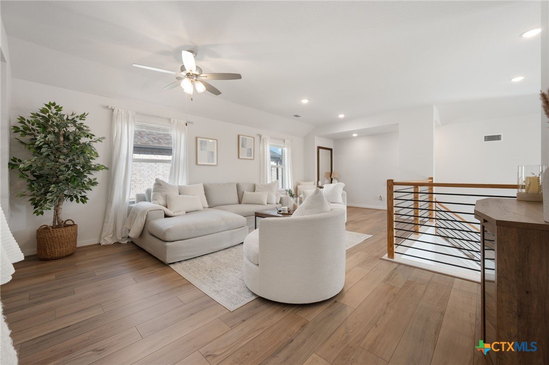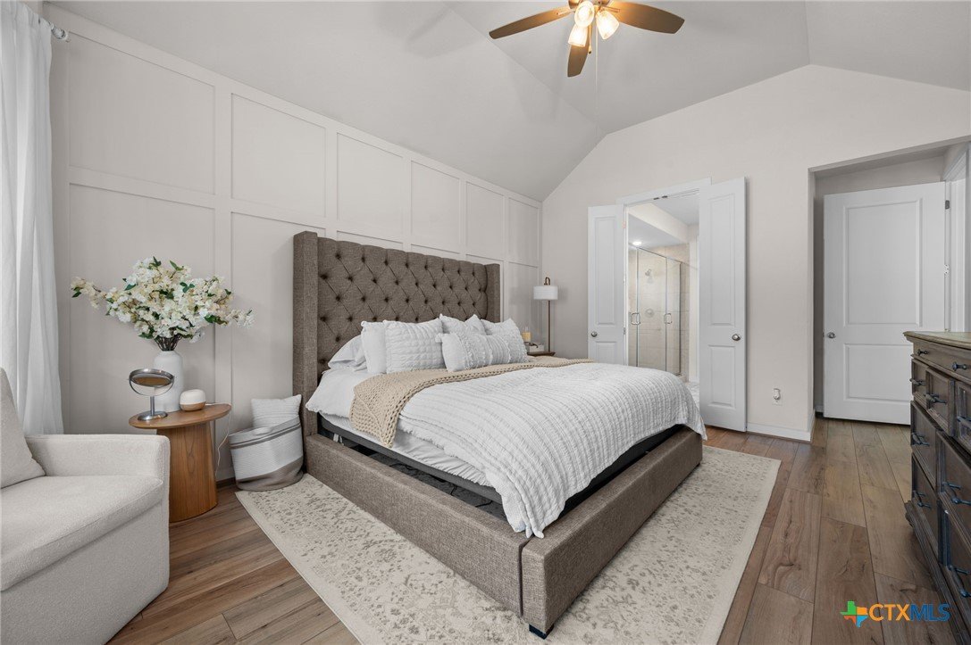 Welcome to this beautifully upgraded 5-bedroom, 3-bathroom home located in the scenic community of Lakeside at Tessera in Lago Vista, TX. Situated on a quiet street with friendly neighbors, this spacious two-story home offers the perfect blend of comfort, functionality, and style. From the moment you enter, you’ll be welcomed by soaring ceilings, abundant natural light, and an open-concept layout designed for modern living. The heart of the home is a gourmet kitchen featuring granite countertops, propane gas cooking, a large center island with breakfast bar—perfect for hosting—plus a walk-in pantry, stylish backsplash, and custom shutter blinds that complement the living and dining areas. The kitchen flows effortlessly into the main living room and dining space, creating an ideal environment for entertaining or enjoying quality time with family. The main floor includes a spacious primary suite with a custom accent wall and upgraded closet storage for enhanced organization, along with a versatile secondary bedroom and full bath—great for guests, a home office, or those who prefer single-level living. Upstairs, you’ll find three additional bedrooms, a third full bath, and a large second living area or loft, also accented with custom wall detail. This flexible layout is perfect for multigenerational living or offering privacy to visiting guests. Make your way outside to enjoy a large covered patio with an extended pergola. The roomy backyard offers plenty of space for gardening, or a playset. Additional upgrades include solar panels for energy efficiency, custom garage flooring, and custom shutter blinds. A side door provides easy access from the garage to the back yard. Enjoy nearby community amenities including trails, a pool, and private lake access, all while being minutes from grocery stores, restaurants, schools, a gym, and more.