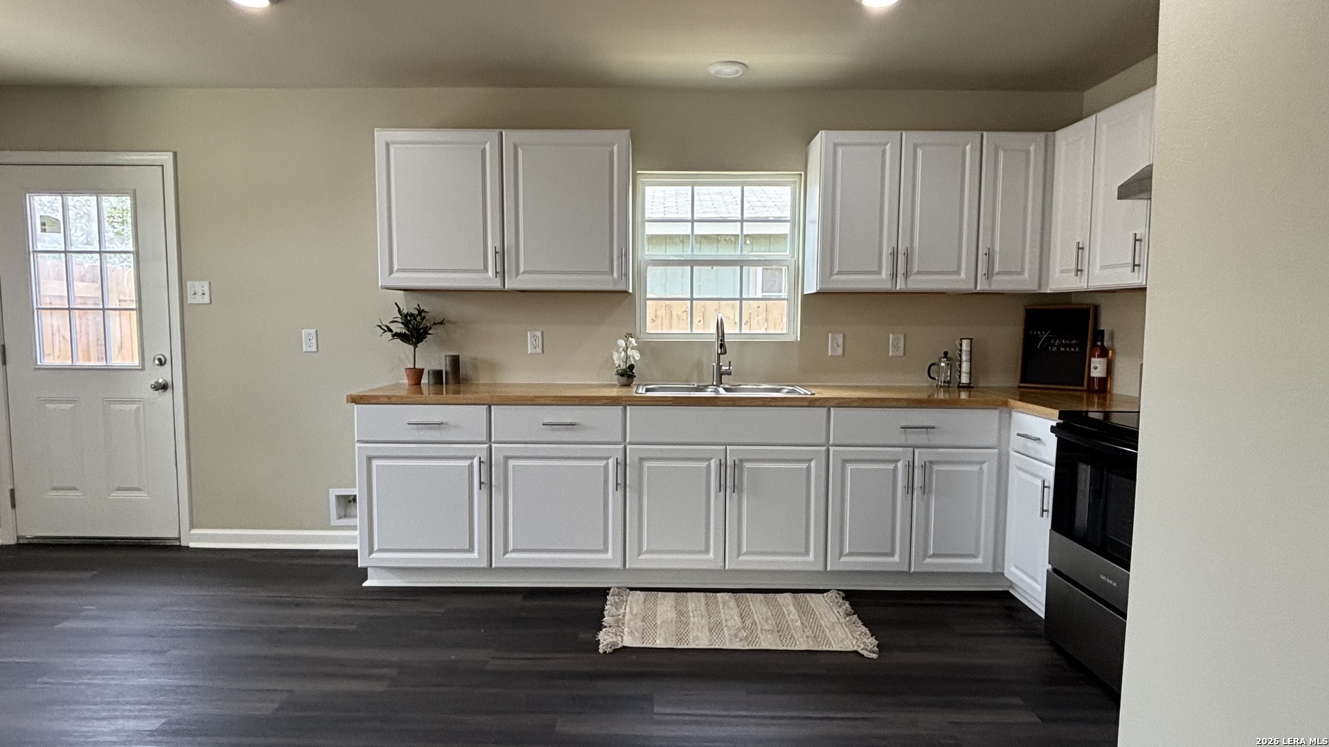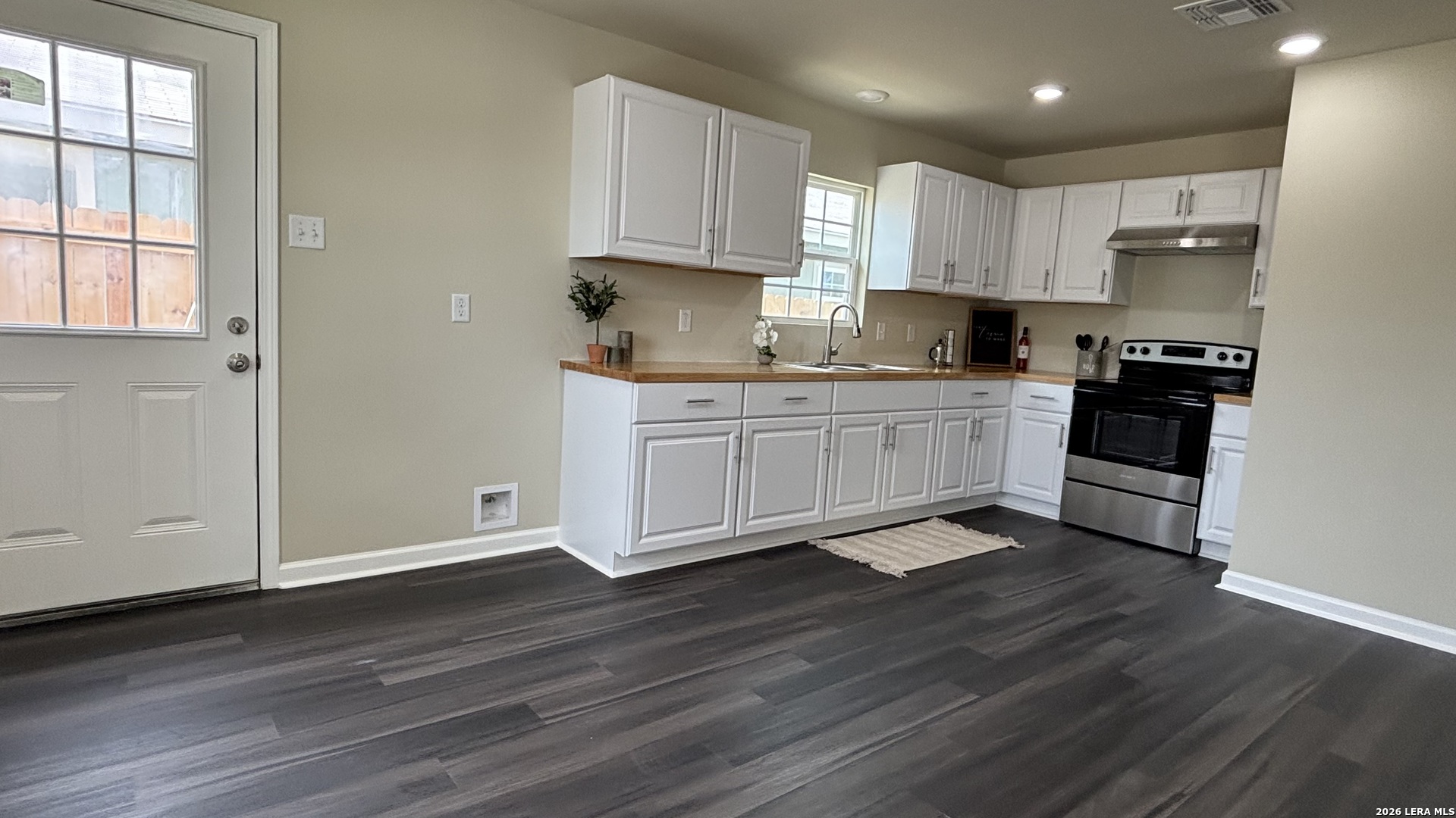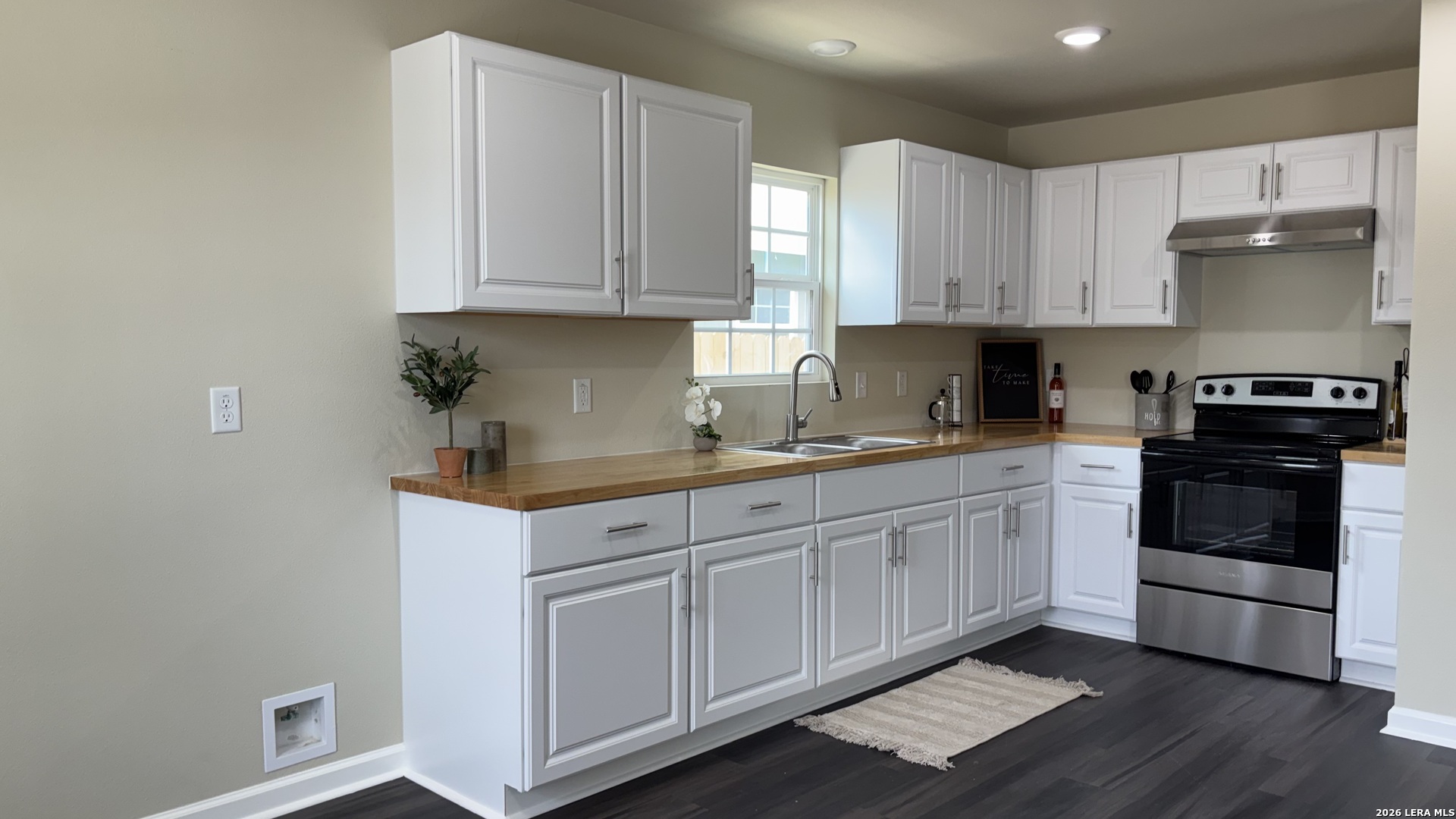 Brand new and move in ready, this three bedroom two bathroom home offers a functional layout with modern finishes throughout. Built on a slab foundation, the home features an open living, dining, and kitchen area that creates a comfortable and connected space for daily living. The kitchen stands out with crisp white cabinets, butcher block countertops, a new range, and a door leading to the exterior. A dedicated laundry space is designed for a stackable washer and dryer for added convenience. Durable wood look flooring runs throughout the home for easy maintenance. The primary bedroom includes a private bath with a tub/shower combo, butcher block counter, and vessel sink. Two additional bedrooms share a hall bathroom with a tile shower. Outside, you'll find a privacy fenced backyard, perfect for relaxing or entertaining.