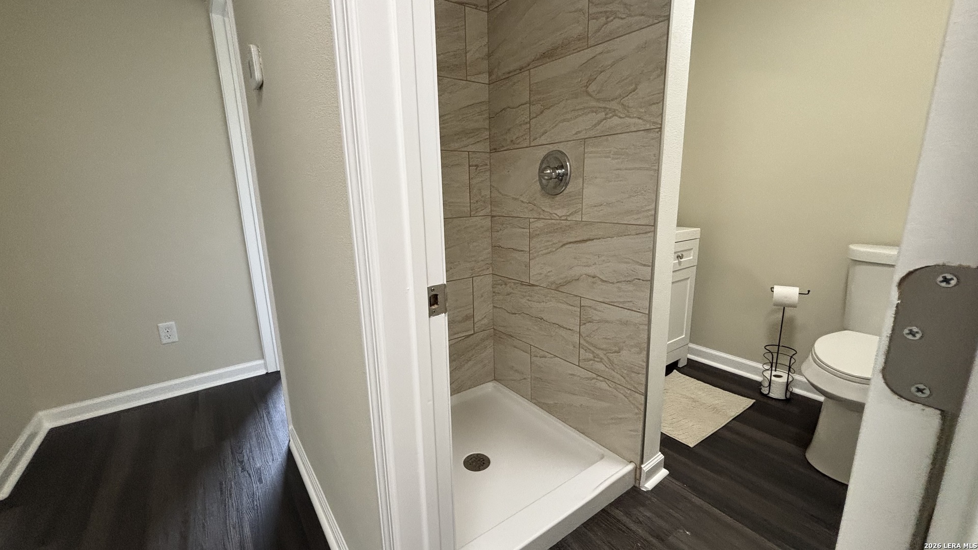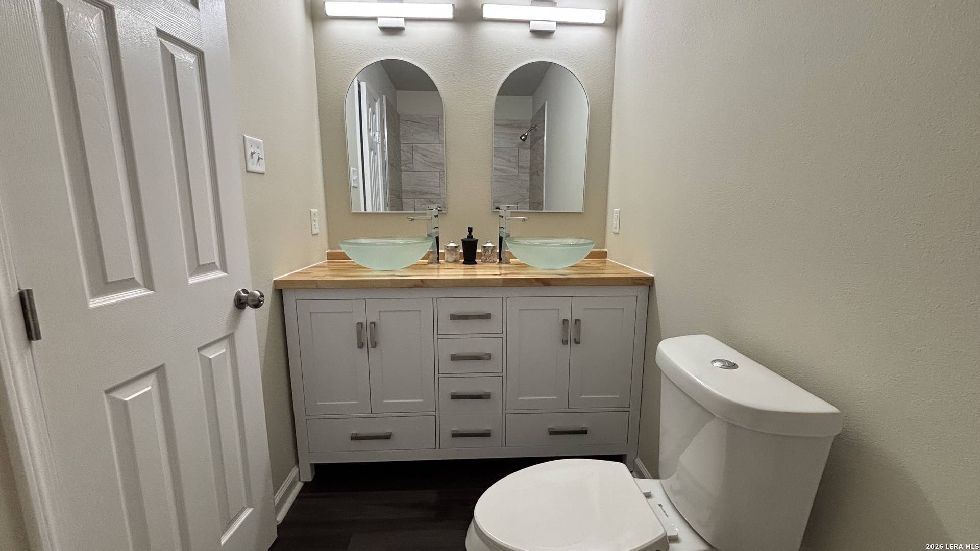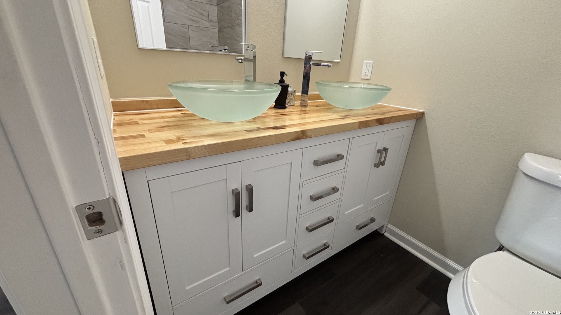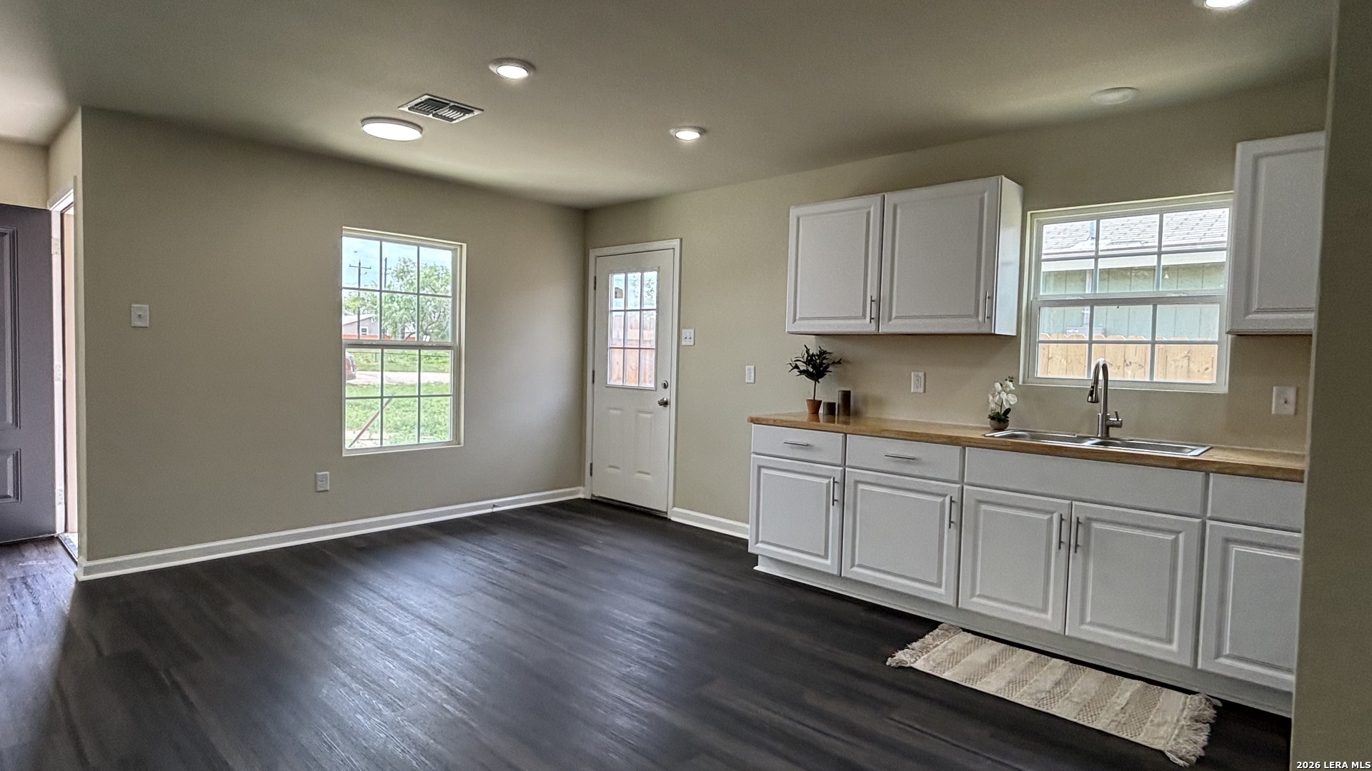 Brand new and move in ready, this three bedroom two bathroom home offers a functional layout with modern finishes throughout. Built on a slab foundation, the home features an open living, dining, and kitchen area that creates a comfortable and connected space for daily living. The kitchen stands out with crisp white cabinets, butcher block countertops, a new range, and a door leading to the exterior. A dedicated laundry space is designed for a stackable washer and dryer for added convenience. Durable wood look flooring runs throughout the home for easy maintenance. The primary bedroom includes a private bath with a tub/shower combo, butcher block counter, and vessel sink. Two additional bedrooms share a hall bathroom with a tile shower. Outside, you'll find a privacy fenced backyard, perfect for relaxing or entertaining.