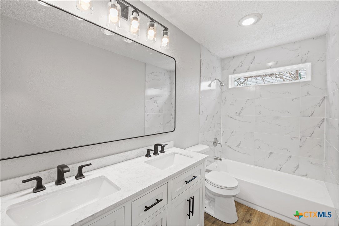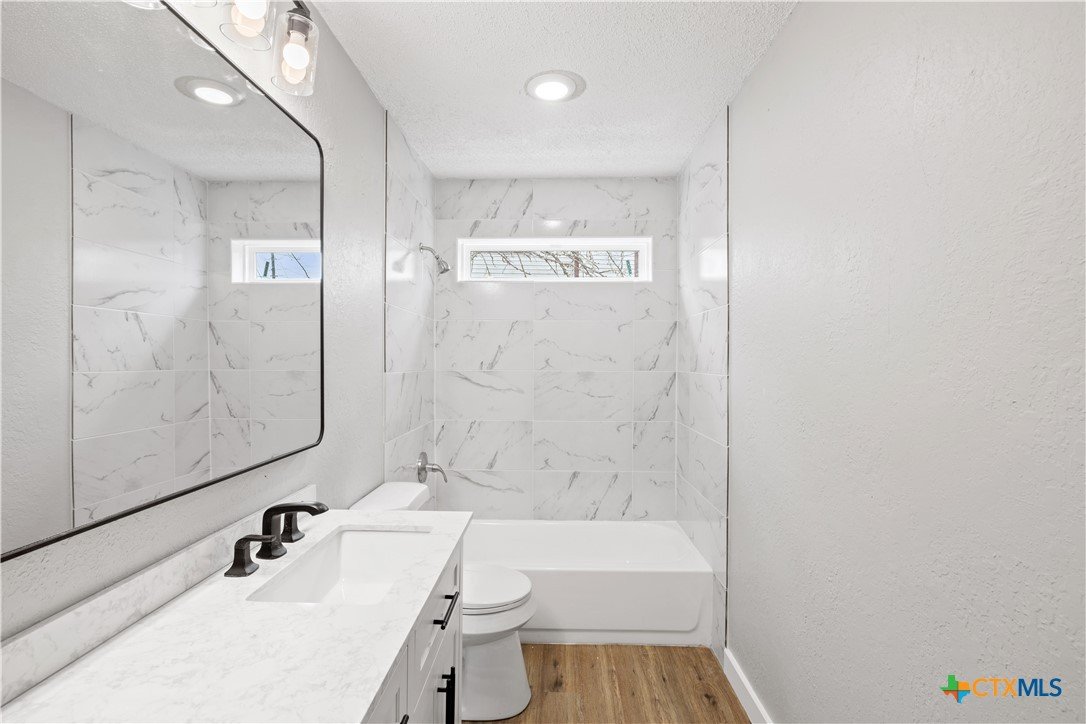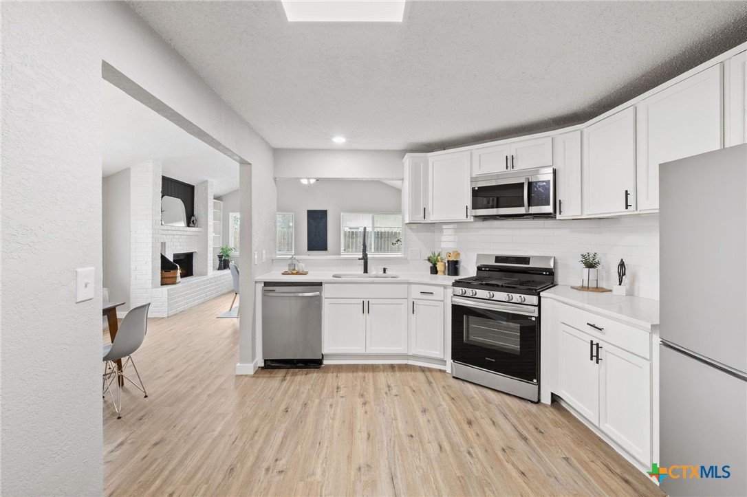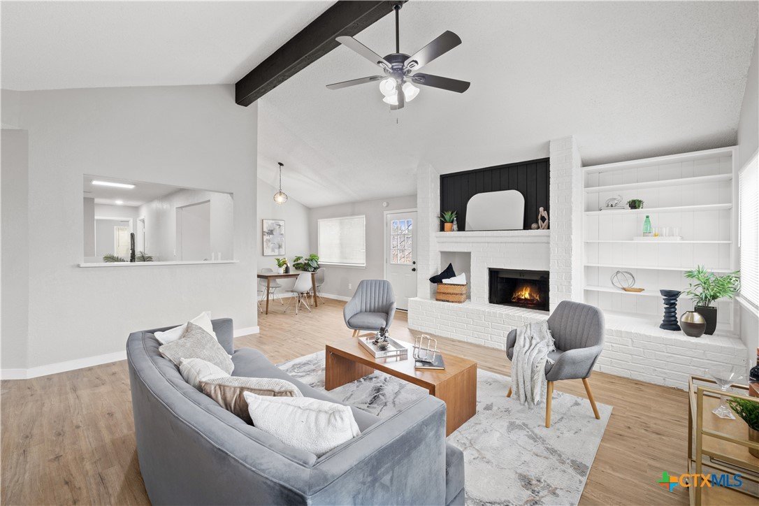 Check out this fully remodeled home boasting a modern floor plan, vaulted ceilings and tons of natural light. Upgrades include luxury vinyl plank flooring, fresh interior paint, all new fixtures, custom kitchen with quartz countertops, and remodeled bathrooms featuring designer tile and vanities. Enjoy a spacious open-concept living and dining area, gorgeous fireplace and open kitchen featuring ample cabinetry. Generous-sized primary suite boasts a luxurious bathroom and a spacious walk-in closet. This serene retreat is separated from the two well-appointed guest bedrooms and shared secondary bathroom. Oversized backyard features a new fence and wood deck offering exceptional privacy and plenty of room to create the outdoor space of your dreams. You’ll love the peaceful, suburban feel while enjoying quick access to I-35, SH-363 and everything Temple has to offer! Last but not least, enjoy the freedom of no HOA. Limited-time promotion: refrigerator, washer, dryer and blinds included with a full price offer (expires 3/31)