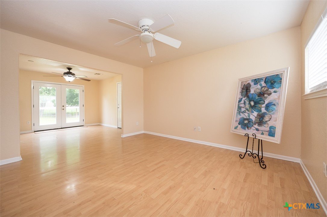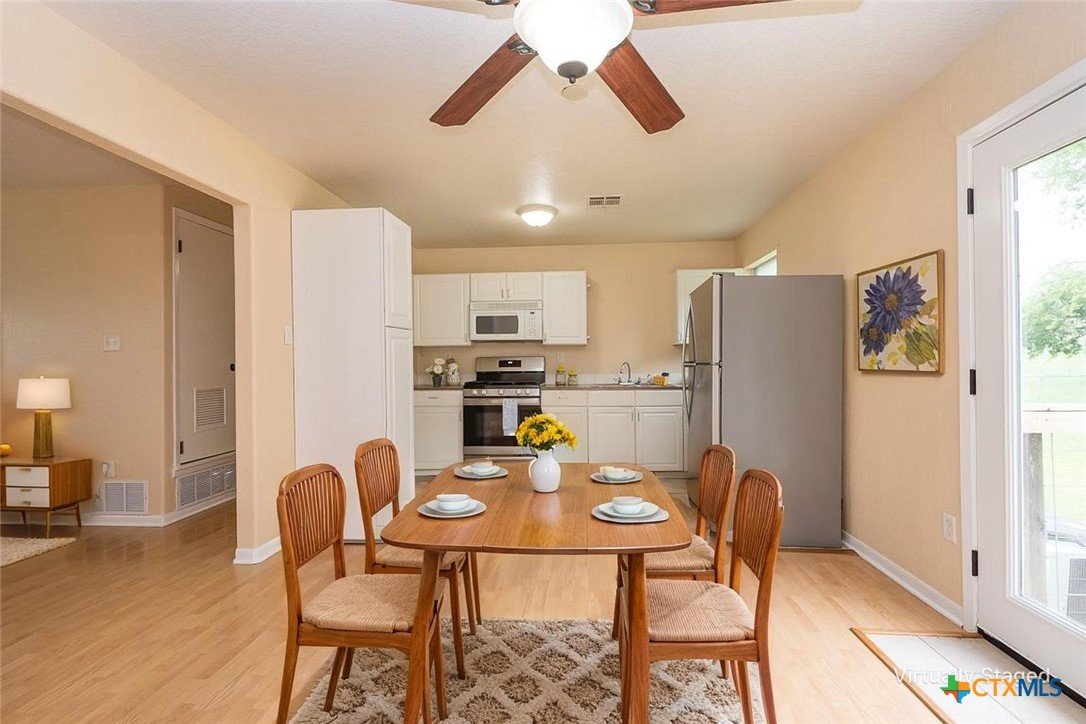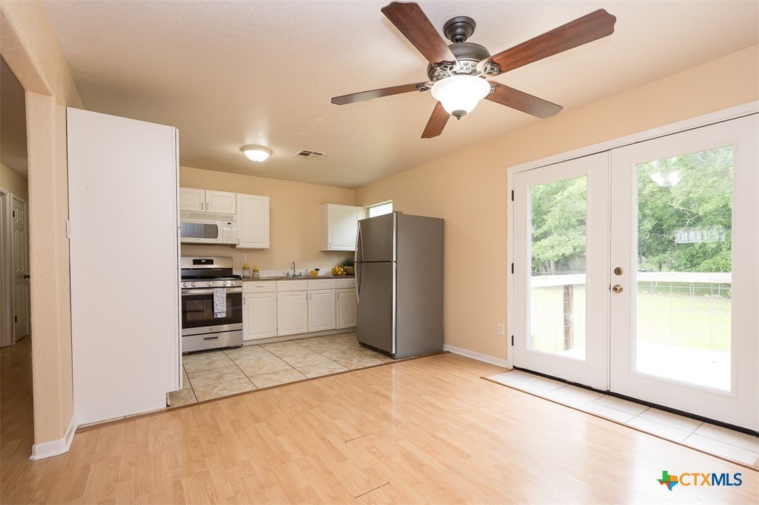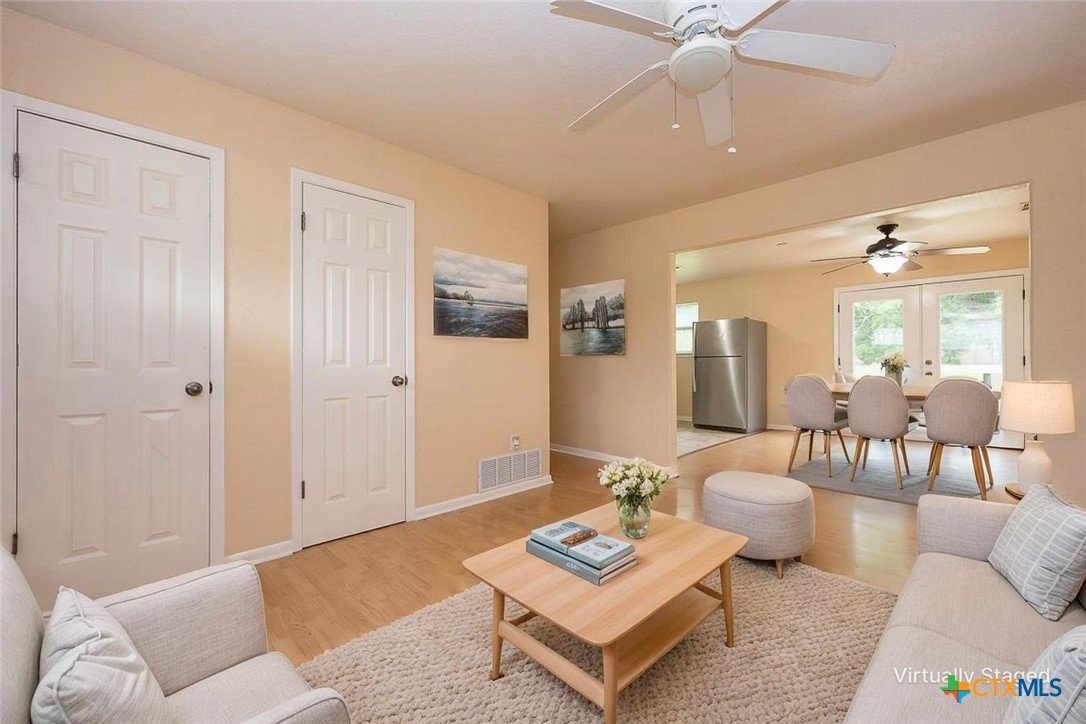 Enjoy a location that makes daily life easier, with schools and local conveniences just minutes away. Inside, the home features a clean, low-maintenance design with no carpet—wood laminate floors run through the living areas and bedrooms, while the kitchen and baths are finished with durable tile. The layout offers a natural flow for both everyday living and entertaining. A spacious dining area connects seamlessly to the kitchen, creating an inviting place to gather. French doors open from the dining space to a deck that overlooks a generous backyard filled with mature trees, providing a peaceful setting for outdoor relaxation, play, or hosting guests. With its practical features, comfortable layout, and inviting outdoor space, this home is ready for its next chapter.