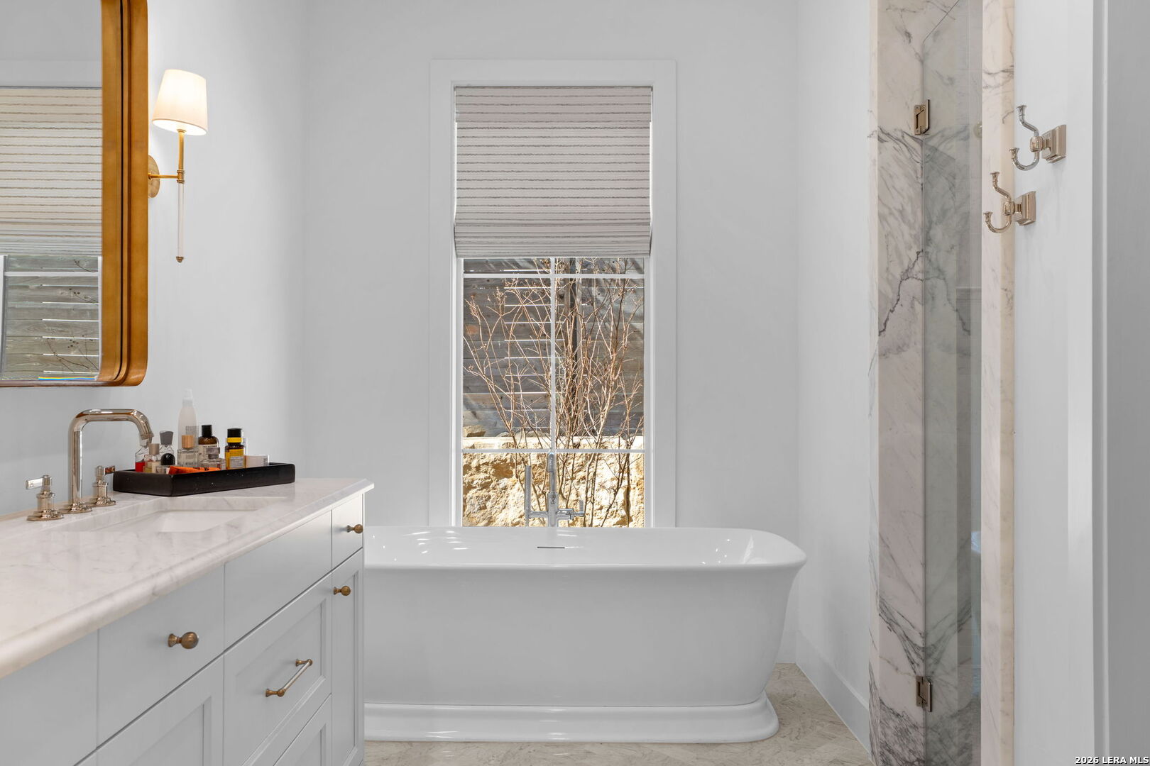 This spectacular new home built in 2025 exudes sophistication inside and out. Its traditional stone and stucco exterior welcomes you into an enchanting interior designed with impeccable taste. This 4 bedroom, 4.5 bath residence has been thoughtfully designed for both elegance and function. The main level features a luxurious primary suite complete with a marble bath, dual vanities, a walk-in shower, a soaking tub, and a generous walk-in closet. Also found on the first floor is a secondary bedroom with a private bath, a dedicated office, and an open-concept living area making this floorplan ideal for both relaxation and productivity. The chef's kitchen is a showstopper, offering a large gathering island, magnificent marble countertops, and a commercial grade Wolf gas range. The kitchen flows seamlessly into the spacious family room, featuring a fireplace plus a wall of built-ins with sink and refrigerator drawers ideal for entertaining. Step outside to the expansive covered porch-perfect for outdoor dining. Plus, there is room to add a pool for even more outdoor enjoyment. Upstairs, you will find two additional bedrooms, each with its own ensuite bath, along with a versatile game/media room. Every detail has been considered to ensure this home meets the highest standards of style, comfort and appeal.