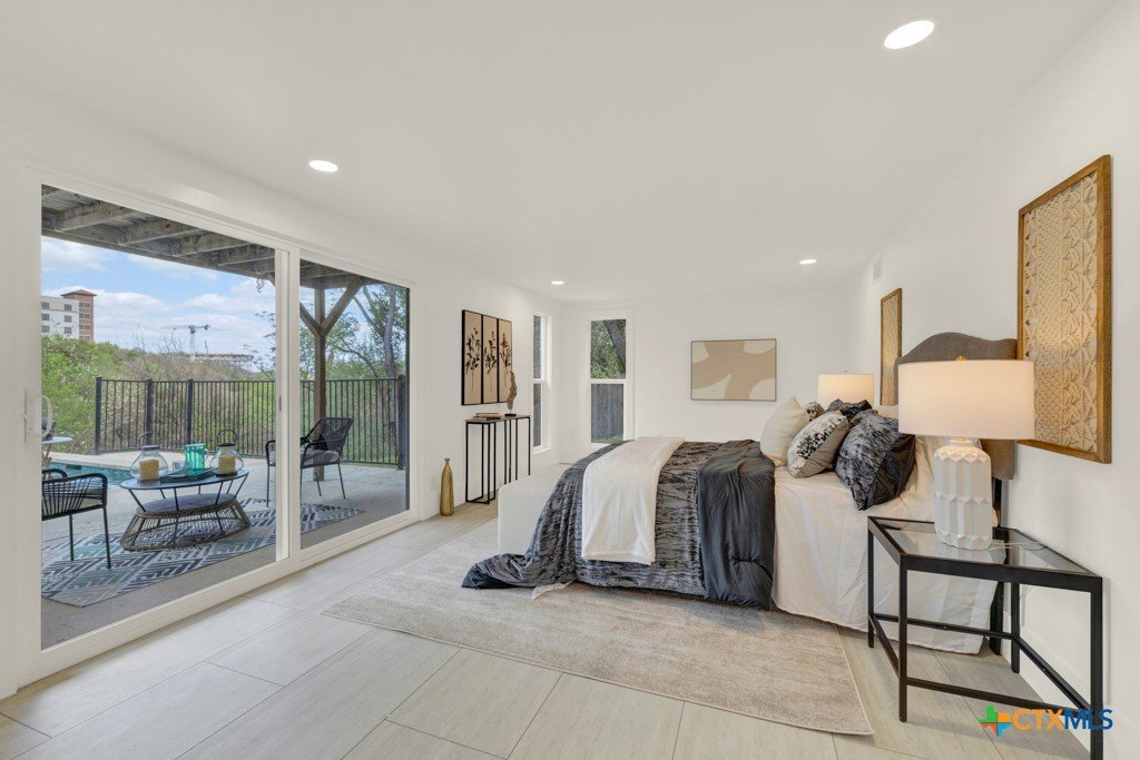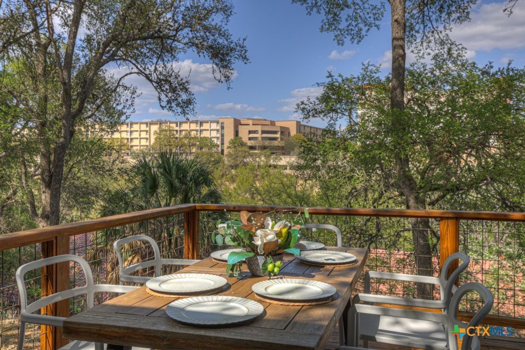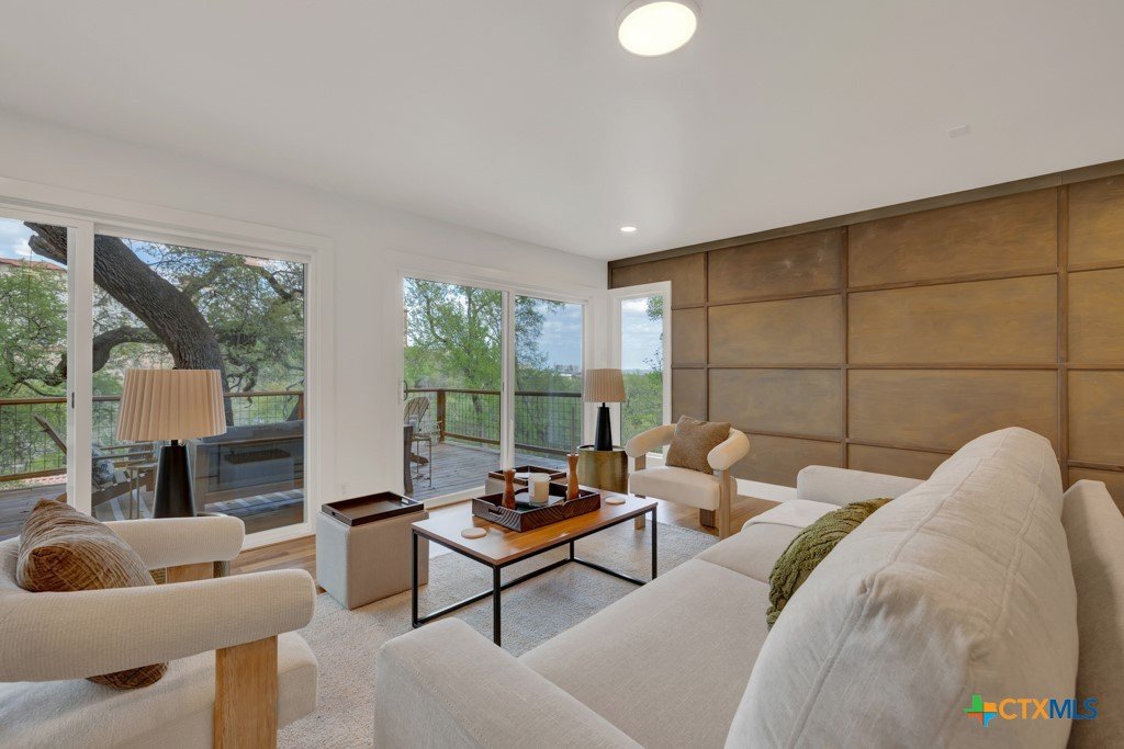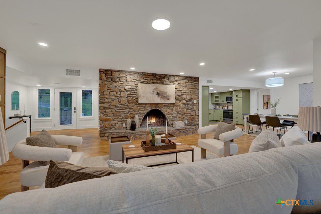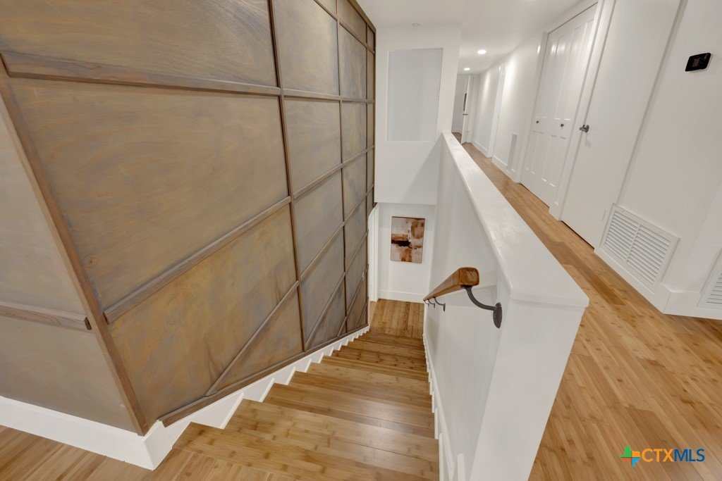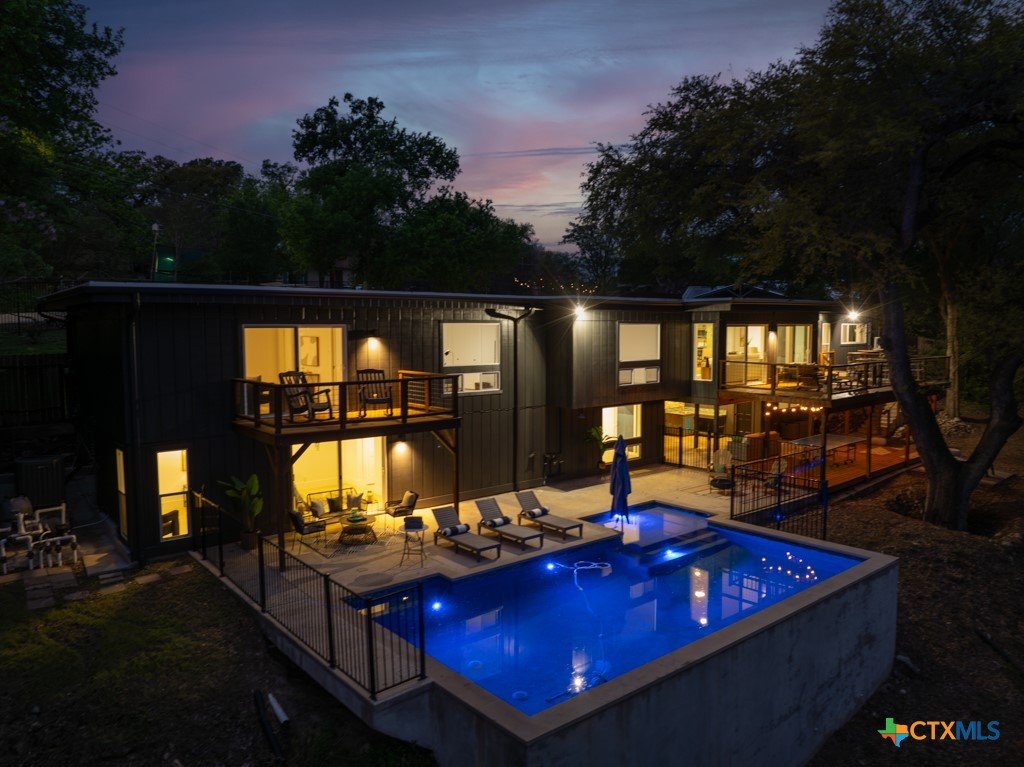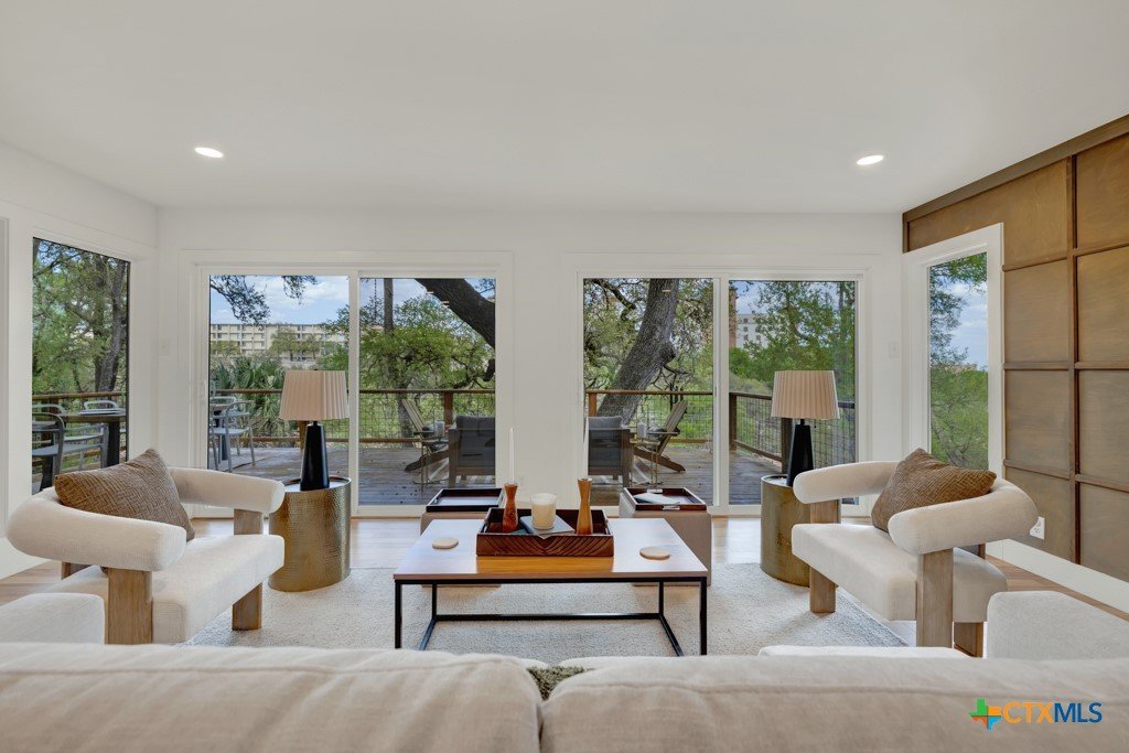 They don't build them like this anymore- and this one's been brought back better than ever. This authentically renovated mid-century modern sits above San Marcos on coveted Loop Street- a secret beloved walking path that San Martians rarely get the chance to live on- with sweeping views of Texas State University campus, downtown, and your own private forest. Think Eames, Neutra, and a stunning custom pool- all wrapped in a home where every inch has been upgraded without sacrificing any soul. The sophisticated charcoal exterior with natural cedar front gives classic MCM curb appeal. The crisp white interior grounded by natural stone, wood accent walls, and custom olive green cabinetry feels like it was pulled straight from a 1962 design magazine. Solid bamboo floors, new insulated windows and sliding doors frame those views from every room, and the upgraded commercial TPO insulated roof means this home is built to outlast the next 55 years as well as it did the last. Quartzite stone counters, counter-to-ceiling tile backsplash, pull-out pantry cabinetry. All 3 bathrooms completely redone, new drywall, lighting, fixtures, and hardware — nothing left to chance. 5 bedrooms, 3 living areas. The 1st floor is its own private retreat — bedroom, full bath, living area, and reading nook — ideal for multigenerational living. The separate room off the outdoor kitchen is ready for your art studio, home gym, or yoga practice. New sliding doors spill out to a gorgeous custom lighted pool overlooking a wooded ½-acre lot, with a magnificent 100-year-old live oak, outdoor kitchen, and full-sized fridge for entertaining in true mid-century fashion. 2 balconies, 2,500 sq ft of outdoor living, sun and moonrise over the pool, and a front-row seat to San Marcos city lights and 4th of July fireworks. Price out new construction at this quality and you're looking at $400+ psf- without a custom pool, without the lot, and without the soul. The golden age of design is alive and well.