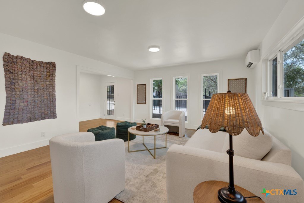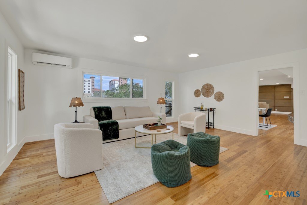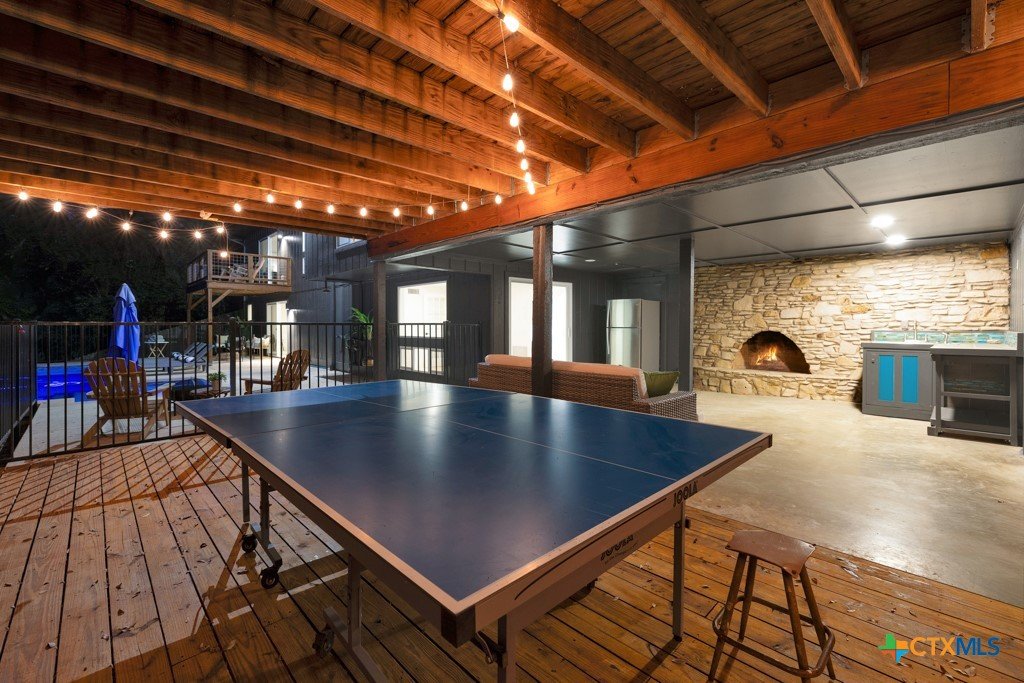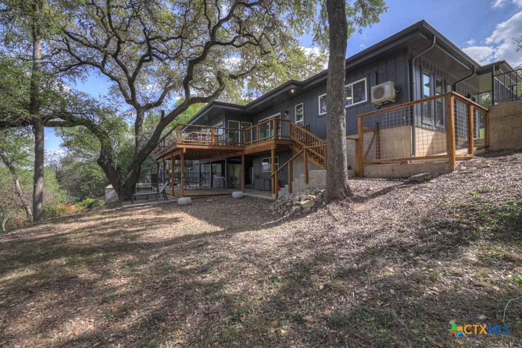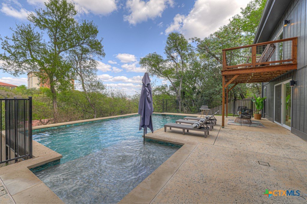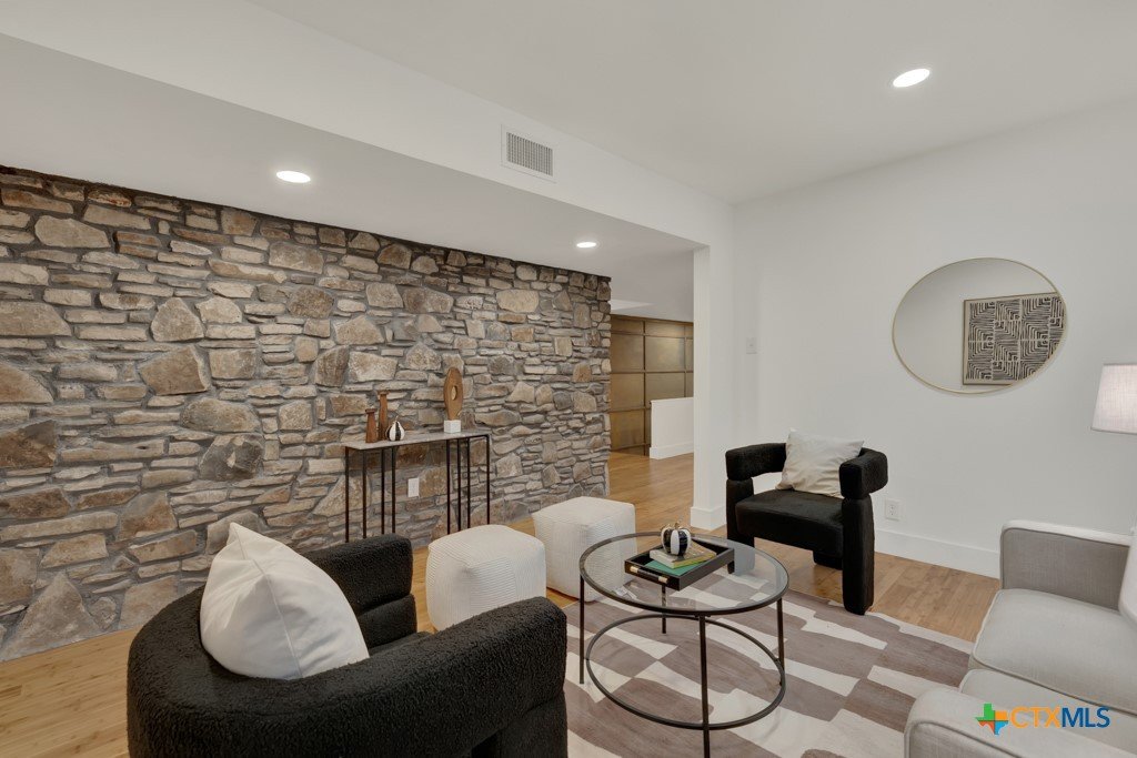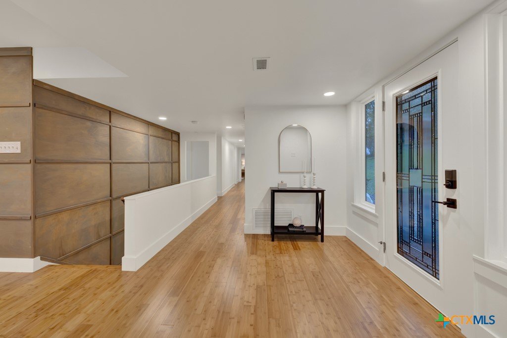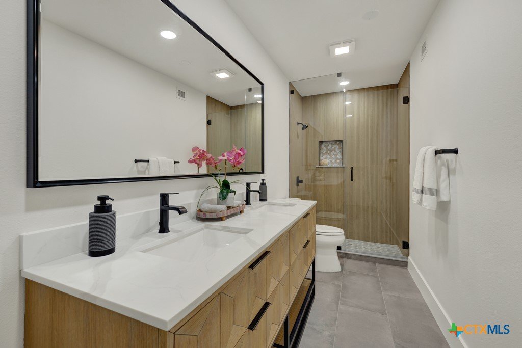 They don't build them like this anymore- and this one's been brought back better than ever. This authentically renovated mid-century modern sits above San Marcos on coveted Loop Street- a secret beloved walking path that San Martians rarely get the chance to live on- with sweeping views of Texas State University campus, downtown, and your own private forest. Think Eames, Neutra, and a stunning custom pool- all wrapped in a home where every inch has been upgraded without sacrificing any soul. The sophisticated charcoal exterior with natural cedar front gives classic MCM curb appeal. The crisp white interior grounded by natural stone, wood accent walls, and custom olive green cabinetry feels like it was pulled straight from a 1962 design magazine. Solid bamboo floors, new insulated windows and sliding doors frame those views from every room, and the upgraded commercial TPO insulated roof means this home is built to outlast the next 55 years as well as it did the last. Quartzite stone counters, counter-to-ceiling tile backsplash, pull-out pantry cabinetry. All 3 bathrooms completely redone, new drywall, lighting, fixtures, and hardware — nothing left to chance. 5 bedrooms, 3 living areas. The 1st floor is its own private retreat — bedroom, full bath, living area, and reading nook — ideal for multigenerational living. The separate room off the outdoor kitchen is ready for your art studio, home gym, or yoga practice. New sliding doors spill out to a gorgeous custom lighted pool overlooking a wooded ½-acre lot, with a magnificent 100-year-old live oak, outdoor kitchen, and full-sized fridge for entertaining in true mid-century fashion. 2 balconies, 2,500 sq ft of outdoor living, sun and moonrise over the pool, and a front-row seat to San Marcos city lights and 4th of July fireworks. Price out new construction at this quality and you're looking at $400+ psf- without a custom pool, without the lot, and without the soul. The golden age of design is alive and well.